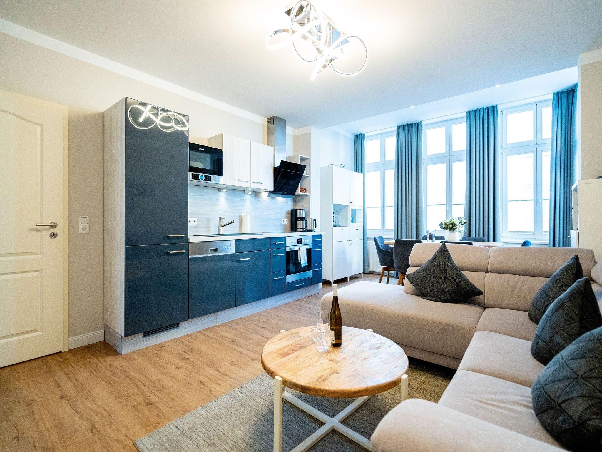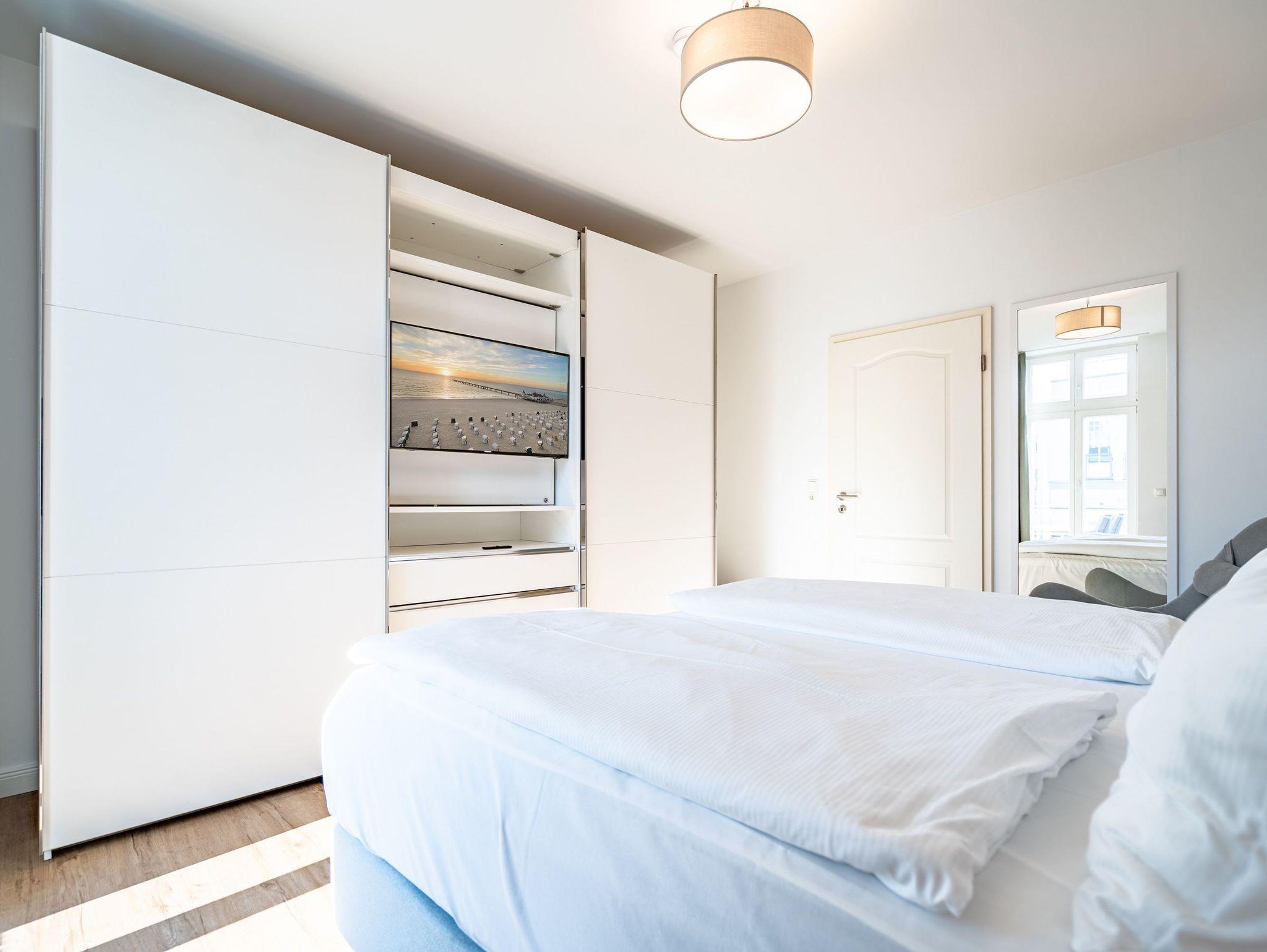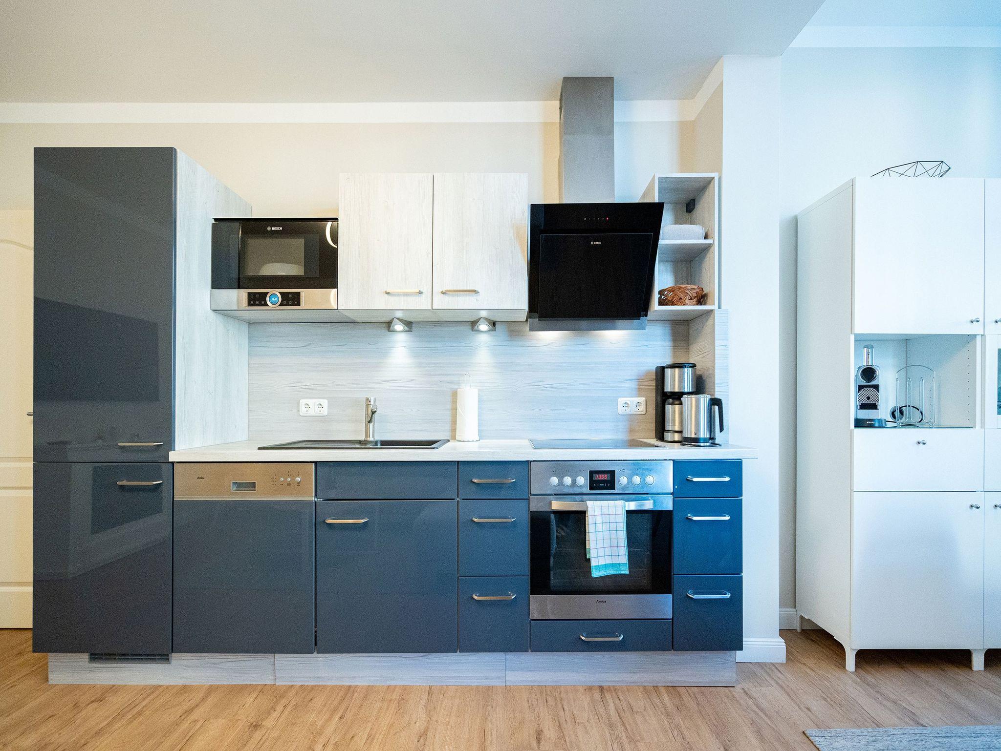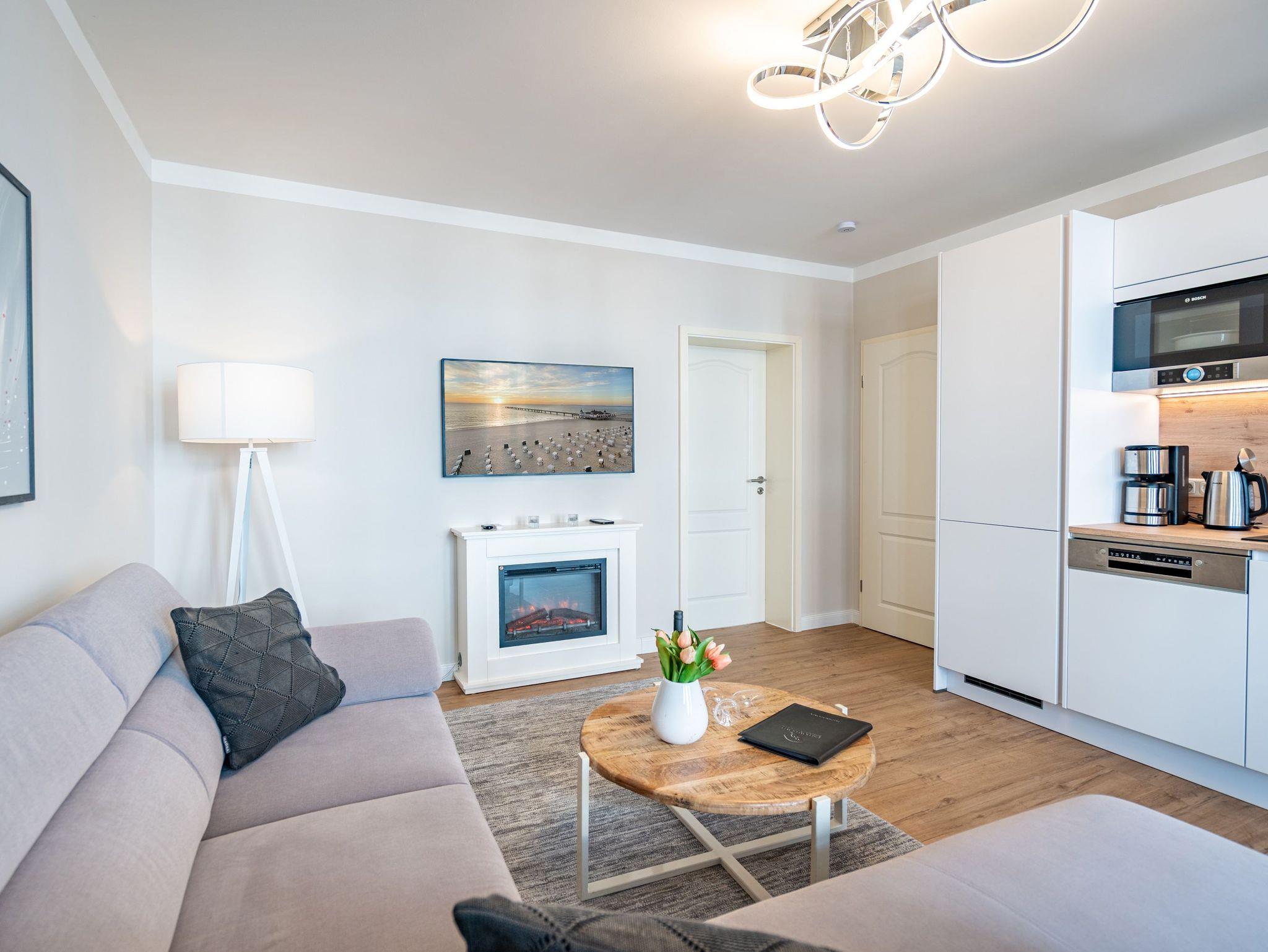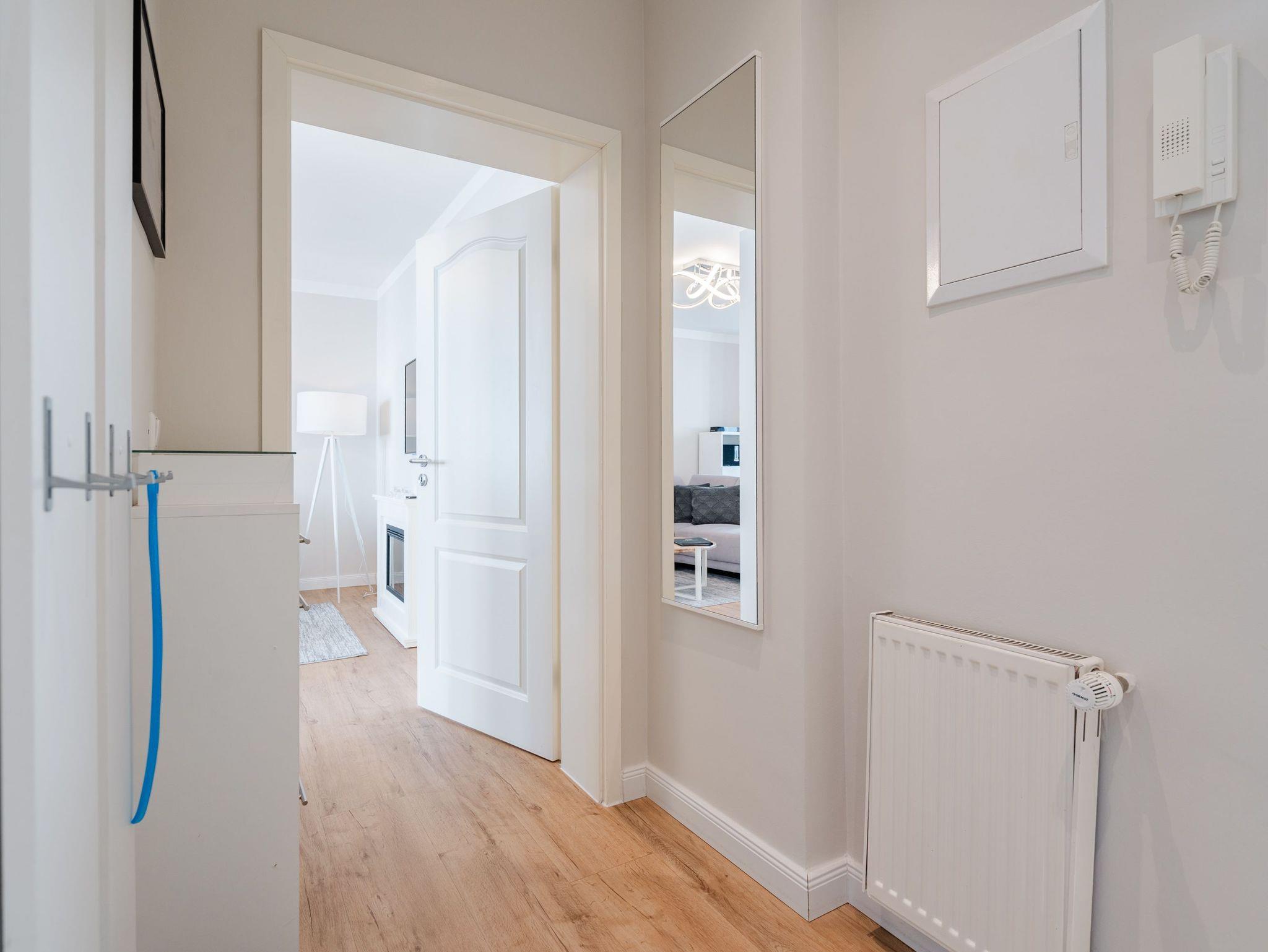 Herzlich Willkommen im Appartement 5 in der schönen Ostseevilla Erika. 2020 vollständig modernisiert und neu gestaltet, hält das geräumige 76qm große Feriendomizil im 1. OG Erholung und Wohlfühlatmosphäre für bis zu 5 Personen bereit. Ein maritimes Flair durchzieht den großzügigen Wohn-Essbereich. Die Usedomer Sonne flutet die angrenzende Veranda, die Platz für bis zu 6 Personen bietet. Genießen Sie von hier aus den seitlichen Blick auf das Meer und haben Sie das bunte Treiben der Strandpromenade sowie die Ostseewellen fest im Blick. Die komplett ausgestattete Küche ist in den Wohnbereich integriert. Neben Backofen, Ceranfeld, Spülmaschine, Mikrowelle, Kühlschrank mit Gefrierfach und Kleinküchengeräten dürfen sich Kaffeeliebhaber neben einer klassischen Kaffeemaschine auf eine zusätzliche Nespresso-Kapselmaschine freuen. Sollte die Küche doch einmal kalt bleiben, befinden sich in der nahe gelegenen Seestraße zahlreiche Restaurants und Einkaufsmöglichkeiten für einen ausgiebigen Shopping-Bummel. Die gemütliche Sitzlandschaft (elektrisch) im Wohnbereich bietet Platz für eine zusätzliche Aufbettung. Ein Elektro-Kamin sowie der 49-Zoll Flat-TV „The Frame“ und eine Bose-Soundanlage runden Ihre Urlaubsabende ab. Bei richtiger Windrichtung und geöffneten Fenstern sollte das Rauschen des Meeres ebenfalls bis in das Appartement 5 gelangen. Auf einen erholsamen Schlaf müssen Sie auch in Ihrem Urlaub nicht verzichten, da beide Schlafzimmer mit bequemen Boxspringbetten (1,80m x 2,00m) und Flat-TVs ausgestattet sind. Ein kleiner Balkon (5,4qm) mit östlicher Ausrichtung befindet sich ebenfalls an einem der Schlafräume. Die Morgensonne sowie ein Tisch mit vier Stühlen verspricht einen guten Start in den Tag. Ein absolutes Highlight ist die Finnische Sauna für bis zu 4 Personen, die ebenfalls von einem der Schlafzimmer zu betreten ist und an kühlen Tagen wohlige Wärme versprüht. Freuen Sie sich darüber hinaus auf eine kleine Fitnessecke mit Yogamatte, Faszienrolle und Hanteln. Das Badezimmer mit Regendusche, Waschtisch und WC wurde ebenfalls rundum erneuert und bietet durch den großzügigen Schnitt ausreichend Platz für Sie und Ihre Urlaubsbegleitung. Ein Stellplatz in der hauseigenen Tiefgarage ist mit der Nr. 14 gekennzeichnet. Für Ihren Fahrradurlaub gibt es einen Fahrradständer am Haus sowie einen Gemeinschaftsraum. Ihre Vierbeiner sind in diesem Appartement herzlich willkommen. Bei Ihrer Anreise sind die Betten bereits bezogen und Handtücher liegen für Sie bereit. Kostenfreies WLAN rundet Ihren Usedomurlaub ab.