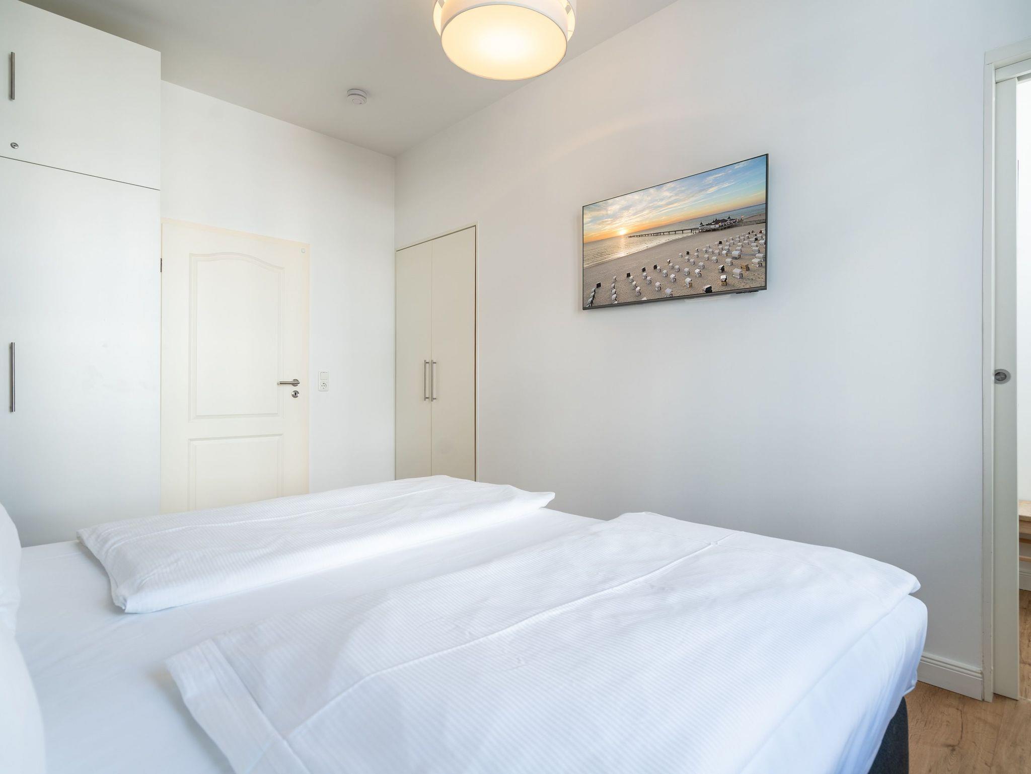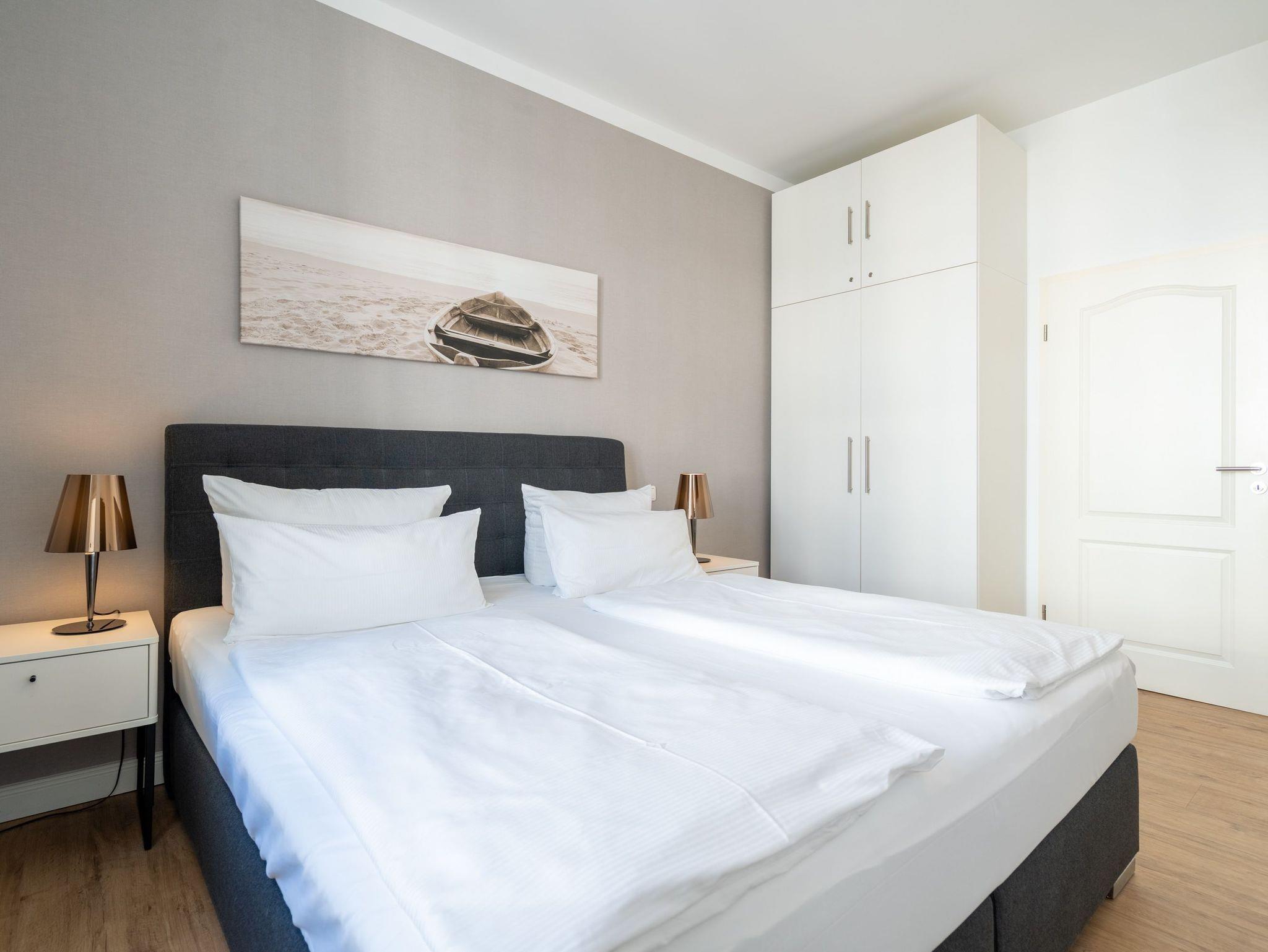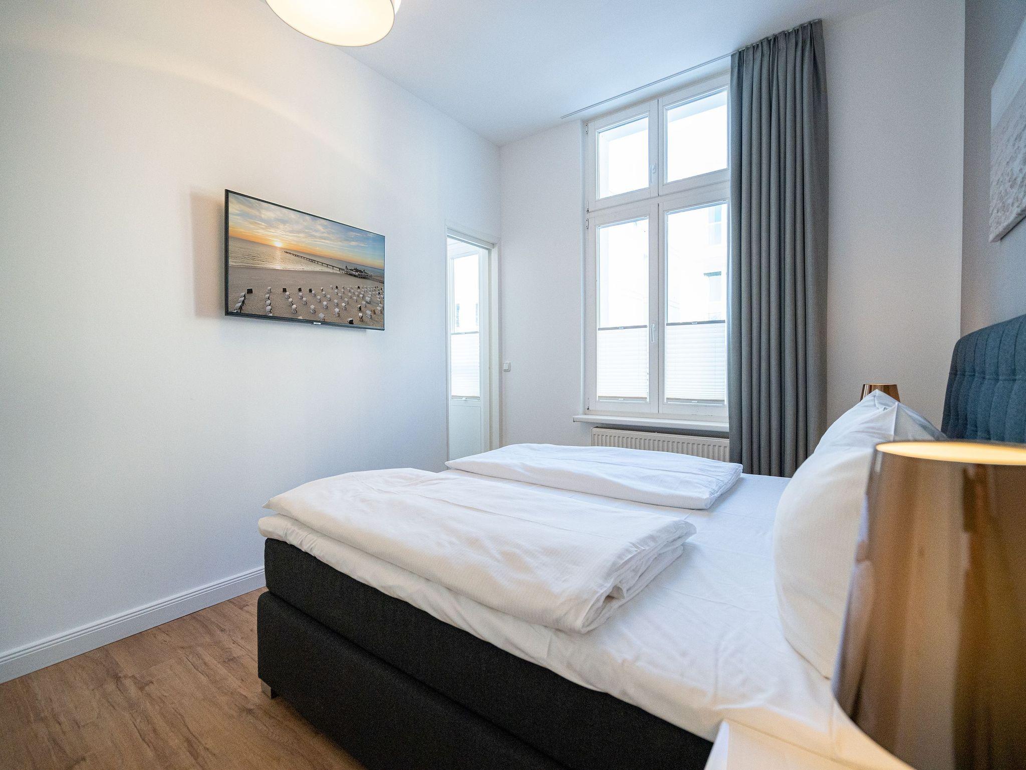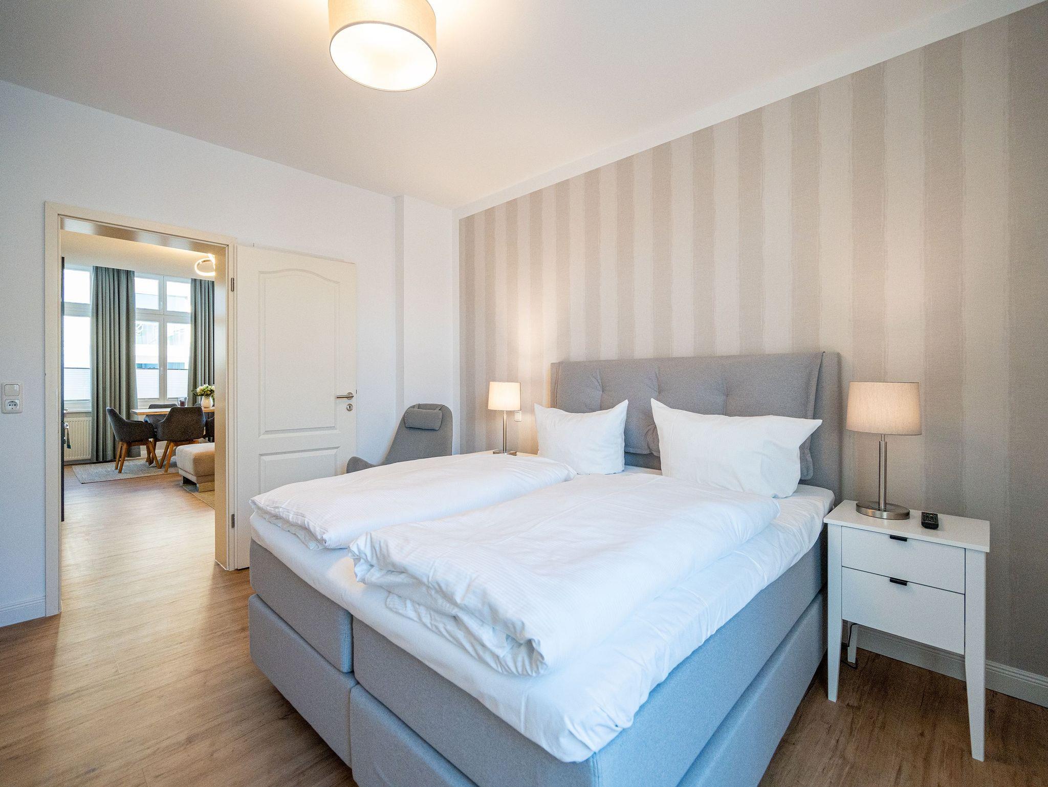 Herzlich Willkommen im Appartement 5 in der schönen Ostseevilla Erika. 2020 vollständig modernisiert und neu gestaltet, hält das geräumige 76qm große Feriendomizil im 1. OG Erholung und Wohlfühlatmosphäre für bis zu 5 Personen bereit. Ein maritimes Flair durchzieht den großzügigen Wohn-Essbereich. Die Usedomer Sonne flutet die angrenzende Veranda, die Platz für bis zu 6 Personen bietet. Genießen Sie von hier aus den seitlichen Blick auf das Meer und haben Sie das bunte Treiben der Strandpromenade sowie die Ostseewellen fest im Blick. Die komplett ausgestattete Küche ist in den Wohnbereich integriert. Neben Backofen, Ceranfeld, Spülmaschine, Mikrowelle, Kühlschrank mit Gefrierfach und Kleinküchengeräten dürfen sich Kaffeeliebhaber neben einer klassischen Kaffeemaschine auf eine zusätzliche Nespresso-Kapselmaschine freuen. Sollte die Küche doch einmal kalt bleiben, befinden sich in der nahe gelegenen Seestraße zahlreiche Restaurants und Einkaufsmöglichkeiten für einen ausgiebigen Shopping-Bummel. Die gemütliche Sitzlandschaft (elektrisch) im Wohnbereich bietet Platz für eine zusätzliche Aufbettung. Ein Elektro-Kamin sowie der 49-Zoll Flat-TV „The Frame“ und eine Bose-Soundanlage runden Ihre Urlaubsabende ab. Bei richtiger Windrichtung und geöffneten Fenstern sollte das Rauschen des Meeres ebenfalls bis in das Appartement 5 gelangen. Auf einen erholsamen Schlaf müssen Sie auch in Ihrem Urlaub nicht verzichten, da beide Schlafzimmer mit bequemen Boxspringbetten (1,80m x 2,00m) und Flat-TVs ausgestattet sind. Ein kleiner Balkon (5,4qm) mit östlicher Ausrichtung befindet sich ebenfalls an einem der Schlafräume. Die Morgensonne sowie ein Tisch mit vier Stühlen verspricht einen guten Start in den Tag. Ein absolutes Highlight ist die Finnische Sauna für bis zu 4 Personen, die ebenfalls von einem der Schlafzimmer zu betreten ist und an kühlen Tagen wohlige Wärme versprüht. Freuen Sie sich darüber hinaus auf eine kleine Fitnessecke mit Yogamatte, Faszienrolle und Hanteln. Das Badezimmer mit Regendusche, Waschtisch und WC wurde ebenfalls rundum erneuert und bietet durch den großzügigen Schnitt ausreichend Platz für Sie und Ihre Urlaubsbegleitung. Ein Stellplatz in der hauseigenen Tiefgarage ist mit der Nr. 14 gekennzeichnet. Für Ihren Fahrradurlaub gibt es einen Fahrradständer am Haus sowie einen Gemeinschaftsraum. Ihre Vierbeiner sind in diesem Appartement herzlich willkommen. Bei Ihrer Anreise sind die Betten bereits bezogen und Handtücher liegen für Sie bereit. Kostenfreies WLAN rundet Ihren Usedomurlaub ab.