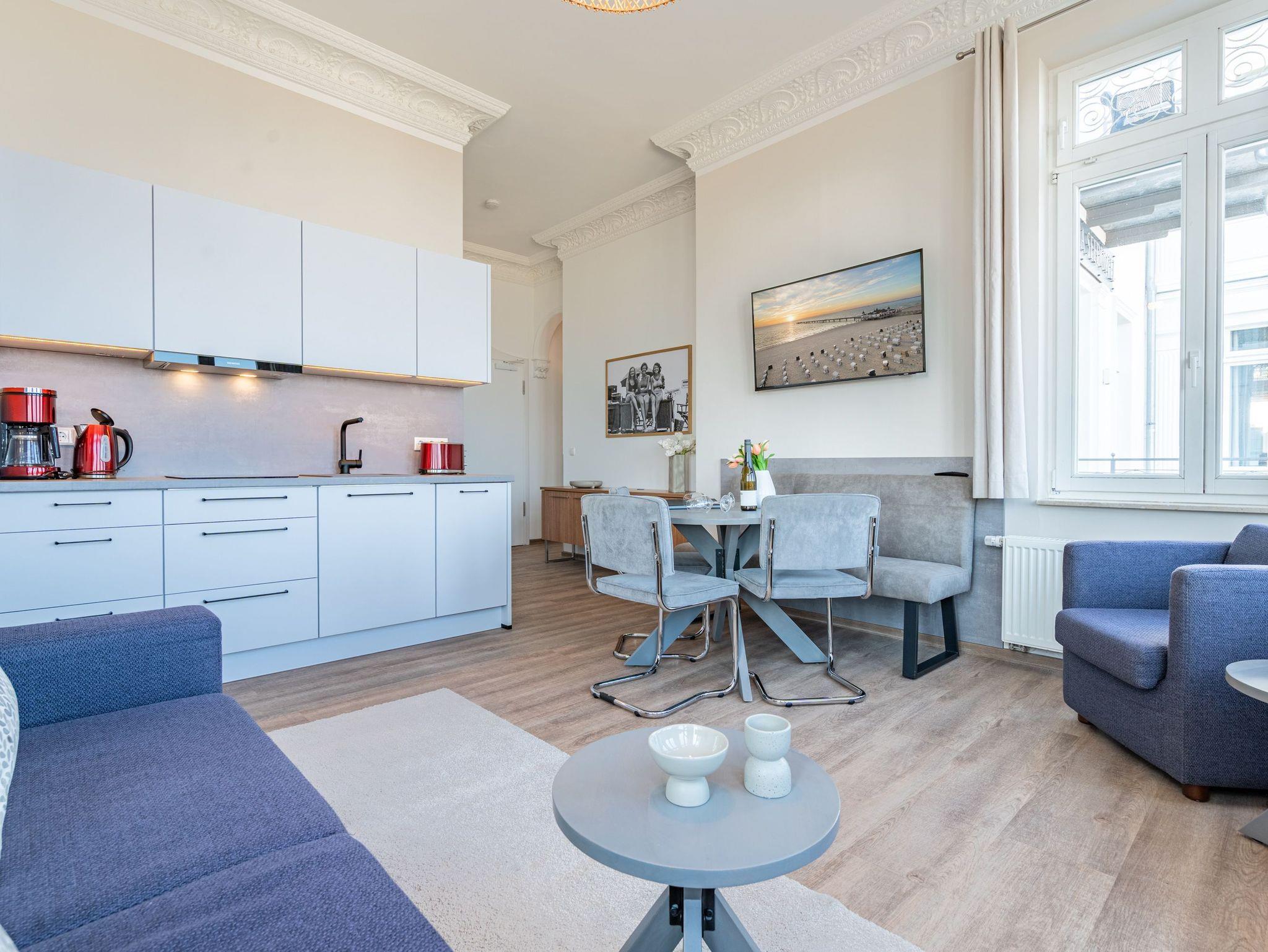 Die 3-Raum-Ferienwohnung Nr. C06 in der Villa Seedüwel bietet auf 52 qm ausreichend Platz für 2 bis 4 Personen und befindet sich im 1. Obergeschoss. Der offene Wohnbereich besticht durch einen herrlichen Blick auf die Seebrücke und die Ostsee. Er ist mit einer Küchenzeile ausgestattet, die ein 3-Zonen-Induktionskochfeld, eine Mikrowelle und einen Kühlschrank mit Gefrierfach umfasst. Ein Essplatz für vier Personen, eine gemütliche Sitzgruppe und ein Flat-TV sorgen für Komfort und Entspannung. Das erste Schlafzimmer verfügt über ein Doppelbett (1,80 m x 2,00 m) und einen Kleiderschrank. Von hier aus haben Sie Zugang zum kleinen Nord-Ost-Balkon, der Ihnen einen schönen Blick auf die Ostsee bietet. Das zweite Schlafzimmer ist mit einem Etagenbett (0,90 m x 2,00 m) eingerichtet. Das Bad ist mit einer Dusche und einem Waschbecken ausgestattet, und es gibt ein separates WC. Ein Stellplatz in der Tiefgarage ( Einfahrthöhe 2,03m) des benachbarten Hauses „Strandterrasse“ ist für Sie reserviert. WLAN steht Ihnen kostenfrei zur Verfügung.