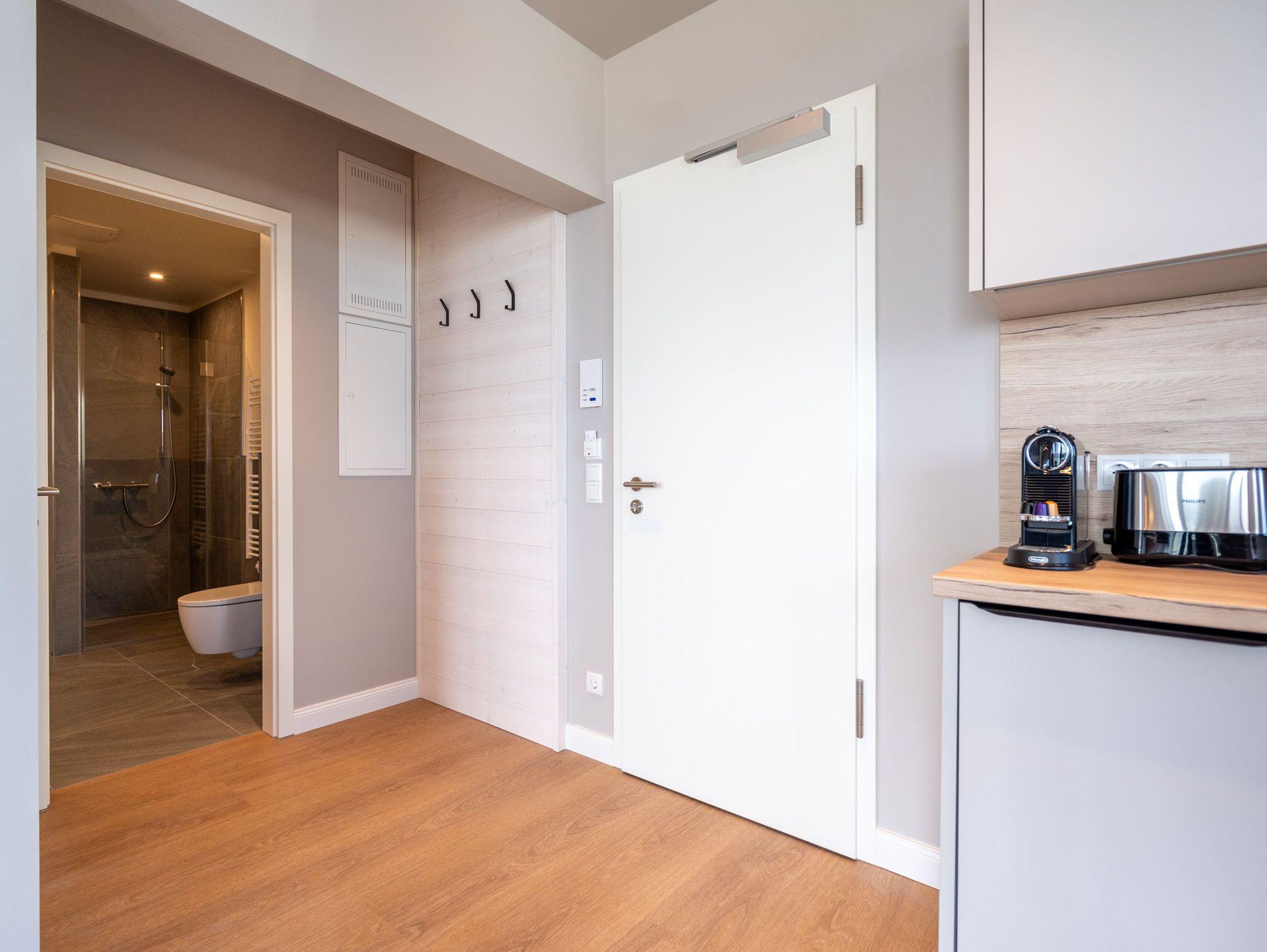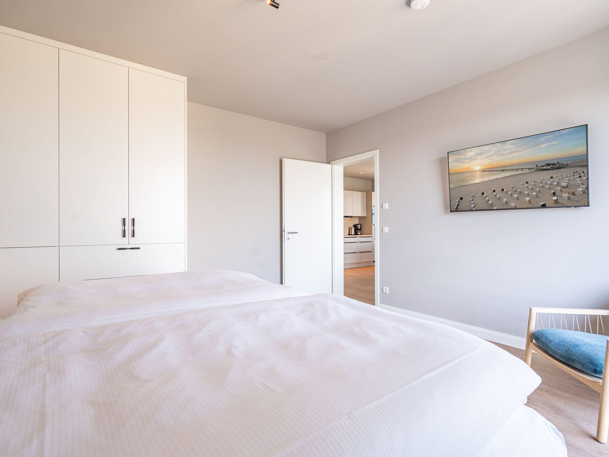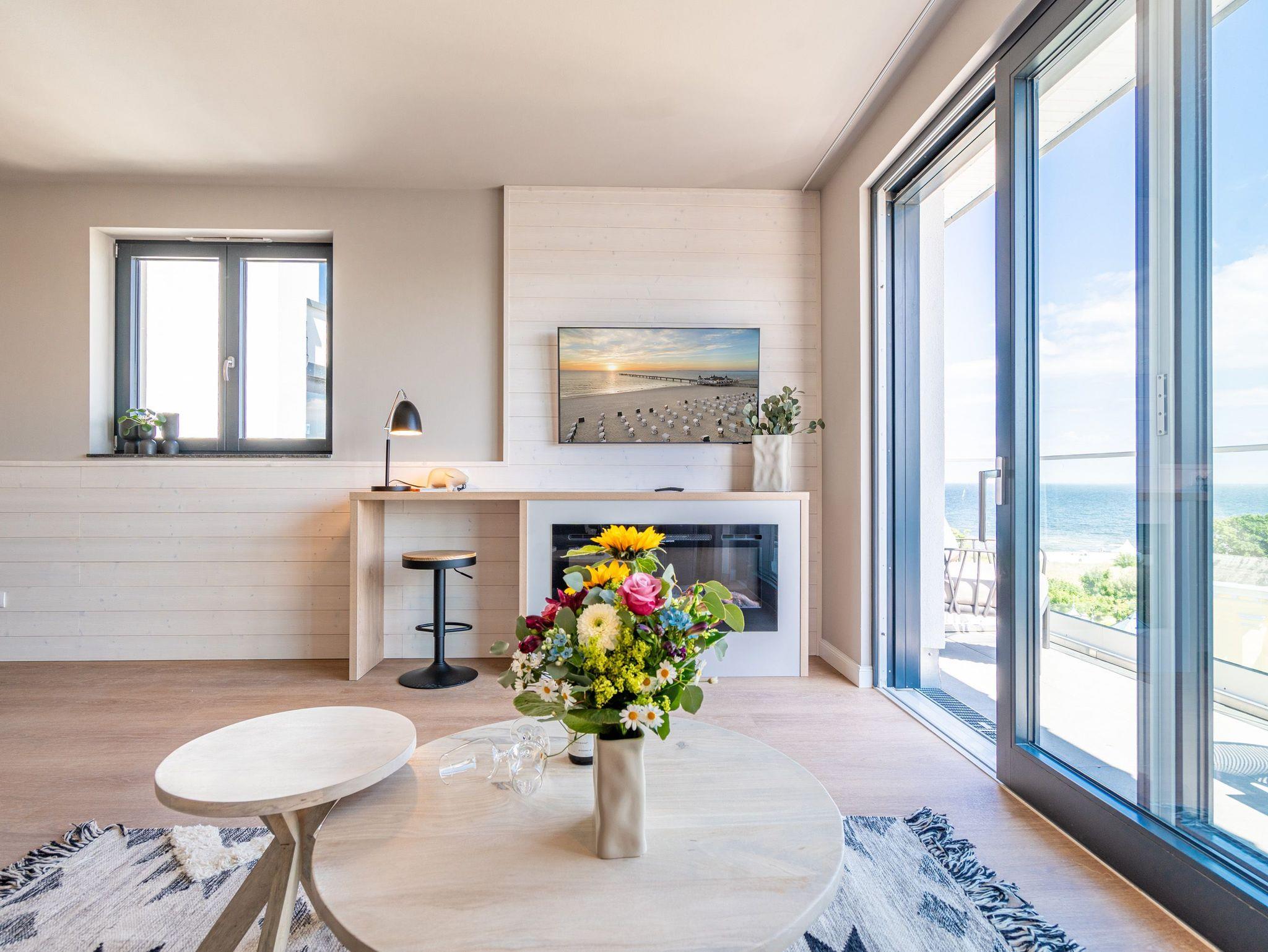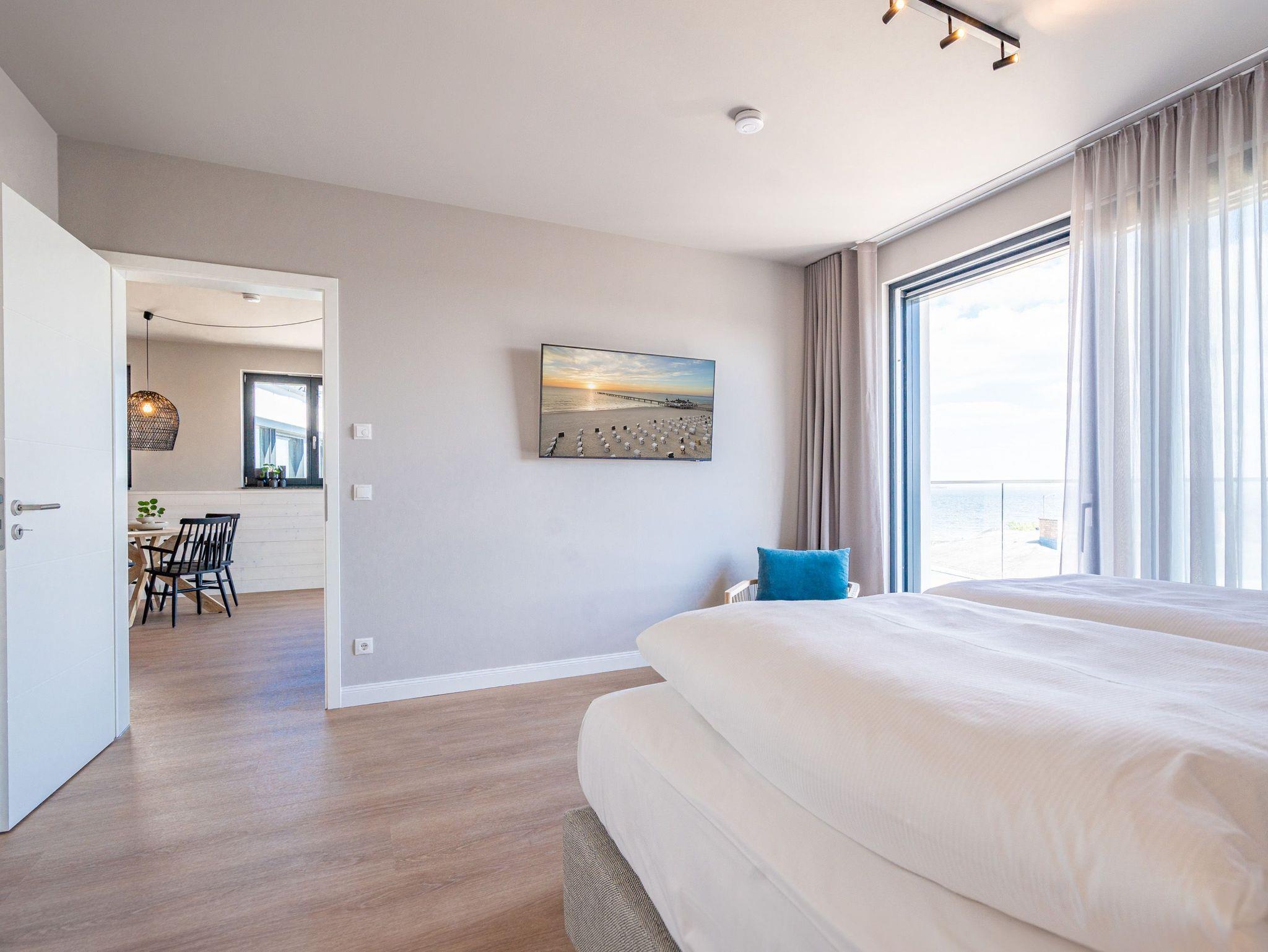 Willkommen im Strandterrasse 2-Raum-Appartement Nr. B4.2 (Haus B), einem bezaubernden Rückzugsort hoch oben in der 4. Etage mit einem spektakulären Blick auf das Meer und einer Vielzahl von Annehmlichkeiten, die Ihren Aufenthalt unvergesslich machen. Dieses geräumige 75 Quadratmeter große Appartement bietet Platz für 2 Personen[nbsp] [&] 1 Kleinkind (im Babybett). Der offene Wohn- und Essbereich ist einladend gestaltet und verfügt über eine moderne Küchenzeile mit allem, was Sie benötigen, einschließlich einer Backofen-Mikrowellen-Kombi, einem 3-Platten-Induktionsherd und einer Nespresso-Kapselmaschine. Ein gemütlicher Essplatz für 4 Personen und eine Working Station bieten den perfekten Raum für Mahlzeiten und produktives Arbeiten. Der Elektrokamin (ohne Wärmeabgabe) schafft eine gemütliche Atmosphäre, während eine komfortable Sitzgruppe und ein Flat-TV (50 Zoll) für Unterhaltung sorgen. Der Süd-Ost-Balkon lädt dazu ein, die frische Meeresluft zu genießen. Ausgestattet mit einem Gartentisch und zwei Stühlen ist er der perfekte Ort für ein gemütliches Frühstück oder einen romantischen Abend zu zweit. Das angrenzende Schlafzimmer bietet ein luxuriöses Boxspringdoppelbett (2,00m x 2,00m), ein festes Babybett, einen geräumigen Kleiderschrank und einen Flat-TV (43 Zoll). Ein weiterer Zugang zum Balkon mit einer entspannenden Gartenliege ermöglicht es Ihnen, die Sonne zu genießen und den Blick auf das Meer zu bewundern. Genießen Sie den atemberaubenden Meerblick vom Wohnzimmer und Schlafzimmer aus, während Sie sich entspannen und die Schönheit der Umgebung auf sich wirken lassen. Das moderne Badezimmer ist mit einer erfrischenden Dusche, einem Waschtisch, einem WC und sogar einer Infrarotsaunakabine ausgestattet, um Ihnen maximale Entspannung zu bieten. Ein PKW-Stellplatz in der Tiefgarage steht Ihnen zur Verfügung, um Ihr Fahrzeug sicher und bequem abzustellen. Erleben Sie einen unvergesslichen Aufenthalt in dieser stilvollen und komfortablen Ferienwohnung.