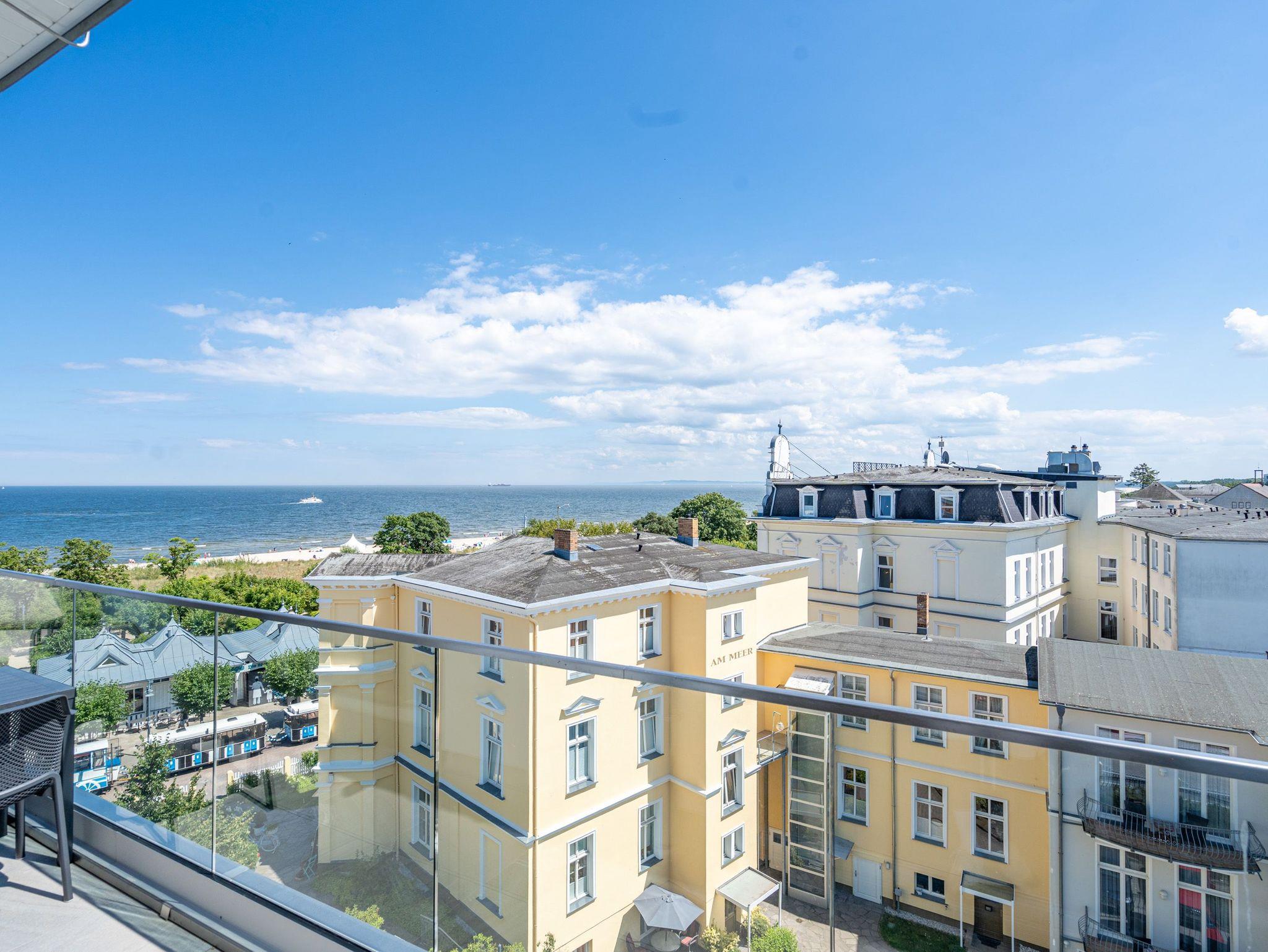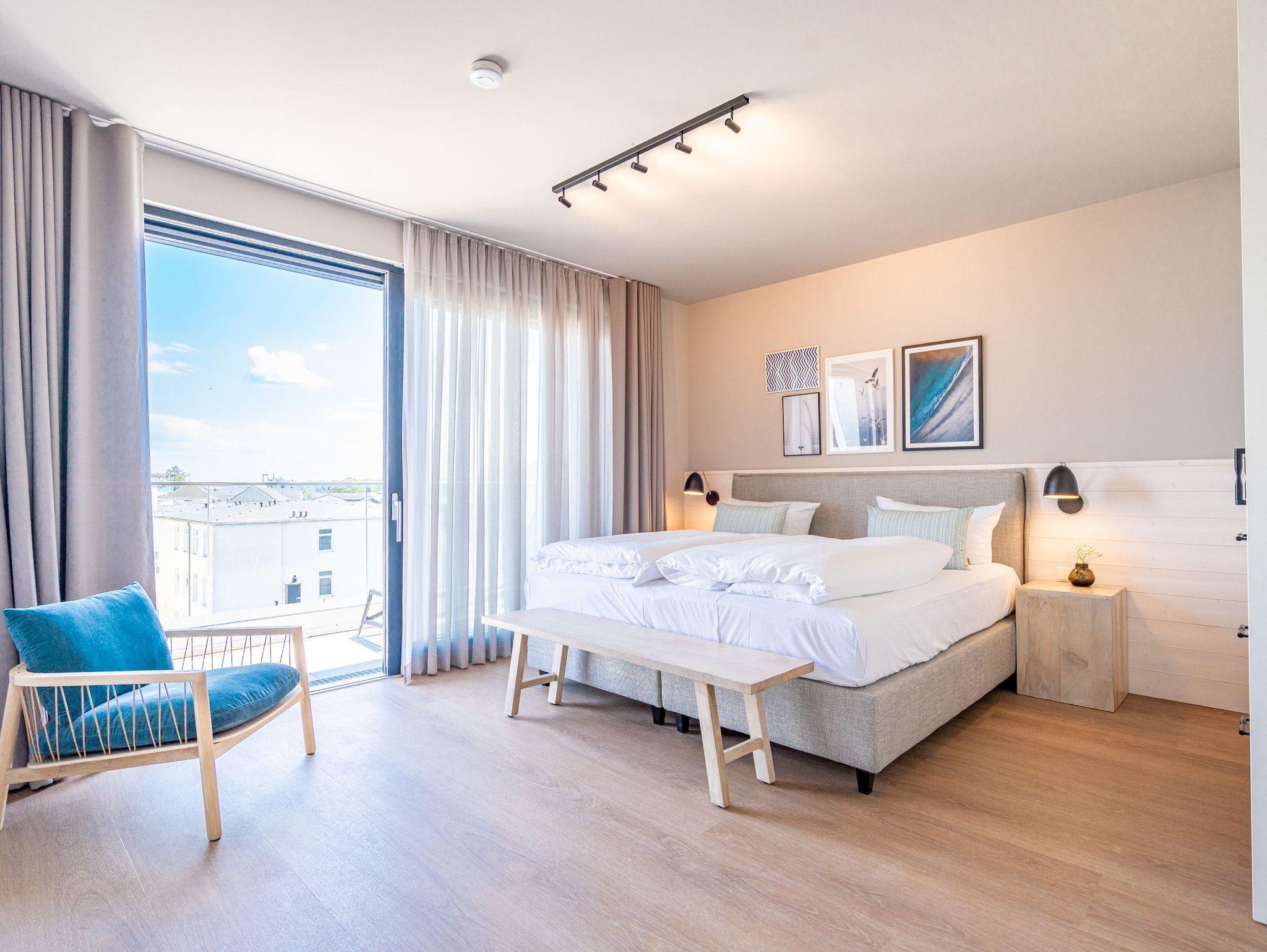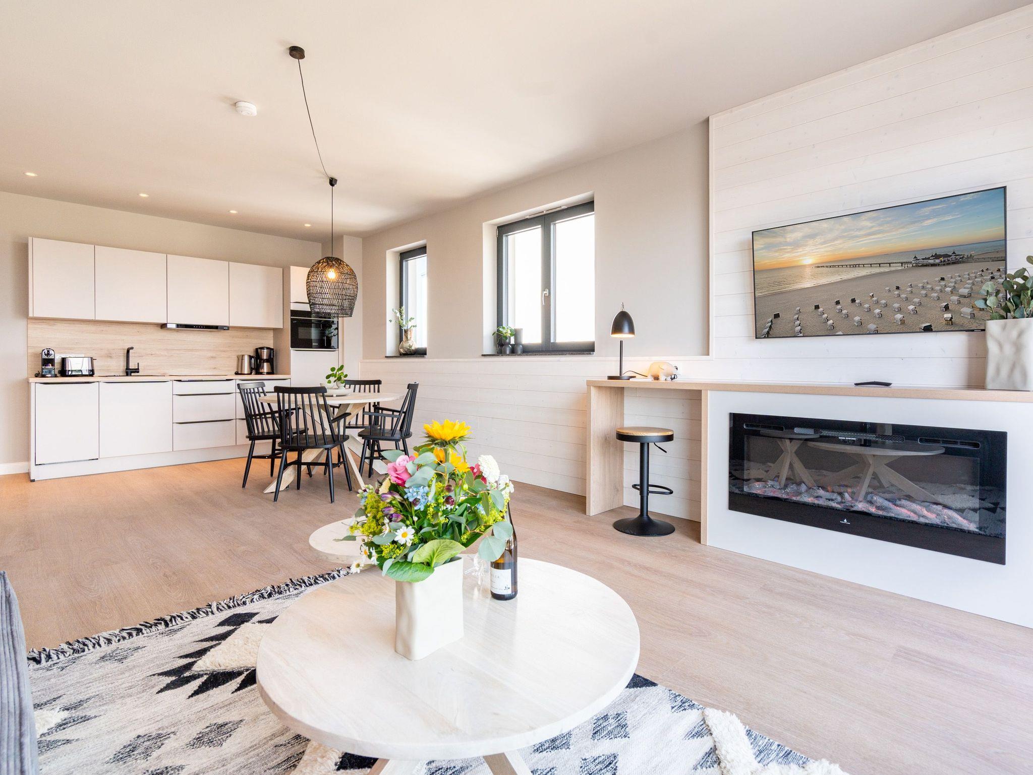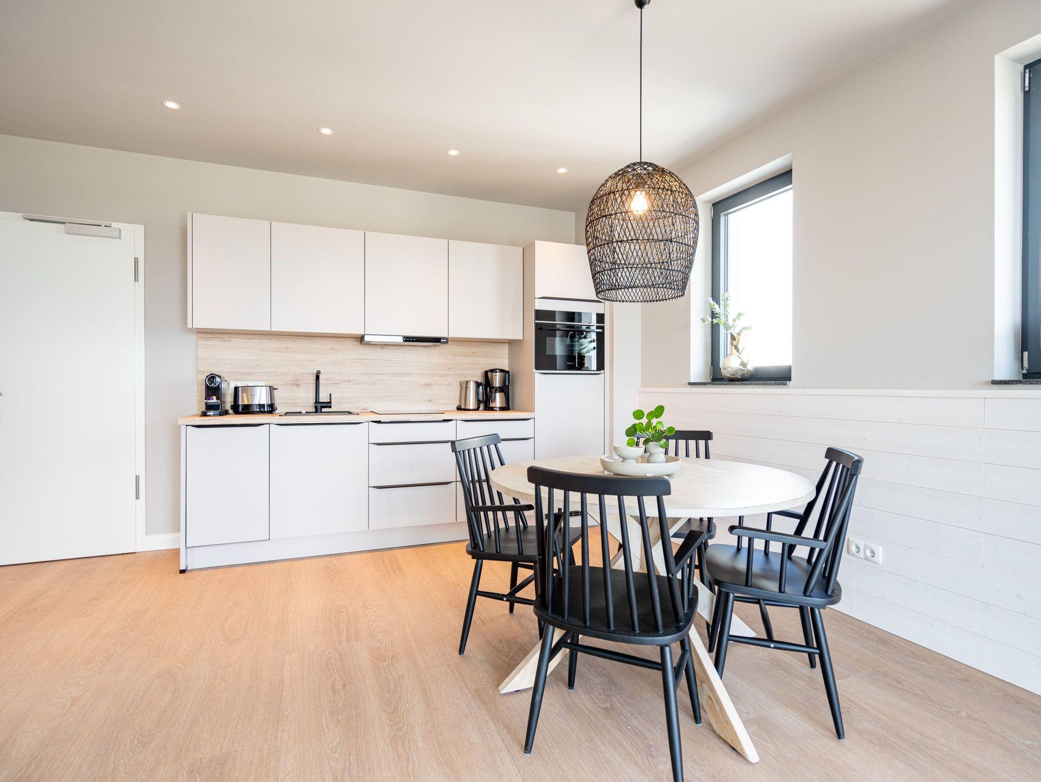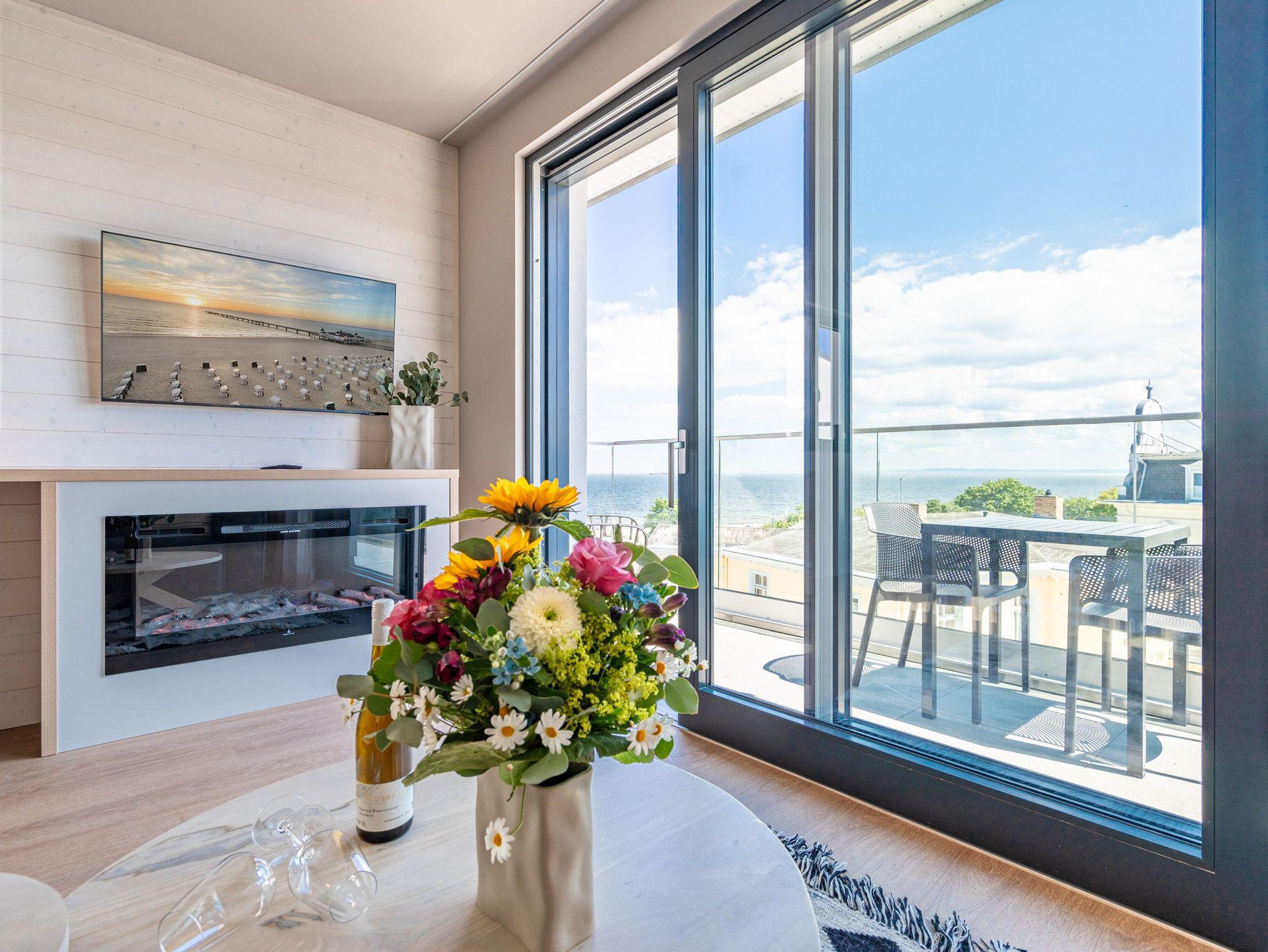 Willkommen im Strandterrasse 2-Raum-Appartement Nr. B4.2 (Haus B), einem bezaubernden Rückzugsort hoch oben in der 4. Etage mit einem spektakulären Blick auf das Meer und einer Vielzahl von Annehmlichkeiten, die Ihren Aufenthalt unvergesslich machen. Dieses geräumige 75 Quadratmeter große Appartement bietet Platz für 2 Personen[nbsp] [&] 1 Kleinkind (im Babybett). Der offene Wohn- und Essbereich ist einladend gestaltet und verfügt über eine moderne Küchenzeile mit allem, was Sie benötigen, einschließlich einer Backofen-Mikrowellen-Kombi, einem 3-Platten-Induktionsherd und einer Nespresso-Kapselmaschine. Ein gemütlicher Essplatz für 4 Personen und eine Working Station bieten den perfekten Raum für Mahlzeiten und produktives Arbeiten. Der Elektrokamin (ohne Wärmeabgabe) schafft eine gemütliche Atmosphäre, während eine komfortable Sitzgruppe und ein Flat-TV (50 Zoll) für Unterhaltung sorgen. Der Süd-Ost-Balkon lädt dazu ein, die frische Meeresluft zu genießen. Ausgestattet mit einem Gartentisch und zwei Stühlen ist er der perfekte Ort für ein gemütliches Frühstück oder einen romantischen Abend zu zweit. Das angrenzende Schlafzimmer bietet ein luxuriöses Boxspringdoppelbett (2,00m x 2,00m), ein festes Babybett, einen geräumigen Kleiderschrank und einen Flat-TV (43 Zoll). Ein weiterer Zugang zum Balkon mit einer entspannenden Gartenliege ermöglicht es Ihnen, die Sonne zu genießen und den Blick auf das Meer zu bewundern. Genießen Sie den atemberaubenden Meerblick vom Wohnzimmer und Schlafzimmer aus, während Sie sich entspannen und die Schönheit der Umgebung auf sich wirken lassen. Das moderne Badezimmer ist mit einer erfrischenden Dusche, einem Waschtisch, einem WC und sogar einer Infrarotsaunakabine ausgestattet, um Ihnen maximale Entspannung zu bieten. Ein PKW-Stellplatz in der Tiefgarage steht Ihnen zur Verfügung, um Ihr Fahrzeug sicher und bequem abzustellen. Erleben Sie einen unvergesslichen Aufenthalt in dieser stilvollen und komfortablen Ferienwohnung.