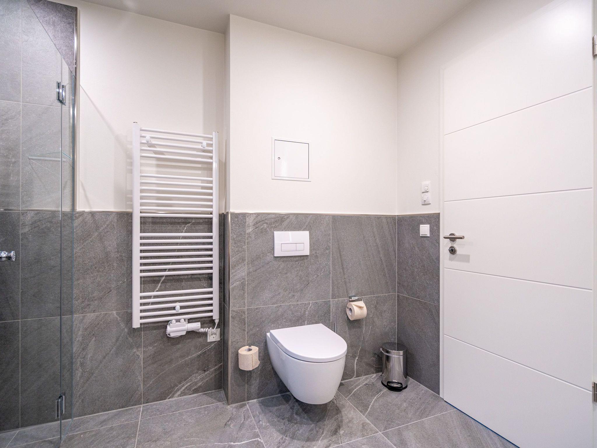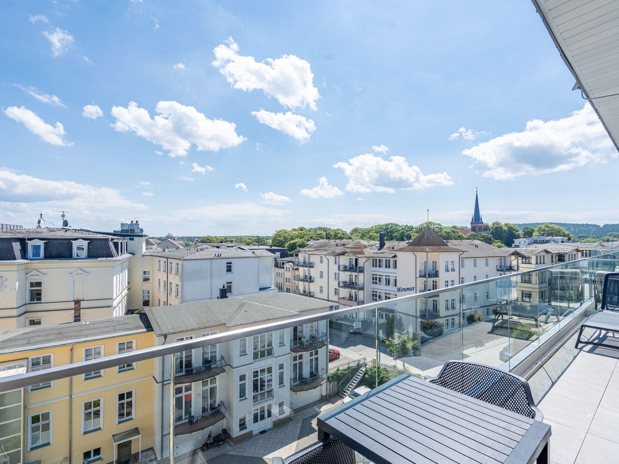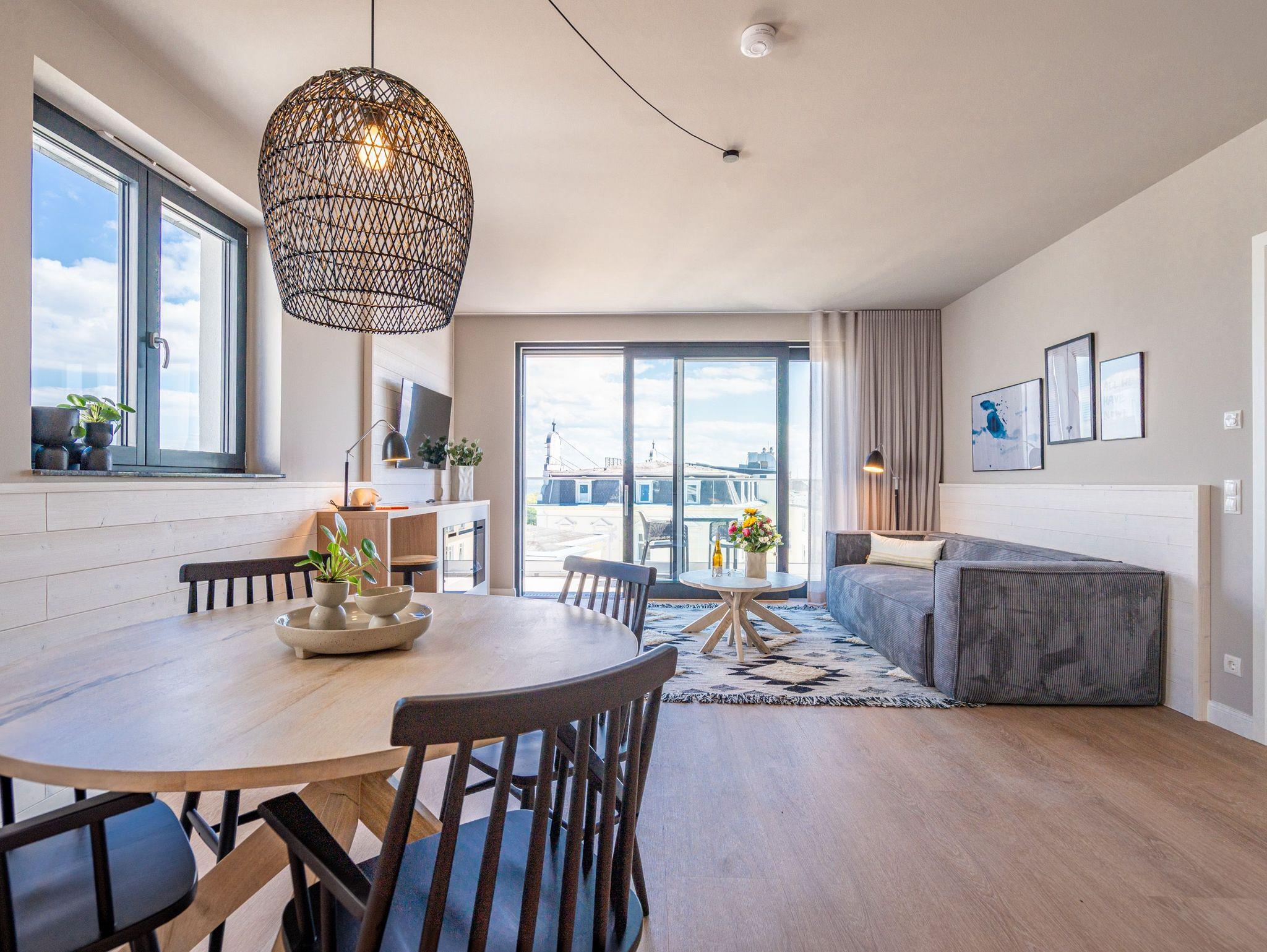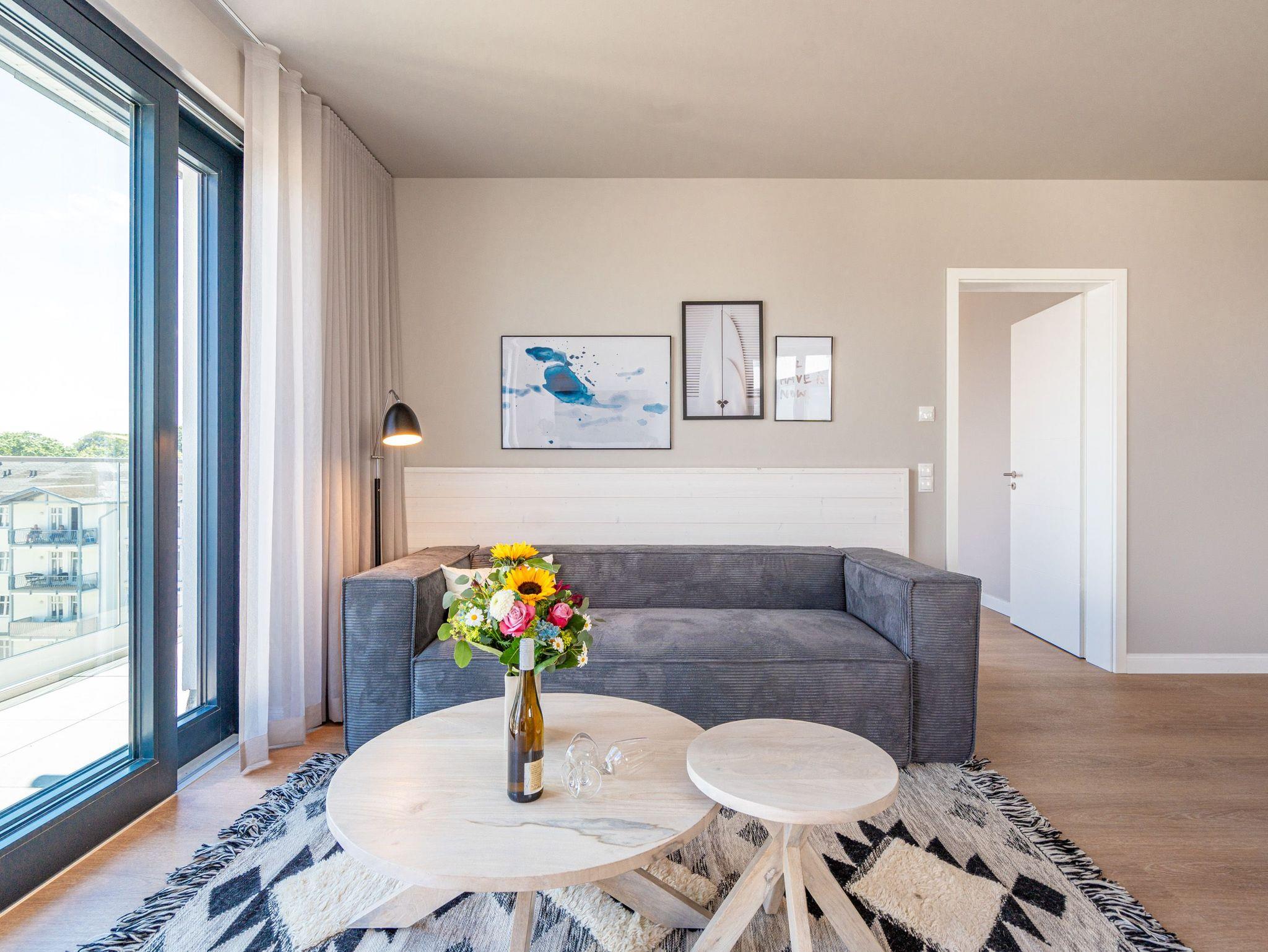 Willkommen im Strandterrasse 2-Raum-Appartement Nr. B4.2 (Haus B), einem bezaubernden Rückzugsort hoch oben in der 4. Etage mit einem spektakulären Blick auf das Meer und einer Vielzahl von Annehmlichkeiten, die Ihren Aufenthalt unvergesslich machen. Dieses geräumige 75 Quadratmeter große Appartement bietet Platz für 2 Personen[nbsp] [&] 1 Kleinkind (im Babybett). Der offene Wohn- und Essbereich ist einladend gestaltet und verfügt über eine moderne Küchenzeile mit allem, was Sie benötigen, einschließlich einer Backofen-Mikrowellen-Kombi, einem 3-Platten-Induktionsherd und einer Nespresso-Kapselmaschine. Ein gemütlicher Essplatz für 4 Personen und eine Working Station bieten den perfekten Raum für Mahlzeiten und produktives Arbeiten. Der Elektrokamin (ohne Wärmeabgabe) schafft eine gemütliche Atmosphäre, während eine komfortable Sitzgruppe und ein Flat-TV (50 Zoll) für Unterhaltung sorgen. Der Süd-Ost-Balkon lädt dazu ein, die frische Meeresluft zu genießen. Ausgestattet mit einem Gartentisch und zwei Stühlen ist er der perfekte Ort für ein gemütliches Frühstück oder einen romantischen Abend zu zweit. Das angrenzende Schlafzimmer bietet ein luxuriöses Boxspringdoppelbett (2,00m x 2,00m), ein festes Babybett, einen geräumigen Kleiderschrank und einen Flat-TV (43 Zoll). Ein weiterer Zugang zum Balkon mit einer entspannenden Gartenliege ermöglicht es Ihnen, die Sonne zu genießen und den Blick auf das Meer zu bewundern. Genießen Sie den atemberaubenden Meerblick vom Wohnzimmer und Schlafzimmer aus, während Sie sich entspannen und die Schönheit der Umgebung auf sich wirken lassen. Das moderne Badezimmer ist mit einer erfrischenden Dusche, einem Waschtisch, einem WC und sogar einer Infrarotsaunakabine ausgestattet, um Ihnen maximale Entspannung zu bieten. Ein PKW-Stellplatz in der Tiefgarage steht Ihnen zur Verfügung, um Ihr Fahrzeug sicher und bequem abzustellen. Erleben Sie einen unvergesslichen Aufenthalt in dieser stilvollen und komfortablen Ferienwohnung.