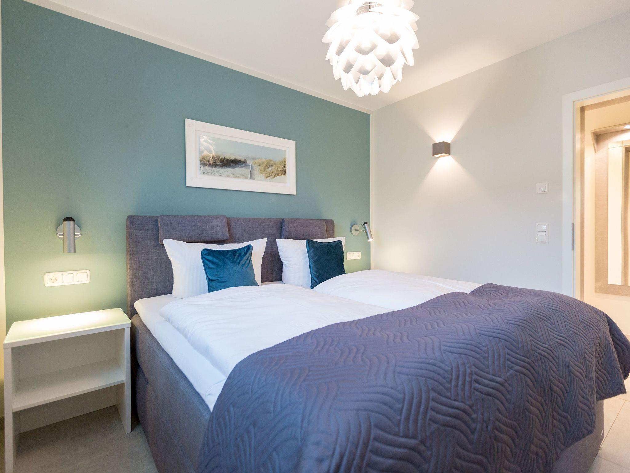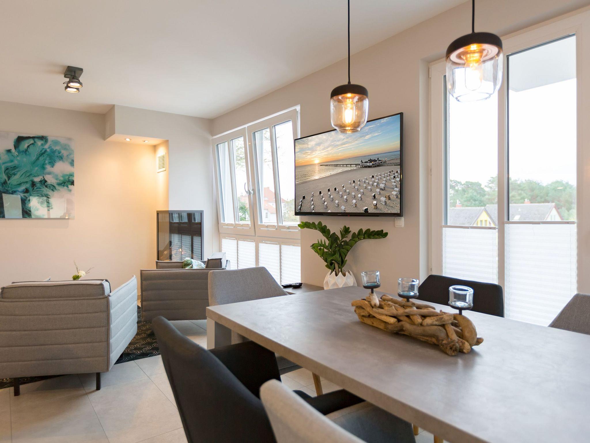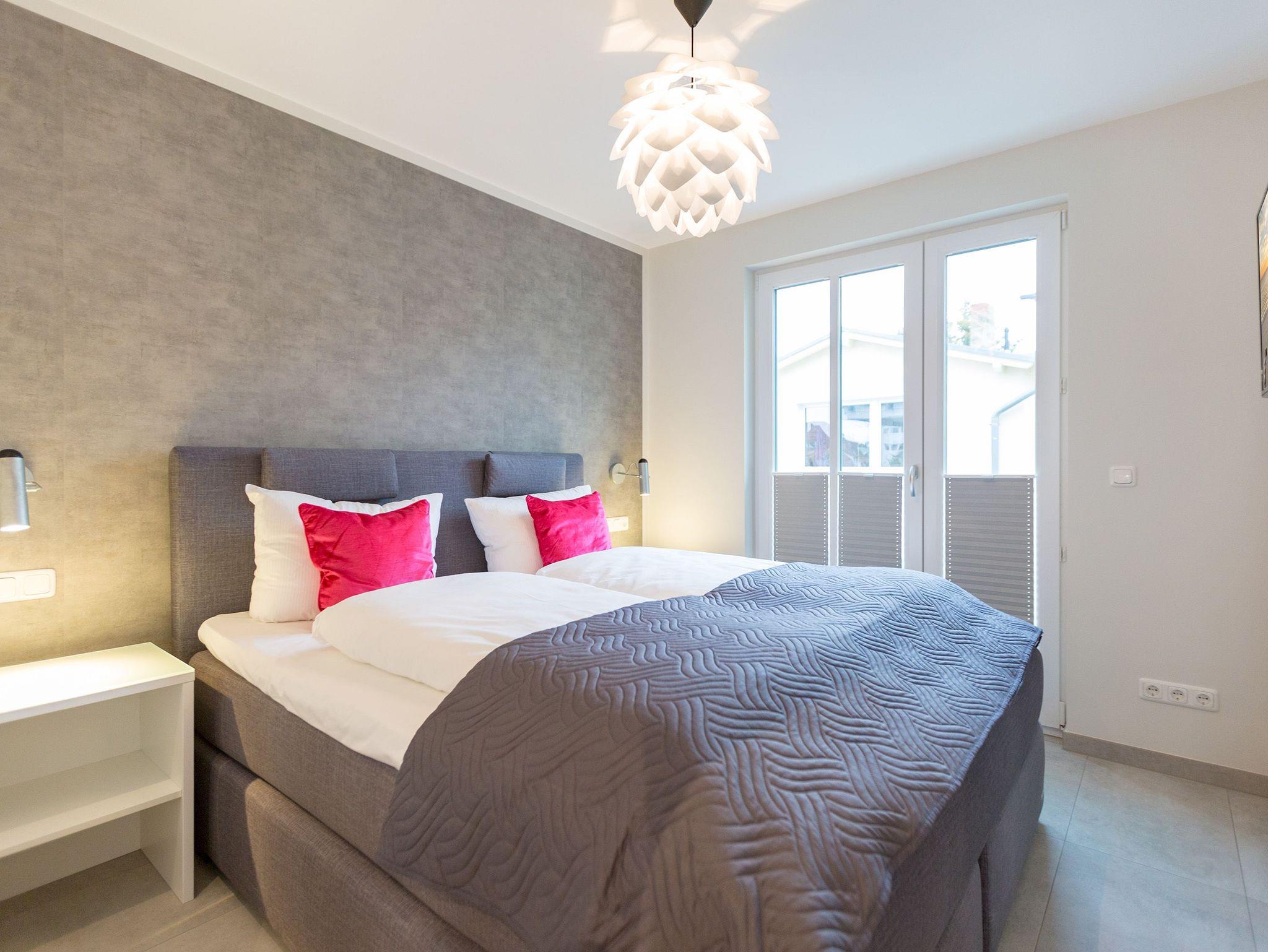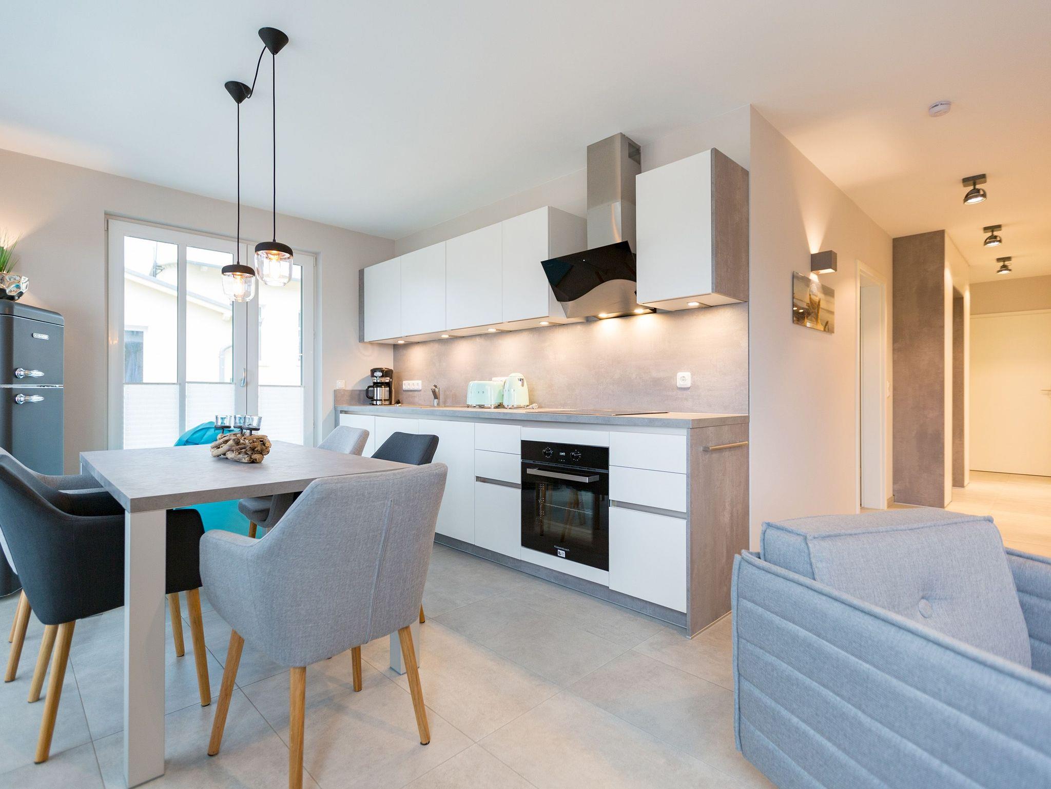 Viel Platz zum Wohlfühlen und Urlauben wartet auf Sie in den 59 Quadratmetern dieses ausgesucht schönen Appartements ( für 4 Erwachsene [&] 1 Kleinkind ( bis 3 Jahre im Kinderreisebett). Gerade das geräumige Wohn-Esszimmer ? Mittelpunkt des Domizils ? ist eine echte Wohlfühlzone mit lichter Leichtigkeit durch große Fenster, stylische Möbel und einer modernen und hochwertig ausgestatteten Küche. Ein Hingucker ist der große Amerikanische Retro-Kühlschrank. Sofas und Sessel laden zum Relaxen ein. Ein Gas-Kamin sorgt auf Knopfdruck für Behaglichkeit; ein Flat-TV für die digitale Unterhaltung. Am schönen Esstisch sind gemütliche Plauder- und Mußestunden garantiert. Kochen Sie gemeinsam. Denn es ist alles da, um es sich richtig gut gehen zu lassen. Edles Geschirr rundet das optische Genussbild ab. Das Appartement verfügt über zwei sonnenüberflutete, 13 Quadratmeter große Südost- und Südwest-Balkone. In jedem der beiden Schlafzimmer befindet sich ein bequemes Boxspringdoppelbett (1,80 m x 2,00 m), das nicht nur das Schlafen zum Vergnügen macht. Entspannen können Sie auch wunderbar in der wohnungseigenen Finnischen Sauna, die direkt ins Badezimmer eingebaut ist. Wem an ungemütlichen Tagen kalt ist, dem wird hier ganz sicher schnell wieder wohlig warm. Abbrausen können Sie sich gleich unter der geräumigen Dusche. Im Bad gibt es zudem einen Waschtisch und ein WC. Ein separates Gäste-WC gibt es in der Wohnung ebenfalls. Für Ihren Komfort sind die Betten bei der Anreise bereits bezogen und Handtücher liegen bereit. Das WLAN ist in der Wohnung kostenfrei und ein Stellplatz Nr. 6 ist für Sie am Haus reserviert. Ein echtes Urlaubsparadies wartet also nur darauf, dass Sie ankommen und am liebsten gar nicht wieder weg wollen.