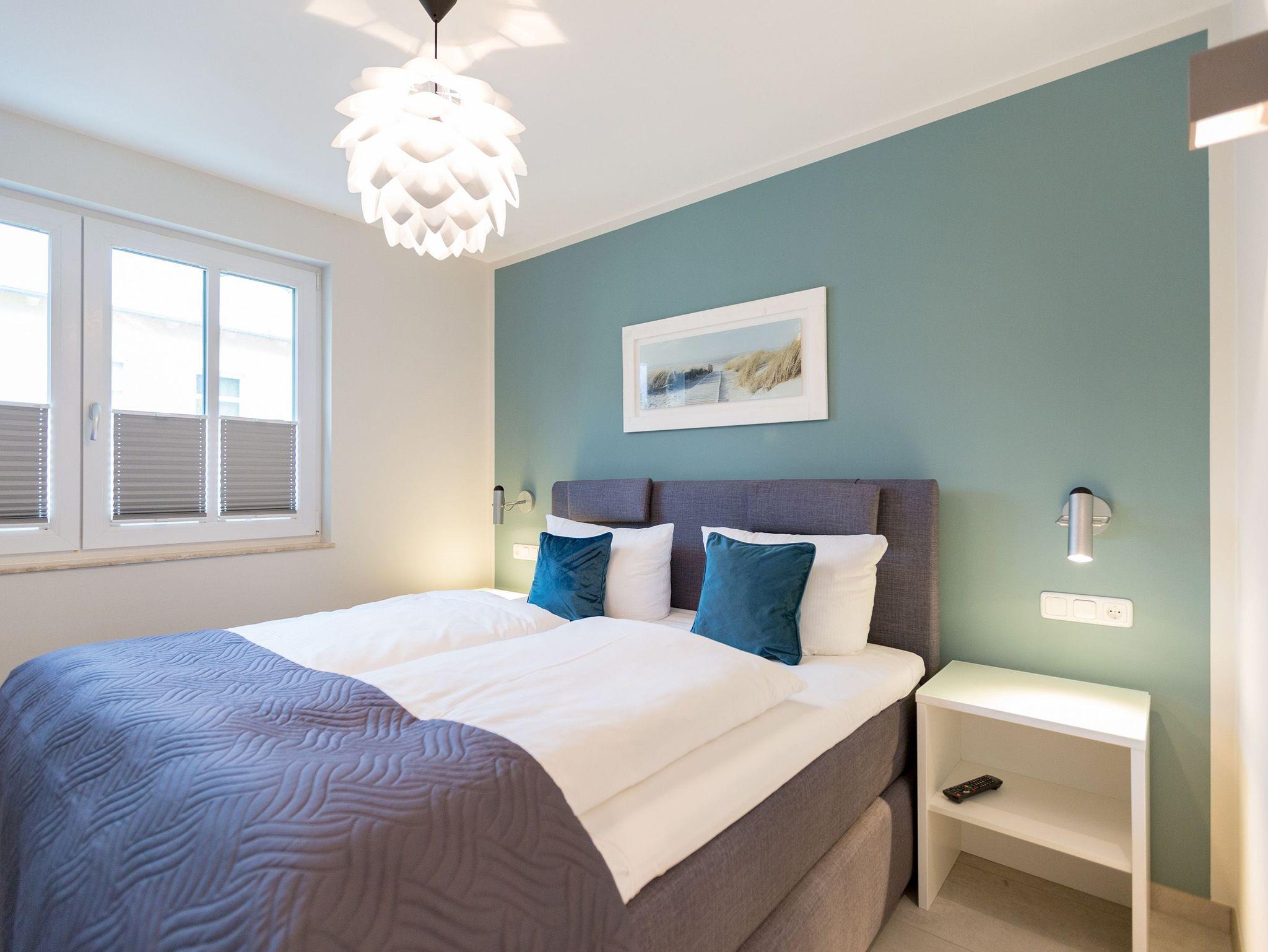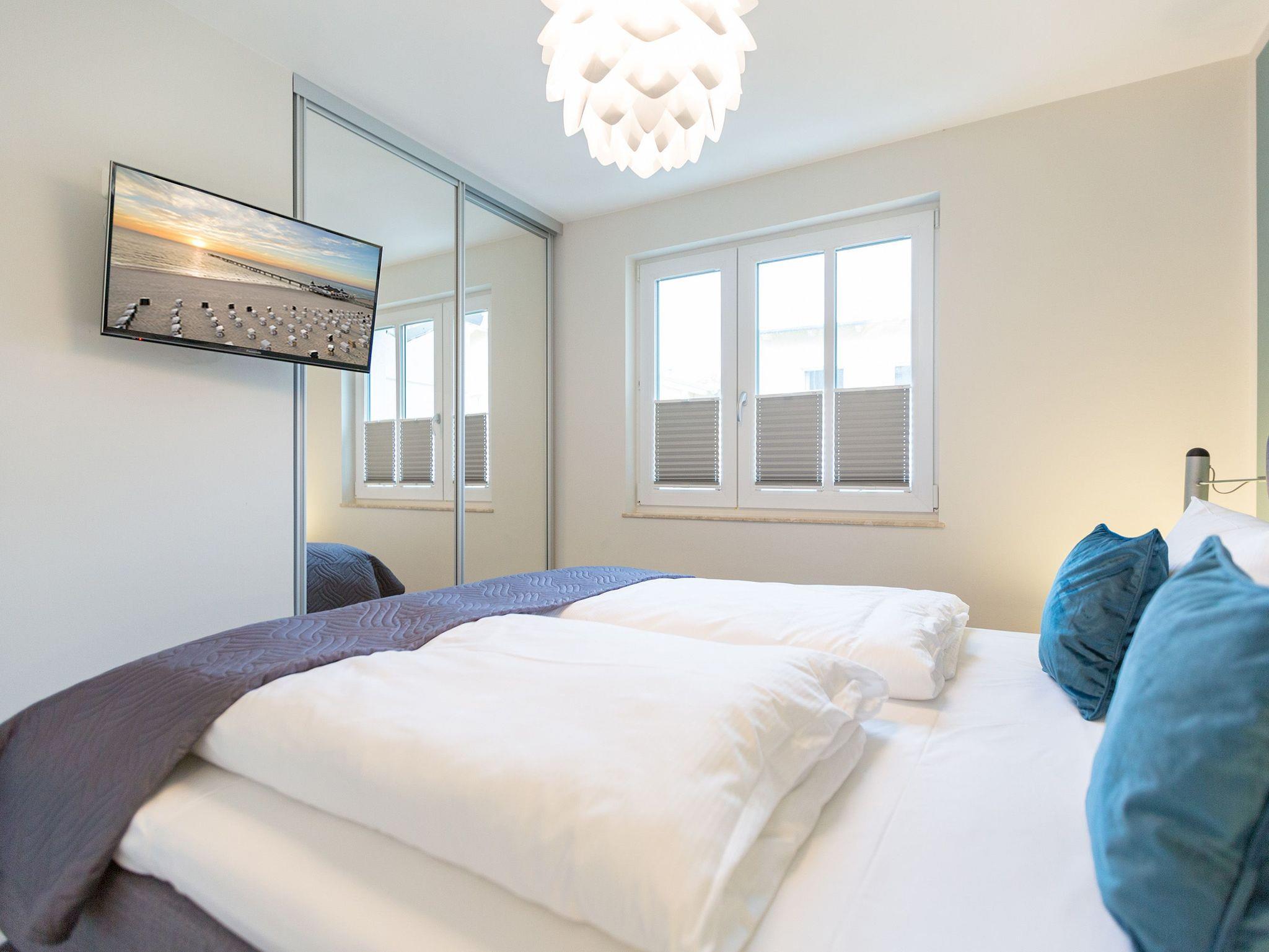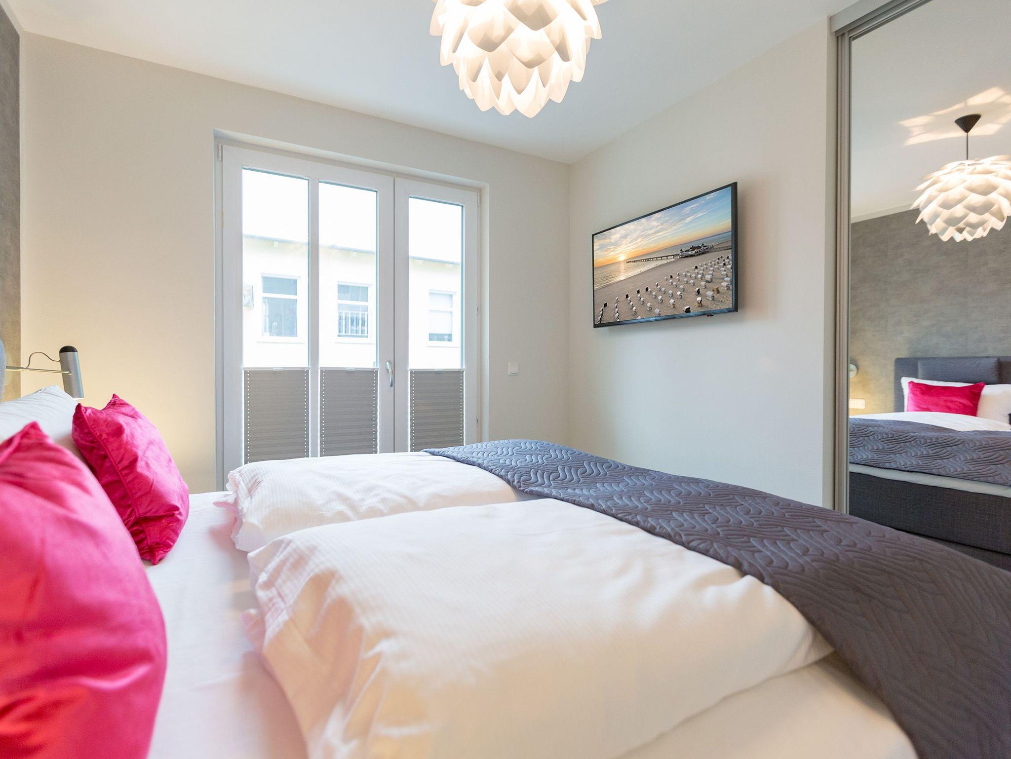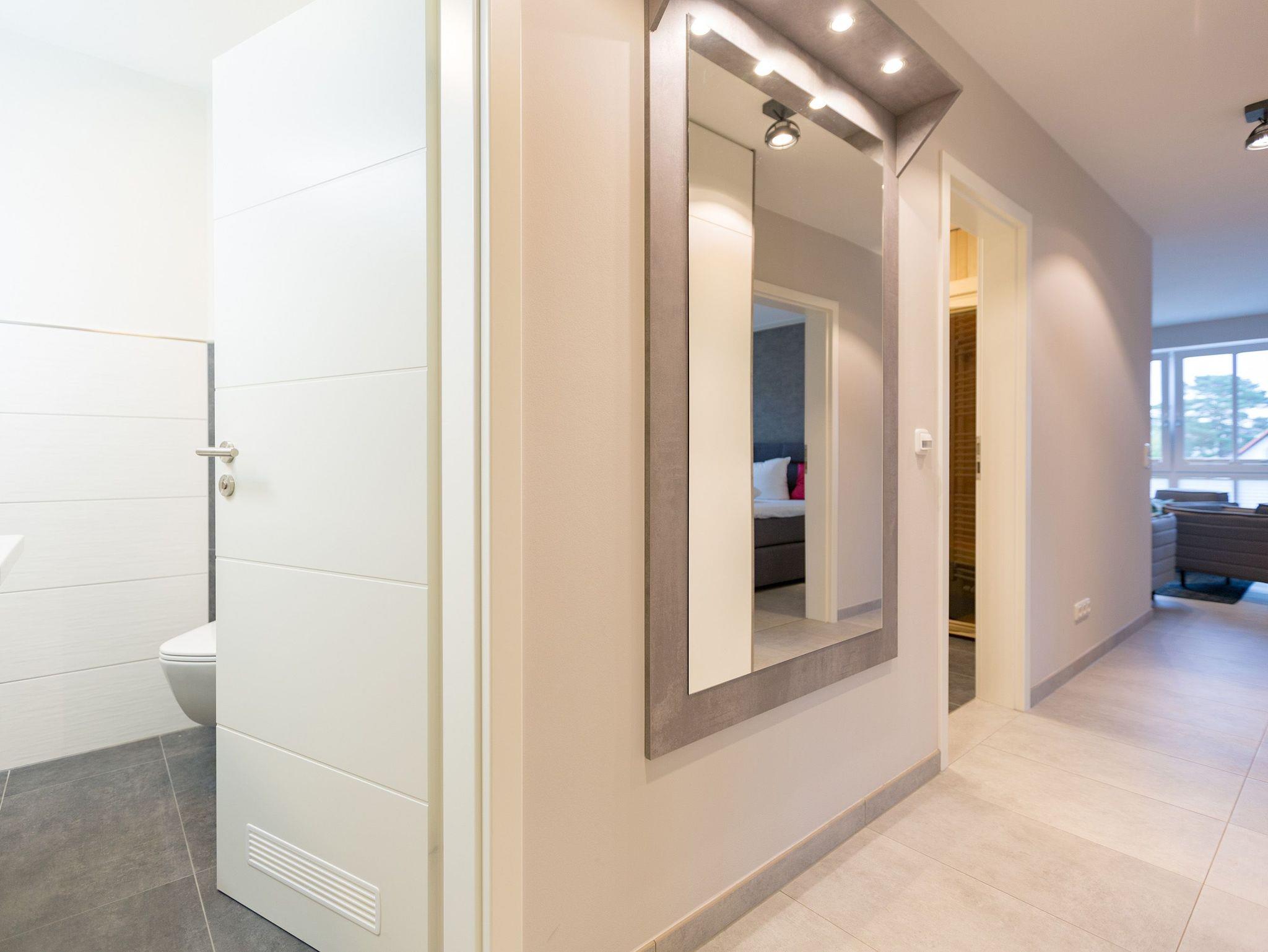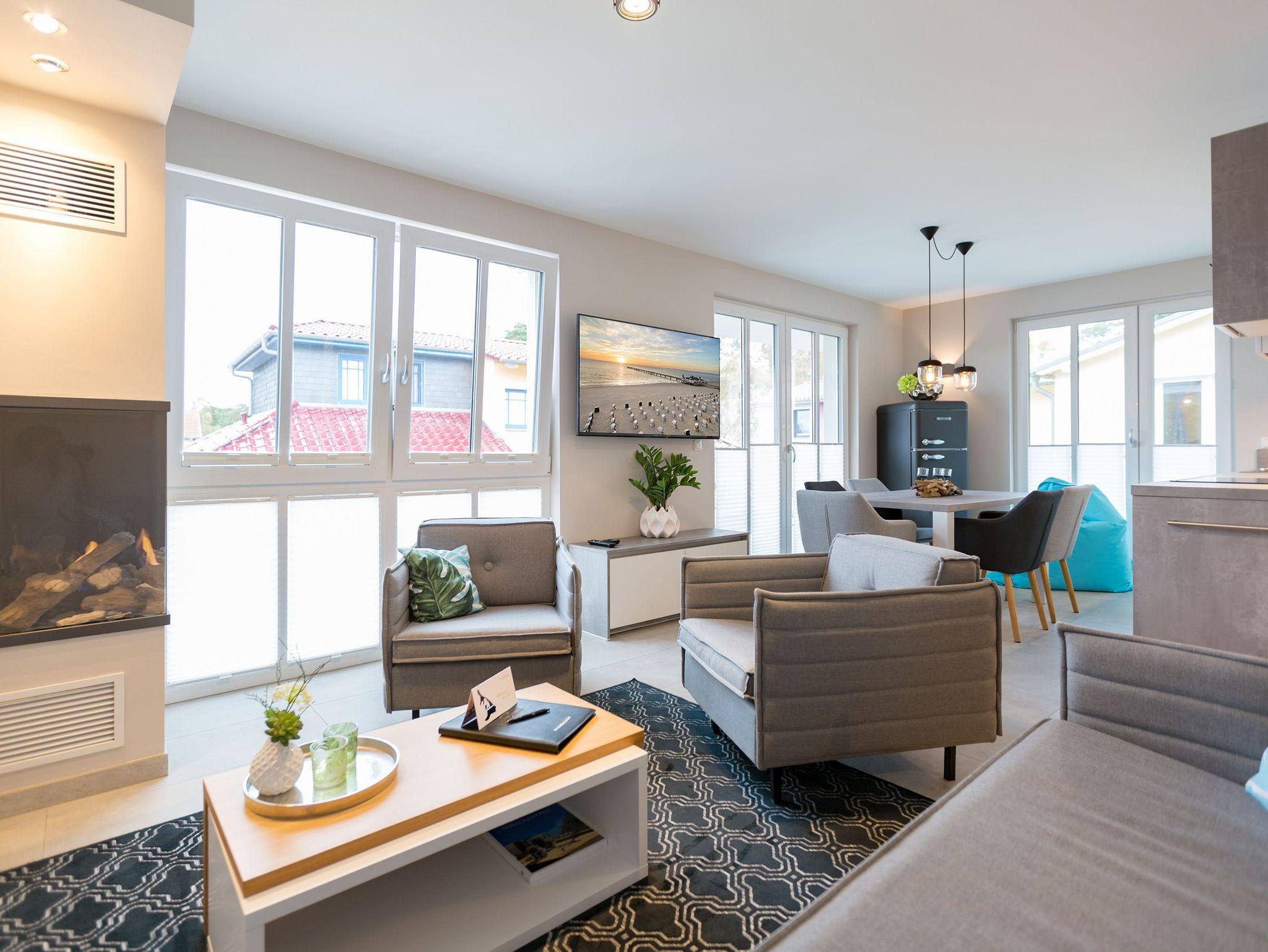 Viel Platz zum Wohlfühlen und Urlauben wartet auf Sie in den 59 Quadratmetern dieses ausgesucht schönen Appartements ( für 4 Erwachsene [&] 1 Kleinkind ( bis 3 Jahre im Kinderreisebett). Gerade das geräumige Wohn-Esszimmer ? Mittelpunkt des Domizils ? ist eine echte Wohlfühlzone mit lichter Leichtigkeit durch große Fenster, stylische Möbel und einer modernen und hochwertig ausgestatteten Küche. Ein Hingucker ist der große Amerikanische Retro-Kühlschrank. Sofas und Sessel laden zum Relaxen ein. Ein Gas-Kamin sorgt auf Knopfdruck für Behaglichkeit; ein Flat-TV für die digitale Unterhaltung. Am schönen Esstisch sind gemütliche Plauder- und Mußestunden garantiert. Kochen Sie gemeinsam. Denn es ist alles da, um es sich richtig gut gehen zu lassen. Edles Geschirr rundet das optische Genussbild ab. Das Appartement verfügt über zwei sonnenüberflutete, 13 Quadratmeter große Südost- und Südwest-Balkone. In jedem der beiden Schlafzimmer befindet sich ein bequemes Boxspringdoppelbett (1,80 m x 2,00 m), das nicht nur das Schlafen zum Vergnügen macht. Entspannen können Sie auch wunderbar in der wohnungseigenen Finnischen Sauna, die direkt ins Badezimmer eingebaut ist. Wem an ungemütlichen Tagen kalt ist, dem wird hier ganz sicher schnell wieder wohlig warm. Abbrausen können Sie sich gleich unter der geräumigen Dusche. Im Bad gibt es zudem einen Waschtisch und ein WC. Ein separates Gäste-WC gibt es in der Wohnung ebenfalls. Für Ihren Komfort sind die Betten bei der Anreise bereits bezogen und Handtücher liegen bereit. Das WLAN ist in der Wohnung kostenfrei und ein Stellplatz Nr. 6 ist für Sie am Haus reserviert. Ein echtes Urlaubsparadies wartet also nur darauf, dass Sie ankommen und am liebsten gar nicht wieder weg wollen.