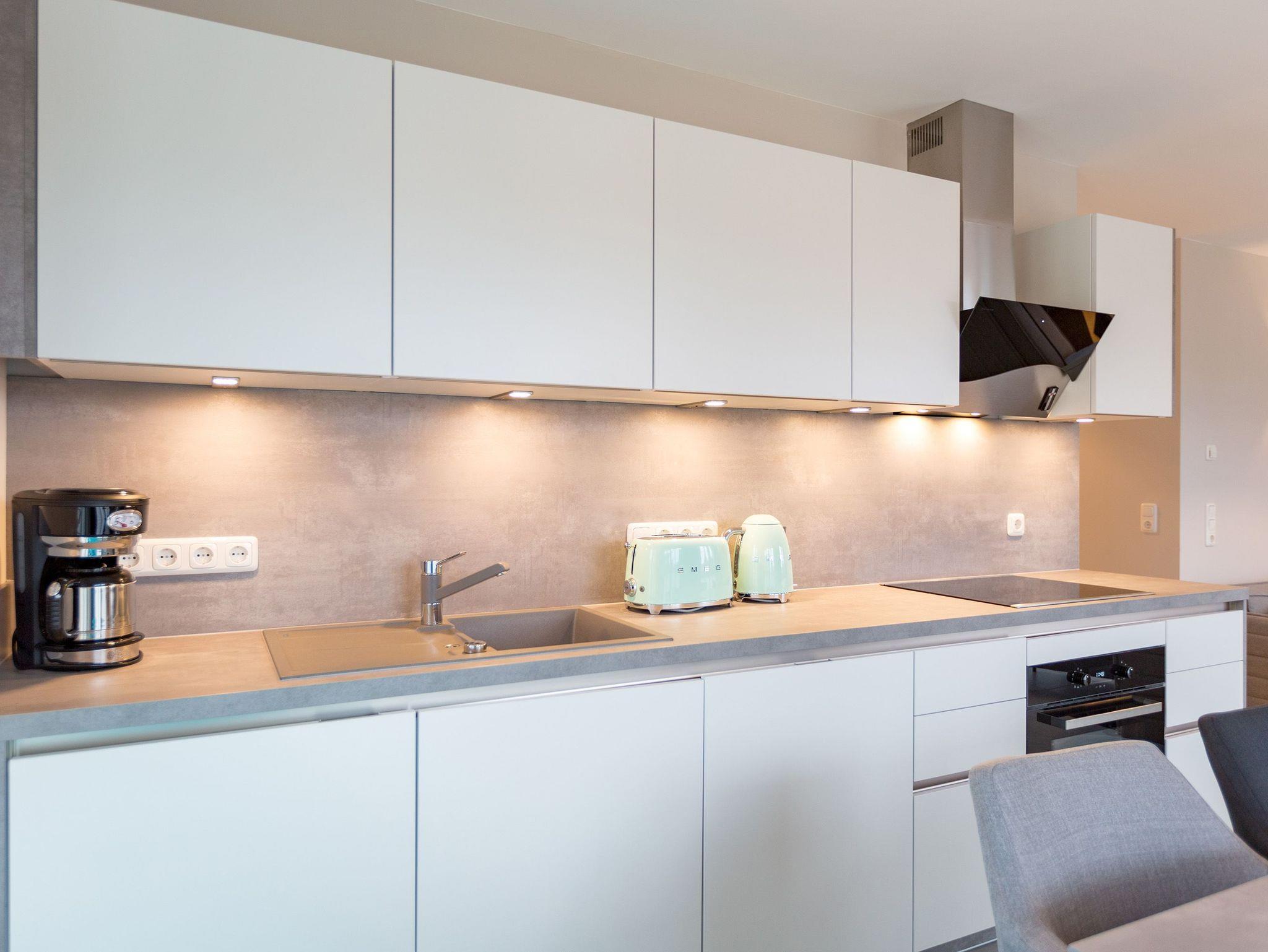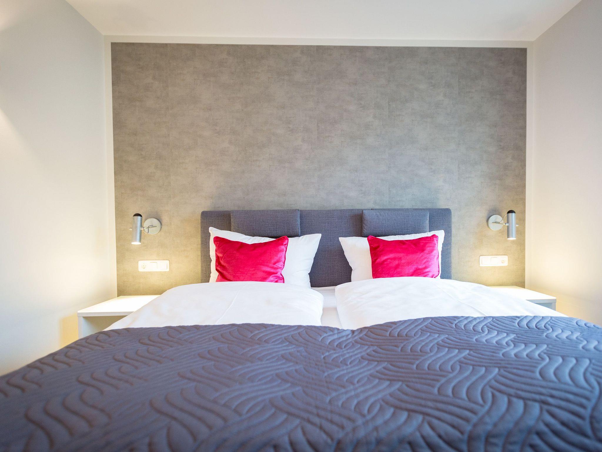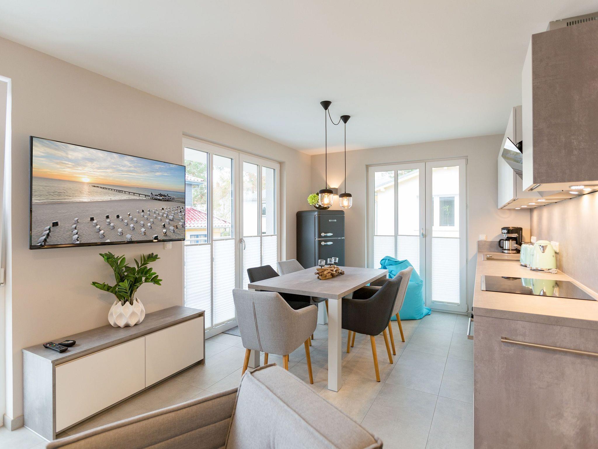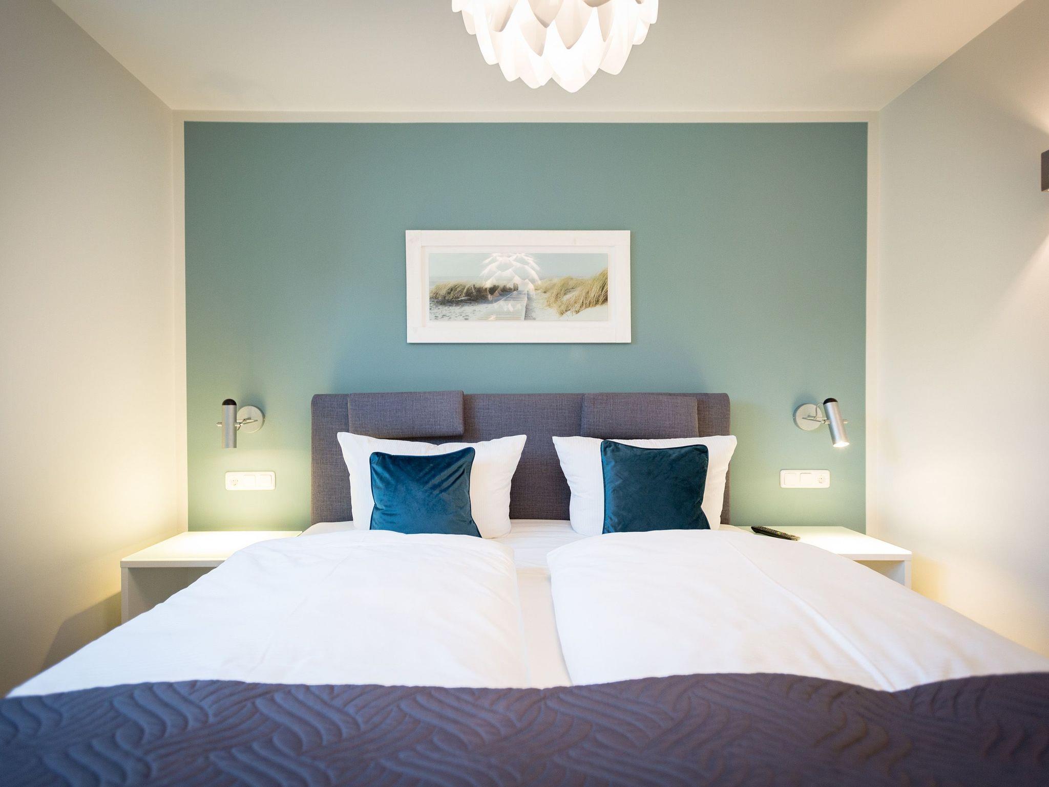 Viel Platz zum Wohlfühlen und Urlauben wartet auf Sie in den 59 Quadratmetern dieses ausgesucht schönen Appartements ( für 4 Erwachsene [&] 1 Kleinkind ( bis 3 Jahre im Kinderreisebett). Gerade das geräumige Wohn-Esszimmer ? Mittelpunkt des Domizils ? ist eine echte Wohlfühlzone mit lichter Leichtigkeit durch große Fenster, stylische Möbel und einer modernen und hochwertig ausgestatteten Küche. Ein Hingucker ist der große Amerikanische Retro-Kühlschrank. Sofas und Sessel laden zum Relaxen ein. Ein Gas-Kamin sorgt auf Knopfdruck für Behaglichkeit; ein Flat-TV für die digitale Unterhaltung. Am schönen Esstisch sind gemütliche Plauder- und Mußestunden garantiert. Kochen Sie gemeinsam. Denn es ist alles da, um es sich richtig gut gehen zu lassen. Edles Geschirr rundet das optische Genussbild ab. Das Appartement verfügt über zwei sonnenüberflutete, 13 Quadratmeter große Südost- und Südwest-Balkone. In jedem der beiden Schlafzimmer befindet sich ein bequemes Boxspringdoppelbett (1,80 m x 2,00 m), das nicht nur das Schlafen zum Vergnügen macht. Entspannen können Sie auch wunderbar in der wohnungseigenen Finnischen Sauna, die direkt ins Badezimmer eingebaut ist. Wem an ungemütlichen Tagen kalt ist, dem wird hier ganz sicher schnell wieder wohlig warm. Abbrausen können Sie sich gleich unter der geräumigen Dusche. Im Bad gibt es zudem einen Waschtisch und ein WC. Ein separates Gäste-WC gibt es in der Wohnung ebenfalls. Für Ihren Komfort sind die Betten bei der Anreise bereits bezogen und Handtücher liegen bereit. Das WLAN ist in der Wohnung kostenfrei und ein Stellplatz Nr. 6 ist für Sie am Haus reserviert. Ein echtes Urlaubsparadies wartet also nur darauf, dass Sie ankommen und am liebsten gar nicht wieder weg wollen.