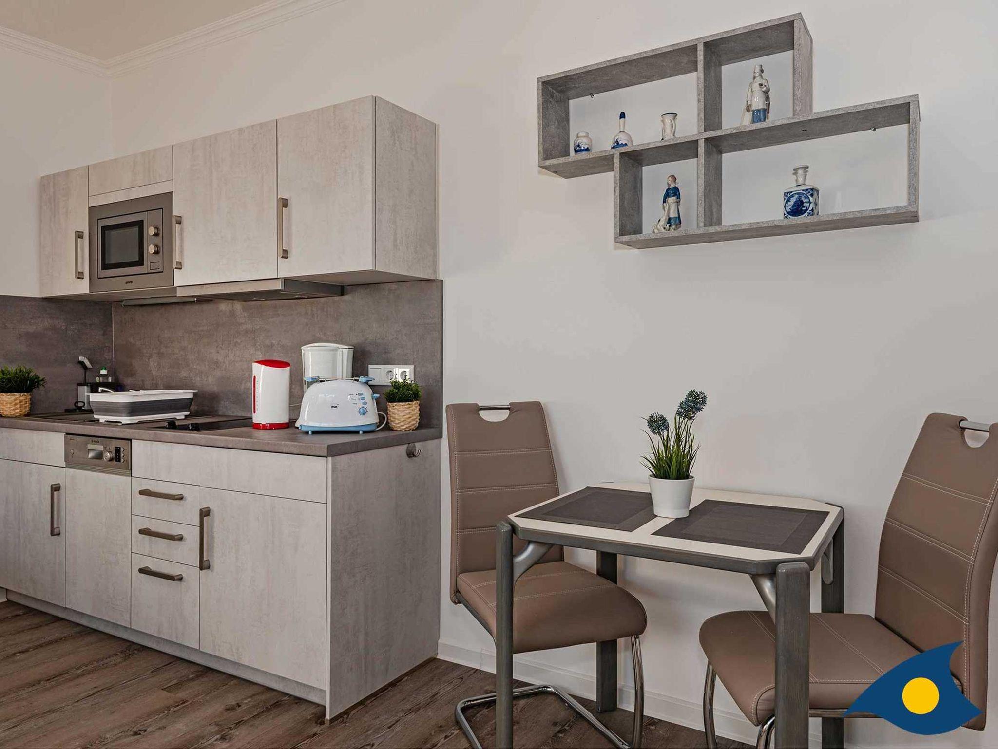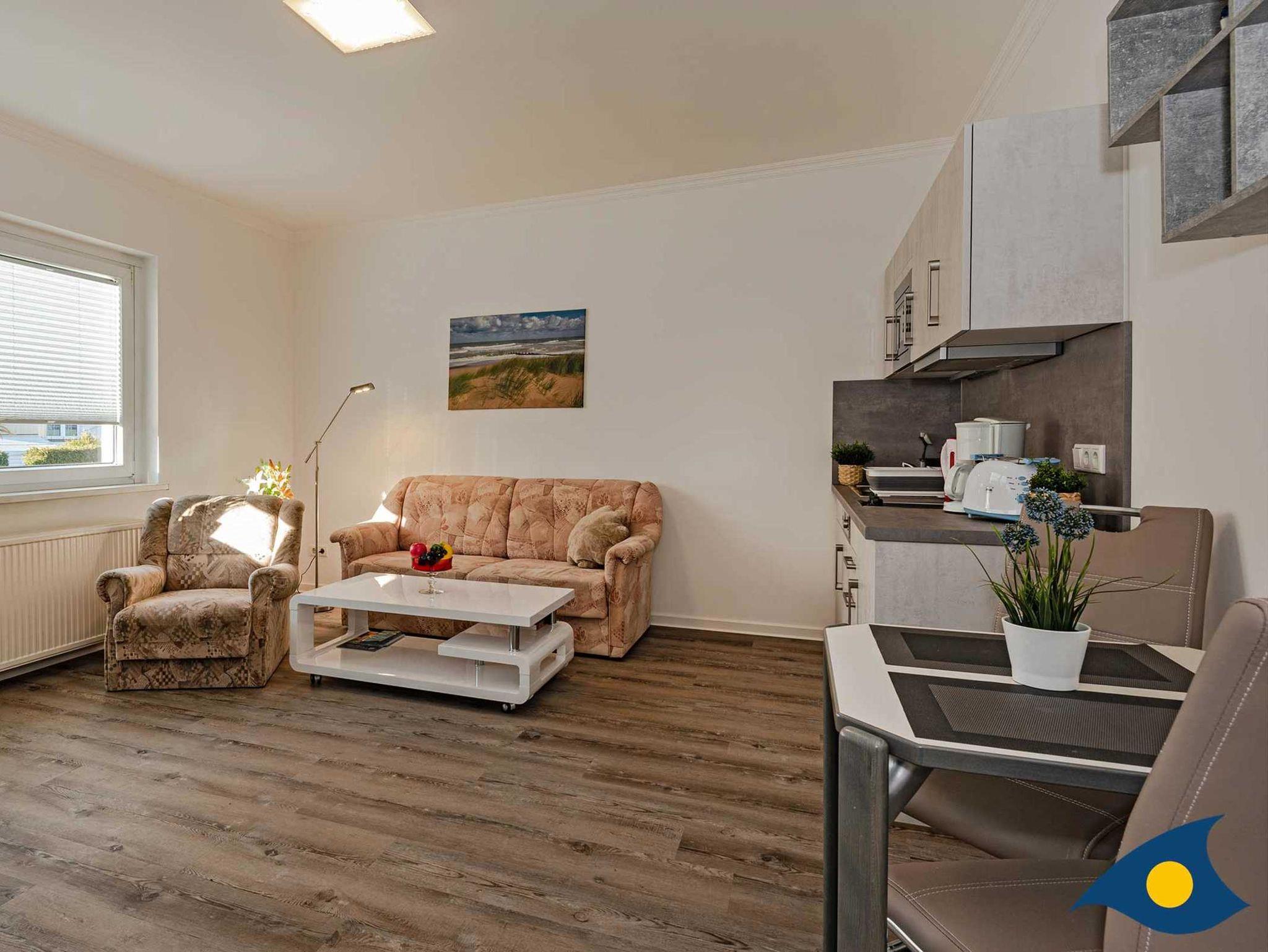Die Wohnung 2 ist ca. 45 qm groß und besteht aus einem gemütlich eingerichtetem Wohnzimmer mit integrierter moderner Küche (mit Geschirrspüler), einem Schlafzimmer mit bequemen Doppelbett und ein Badezimmer mit WC und Badewanne mit Duschabteil. Vor der Ferienwohnung befindet sich eine Sitzgelegenheit.
