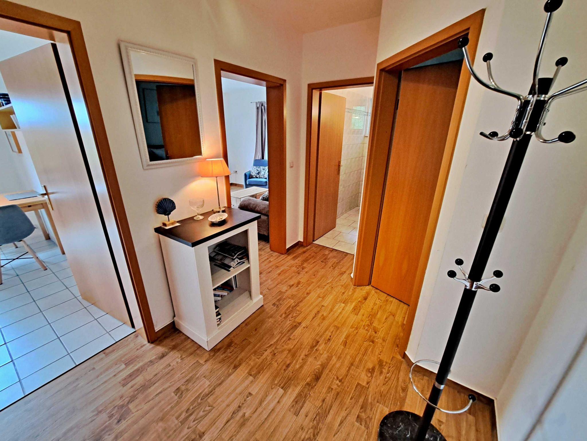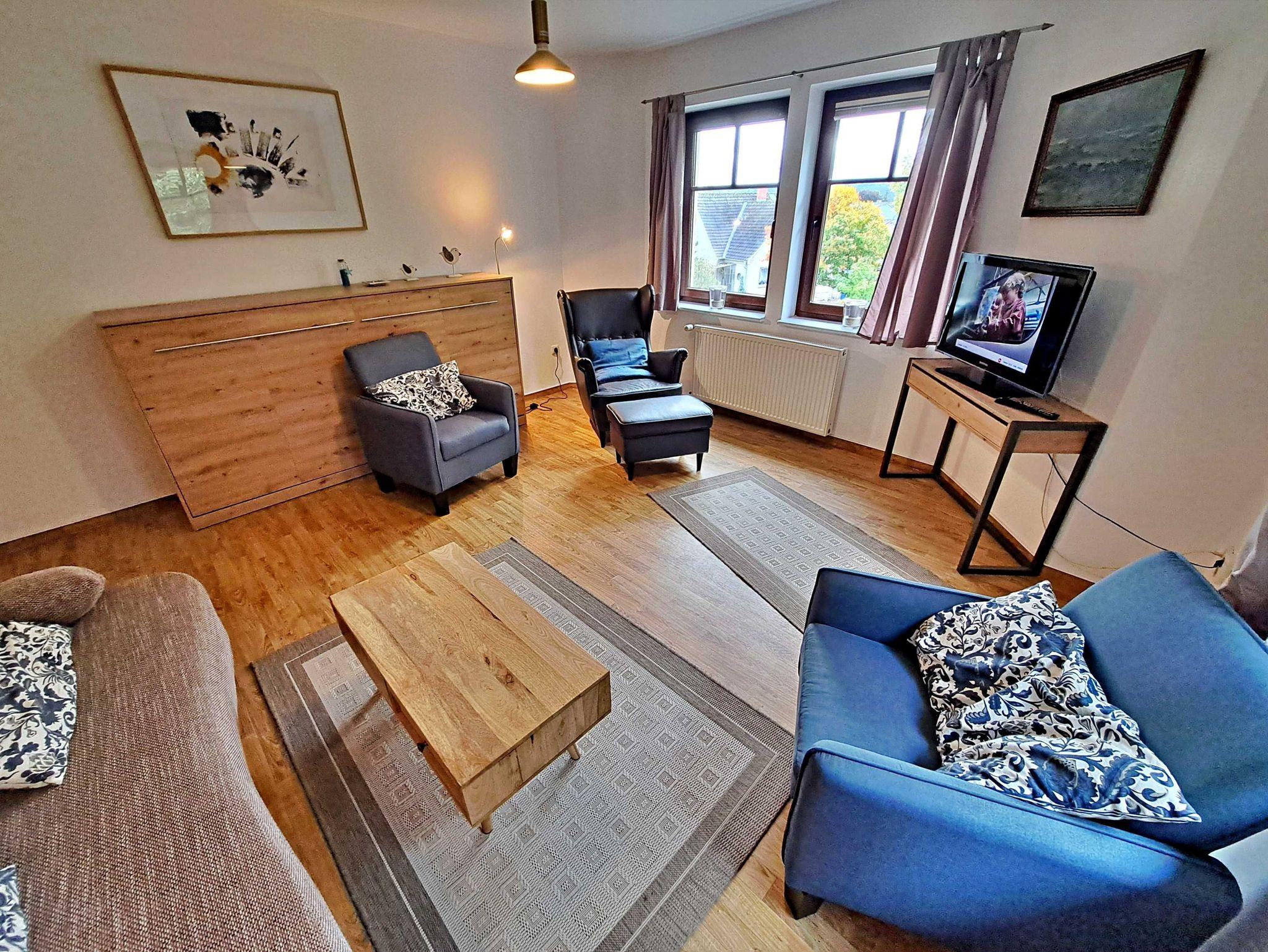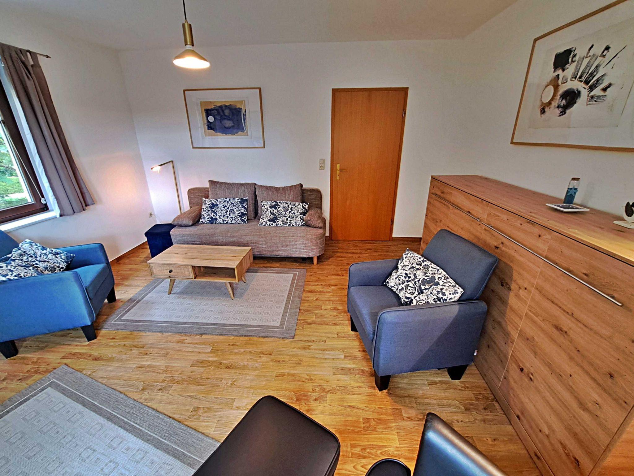 Charmant, hell und freundlich - mit einer großzügigen Fläche von 52 qm bietet diese freundliche Unterkunft im Obergeschoss alles, was Sie für einen angenehmen Aufenthalt benötigen. Das einladende Wohnzimmer verfügt über eine großzügige Sitzecke, ideal zum Entspannen und Flachbild-TV. Das Schlafzimmer ist mit einem komfortablen Doppelbett ausgestattet, das für erholsame Nächte sorgt. In der separaten Küche finden Sie alles, was das Herz begehrt: einen Herd, Backofen, Spülmaschine, Kühlschrank mit Gefrierfach,Kaffemaschine, Wasserkocher, Toaster und einen gemütlichen Essplatz. Das Badezimmer mit Dusche und WC ist direkt vom Schlafzimmer aus zugänglich und zusätzlich steht Ihnen ein Gäste-WC zur Verfügung. Ein praktischer Abstellraum, der von der Küche aus erreichbar ist, rundet den Komfort der Wohnung ab.