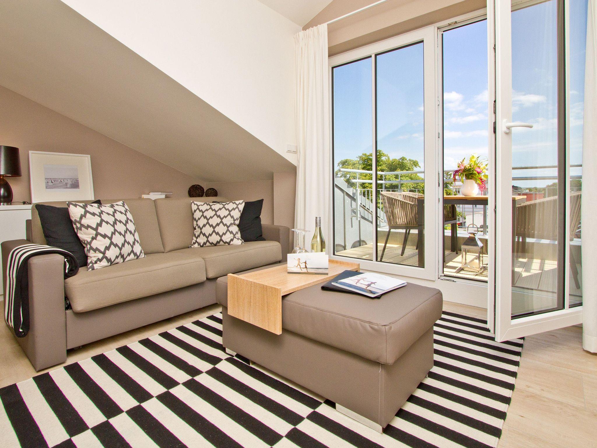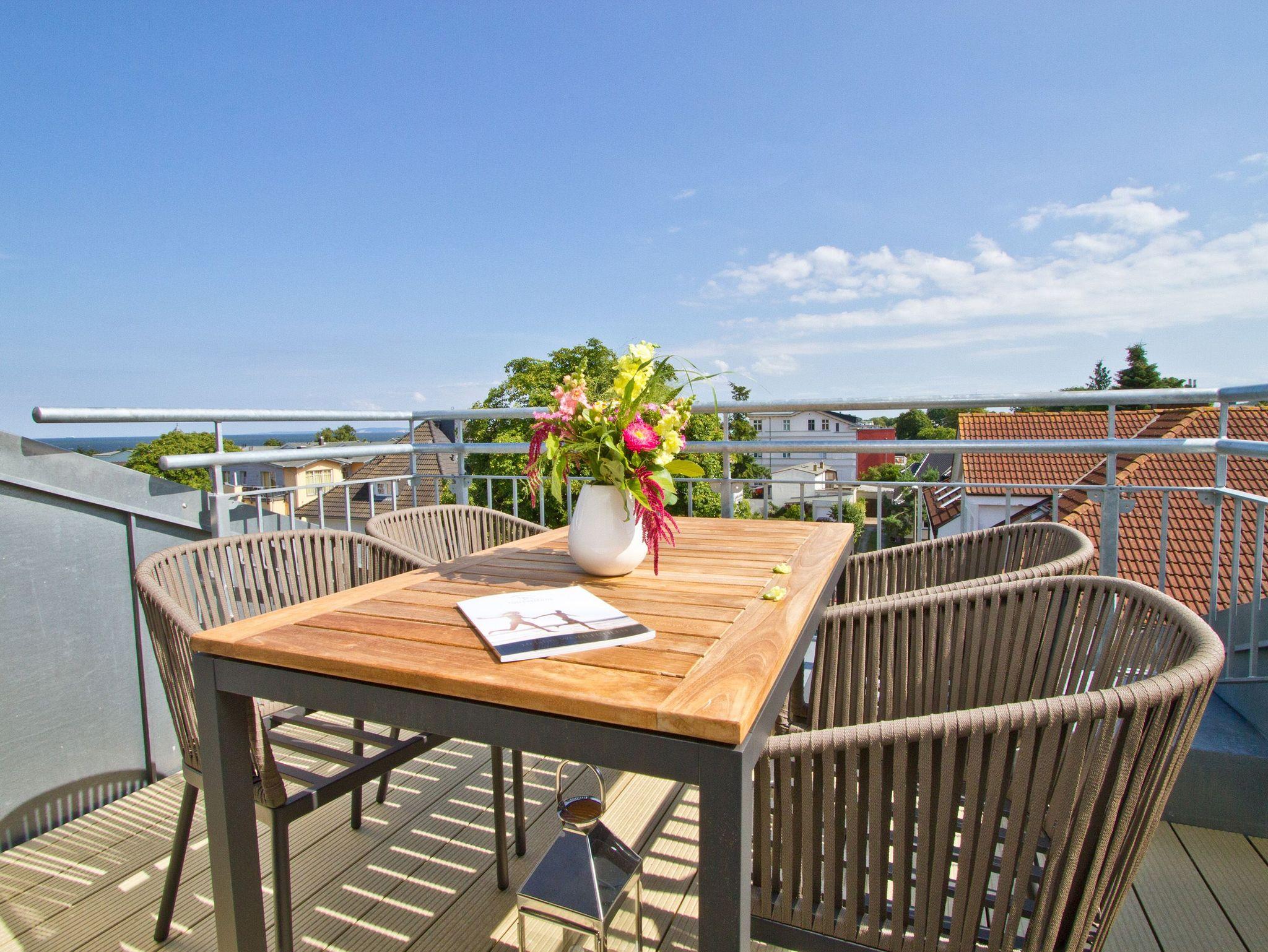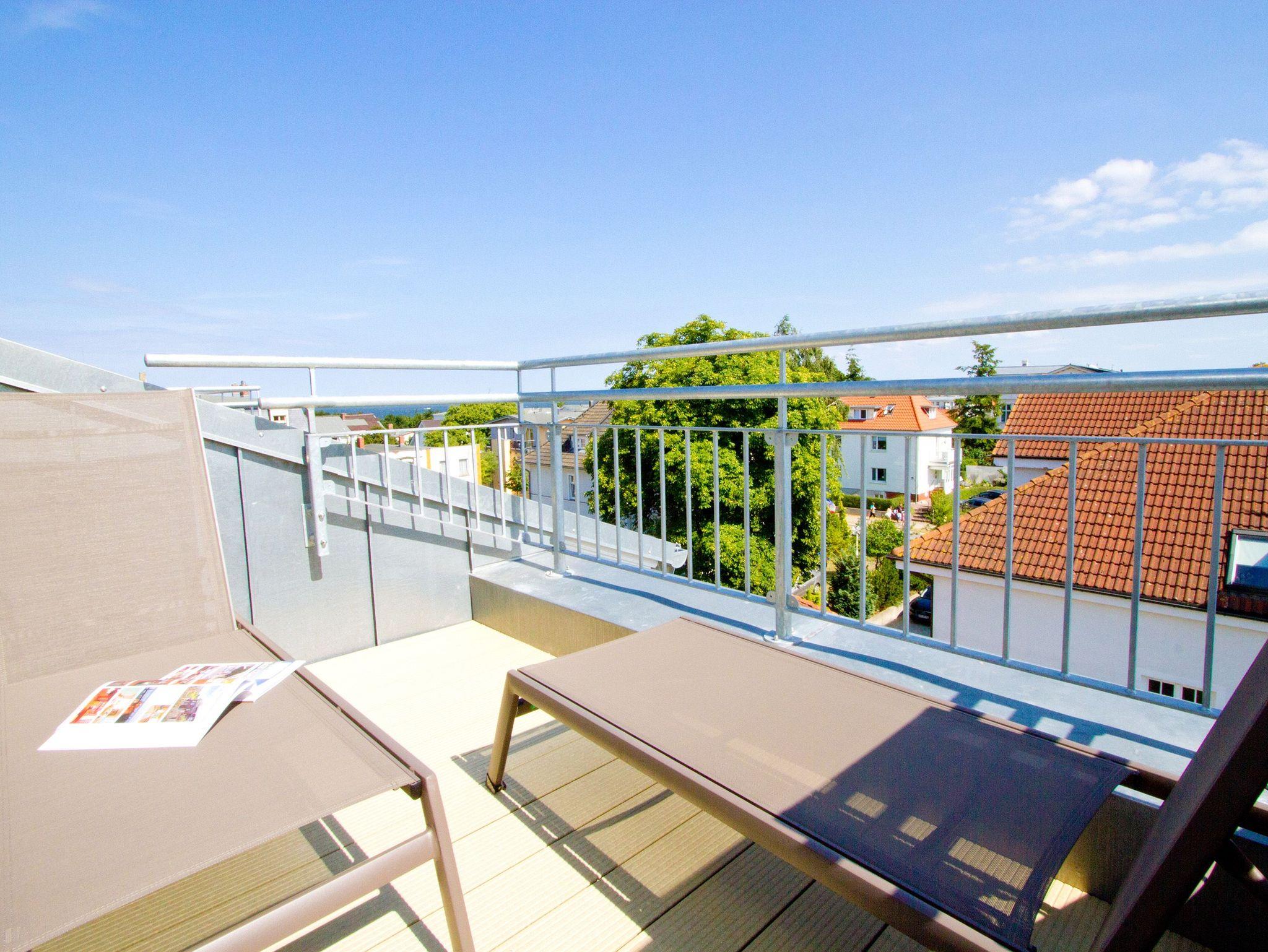 Dieses Domizil [&] den Ausblick auf die Ostsee werden Sie lieben! Direkt unter dem Dach des Hauses gelegen, erwartet Sie eine stylische 2-Raum-Ferienwohnung (55 qm) für 2 Personen und ein Kleinkind (bis 3 Jahre im Kinderreisebett). Modernes Design, geschmackvoll abgestimmte Farben und schöne Dekorationen wurden von gekonnter Innenarchitektenhand arrangiert und versetzen Sie schnell in Urlaubslaune. Der Wohnbereich mit bequemer Sitzgruppe, Flat- TV und Design-Gaskamin wird ergänzt durch die offene, komplett ausgestattete Küche und den angrenzenden Essplatz. Das Schlafzimmer mit komfortablen Einbauten und Boxspringbett (1,80 x 2 m) verfügt über einen schönen Balkon (Ostseite) mit Blick auf die Ostsee. Auch der zweite sonnige Balkon (mit Zugang vom Wohnbereich) mit Gartenmöbeln bietet über die Dächer der alten Villen einen schönen Blick auf das Meer. Im großzügigen Bad finden Sie eine Echtglasdusche [&] WC. Für Ihren Komfort sind die Betten bei der Anreise bezogen und Handtücher liegen bereit. Ein Pkw-Stellplatz ( Nr. 2) steht in der Tiefgarage zur Verfügung. Auf Wunsch stellen wir ein Kinderreisebett (ohne Matratze [&] Bettzeug) und einen Kinderhochstuhl gegen einen Aufpreis zur Verfügung.