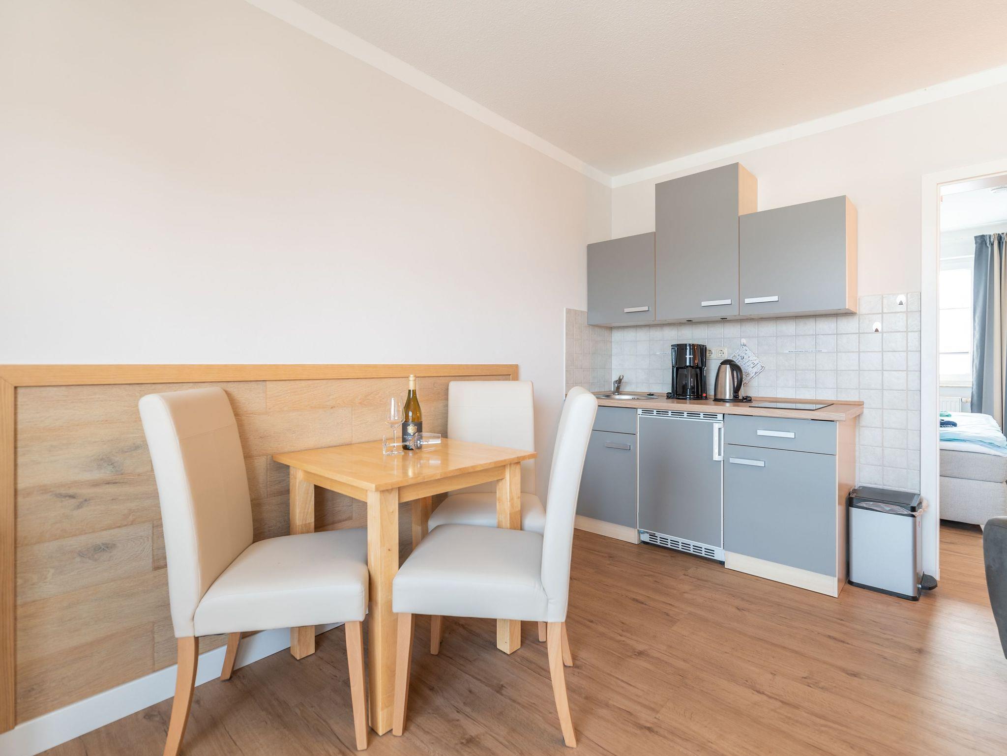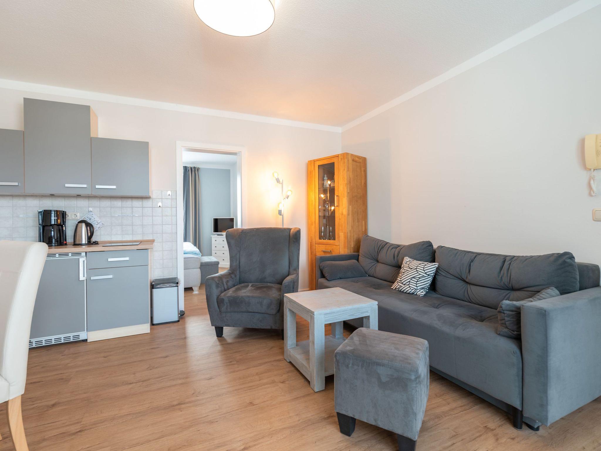 Die FEWO 4 befindet sich im Obergeschoß unseres Hauses. Unsere komfortabele 2-Raum-Fewo ist eine Nichtraucherwohnung. Die Küche ist zum Wohnraum hin offen und mit einer kleinen Küchenzeile ausgestattet. Hier finden Sie einen Kühlschrank, eine Kaffeemaschine, einen Wasserkocher und Geschirr/Besteck. Alles was Sie für einen erholsamen Urlaub benötigen. Die Fewo ist für max. 3 Personen geeignet. Die Schlafmöglichkeiten verteilen sich wie folgt. Es gibt ein Schlafzimmer mit einem Doppelbett, die Couch im Wohnzimmer kann zu einem Bett umfunktioniert werden. Das Badezimmer verfügt über Dusche und WC.