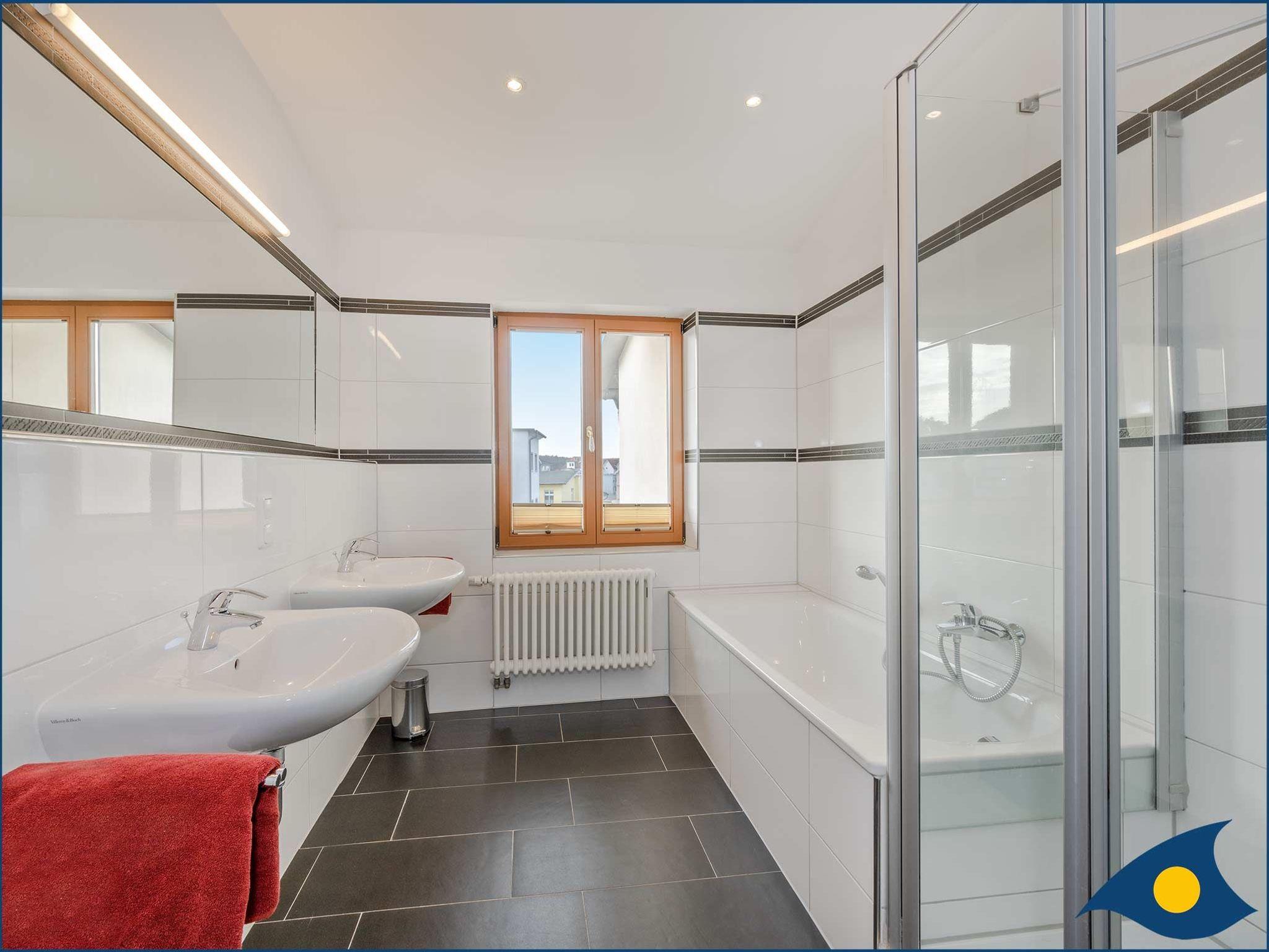 Das Tageslicht-Badezimmer überzeugt mit Badewanne und Dusche sowie zwei Waschbecken und Bidet.
