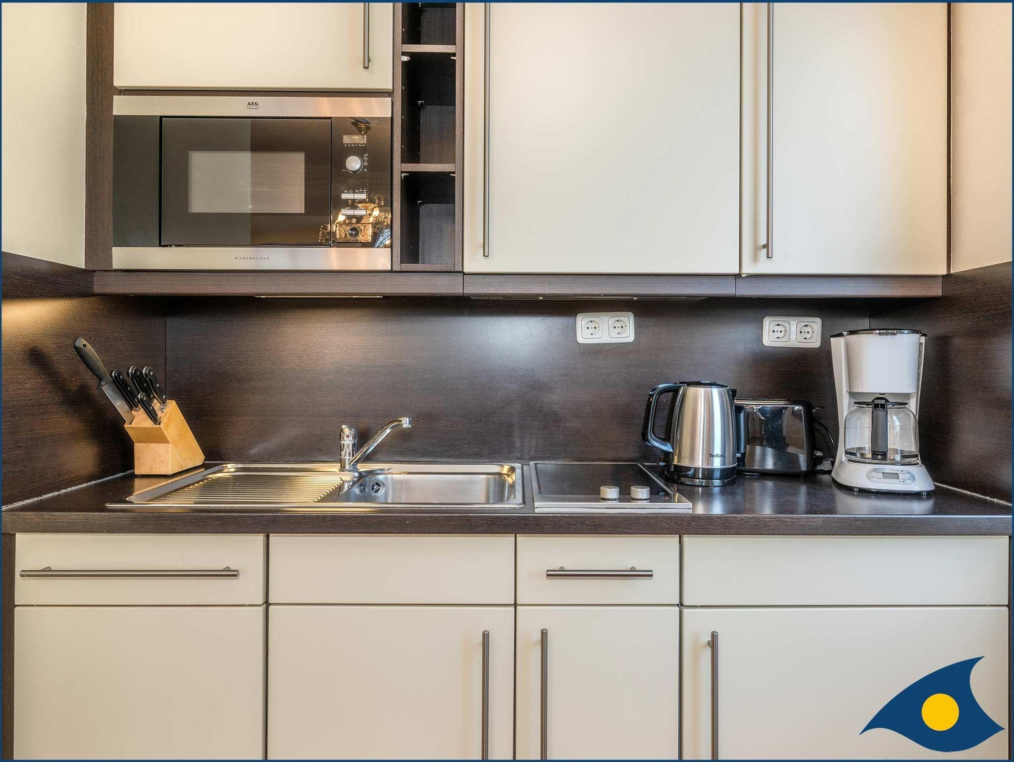 Die offene Küche ist mit einer Spülmaschine, einer Mikrowelle, einem 2 Platten-Ceranfeld und Kühlschrank ausgestattet.