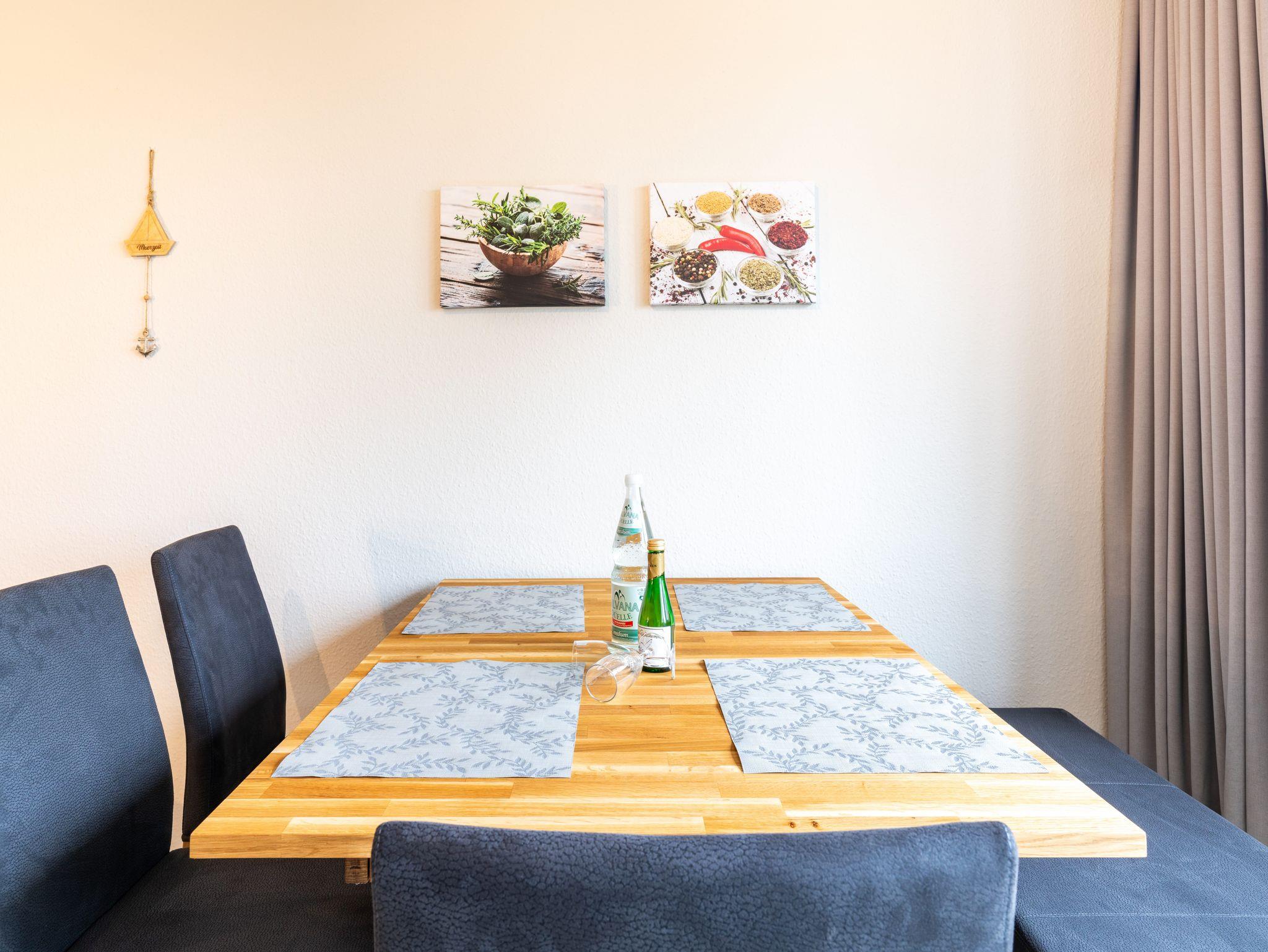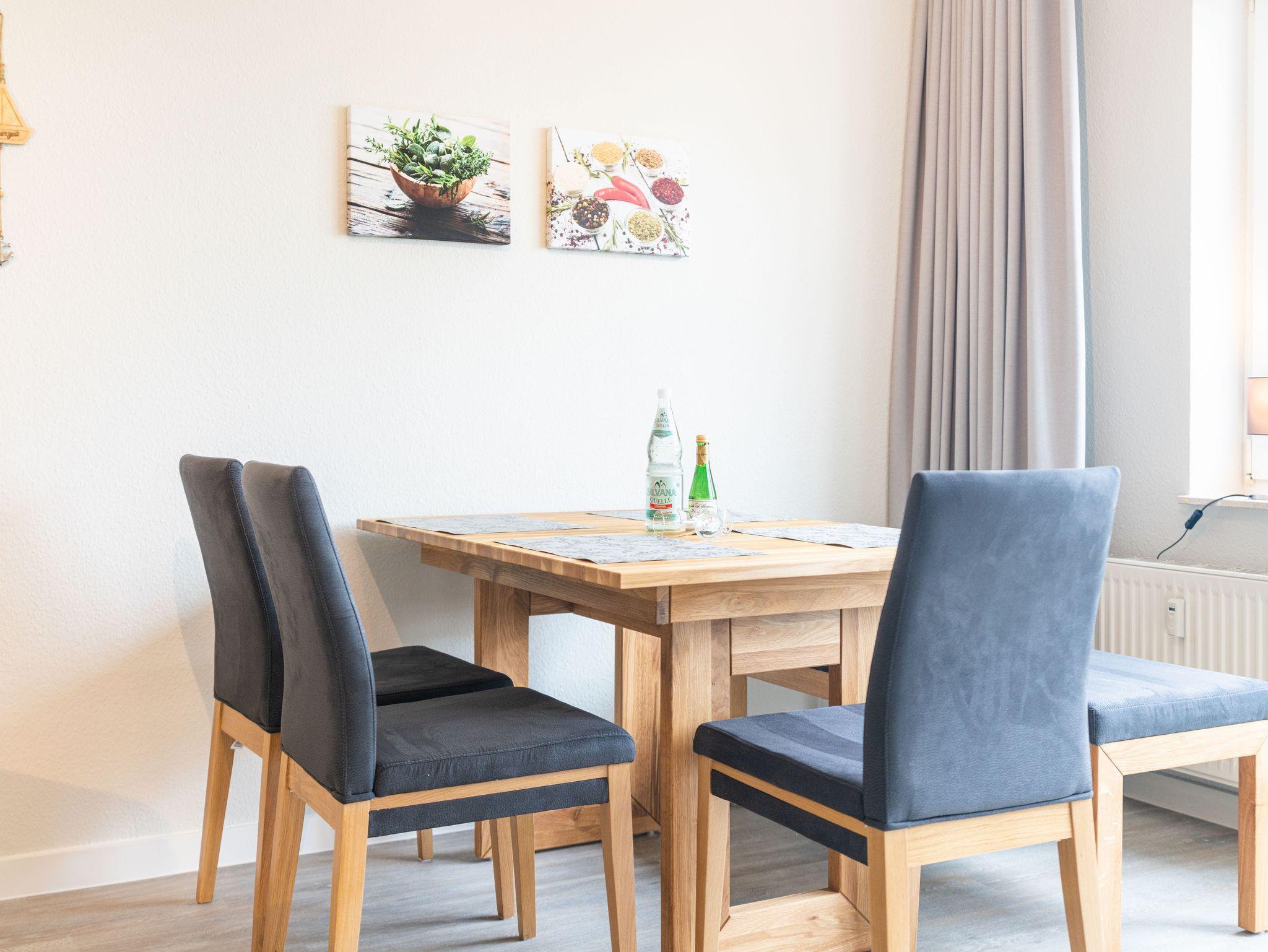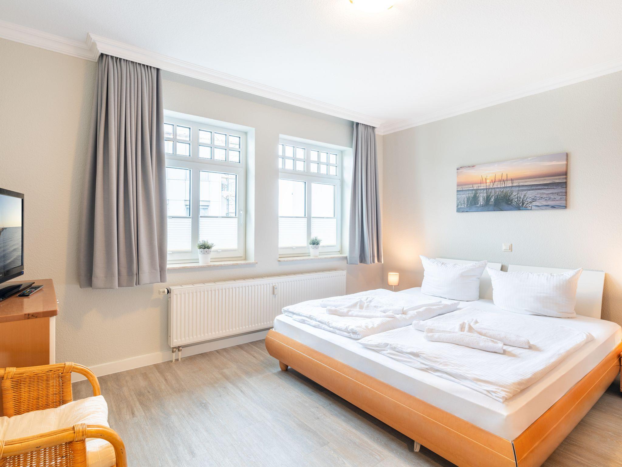 Die 46 qm große Wohnung befindet sich im ersten Obergeschoss und ist für zwei Personen ausgestattet. Die Wohnung verfügt über ein separates Schlafzimmer mit Doppelbett und Sitzgelegenheit, ein geräumiges Wohnzimmer mit Schlafcouch und einem Essplatz. Die kleine Küchenzeile ist mit Kühlschrank, Herd u.v.m. ausgestattet. Bad mit Dusche und WC.