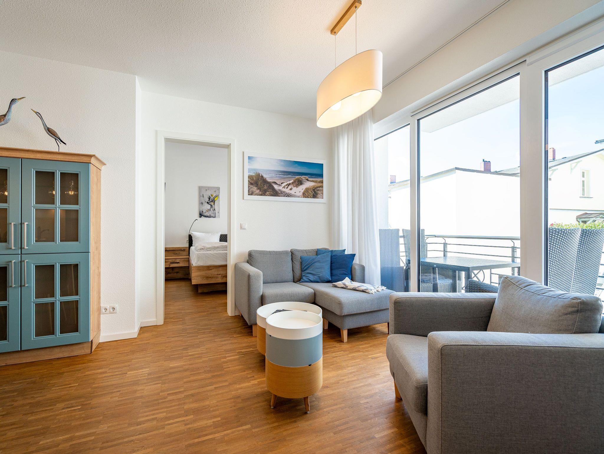 Helle Räume, ein natürliches Mobiliar und eine gemütliche Atmosphäre erwarten Sie in diesem 76qm großen Urlaubsdomizil in Seebad Ahlbeck. Das 3-Zimmer-Appartement im 1. Obergeschoss bietet ausreichend Platz für bis zu 4 Personen. Ob als Familie und Urlaub mit Freunden - hier fühlen sich alle rundum wohl! Der offen gestaltete Wohn-Ess-Bereich verfügt neben einer bequemen Sofalandschaft mit Sessel über einen 32-Zoll Flat-TV und ein Radio mit CD-Player. Die moderne Küche mit Ceranfeld, Backofen, Kühlschrank mit Gefrierfach, Geschirrspüler und Kleinküchengeräten lässt beim Zubereiten Ihrer Speisen keine Wünsche offen. Genießen Sie Ihre Mahlzeiten am Esstisch im skandinavischen Stil oder frühstücken Sie auf dem ca. 5qm großen Süd-West-Balkon direkt gegenüber. Auf Schlafkomfort müssen Sie auch in Ihrem Urlaub in den beiden Schlafzimmern nicht verzichten, die mit bequemen Boxspringbetten (1,80 m x 2,00 m), Flat-TVs und ausreichend Schrankraum für Ihre Urlaubsgarderobe ausgestattet sind. Vor allem befreundete Paare kommen in diesem Appartement in den Luxus zwei getrennter Badezimmer, die jeweils mit Dusche, Waschtisch und WC ausgestattet sind. In einem der beiden Badezimmer befindet sich darüber hinaus eine finnische Sauna, die vor allem an kalten Wintertagen wohlige Entspannung für bis zu 4 Personen verspricht. Ein Waschtrockner im Hauswirtschaftsraum, kostenfreies WLAN und ein Pkw-Stellplatz in der hauseigenen Tiefgarage runden Ihren Usedom-Urlaub ab!