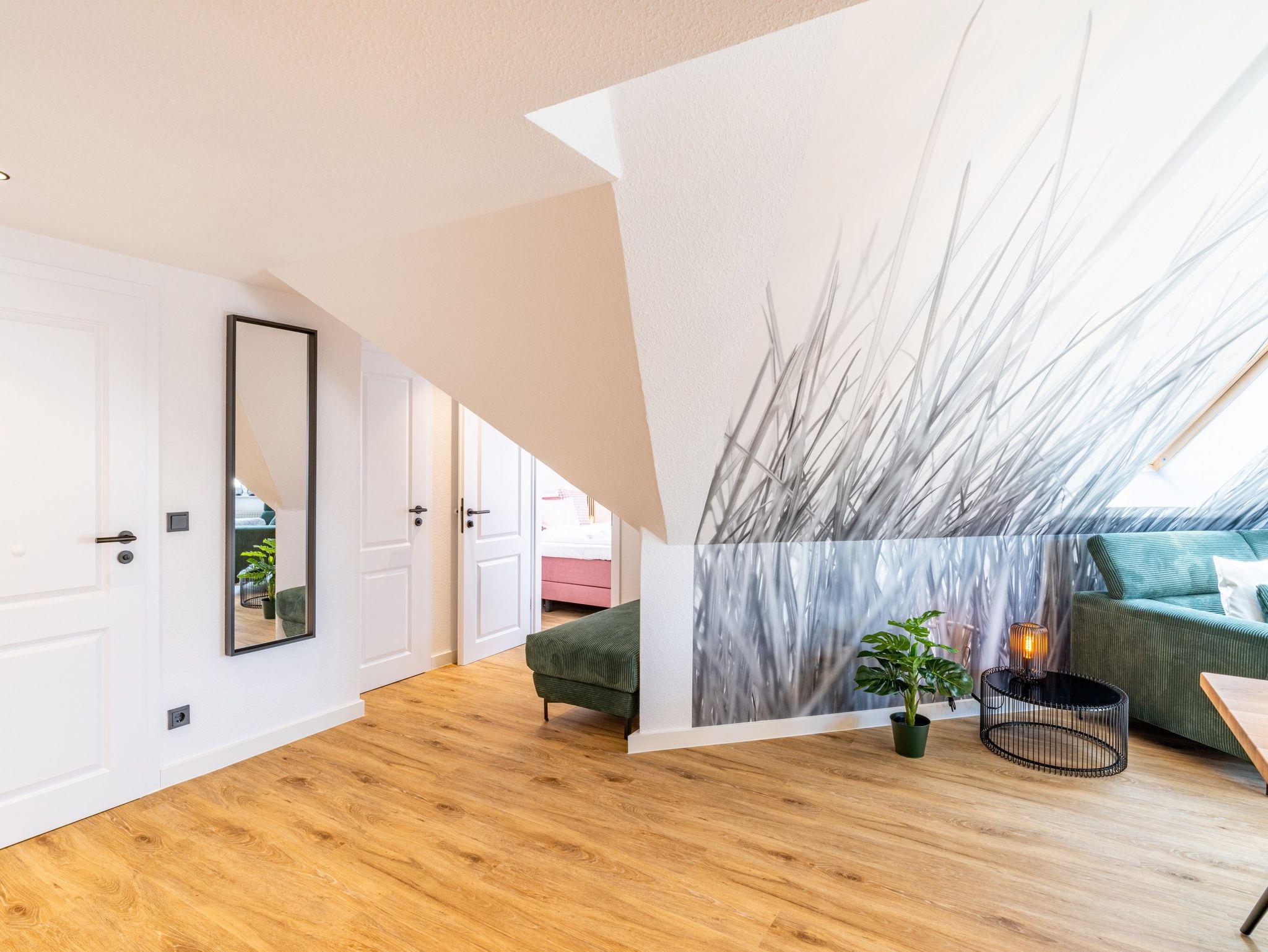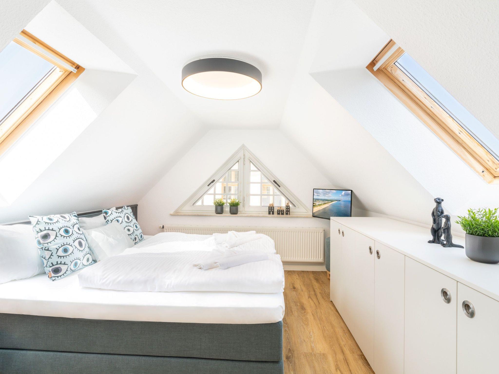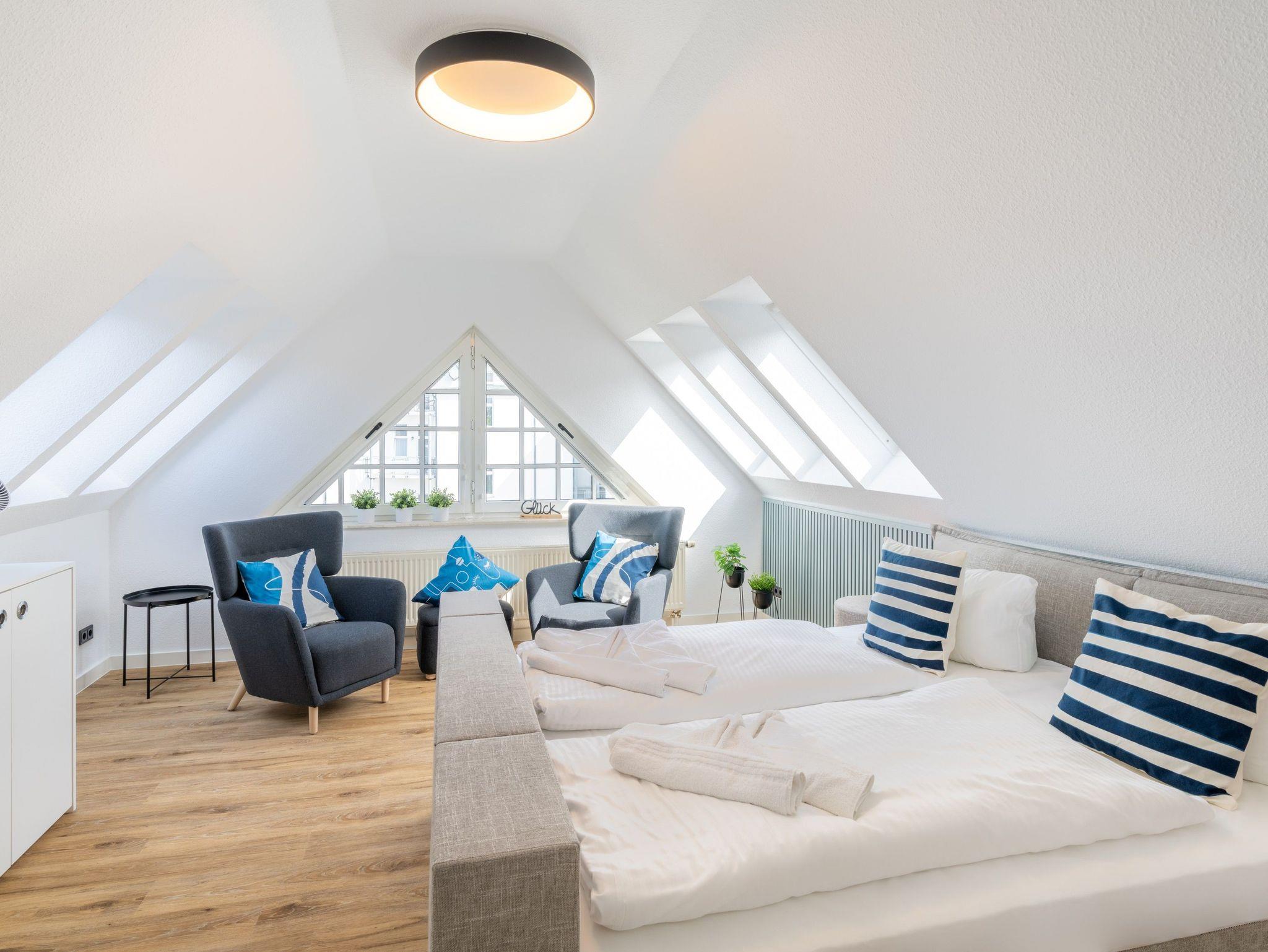 Die 96 qm große und komfortable Wohnung befindet sich im Dachgeschoss und ist für bis zu sechs Personen ausgestattet. Sie wurde 2024 komplett renoviert. Die Wohnung verfügt über drei separate Schlafzimmer mit Doppelbett (mit zusätzlichem TV-Gerät), ein Wohnzimmer mit großzügiger und gemütlicher Couch-Ecke, TV sowie eine offene moderne Küche, ausgestattet mit einem Kühlschrank, Herd, Mikrowelle, Spülmaschine u.v.m.. Zwei Bäder mit ebenerdiger Dusche und WC. Bitte beachten Sie, dass durch die Lage im Dachgeschoss, die Deckenhöhe teilweise etwas niedrig ist.