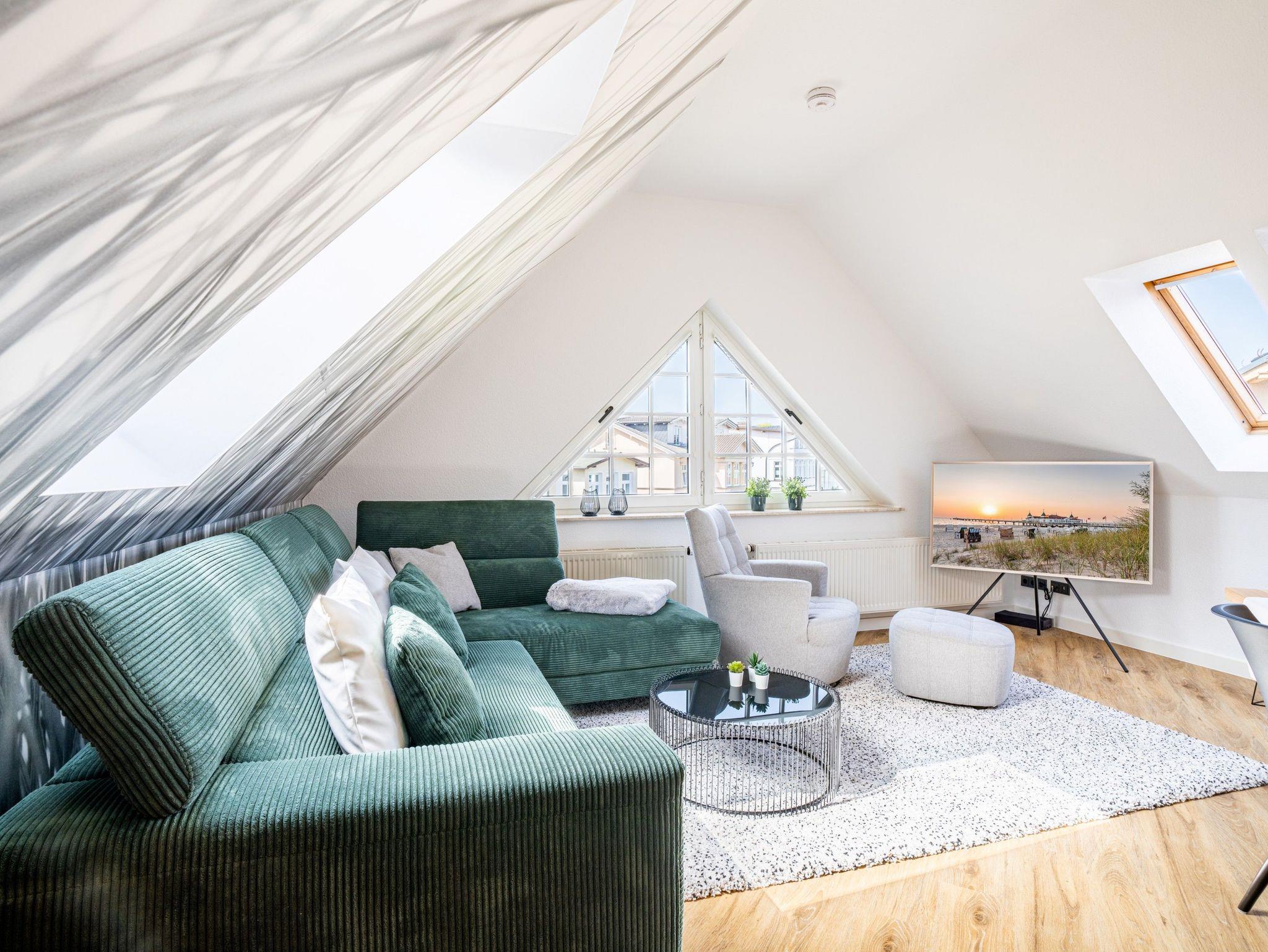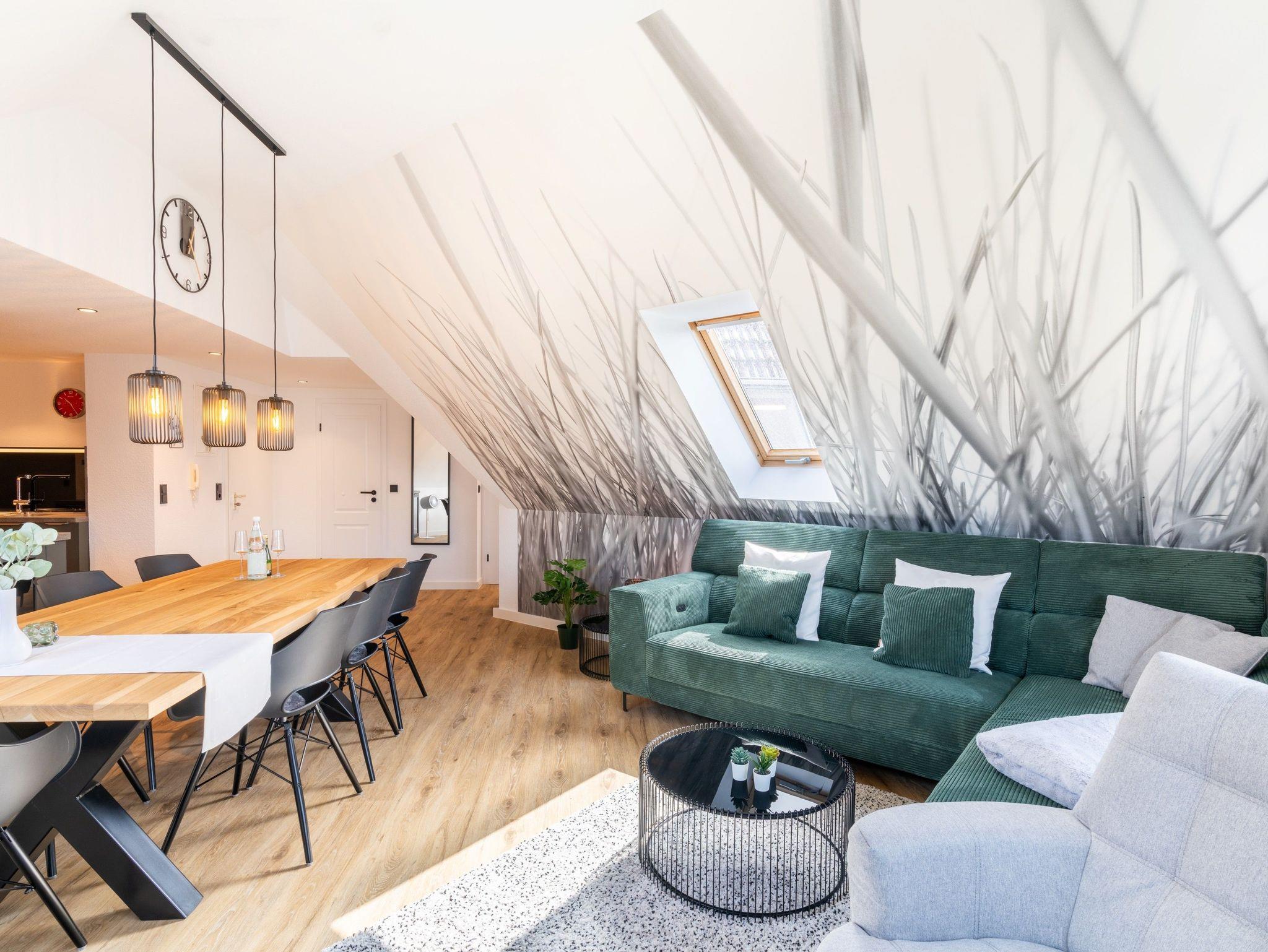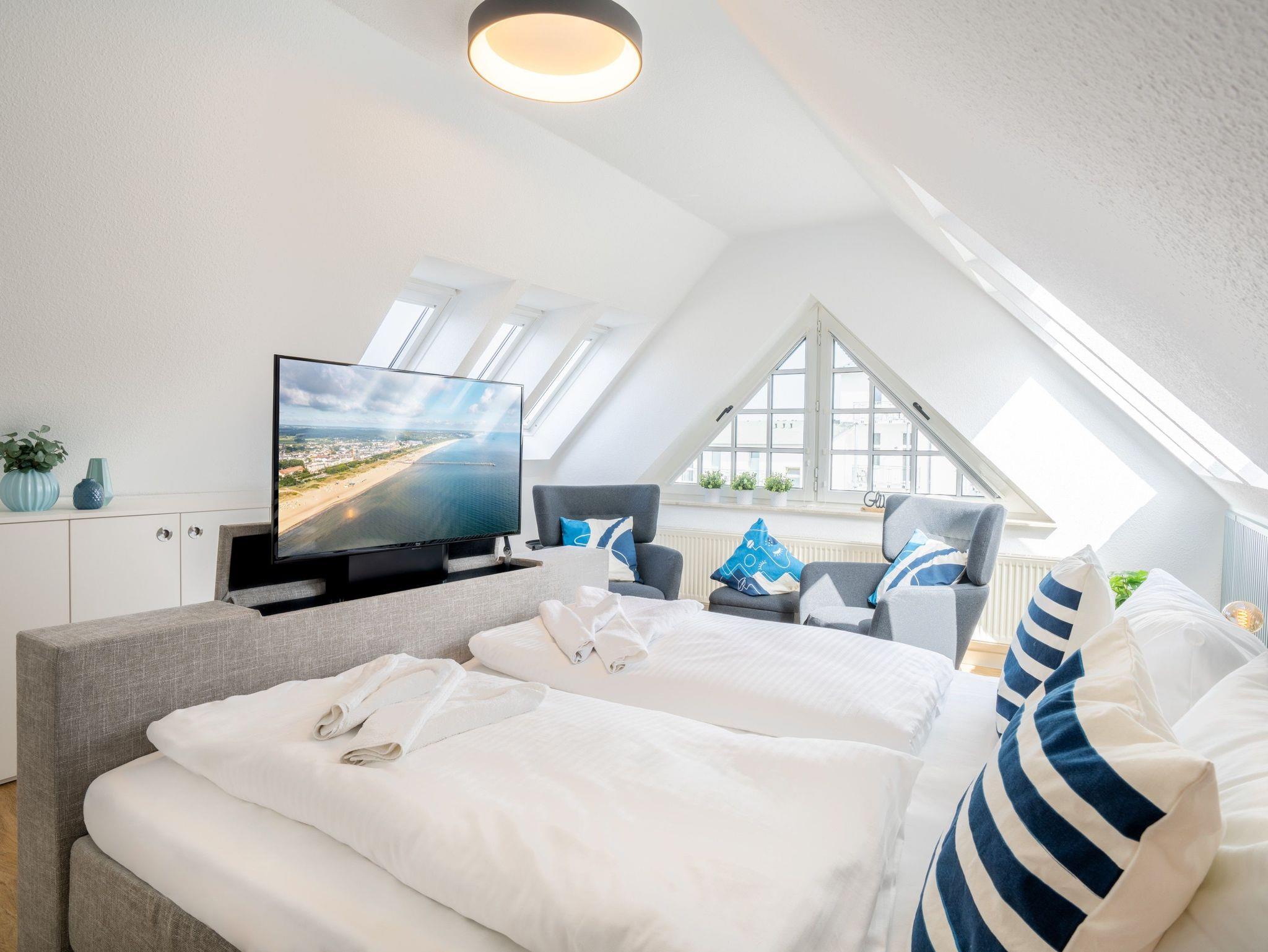 Die 96 qm große und komfortable Wohnung befindet sich im Dachgeschoss und ist für bis zu sechs Personen ausgestattet. Sie wurde 2024 komplett renoviert. Die Wohnung verfügt über drei separate Schlafzimmer mit Doppelbett (mit zusätzlichem TV-Gerät), ein Wohnzimmer mit großzügiger und gemütlicher Couch-Ecke, TV sowie eine offene moderne Küche, ausgestattet mit einem Kühlschrank, Herd, Mikrowelle, Spülmaschine u.v.m.. Zwei Bäder mit ebenerdiger Dusche und WC. Bitte beachten Sie, dass durch die Lage im Dachgeschoss, die Deckenhöhe teilweise etwas niedrig ist.