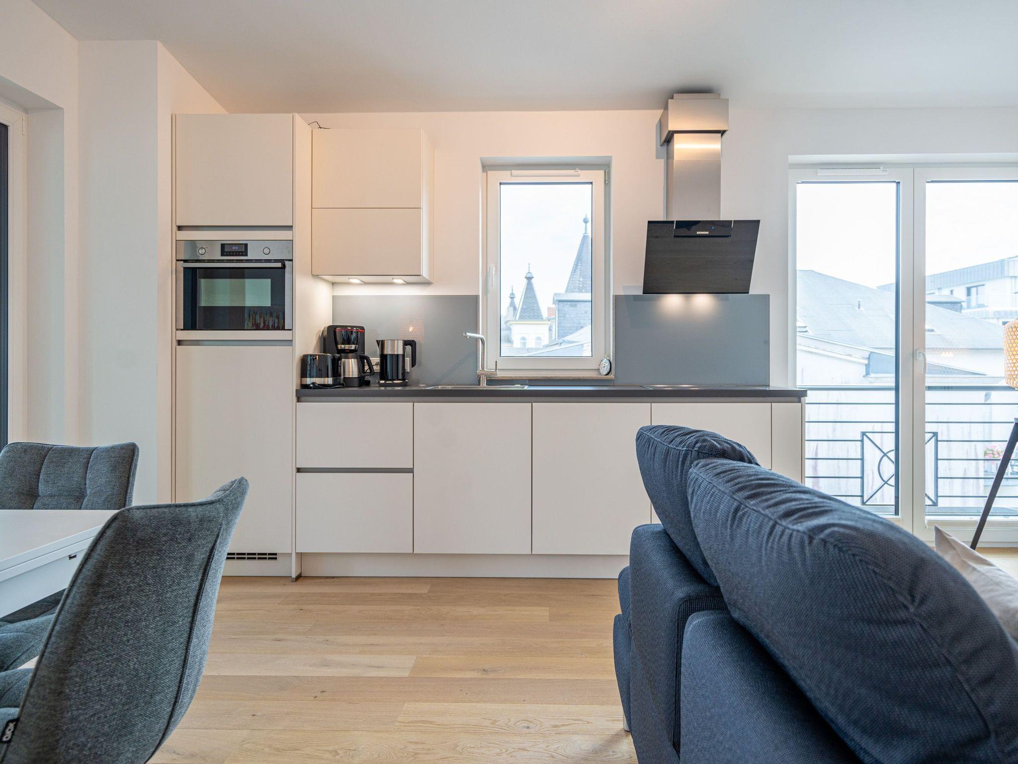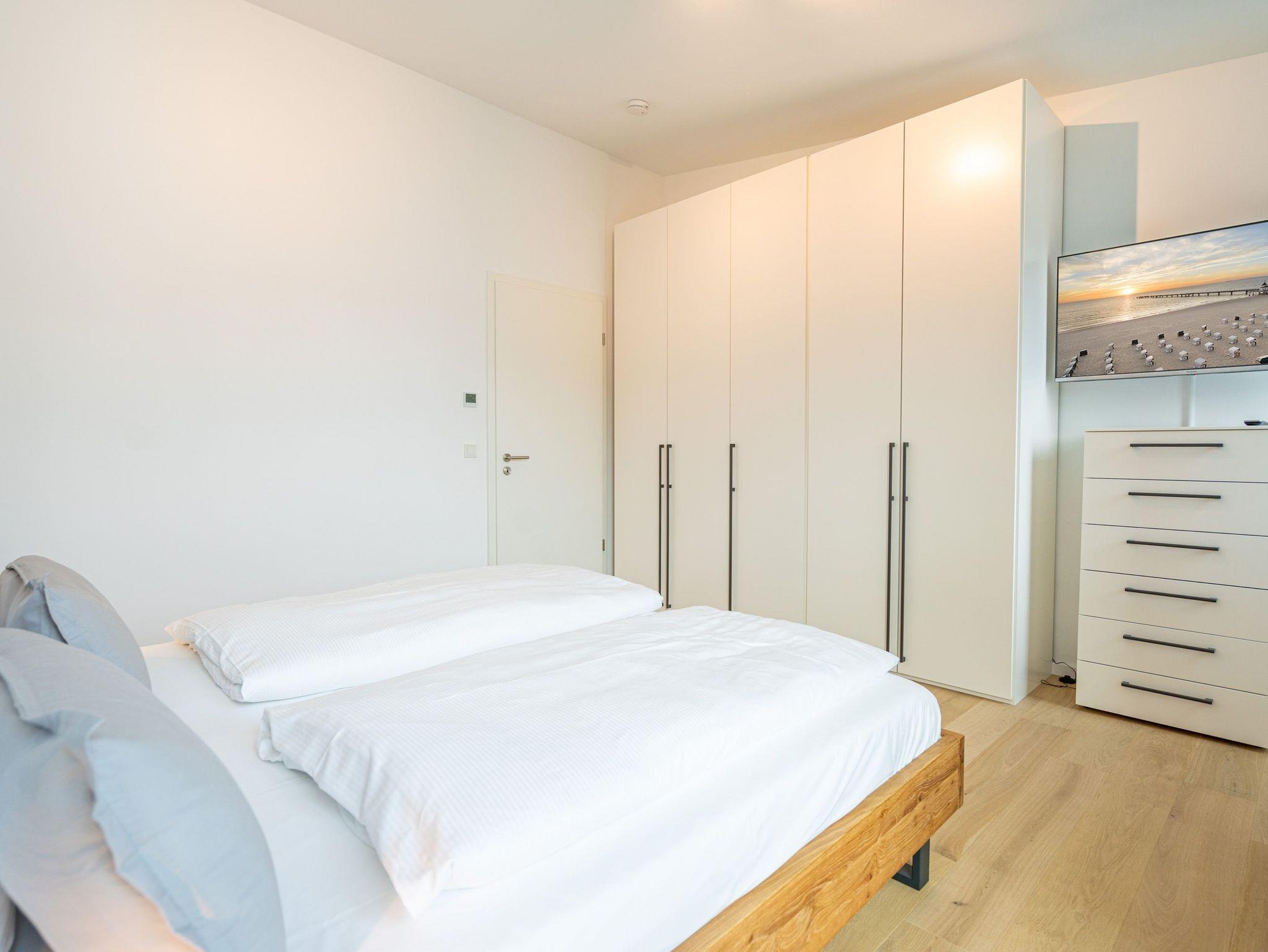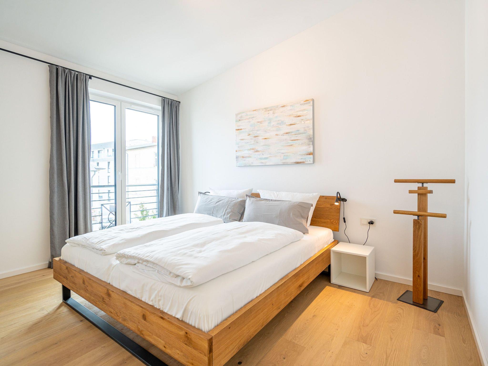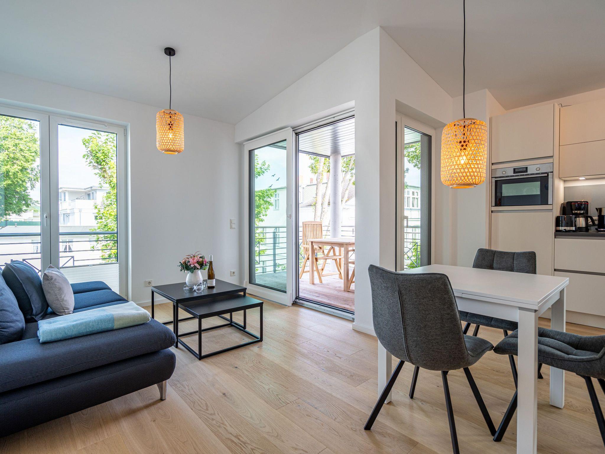 Herzlich willkommen im 2-Raum-Appartement Nr. 10 im Quartier 6, gelegen im 2. Obergeschoss. Dieses stilvolle Ferienapartment bietet Ihnen einen offenen, lichtdurchfluteten Wohnbereich, der mit einer voll ausgestatteten Küchenzeile inklusive Backofen mit Mikrowellenfunktion und Induktionskochfeld aufwartet. Hier können Sie Ihre Lieblingsgerichte zubereiten und diese am Essplatz genießen. Der Wohnbereich lädt mit einer komfortablen Sitzgruppe und einem 55 Zoll Smart-TV zu entspannten Abenden ein. Von hier aus gelangen Sie auf die Dachterrasse, die mit hochwertiger Teakholz-Bestuhlung ausgestattet ist und Ihnen einen herrlichen Blick Richtung Ostsee bietet. Im separaten Schlafzimmer erwartet Sie ein komfortables Doppelbett (1,80m x 2,00m) sowie ein geräumiger Kleiderschrank. Für zusätzliche Unterhaltung sorgt ein weiterer Smart-TV mit einer Bildschirmdiagonale von 43 Zoll. Der Wohn- und Schlafbereich ist mit edlem Echtholzfußboden ausgestattet, der für eine warme und einladende Atmosphäre sorgt. Das moderne Bad verfügt über eine ebenerdige Dusche, ein Waschbecken und ein WC, sodass Sie sich hier rundum wohlfühlen können. Selbstverständlich steht Ihnen während Ihres Aufenthalts kostenfreies WLAN zur Verfügung. Zu der Wohnung gehört ein eigener Stellplatz in der Tiefgarage sowie ein abschließbarer Fahrradkeller, der Ihnen zusätzlichen Komfort bietet. Diese Ferienwohnung ist der ideale Ort, um die Ostsee in vollen Zügen zu genießen und die Seele baumeln zu lassen.