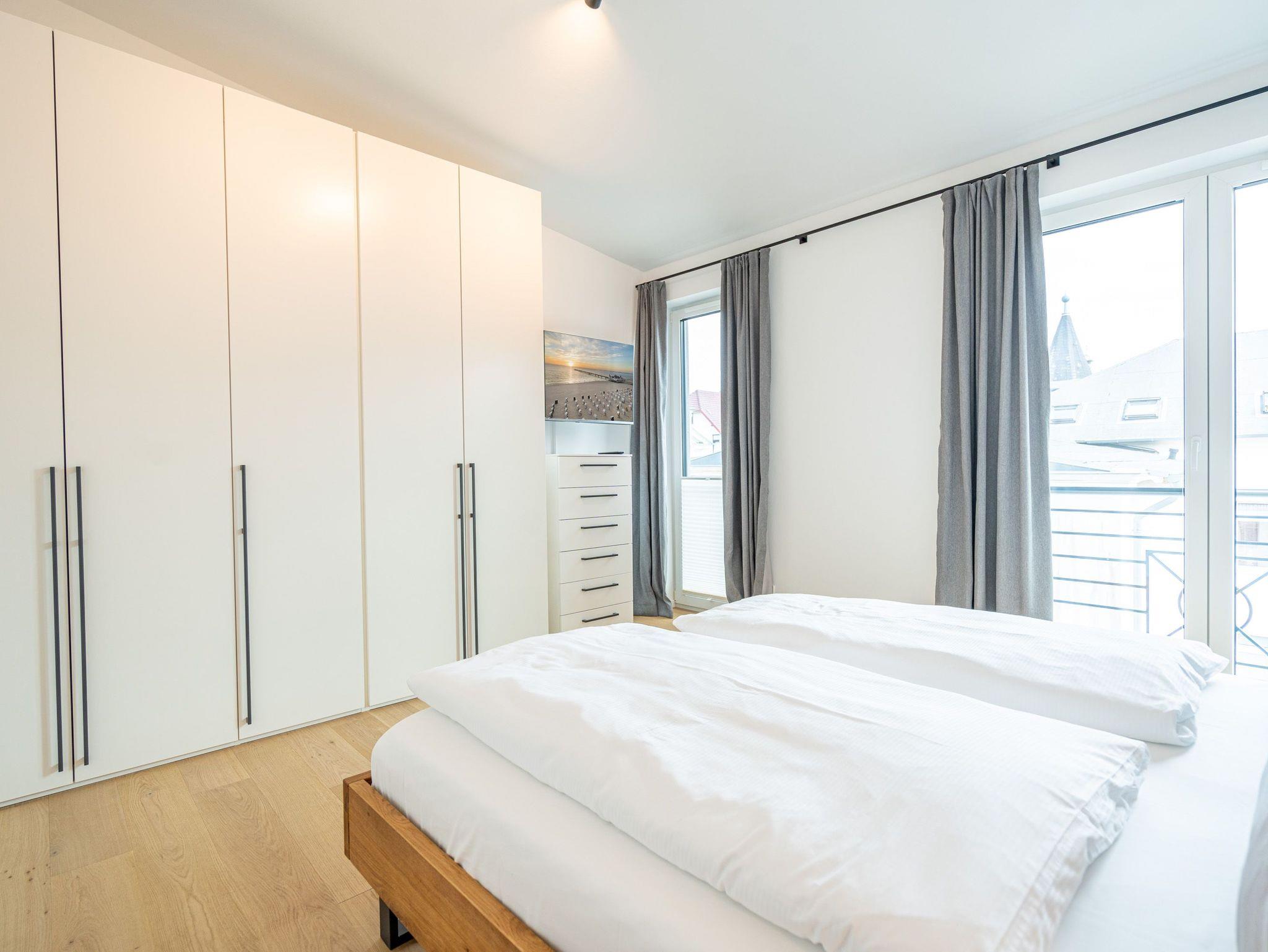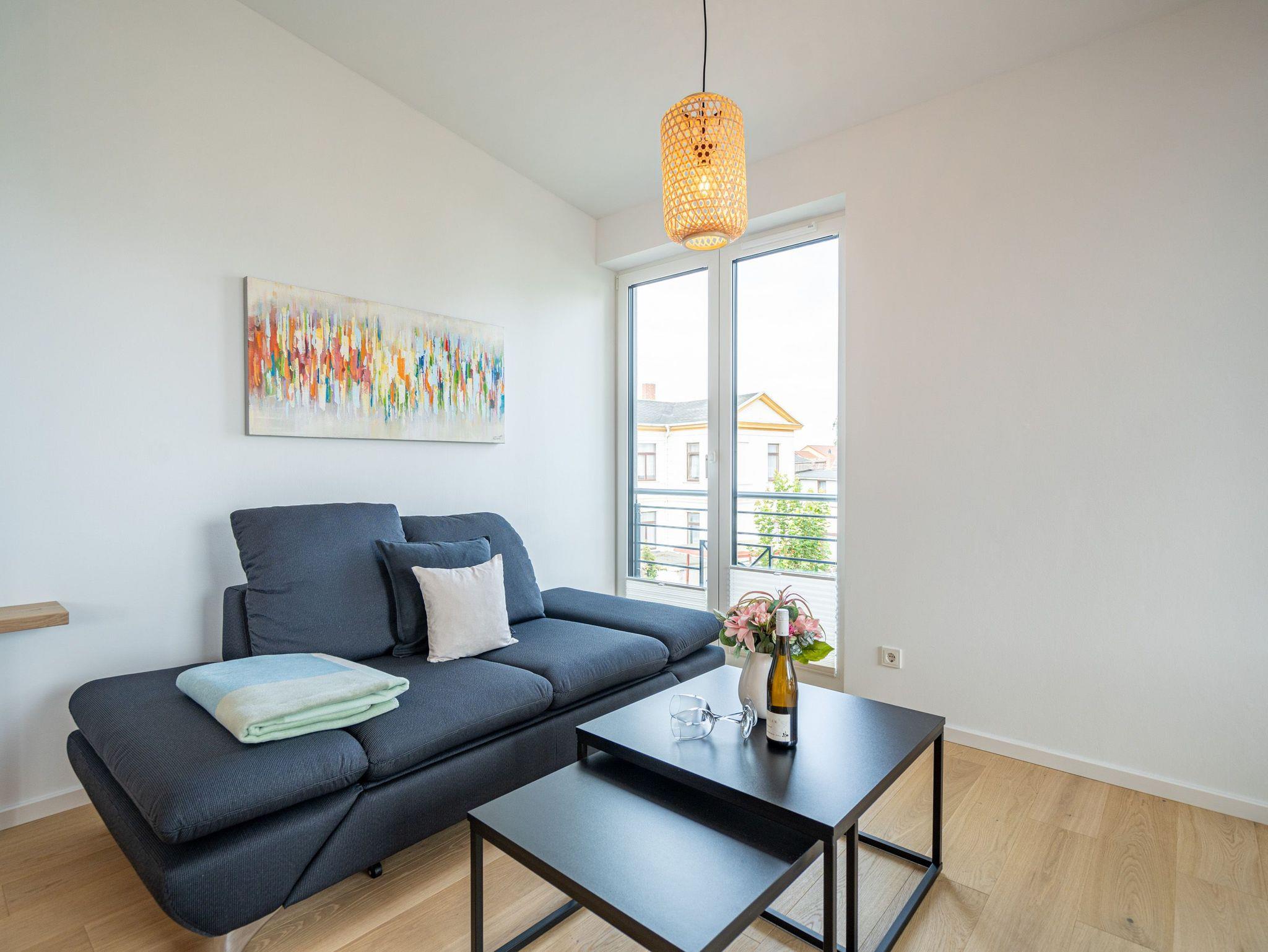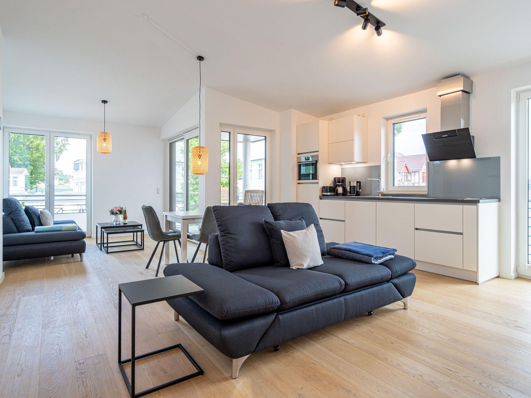 Herzlich willkommen im 2-Raum-Appartement Nr. 10 im Quartier 6, gelegen im 2. Obergeschoss. Dieses stilvolle Ferienapartment bietet Ihnen einen offenen, lichtdurchfluteten Wohnbereich, der mit einer voll ausgestatteten Küchenzeile inklusive Backofen mit Mikrowellenfunktion und Induktionskochfeld aufwartet. Hier können Sie Ihre Lieblingsgerichte zubereiten und diese am Essplatz genießen. Der Wohnbereich lädt mit einer komfortablen Sitzgruppe und einem 55 Zoll Smart-TV zu entspannten Abenden ein. Von hier aus gelangen Sie auf die Dachterrasse, die mit hochwertiger Teakholz-Bestuhlung ausgestattet ist und Ihnen einen herrlichen Blick Richtung Ostsee bietet. Im separaten Schlafzimmer erwartet Sie ein komfortables Doppelbett (1,80m x 2,00m) sowie ein geräumiger Kleiderschrank. Für zusätzliche Unterhaltung sorgt ein weiterer Smart-TV mit einer Bildschirmdiagonale von 43 Zoll. Der Wohn- und Schlafbereich ist mit edlem Echtholzfußboden ausgestattet, der für eine warme und einladende Atmosphäre sorgt. Das moderne Bad verfügt über eine ebenerdige Dusche, ein Waschbecken und ein WC, sodass Sie sich hier rundum wohlfühlen können. Selbstverständlich steht Ihnen während Ihres Aufenthalts kostenfreies WLAN zur Verfügung. Zu der Wohnung gehört ein eigener Stellplatz in der Tiefgarage sowie ein abschließbarer Fahrradkeller, der Ihnen zusätzlichen Komfort bietet. Diese Ferienwohnung ist der ideale Ort, um die Ostsee in vollen Zügen zu genießen und die Seele baumeln zu lassen.