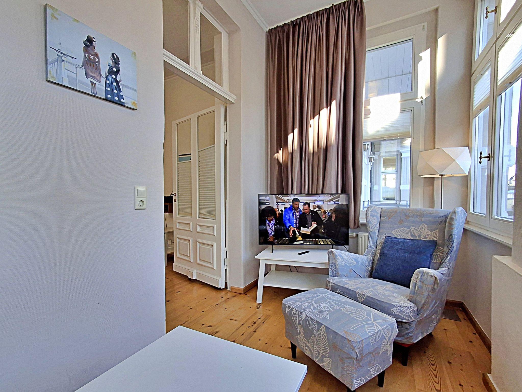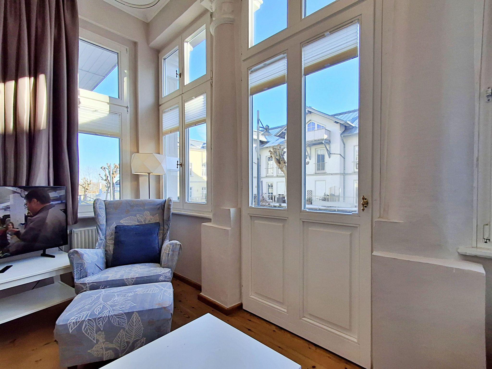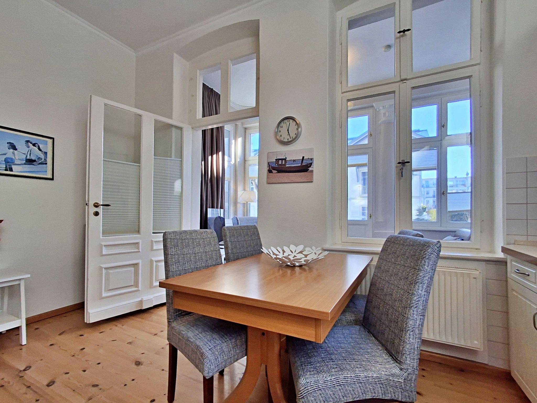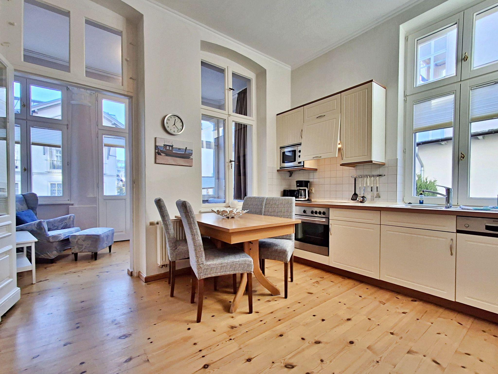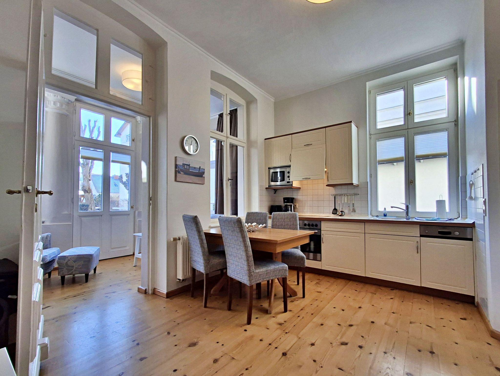 Die helle und freundliche 2,5 Zimmer-Wohnung Rerik mit Terrasse für max. 3 Erwachsene und 1 Kleinkind bis 3 Jahre befindet sich in der stilvoll restaurierten Villa Ahlbeck - nur wenige Schritte von der Promenade und dem Strand entfernt. Die moderne Küchenzeile mit Ceranherd, Backofen, Geschirrspüler, Mikrowelle, Kaffeemaschine, Wasserkocher und Toaster lässt keine Wünsche offen. Bei schlechtem Wetter bietet der Esstisch mit 4 Stühlen genügend Platz für das Frühstück. Die absoluten Highlights der Wohnung sind die Veranda mit Couch (Aufbettungsmöglichkeit für 2 Personen) sowie die angrenzende Terrasse mit Süd-Ost-Ausrichtung. Auf der Terrasse können Sie bei herrlichstem Wetter schon morgens Ihren Kaffee genießen oder den Abend bei einem Glas Wein ausklingen lassen. Für die Unterhaltung sorgen ein Flachbild-TV, Radio-CD-Player und kostenfreies W-LAN. Das Schlafzimmer verfügt über ein Doppelbett und das Badezimmer hat DU/WC.