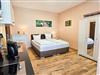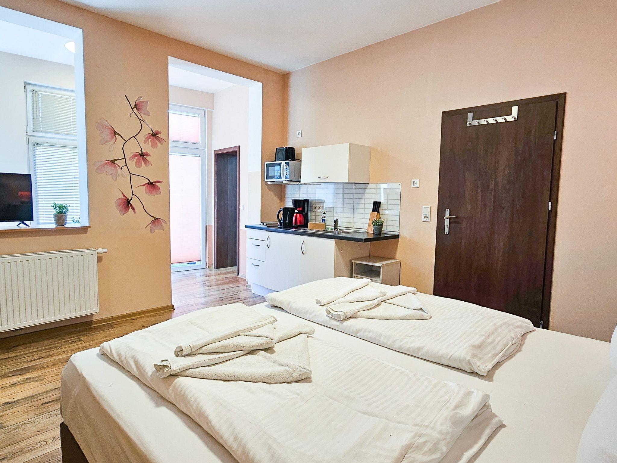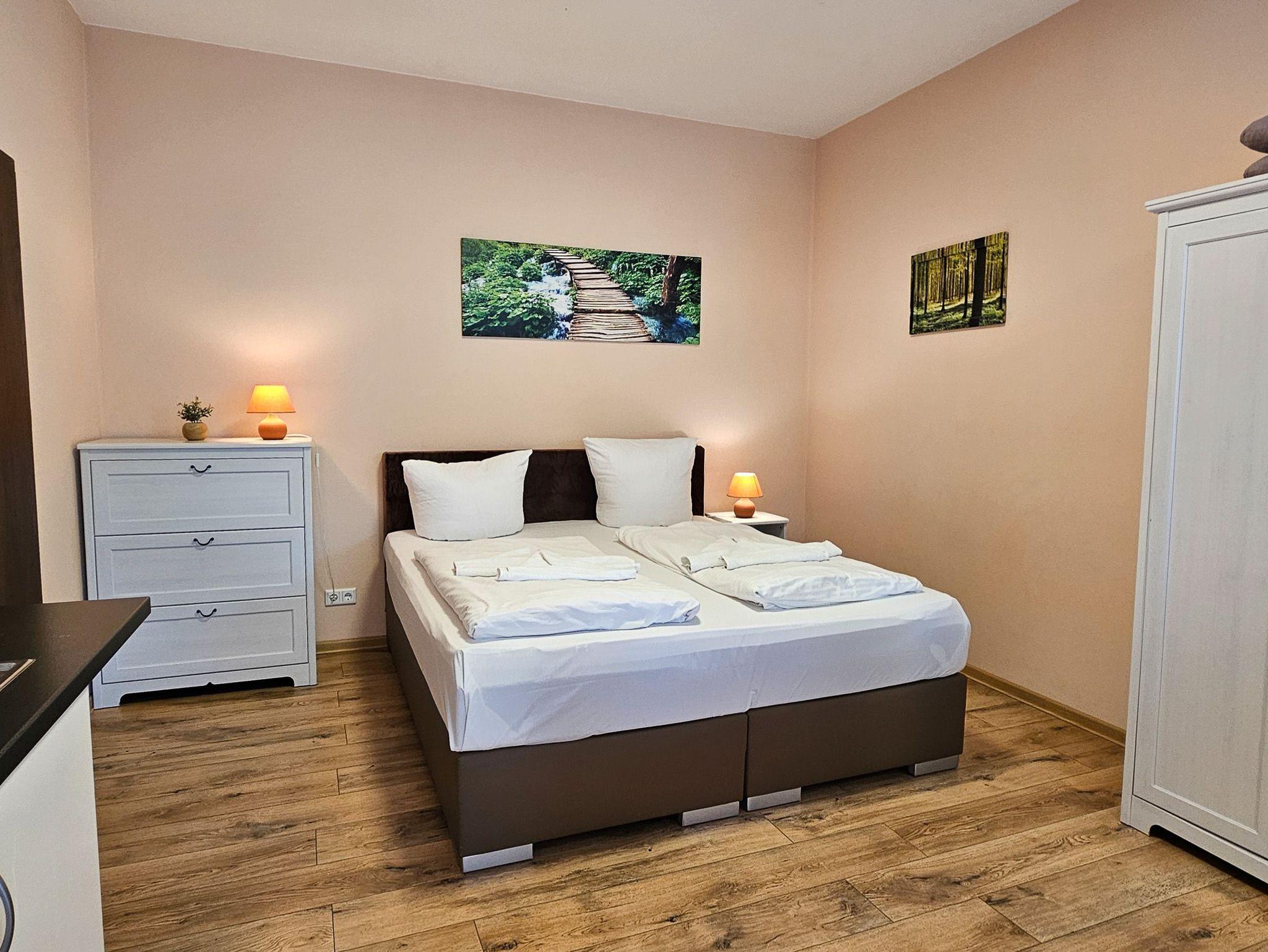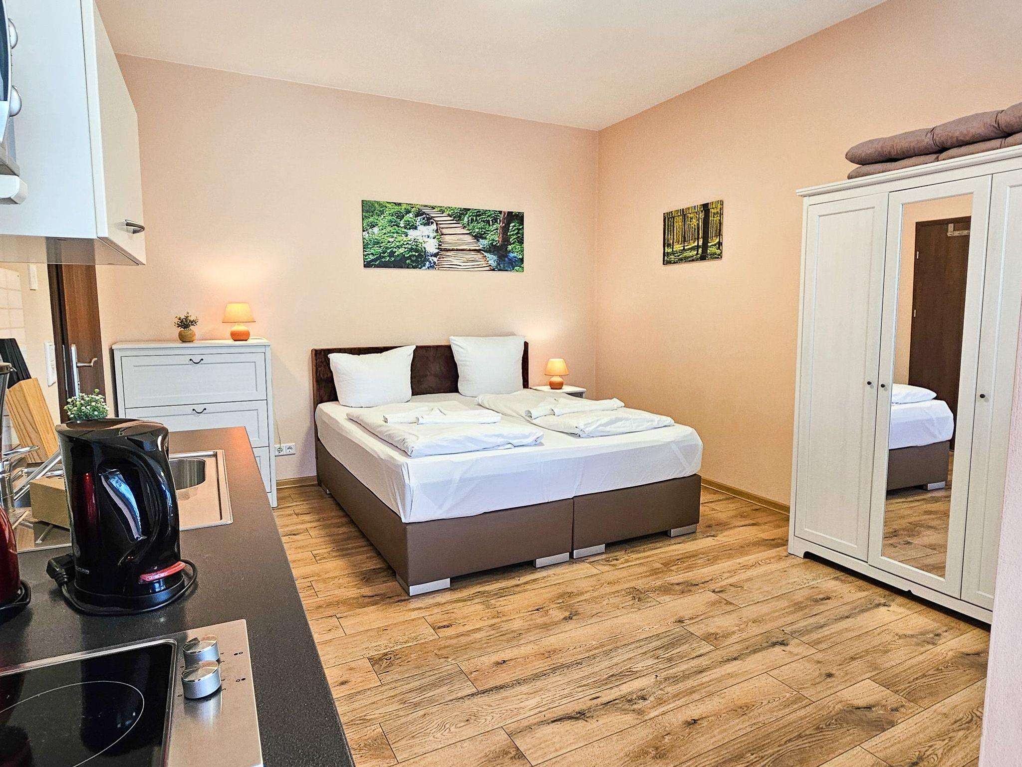 Das gemütlich eingerichtete Appartement, verfügt über einen Wohn-/ Schlafbereich mit einem Doppelbett und eine separierte Sitzgelegenheit mit einer kleinen Pantry-Küche. Von hier aus gelangen Sie auf die große süd-westlich ausgerichtete Terrasse.