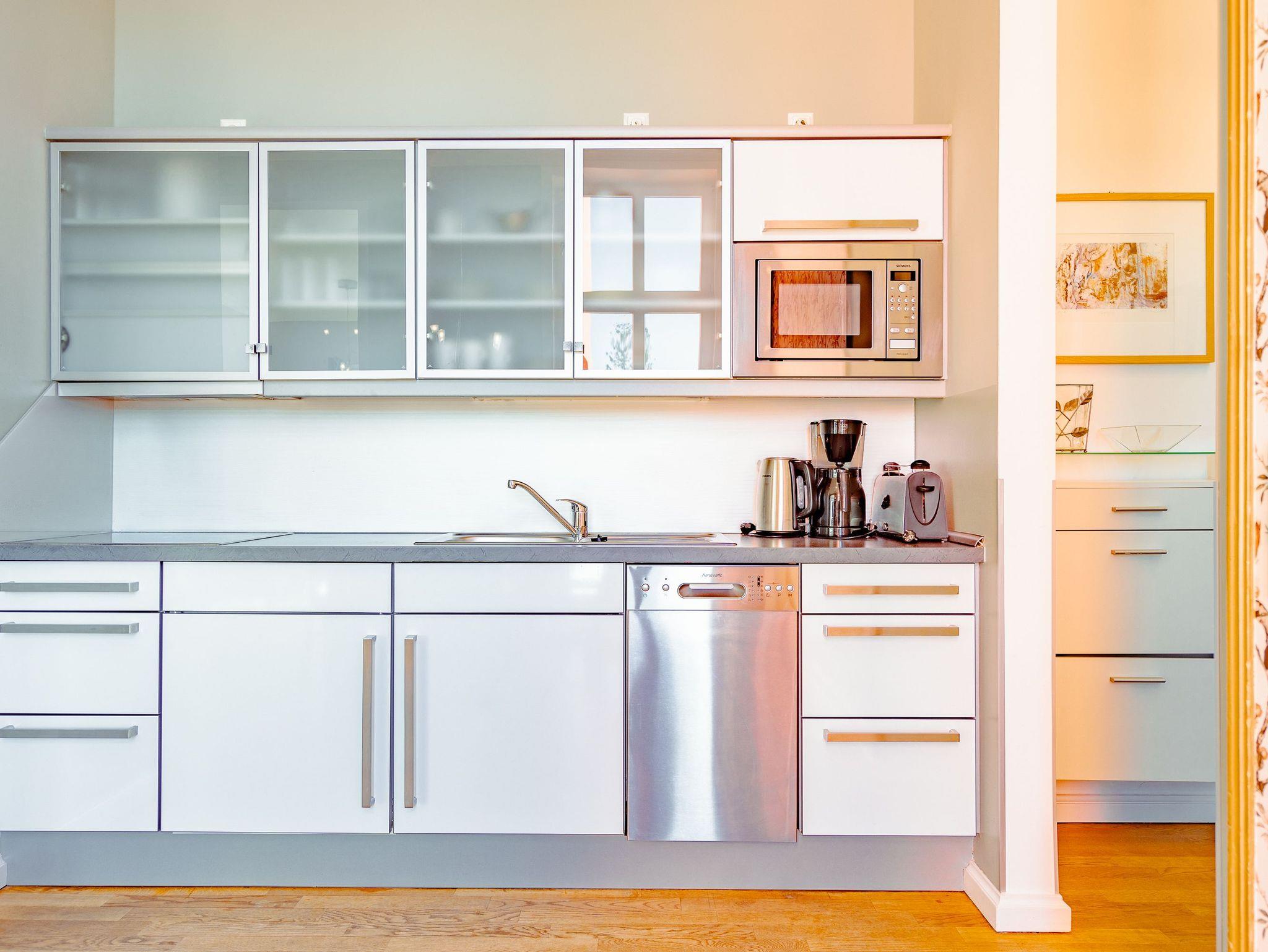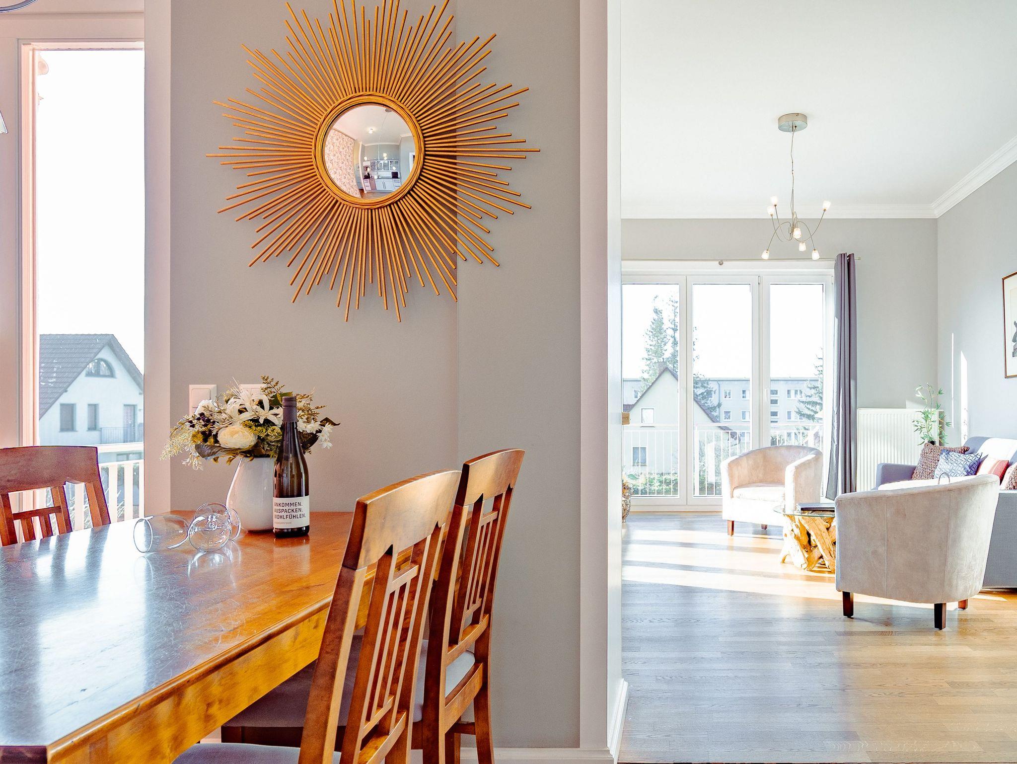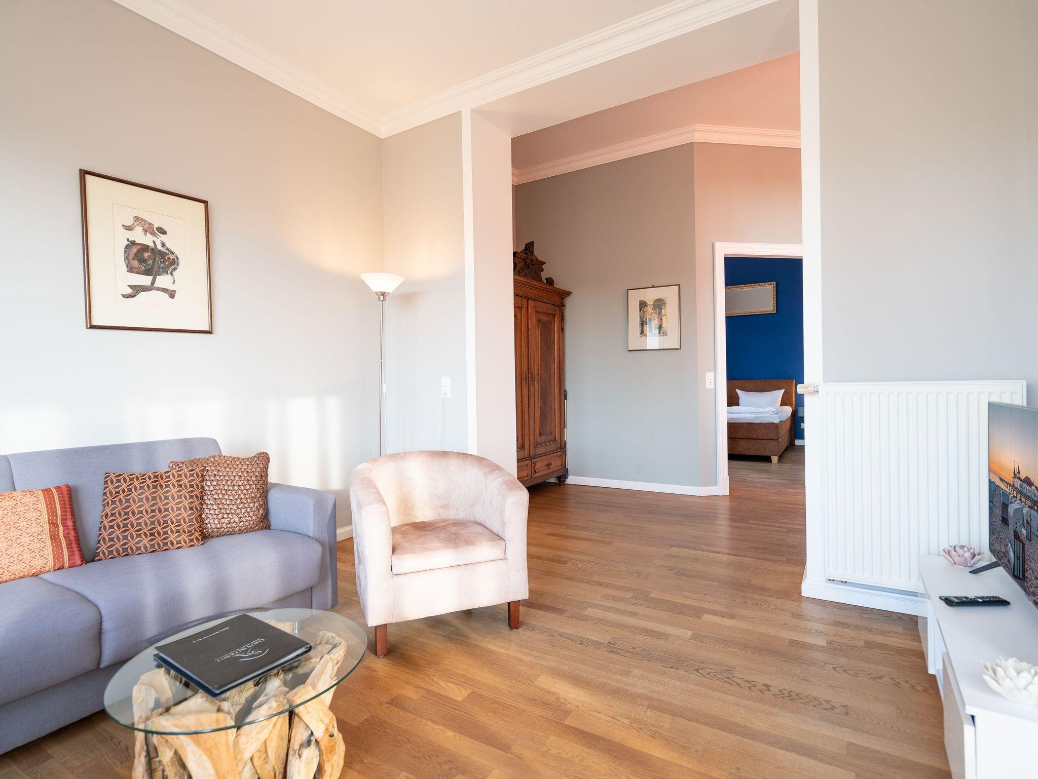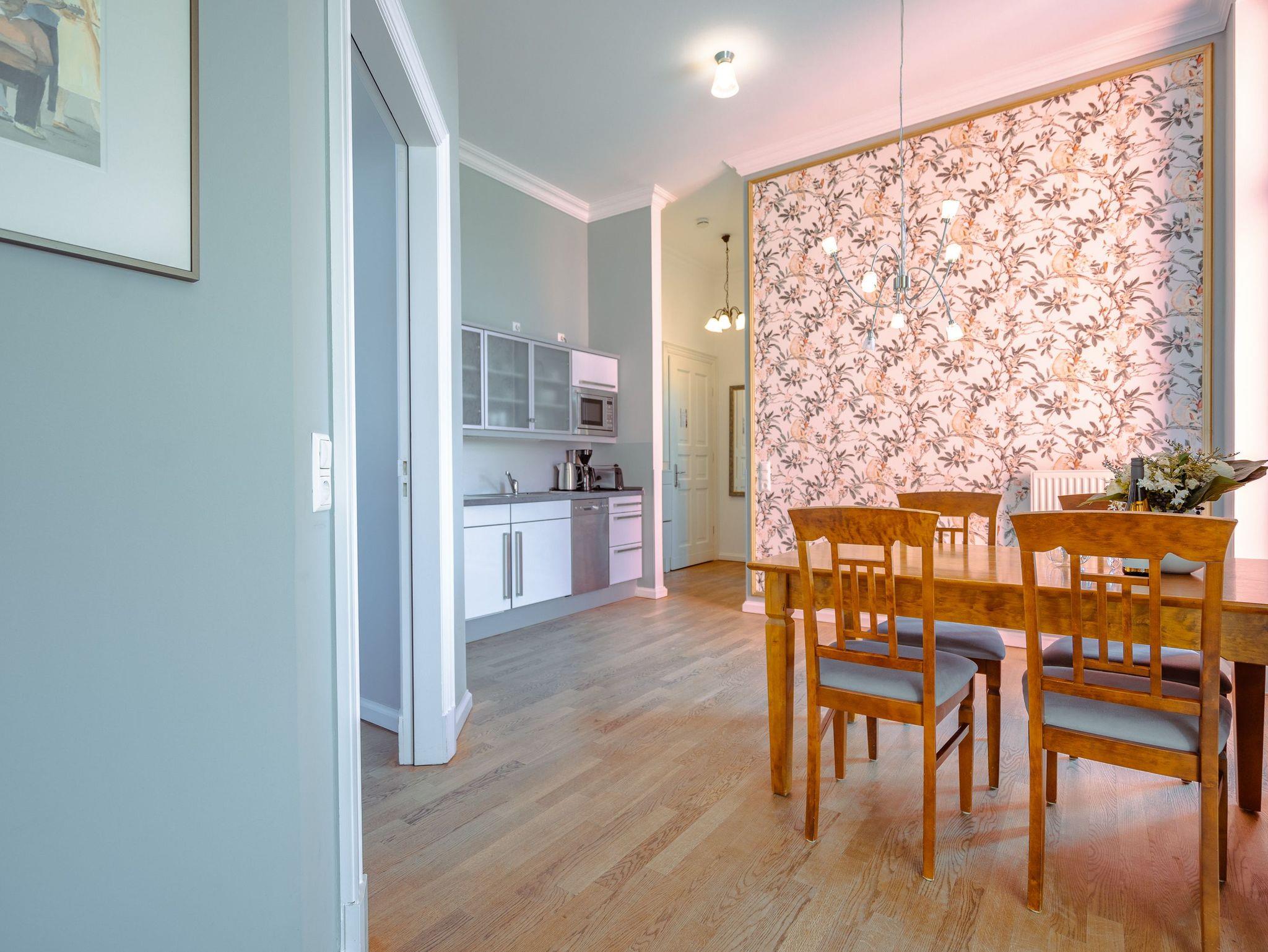 Ihr Appartement im 1.Obergeschoss der Villa begrüßt Sie mit hellen Farben, gekonnt kombinierten antiken und modernen Möbeln und ausgewählten Kunstwerken. Lichtdurchflutete hohe Räume und ein aufwendig sanierter Parkettboden lassen keine Wünsche offen. Die offene Wohnküche, das Wohnzimmer mit Schlafcouch (1,60 m) und das Schlafzimmer mit Doppelbett bieten Platz für 2 bis 3 Personen [&] 1 Kleinkind (im Kinderreisebett). Auf dem großzügigen, vom Wohnzimmer erreichbaren, Balkon genießen Sie den ganzen Tag die Usedomer Sonne. Für Ihren Komfort sind die Betten bei der Anreise bezogen und Handtücher liegen bereit. Für kleine Gäste kann ein Kinderreisebett und ein Kinderhochstuhl gegen einen Aufpreis dazu bestellt werden. Ein Pkw-Stellplatz steht am Haus unter dem Carport zur Verfügung.