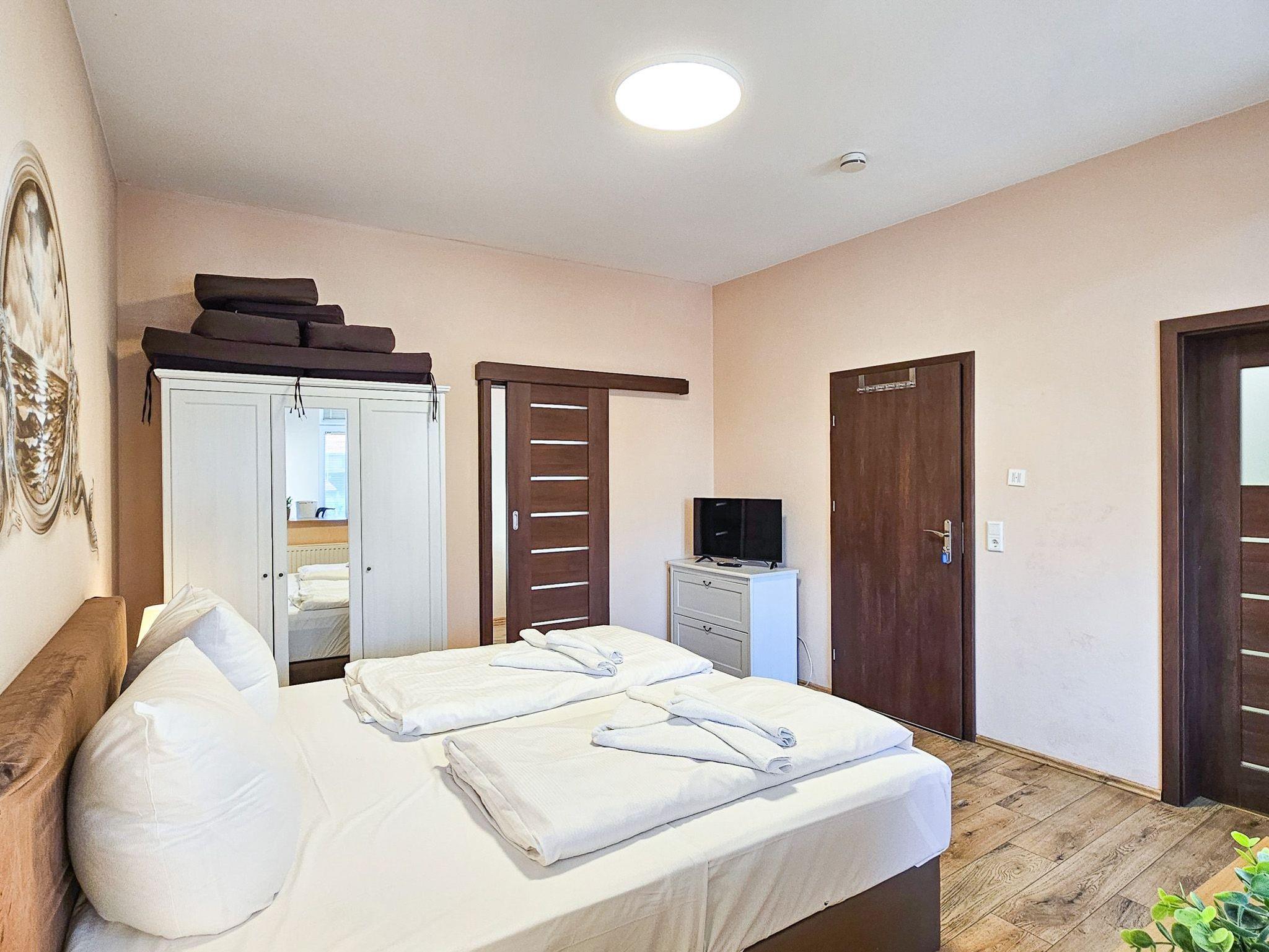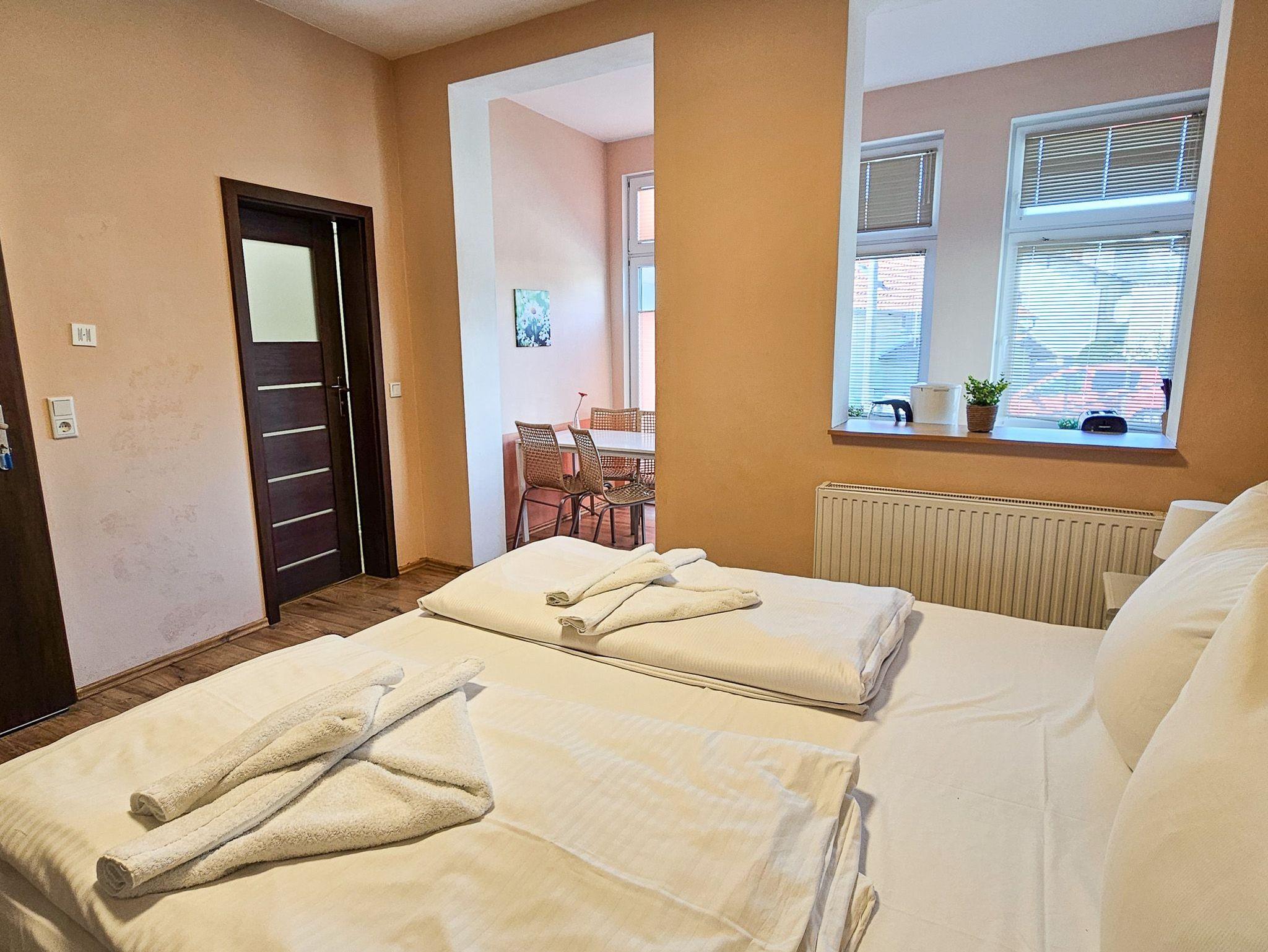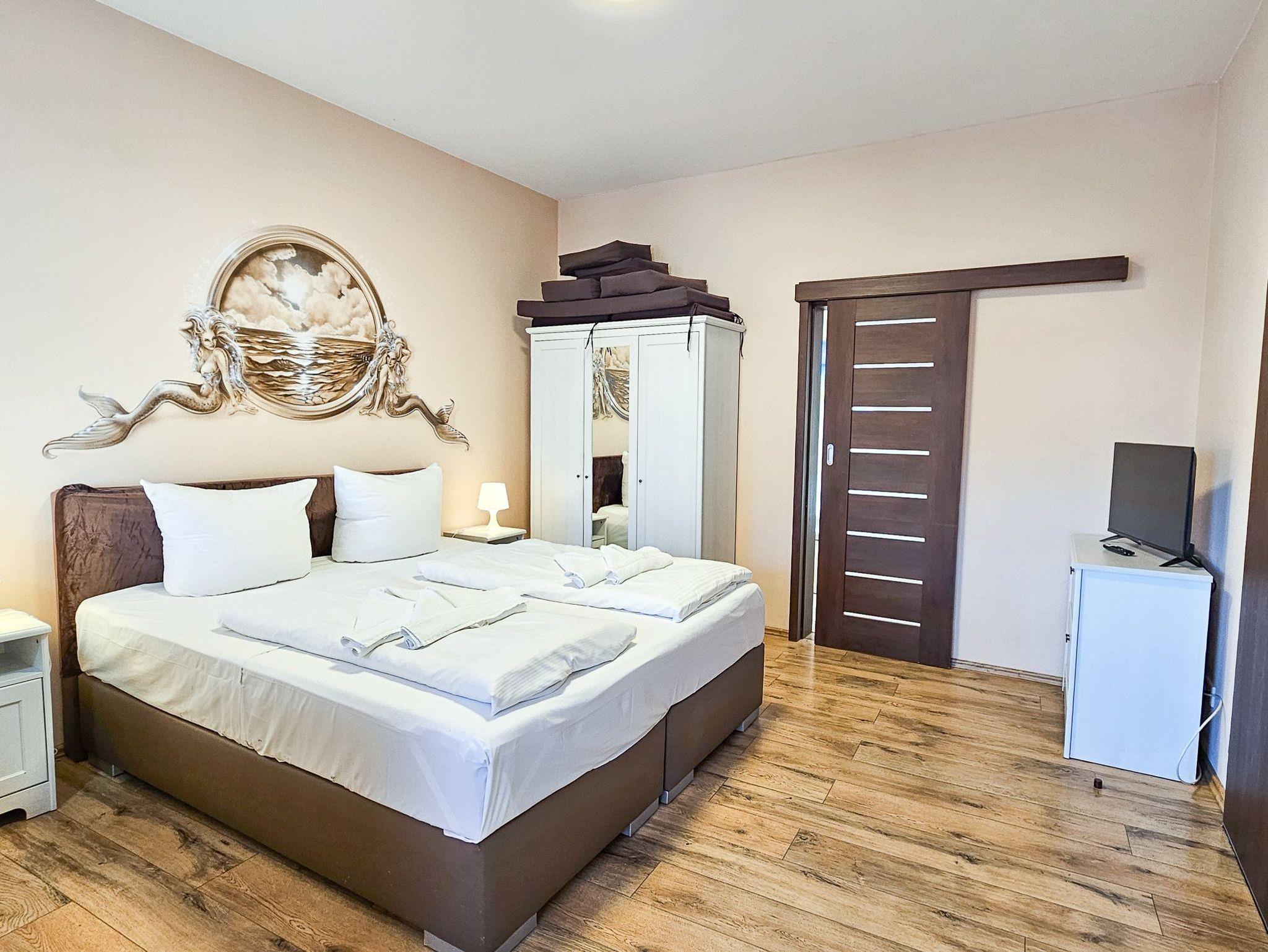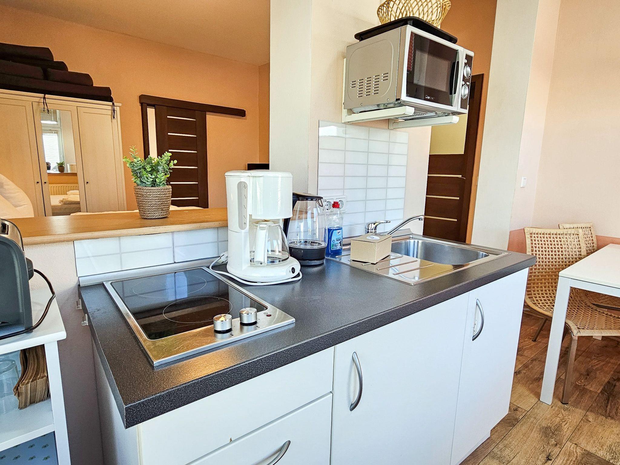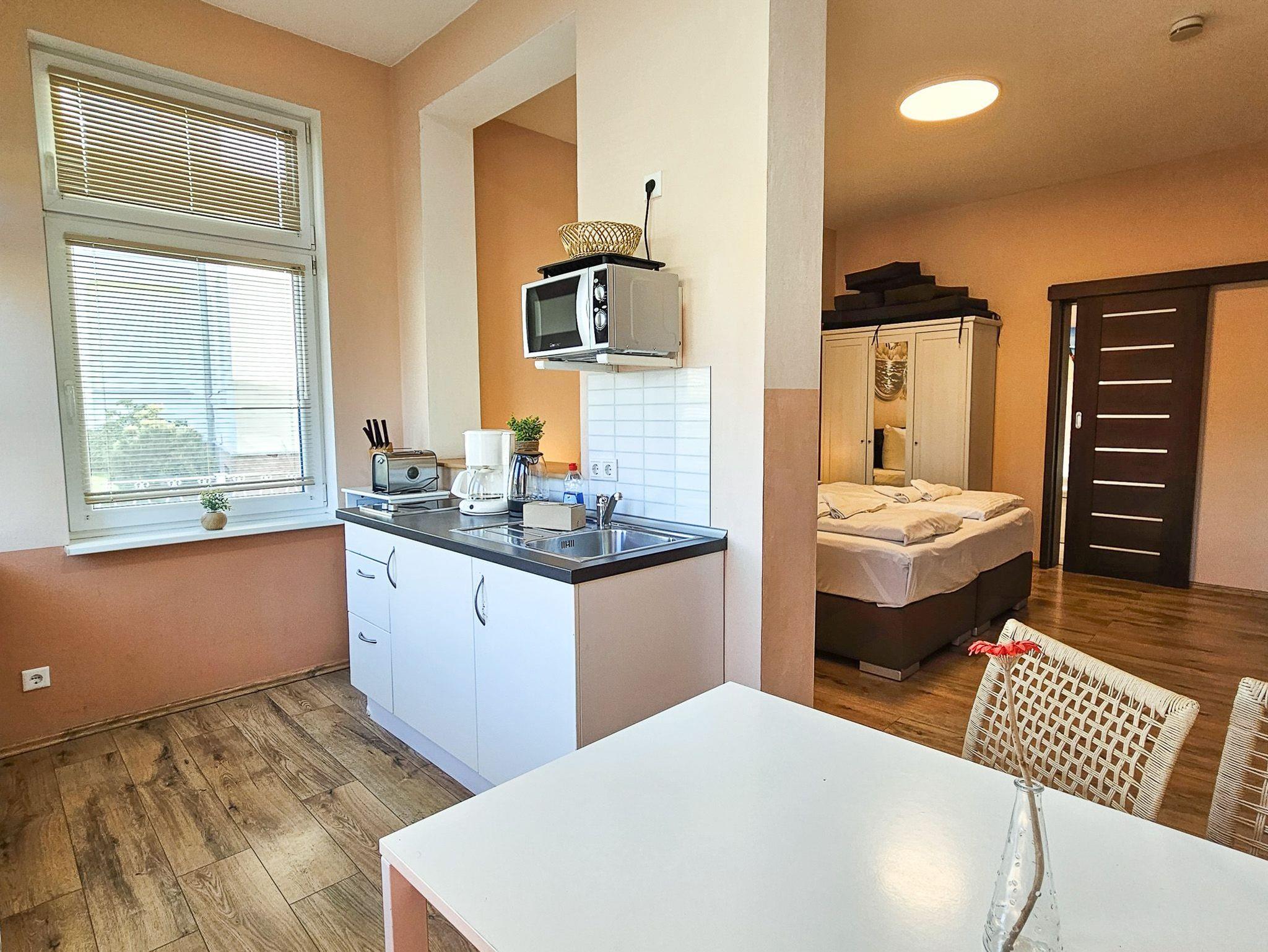 Das gemütlich eingerichtete Appartement verfügt über einen Wohn-/ Schlafbereich mit einem Doppelbett und einer separierten Sitzgelegenheit mit einer kleinen Pantry-Küche. Von hier aus gelangen Sie auf die große süd-westlich ausgerichtete Terrasse.