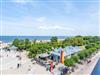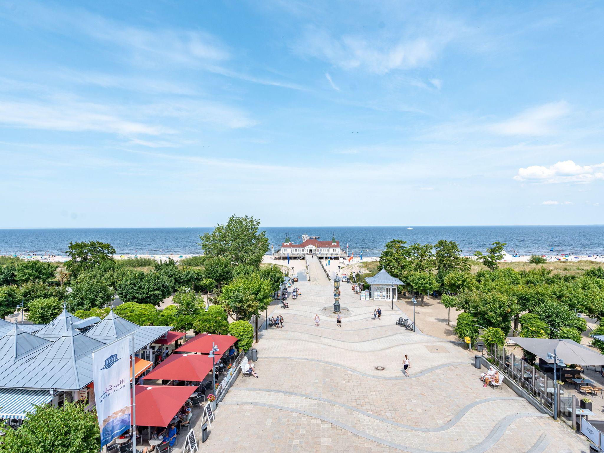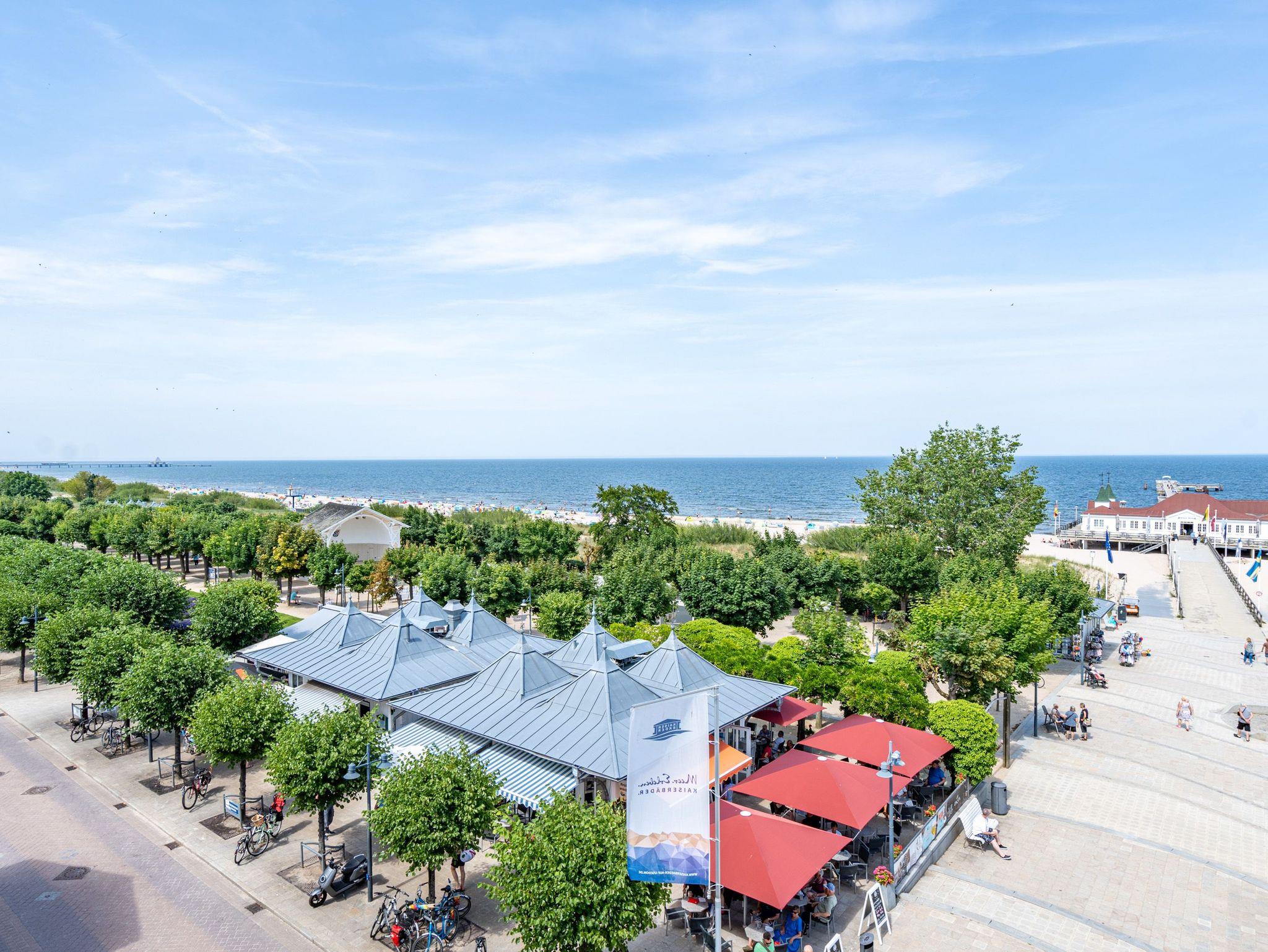 Die 2024 fertig gestellte Strandterrasse liegt direkt an der belebten Strandpromenade und bietet einen einzigartigen Ausblick auf die Grand Dame der historischen Seebrücken sowie die historische Konzertmuschel, einem beliebten Treffpunkt für Kunst und Kultur. Dahinter liegt die Ostsee ? ein Panorama, das zu den schönsten in den Kaiserbädern gehört. Es ist wie das Abtauchen in eine andere Zeit. In eine Zeit, in der man mit Stock, Sonnenschirm und Hut fürs „Sehen und gesehen werden“ über die Promenade schlenderte; aber auch in eine Zeit, in der ? damals wie heute ? Zeit einmal für eine kurze Weile keine Rolle spielt. Weil man angekommen ist im Loslassen, Entspannen und Genießen. Es ist dieser besondere Geruch nach Meeresluft und Freiheit, der in Erinnerung bleibt. Dazu die Bilder, die man mitnimmt. Von langen Strandspaziergängen, vom Lachen in fröhlich schäumenden Ostseewellen, von der Zeit in einem wunderschönen Urlaubsdomizil. Denn genau das ist die Strandterrasse mit ihren 56 modernen und exklusiven Ferienappartements direkt gegenüber der Ahlbecker Seebrücke. Die Ein-, Zwei- oder Dreizimmerwohnungen ? zwischen 40 und 70 Quadratmeter groß ? sind von einer Innenarchitektin gemeinsam mit unserem Erfahrungsschatz an Gästewünschen mit viel Liebe zum Detail und ganz individuell konzipiert worden. Entspannung und Wohlfühlen stehen an erster Stelle. Alles ist aufeinander abgestimmt und sorgt für eine gemütliche Atmosphäre. Wählen Sie zwischen einem Domizil in einem hellen, sandfarbenen Designkonzept oder einem Appartement mit anthrazitfarbenen Farbakzenten. Alle Appartements verfügen gleichermaßen über eine stilvolle und komfortable Einrichtung, die passgenau angefertigt worden ist, sowie über moderne Küchen und Bäder. Jedem Schlafzimmer ist ein eigenes Bad mit Dusche zugeordnet (außer App. B4.5). Die Appartements besitzen fast alle einen Balkon ? viele schauen sogar zur Ostsee hinaus. Die meisten Feriendomizile haben einen Elektrokamin und Infrarotsaunen. Im Erdgeschoss befindet sich ein separater Gemeinschaftsraum für Fahrräder. Außerdem besteht die Möglichkeit, im Gemeinschaftswaschraum 2 Waschmaschinen [&] Trockner zu nutzen. Ergänzt wird das Angebot durch eine Gemeinschaftssauna, die täglich von 11:00 bis 22:00 Uhr nutzbar ist. In der Tiefgarage (Einfahrtshöhe 2,03 Meter) steht für jede Wohnung 1 Pkw-Stellplatz zur Verfügung. Ist alles zur Zufriedenheit untergebracht? Dann kann der Urlaub ja beginnen. Und beim Blick vom Balkon über die Ostsee treffen sich zum Sonnenaufgang das Heute und das Damals. Gelassenheit legt sich beim Gang hinunter an den Strand auf die Seele. Jetzt darf die Zeit stehenbleiben.