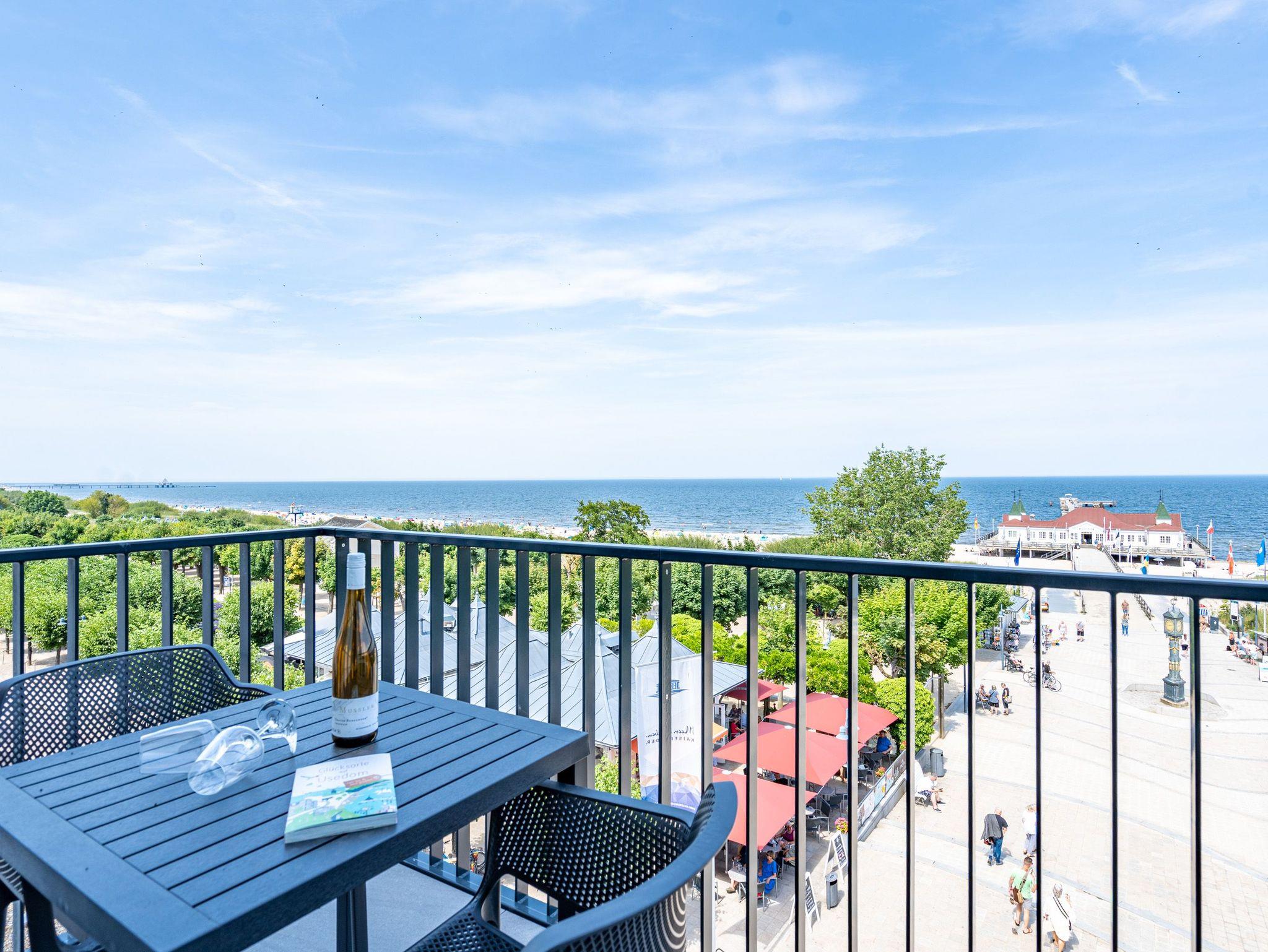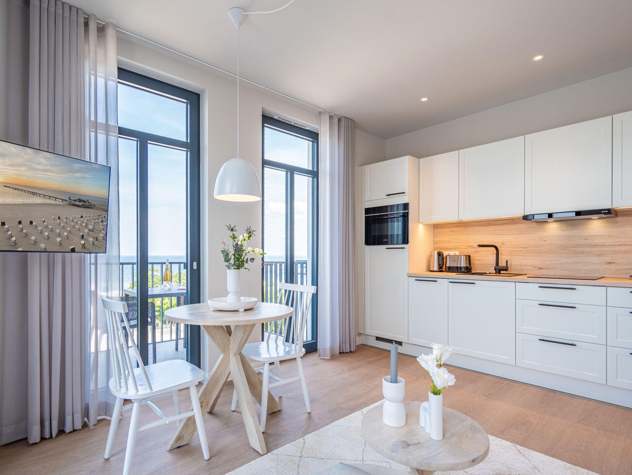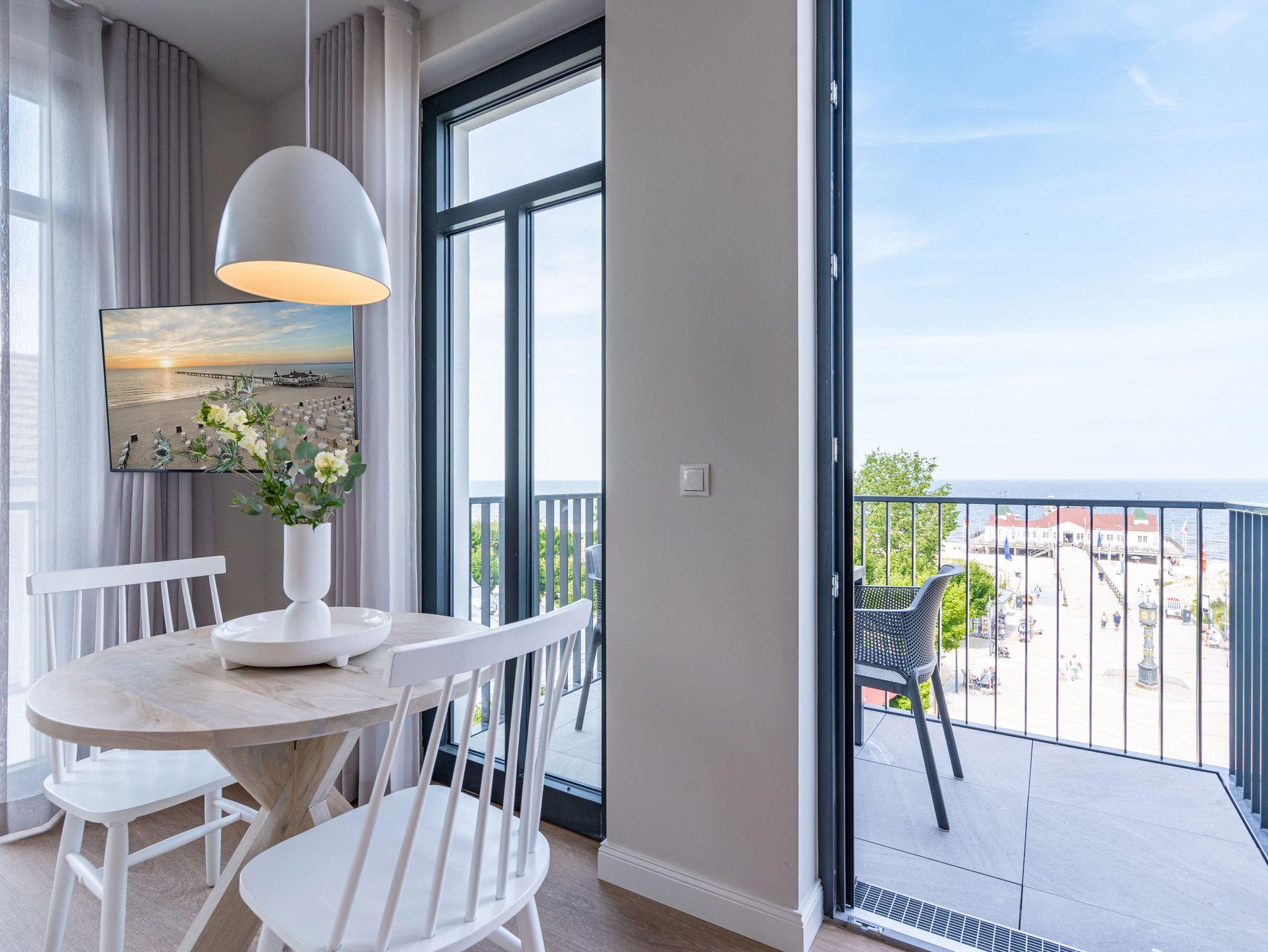 Ob beim Essen, beim Entspannen auf der Couch oder gleich nach dem Aufstehen aus dem lichtdurchfluteten Appartement A 3.3 im Haus A der Strandterrasse haben Sie die Ostsee immer im Blick. Hier können Sie von gleich zwei Balkonen und aus den bodentiefen Fenstern die blaue Weite jederzeit genießen. Das 45 Quadratmeter große Urlaubsparadies für zwei Personen befindet sich im 3. Obergeschoss direkt gegenüber der Ahlbecker Seebrücke. Der Wohnbereich zur Seeseite lädt zum Verweilen ein und bietet einen atemberaubenden Ausblick. Das Designkonzept der Einrichtung ist darauf abgestimmt, dass Sie sich rundum wohlfühlen. Helle Möbel und warme Farben versetzen Sie in eine entspannte Stimmung. Ein schöner Essplatz bietet nicht nur Platz für gemeinsame Mahlzeiten, sondern lässt den Blick auch immer wieder über die Ostsee und die Promenade schweifen. Ein bequemes Sofa verführt zum Kuscheln und zum Kinoerlebnis auf dem 43-Zoll-Flachbildfernseher. In das geräumige Wohnzimmer ist eine offene Küchenzeile integriert, die mit hochwertigen Elektrogeräten wie einem Backofen, einem 3-Platten-Induktionskochfeld und einer Nespresso-Kapselmaschine ausgestattet ist. Vom Wohnzimmer aus haben Sie Zugang zum Nord-Balkon mit einem Tisch und zwei Stühlen. Hier sind Sie dem Rauschen der Wellen noch ein Stück näher. Das Schlafzimmer verfügt über ein luxuriöses Boxspringdoppelbett (1,80m x 2,00m), einen extra angefertigten Kleiderschrank mit viel Stauraum und einen weiteren 43-Zoll-Flachbildfernseher für Ihre Unterhaltung. Von hier aus können Sie auf den zweiten Balkon in Nord-West-Richtung hinaustreten. Inhalieren Sie die gesunde Meeresbrise tief ein und genießen Sie entspannte Mußestunden auf der Sonnenliege. Im innenliegenden Bad ist mit Dusche, Waschtisch und Toilette alles vorhanden, was Sie zum Frischmachen brauchen. Ein reservierter PKW-Stellplatz in der Tiefgarage sorgt dafür, dass Ihr Fahrzeug sicher untergebracht ist. Dann kann es ja losgehen mit den wundervollen und erlebnisreichen Tagen am Meer.