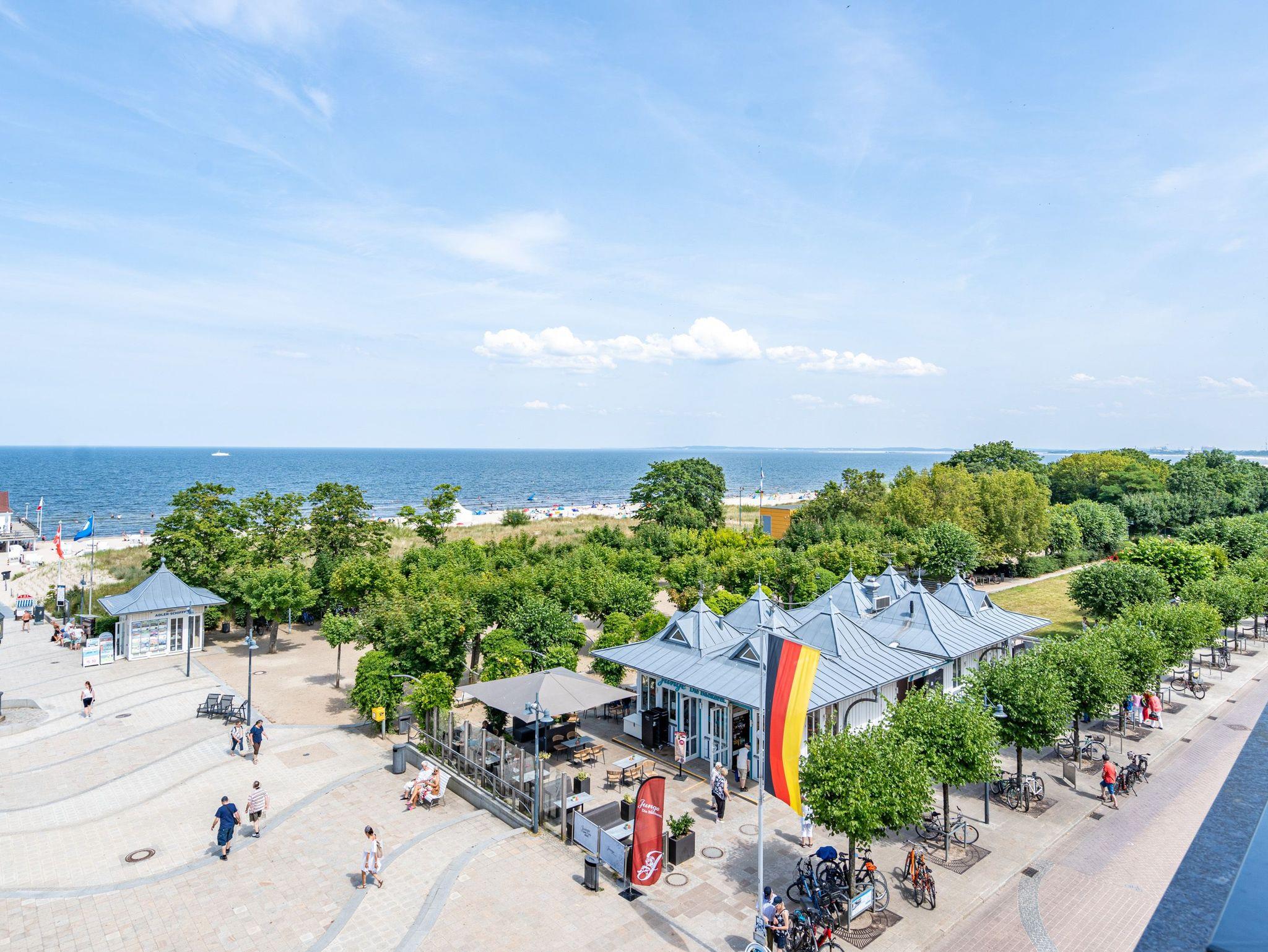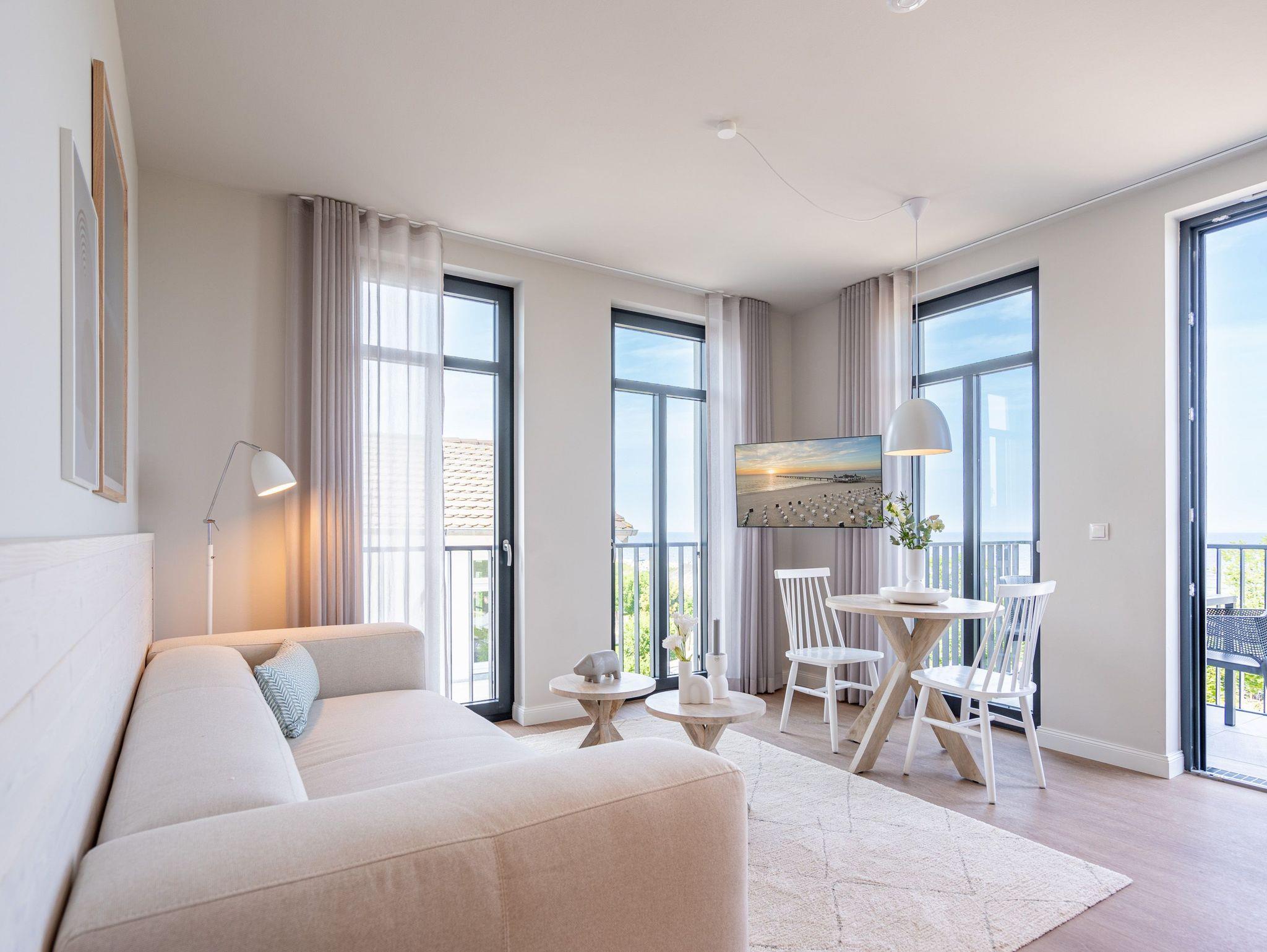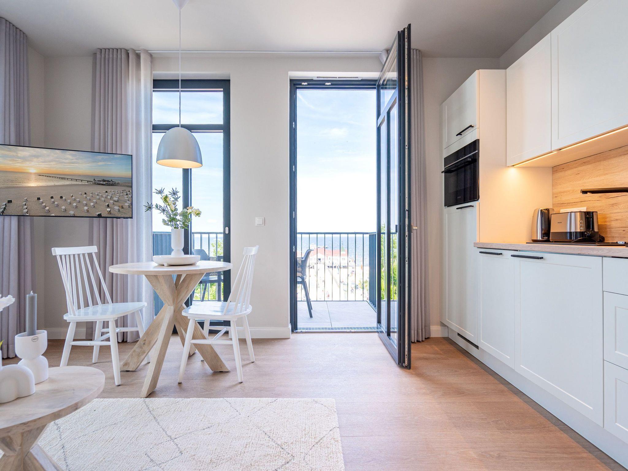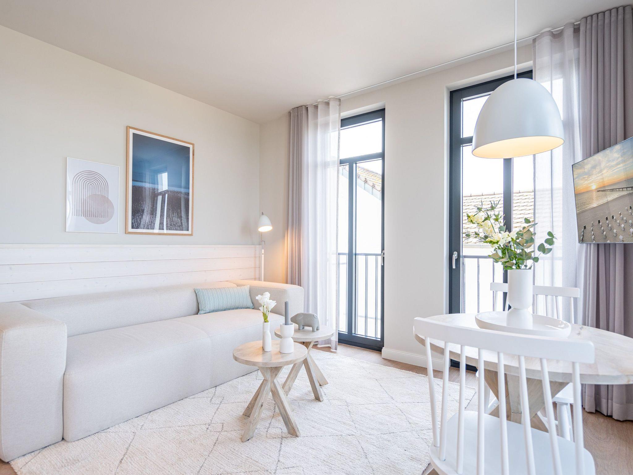 Ob beim Essen, beim Entspannen auf der Couch oder gleich nach dem Aufstehen aus dem lichtdurchfluteten Appartement A 3.3 im Haus A der Strandterrasse haben Sie die Ostsee immer im Blick. Hier können Sie von gleich zwei Balkonen und aus den bodentiefen Fenstern die blaue Weite jederzeit genießen. Das 45 Quadratmeter große Urlaubsparadies für zwei Personen befindet sich im 3. Obergeschoss direkt gegenüber der Ahlbecker Seebrücke. Der Wohnbereich zur Seeseite lädt zum Verweilen ein und bietet einen atemberaubenden Ausblick. Das Designkonzept der Einrichtung ist darauf abgestimmt, dass Sie sich rundum wohlfühlen. Helle Möbel und warme Farben versetzen Sie in eine entspannte Stimmung. Ein schöner Essplatz bietet nicht nur Platz für gemeinsame Mahlzeiten, sondern lässt den Blick auch immer wieder über die Ostsee und die Promenade schweifen. Ein bequemes Sofa verführt zum Kuscheln und zum Kinoerlebnis auf dem 43-Zoll-Flachbildfernseher. In das geräumige Wohnzimmer ist eine offene Küchenzeile integriert, die mit hochwertigen Elektrogeräten wie einem Backofen, einem 3-Platten-Induktionskochfeld und einer Nespresso-Kapselmaschine ausgestattet ist. Vom Wohnzimmer aus haben Sie Zugang zum Nord-Balkon mit einem Tisch und zwei Stühlen. Hier sind Sie dem Rauschen der Wellen noch ein Stück näher. Das Schlafzimmer verfügt über ein luxuriöses Boxspringdoppelbett (1,80m x 2,00m), einen extra angefertigten Kleiderschrank mit viel Stauraum und einen weiteren 43-Zoll-Flachbildfernseher für Ihre Unterhaltung. Von hier aus können Sie auf den zweiten Balkon in Nord-West-Richtung hinaustreten. Inhalieren Sie die gesunde Meeresbrise tief ein und genießen Sie entspannte Mußestunden auf der Sonnenliege. Im innenliegenden Bad ist mit Dusche, Waschtisch und Toilette alles vorhanden, was Sie zum Frischmachen brauchen. Ein reservierter PKW-Stellplatz in der Tiefgarage sorgt dafür, dass Ihr Fahrzeug sicher untergebracht ist. Dann kann es ja losgehen mit den wundervollen und erlebnisreichen Tagen am Meer.