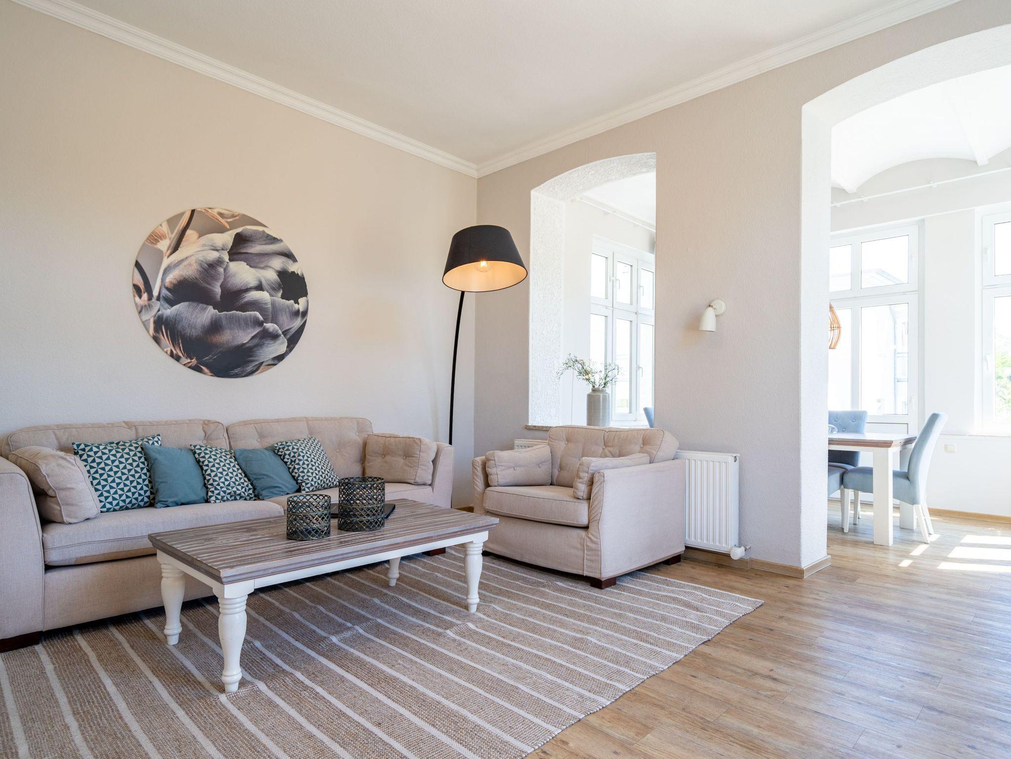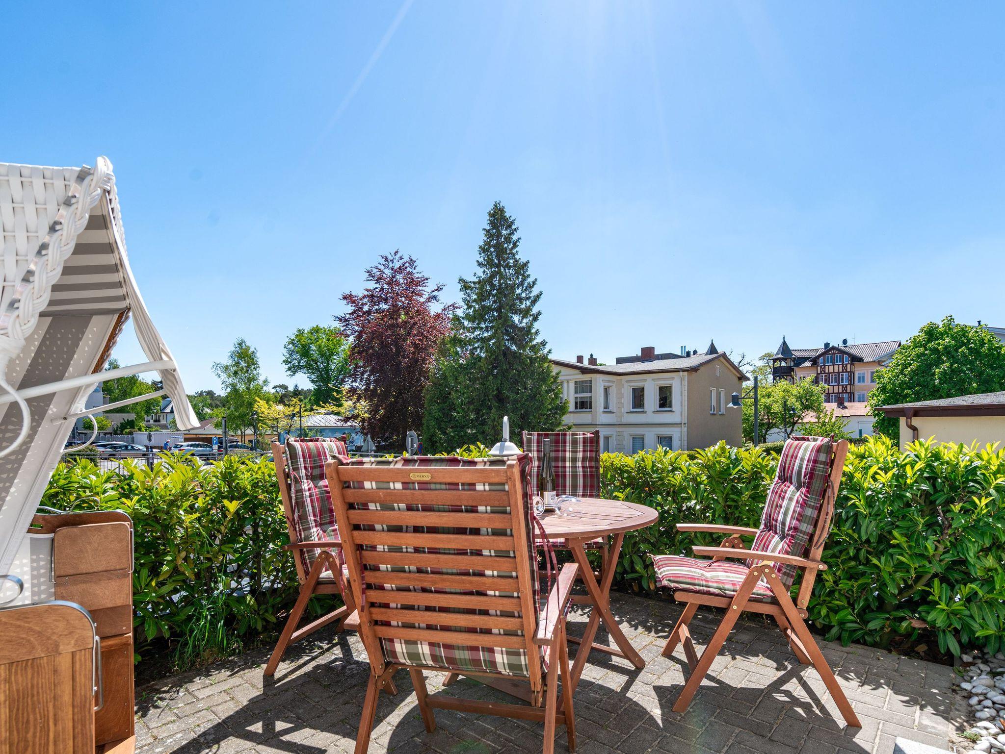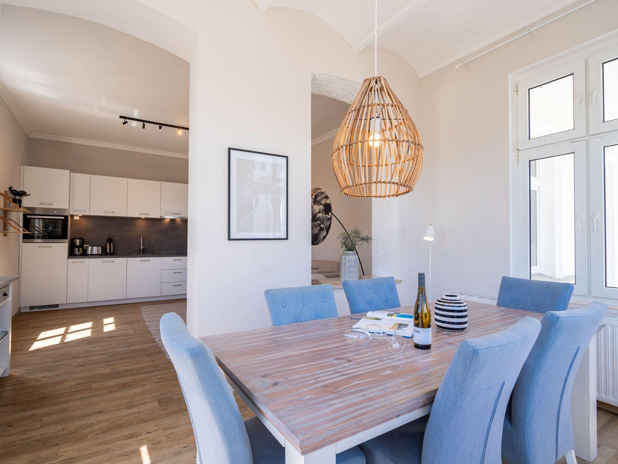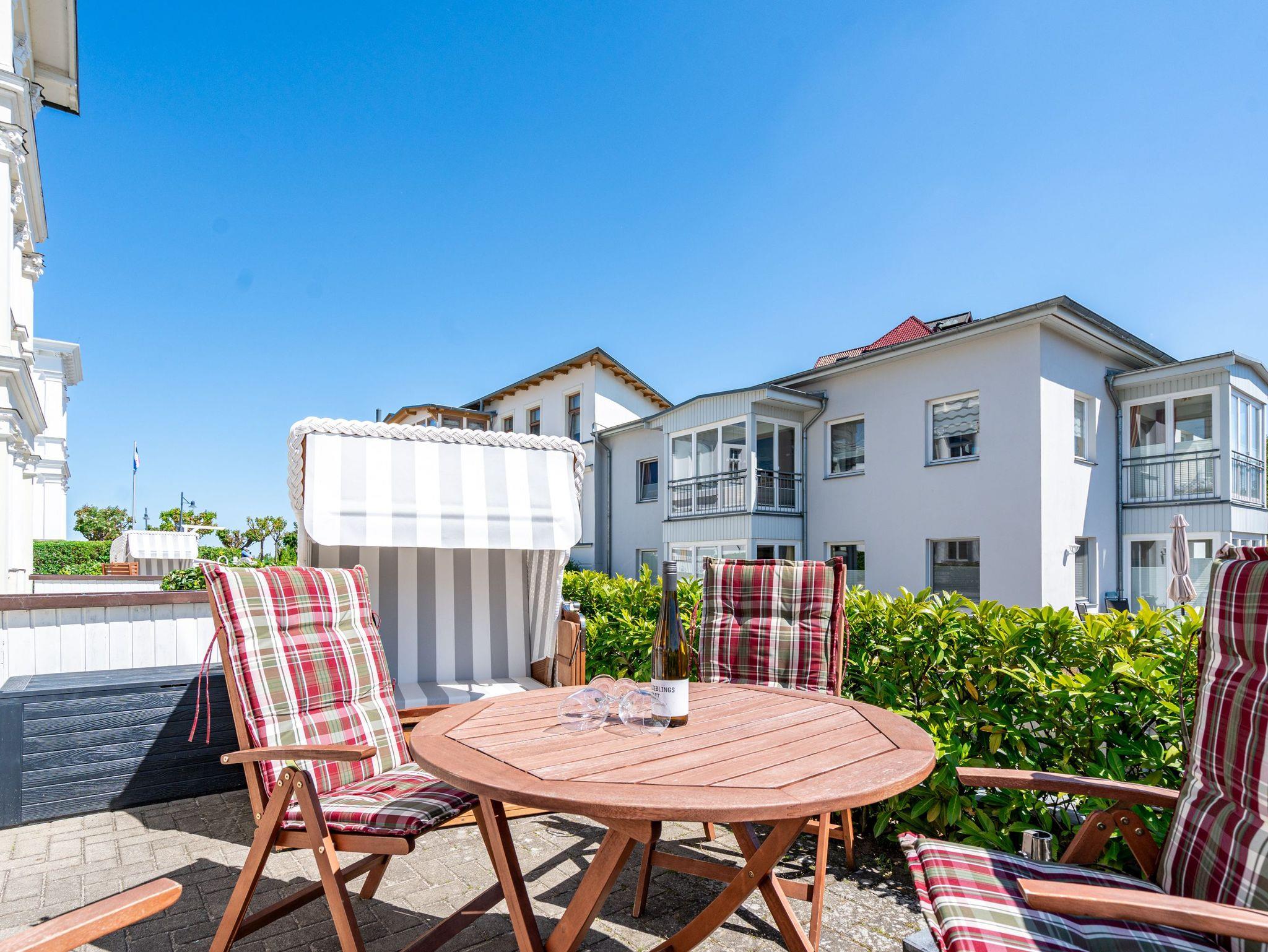 Von der schönen großen Terrasse aus können Sie an schönen Tagen vollauf die frische Seeluft genießen. Denn die Ostsee ist nur ein paar Meter entfernt. Lassen Sie sich in das Rauschen der Wellen fallen und schalten Sie einmal vollkommen ab. Vom Frühling bis in den Herbst hinein ist die Terrasse mit Gartenmöbeln und Strandkorb bestückt, so dass Sie hier schon zum Frühstück in der Sonne sitzen können. Die ganze Wohnung Nummer 1 in der Villa Albertine lädt auf ihren 80 Quadratmetern nur dazu ein, sich in ihr wohlzufühlen. Hier können Sie mit bis zu sechs Personen entspannt Urlaub machen. Drei Schlafzimmer mit komfortablen Boxspringdoppelbetten ausgestattet, schenken Ihnen erholsame Träume. Große Schränke bieten viel Ablagefläche. Kommen Sie in der schönen und offenen Wohnküche zu gemeinsamen Mußestunden beim Relaxen auf der bequemen Sitzgruppe oder zum genussvollen Dinieren zusammen. Die Küche bietet alles, was Sie für die Zubereitung eines schönen Essens benötigen. Hochwertige Geräte und erlesenes ASA-Geschirr sorgen dafür, dass das Kochen Spaß macht. Eine helle und zum Wohnzimmer hin offene Veranda lässt Sie eintauchen in die mondäne Zeit der Bäderarchitektur. Hier können Sie am großen Esstisch wunderbare Auszeitstunden verbringen. Die Wohnung verfügt über zwei Dusch-Bäder. Bei Ihrer Anreise sind die Betten bereits bezogen und Handtücher liegen bereit. In der Tiefgarage steht Ihnen für Ihr Auto ein Tiefgaragenplatz zur Verfügung.