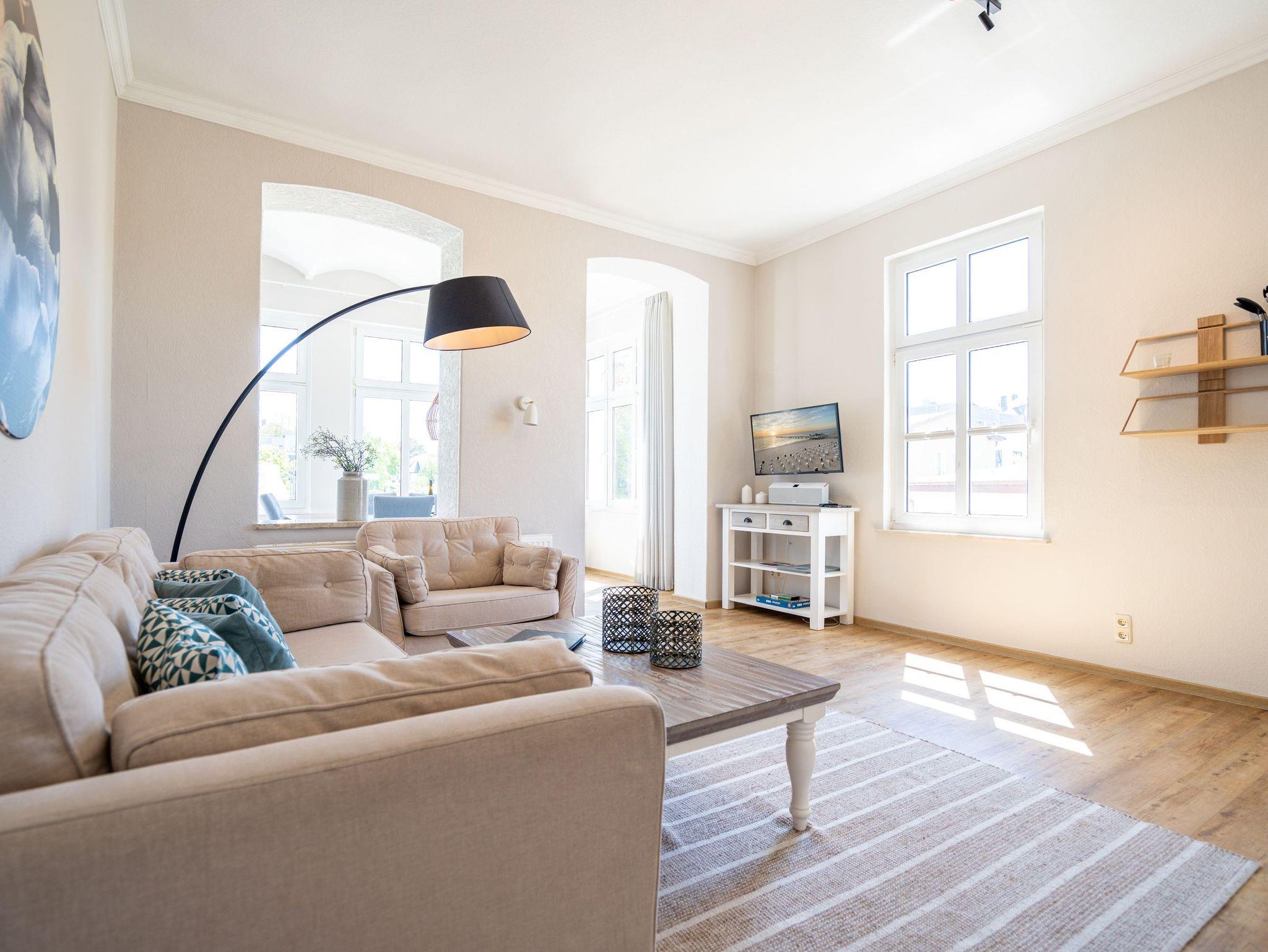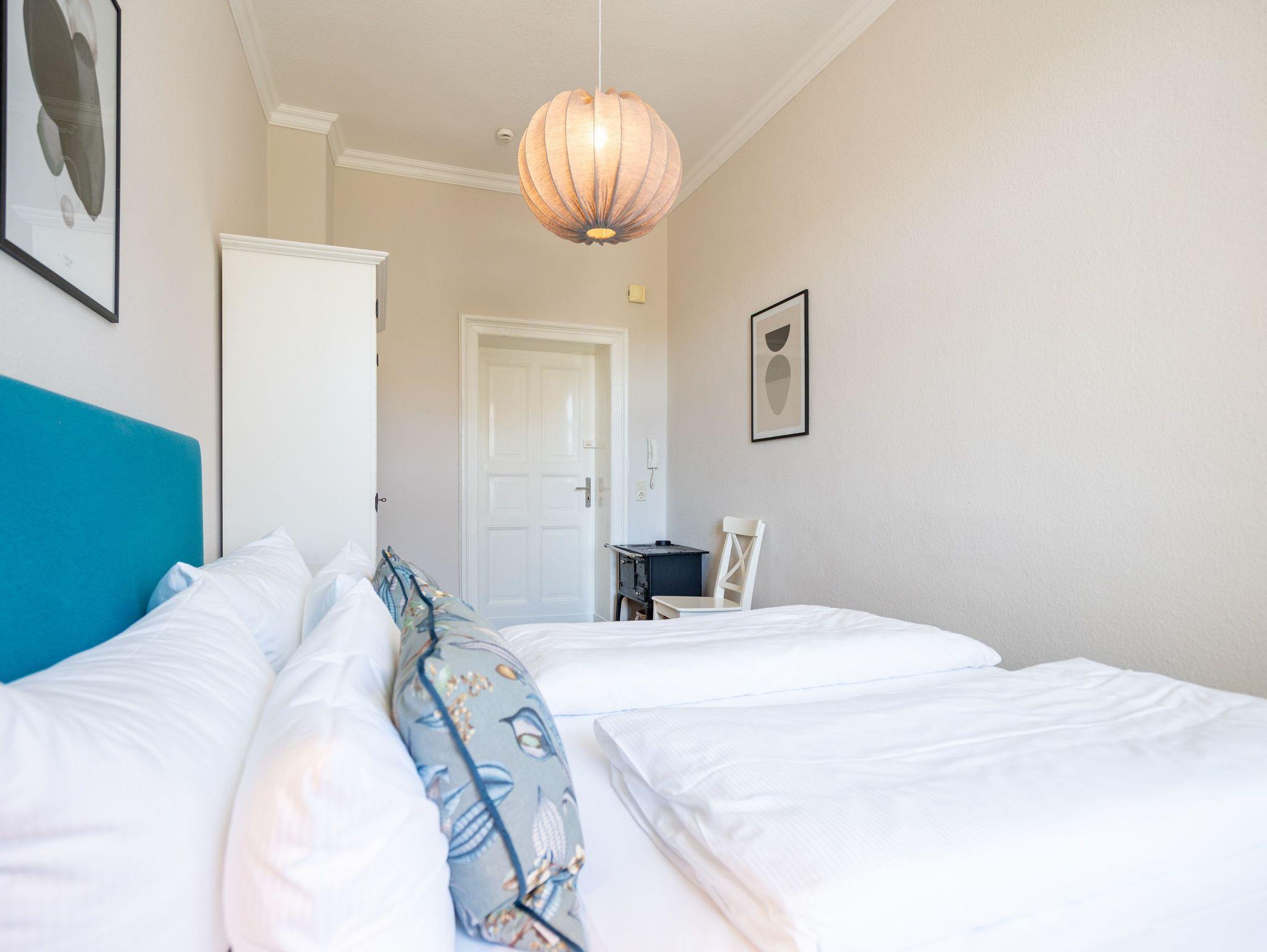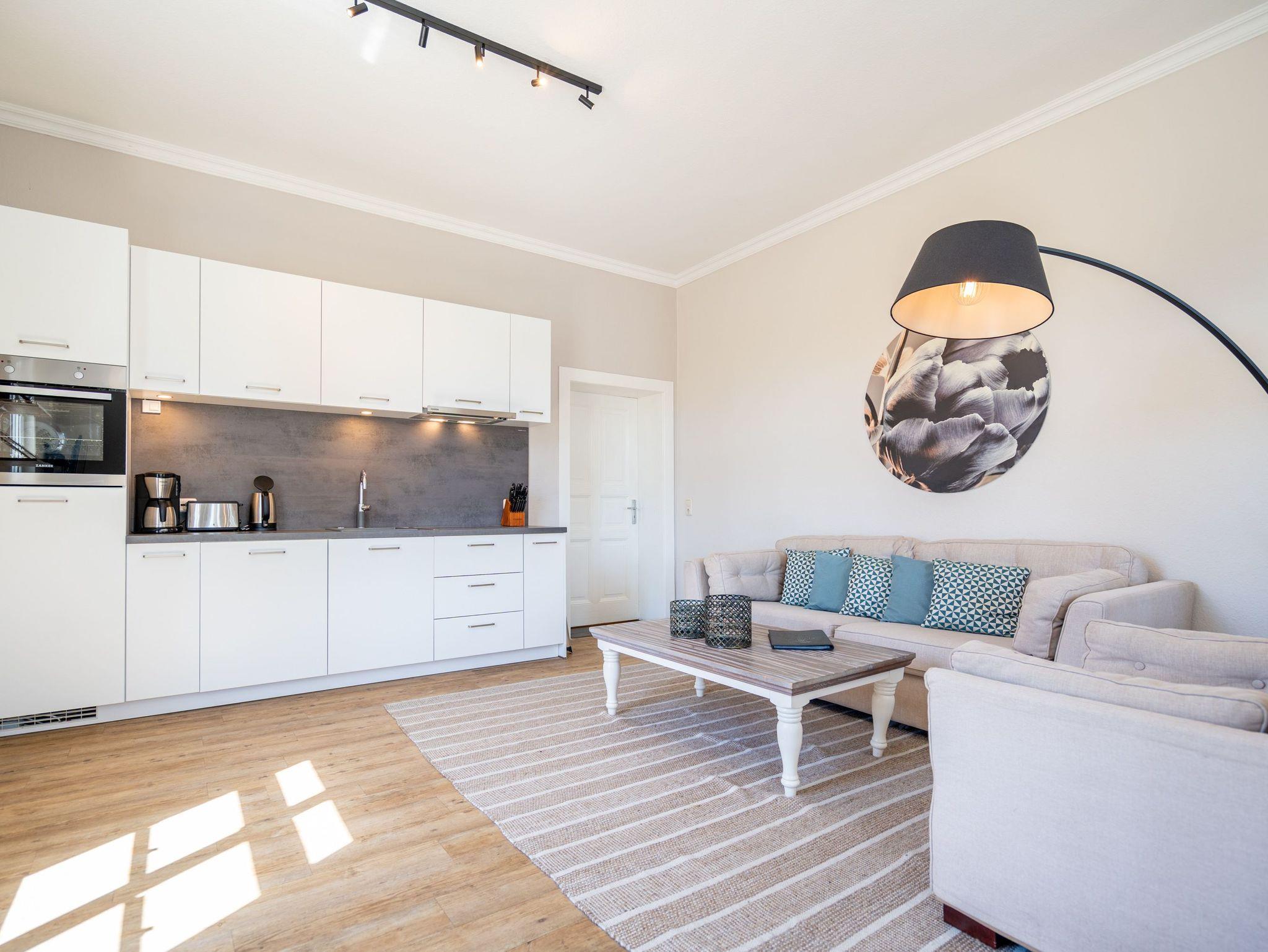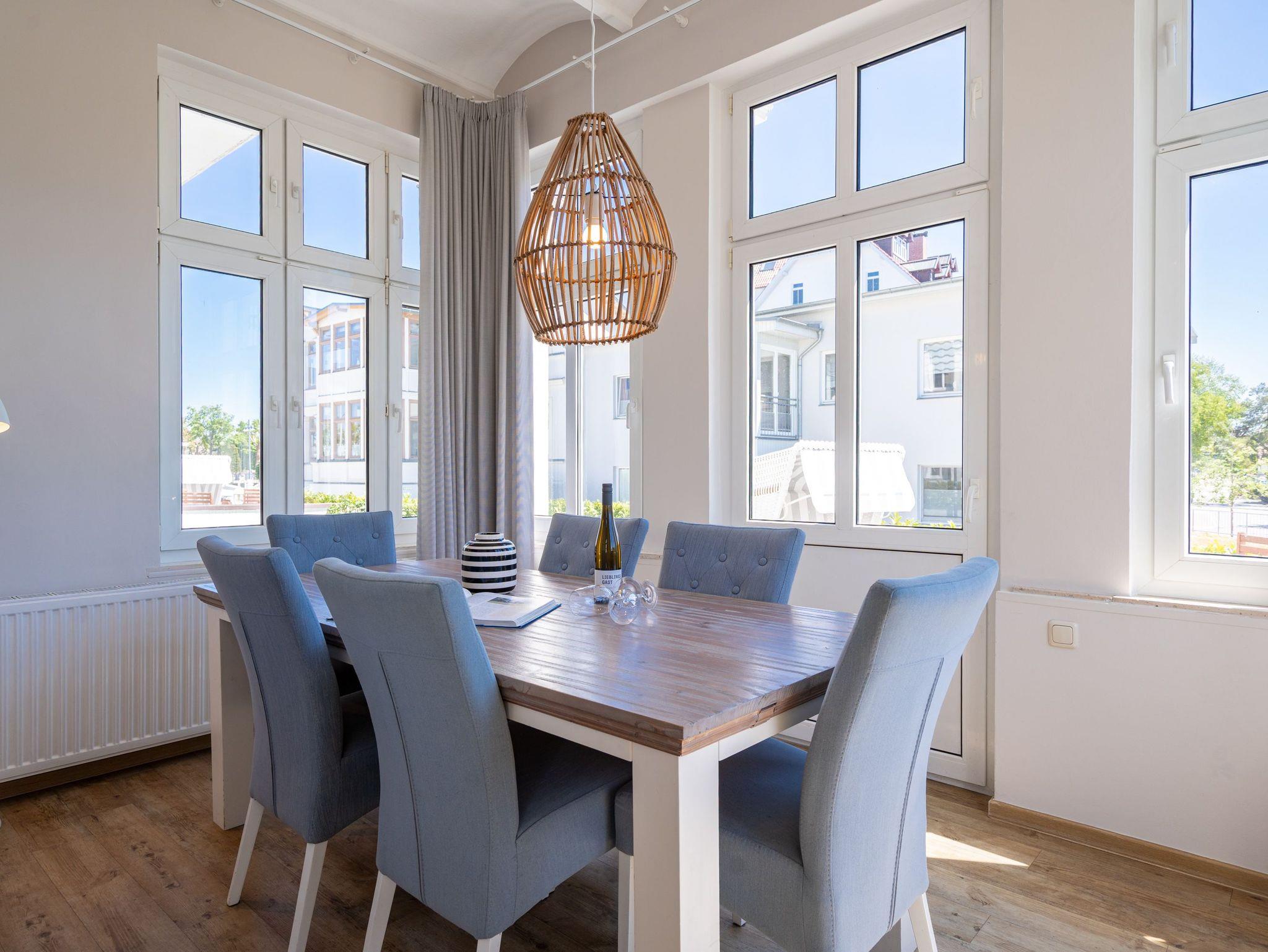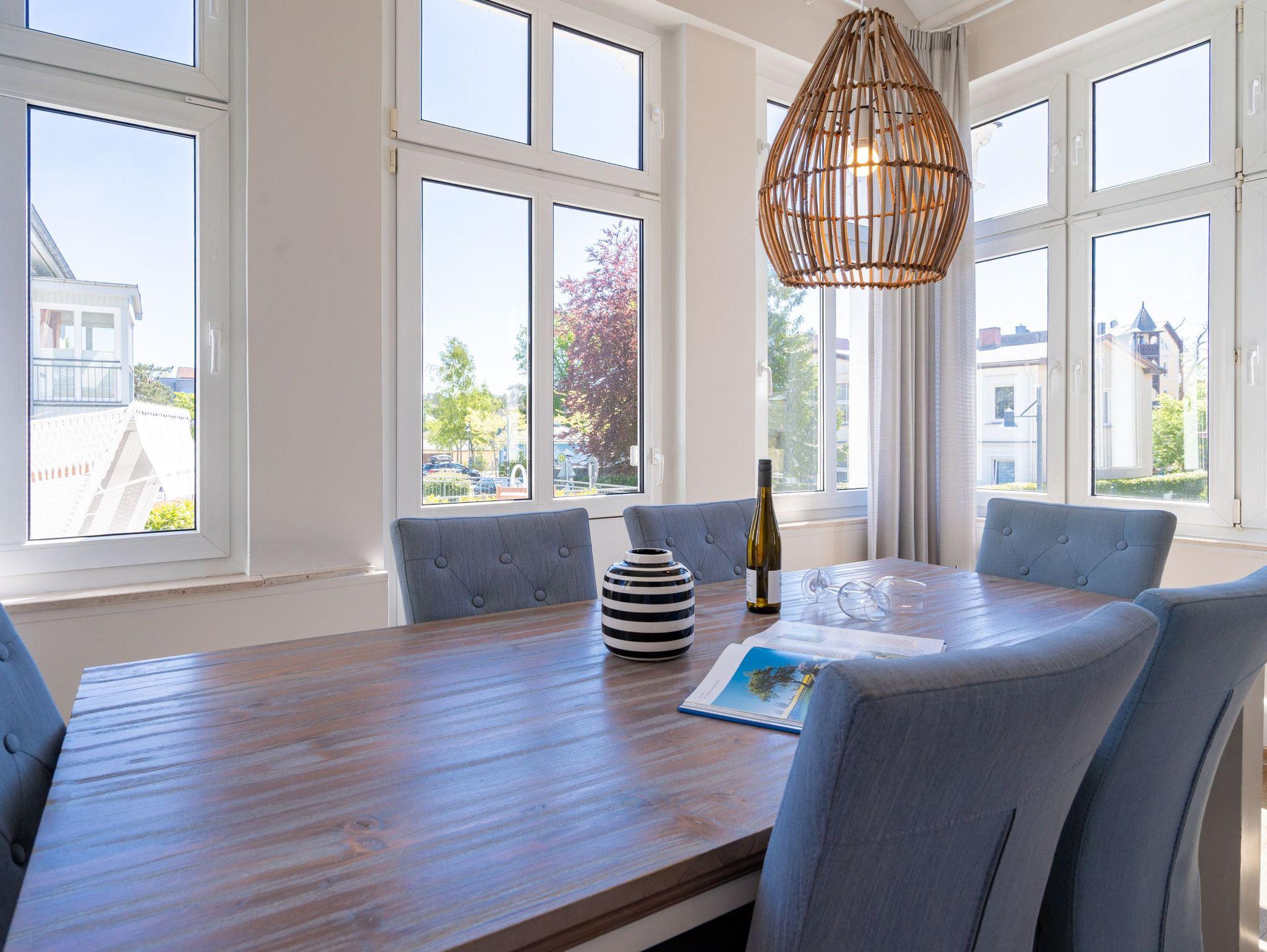 Von der schönen großen Terrasse aus können Sie an schönen Tagen vollauf die frische Seeluft genießen. Denn die Ostsee ist nur ein paar Meter entfernt. Lassen Sie sich in das Rauschen der Wellen fallen und schalten Sie einmal vollkommen ab. Vom Frühling bis in den Herbst hinein ist die Terrasse mit Gartenmöbeln und Strandkorb bestückt, so dass Sie hier schon zum Frühstück in der Sonne sitzen können. Die ganze Wohnung Nummer 1 in der Villa Albertine lädt auf ihren 80 Quadratmetern nur dazu ein, sich in ihr wohlzufühlen. Hier können Sie mit bis zu sechs Personen entspannt Urlaub machen. Drei Schlafzimmer mit komfortablen Boxspringdoppelbetten ausgestattet, schenken Ihnen erholsame Träume. Große Schränke bieten viel Ablagefläche. Kommen Sie in der schönen und offenen Wohnküche zu gemeinsamen Mußestunden beim Relaxen auf der bequemen Sitzgruppe oder zum genussvollen Dinieren zusammen. Die Küche bietet alles, was Sie für die Zubereitung eines schönen Essens benötigen. Hochwertige Geräte und erlesenes ASA-Geschirr sorgen dafür, dass das Kochen Spaß macht. Eine helle und zum Wohnzimmer hin offene Veranda lässt Sie eintauchen in die mondäne Zeit der Bäderarchitektur. Hier können Sie am großen Esstisch wunderbare Auszeitstunden verbringen. Die Wohnung verfügt über zwei Dusch-Bäder. Bei Ihrer Anreise sind die Betten bereits bezogen und Handtücher liegen bereit. In der Tiefgarage steht Ihnen für Ihr Auto ein Tiefgaragenplatz zur Verfügung.