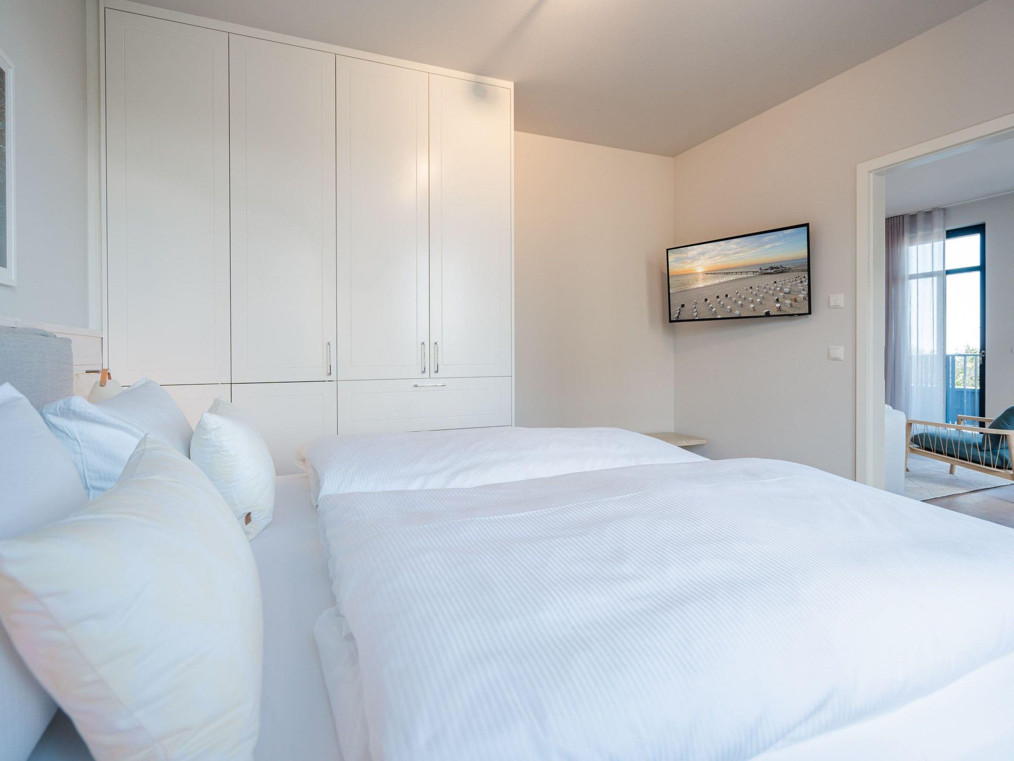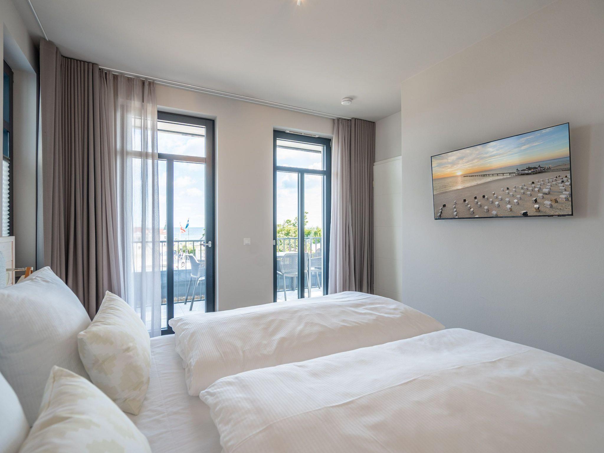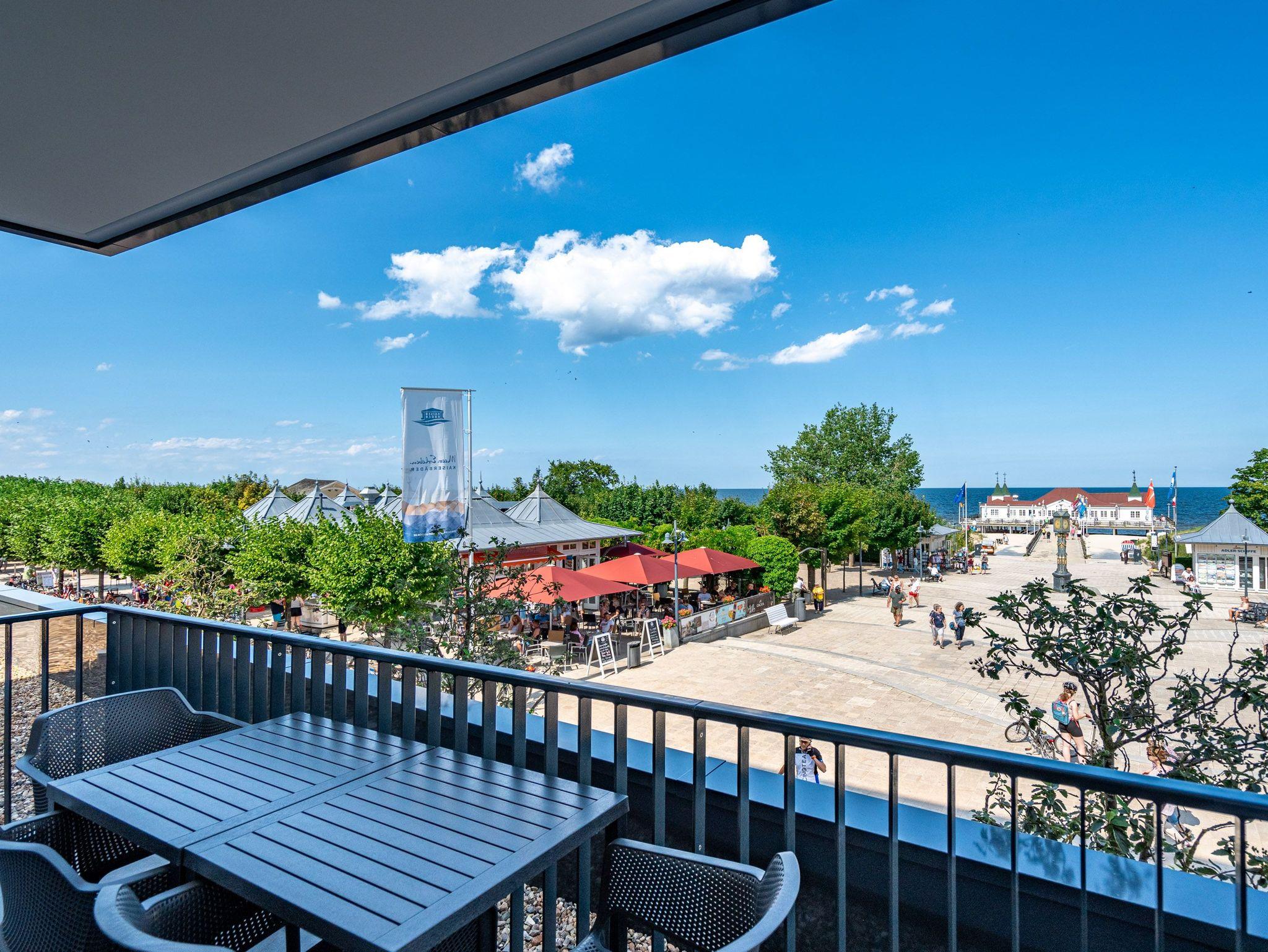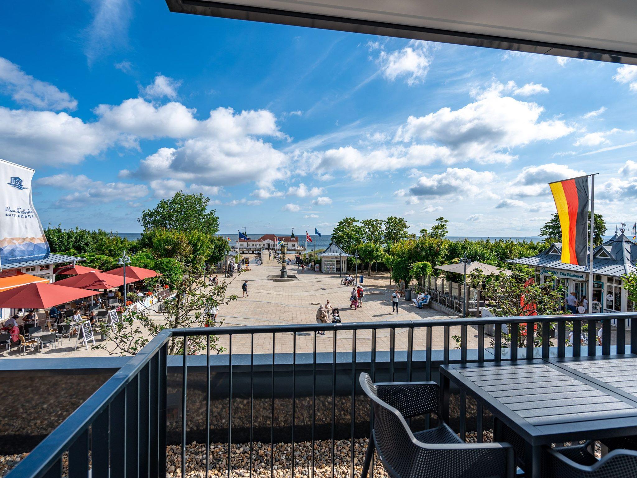 Dem Ostseerauschen ganz nah sind Sie in diesem schönen und modernen 3-Raum-Appartement im 1. Obergeschoss mit fantastischer Aussicht. Denn das 78-Quadratmeter-Wohlfühlreich für bis zu 4 Personen hat direkten Blick auf die Ahlbecker Seebrücke. Freuen Sie sich auf eine exklusive Auszeit in bester Lage. Denn das wohl bekannteste Postkartenmotiv der Insel Usedom liegt Ihrem Feriendomizil zu Füßen. Das Appartement verfügt über ein Wohnzimmer und zwei Schlafzimmer. Genießen Sie die Zeit im offenen Wohn- und Essbereich, der zur Seeseite hin ausgerichtet ist. Hier kommen Sie aus dem Schwärmen gar nicht mehr heraus. Gemeinsame Stunden werden hier zu unvergesslich schönen Erinnerungen. Kochen Sie zusammen in der mit allem ausgestatteten Küchenzeile und entspannen Sie auf der gemütlichen Sitzgruppe mit Sofa und Sessel. Der Elektrokamin (ohne Wärmeabgabe) sorgt für eine hyggelige Atmosphäre, während der 50-Zoll-Flachbildfernseher sich um das Entertainment kümmert. Mit gleich drei Balkonen (2 x Nordausrichtung und 1x Richtung Osten) können Sie das Lichtspiel auf der Ostsee vom Sonnenaufgang bis in den Abend beobachten, wenn sich der Himmel über dem Meer von zartem Rosa bis ins Orangegelb und Feuerrot einfärbt. Von hier aus können Sie nachts zu Midsommar den roten Streifen am Horizont über der Ostsee deutlich sehen. Die zwei Schlafzimmer sind jeweils mit einem komfortablen Boxspringdoppelbett (1,80m x 2,00m), einem großen Kleiderschrank ausgestattet. Angenehme Träume sind garantiert. Beide Schlafzimmer verfügen zudem über einen 43-Zoll-Flachbildfernseher. Eines der Schlafzimmer hat einen Zugang zum dritten Balkon, so dass Sie schon beim Aufwachen Meerblick haben. Schnick, schnack, schnuck kann im Fall der Fälle hilfreich sein. Für Ihren Komfort stehen Ihnen zwei innenliegende Bäder mit Dusche, WC und Waschtisch zur Verfügung. Ein PKW-Stellplatz in der Tiefgarage gehört ebenfalls zur Wohnung. Kommen Sie an und lassen Sie die Alltagssorgen los. Erleben Sie erholsame Tage in der Strandterrasse und lassen Sie sich von dem traumhaften Ausblick und den Annehmlichkeiten dieser komfortablen Ferienwohnung verzaubern.