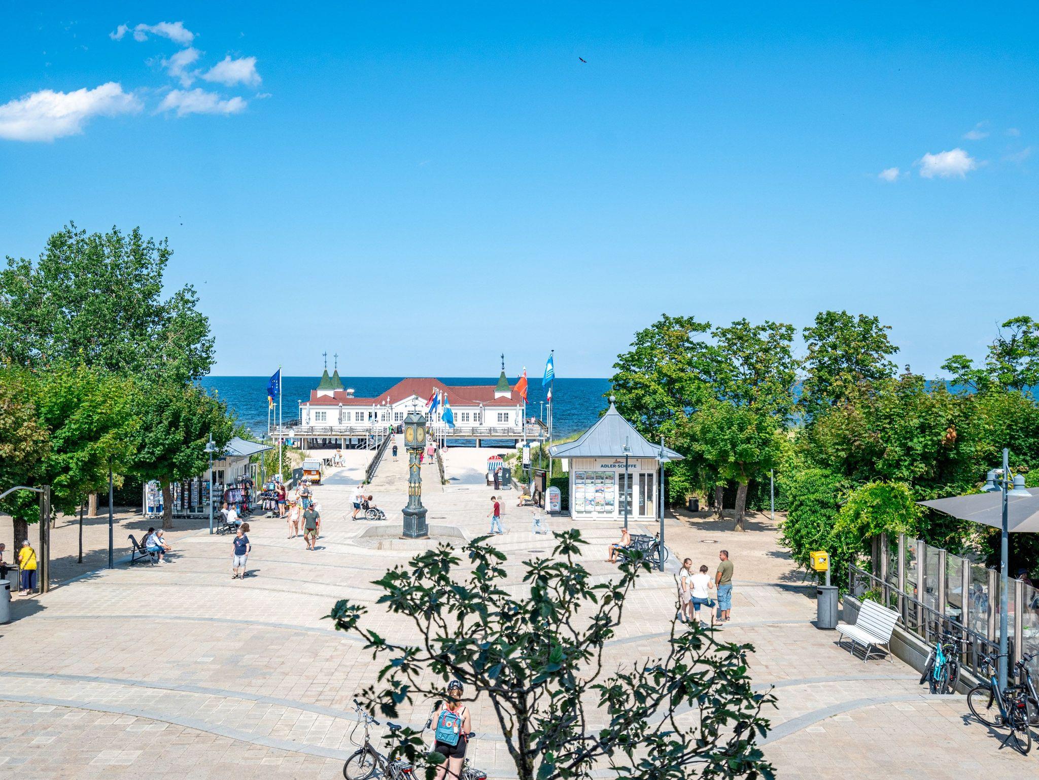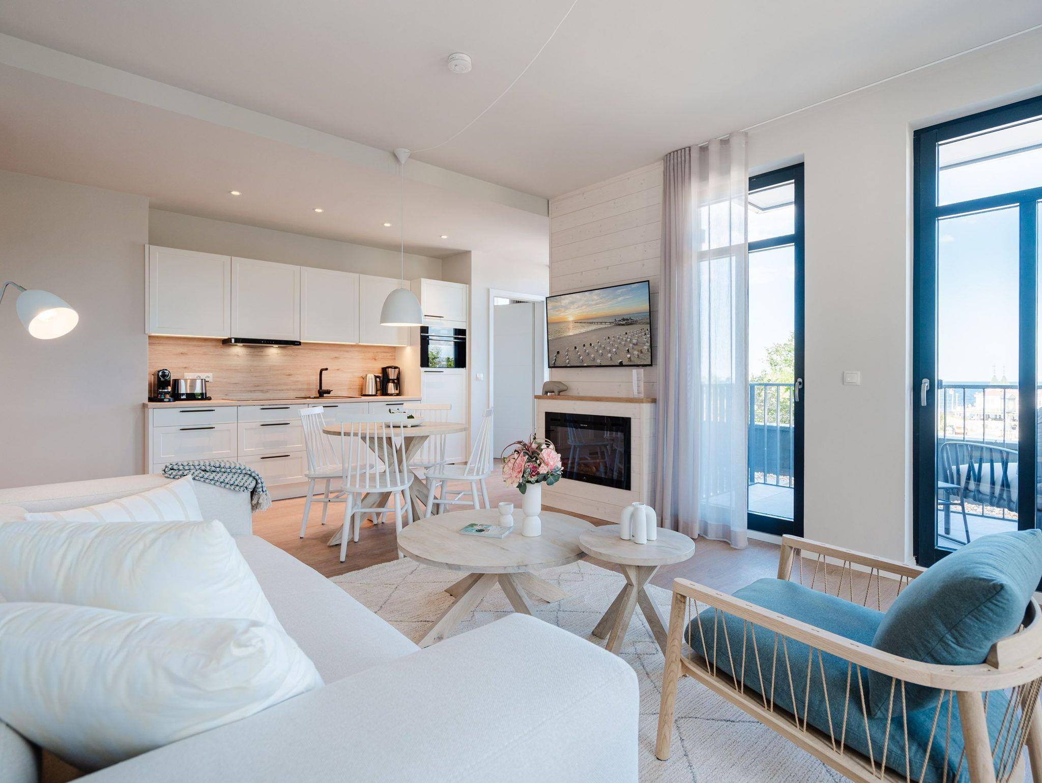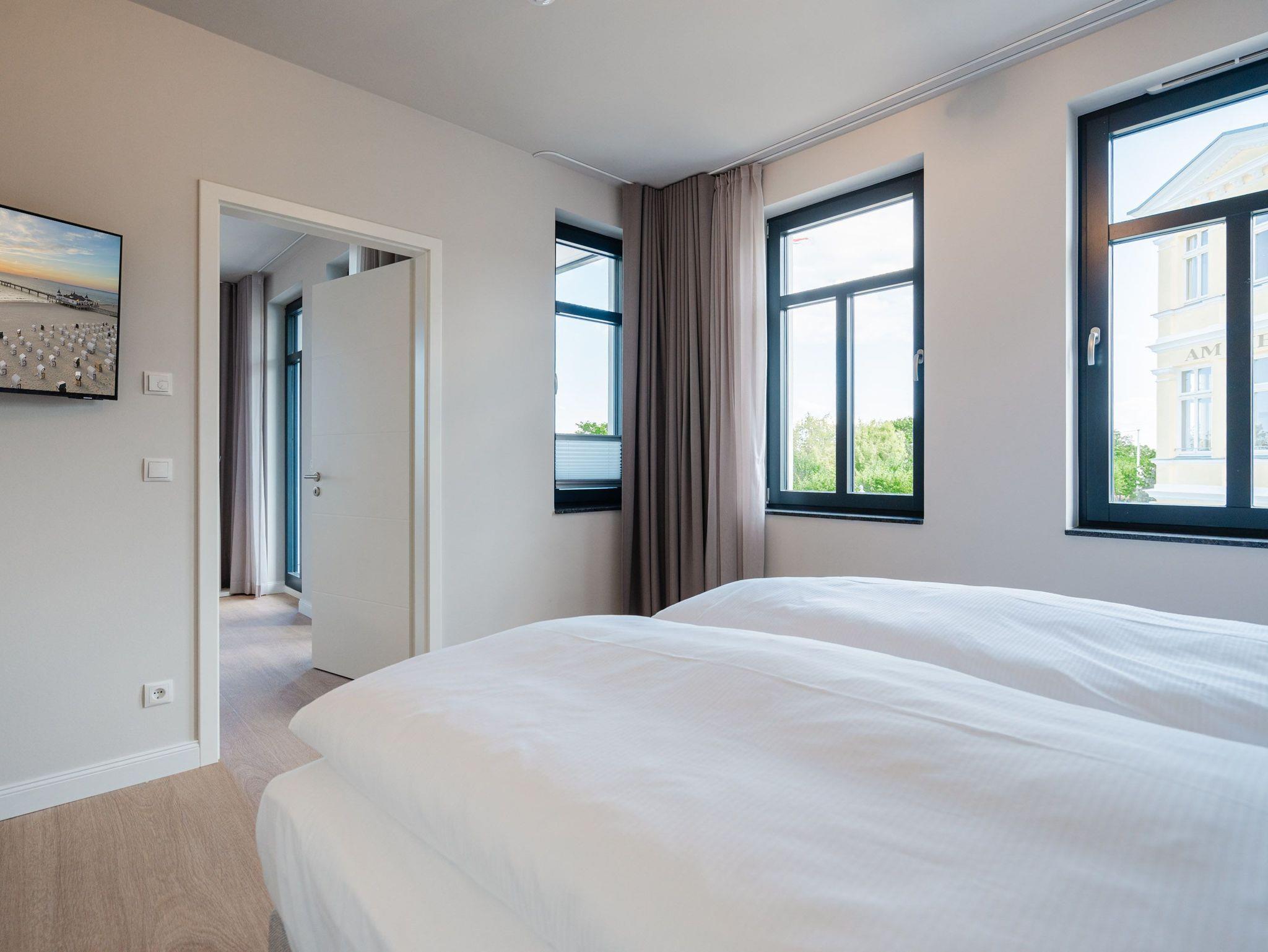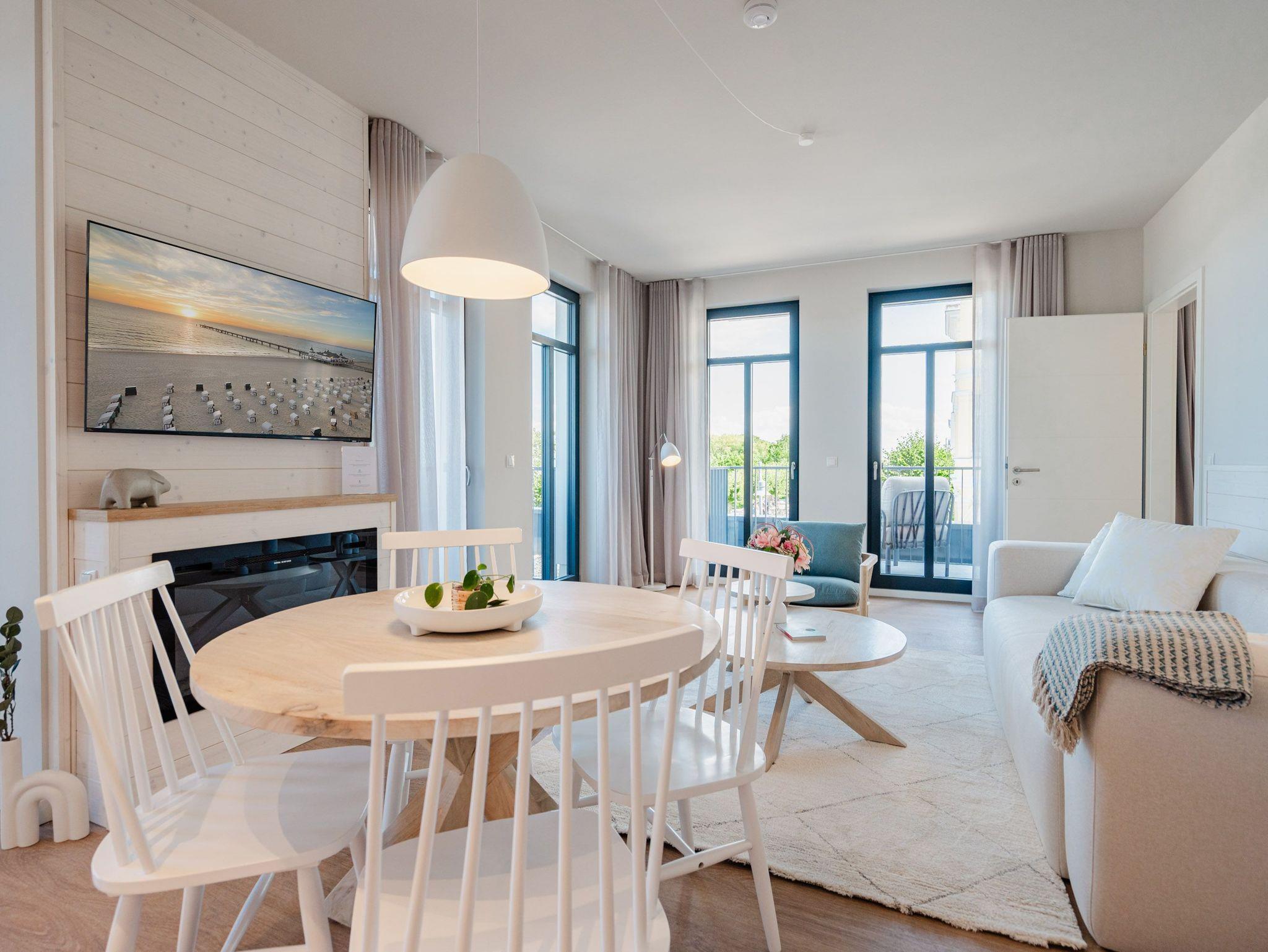 Dem Ostseerauschen ganz nah sind Sie in diesem schönen und modernen 3-Raum-Appartement im 1. Obergeschoss mit fantastischer Aussicht. Denn das 78-Quadratmeter-Wohlfühlreich für bis zu 4 Personen hat direkten Blick auf die Ahlbecker Seebrücke. Freuen Sie sich auf eine exklusive Auszeit in bester Lage. Denn das wohl bekannteste Postkartenmotiv der Insel Usedom liegt Ihrem Feriendomizil zu Füßen. Das Appartement verfügt über ein Wohnzimmer und zwei Schlafzimmer. Genießen Sie die Zeit im offenen Wohn- und Essbereich, der zur Seeseite hin ausgerichtet ist. Hier kommen Sie aus dem Schwärmen gar nicht mehr heraus. Gemeinsame Stunden werden hier zu unvergesslich schönen Erinnerungen. Kochen Sie zusammen in der mit allem ausgestatteten Küchenzeile und entspannen Sie auf der gemütlichen Sitzgruppe mit Sofa und Sessel. Der Elektrokamin (ohne Wärmeabgabe) sorgt für eine hyggelige Atmosphäre, während der 50-Zoll-Flachbildfernseher sich um das Entertainment kümmert. Mit gleich drei Balkonen (2 x Nordausrichtung und 1x Richtung Osten) können Sie das Lichtspiel auf der Ostsee vom Sonnenaufgang bis in den Abend beobachten, wenn sich der Himmel über dem Meer von zartem Rosa bis ins Orangegelb und Feuerrot einfärbt. Von hier aus können Sie nachts zu Midsommar den roten Streifen am Horizont über der Ostsee deutlich sehen. Die zwei Schlafzimmer sind jeweils mit einem komfortablen Boxspringdoppelbett (1,80m x 2,00m), einem großen Kleiderschrank ausgestattet. Angenehme Träume sind garantiert. Beide Schlafzimmer verfügen zudem über einen 43-Zoll-Flachbildfernseher. Eines der Schlafzimmer hat einen Zugang zum dritten Balkon, so dass Sie schon beim Aufwachen Meerblick haben. Schnick, schnack, schnuck kann im Fall der Fälle hilfreich sein. Für Ihren Komfort stehen Ihnen zwei innenliegende Bäder mit Dusche, WC und Waschtisch zur Verfügung. Ein PKW-Stellplatz in der Tiefgarage gehört ebenfalls zur Wohnung. Kommen Sie an und lassen Sie die Alltagssorgen los. Erleben Sie erholsame Tage in der Strandterrasse und lassen Sie sich von dem traumhaften Ausblick und den Annehmlichkeiten dieser komfortablen Ferienwohnung verzaubern.