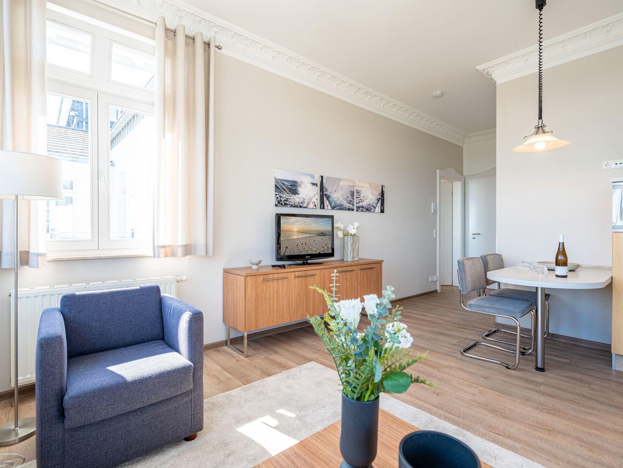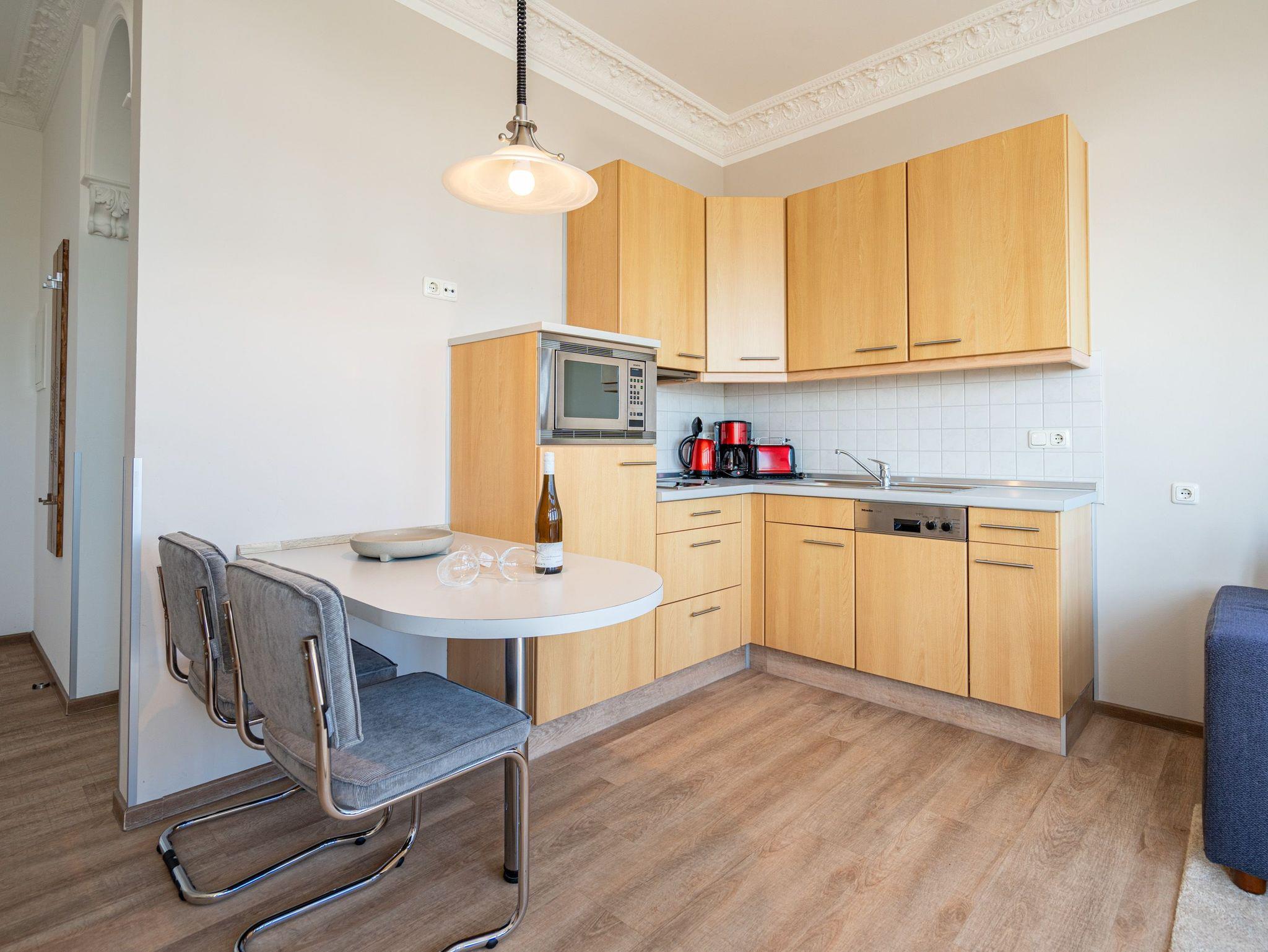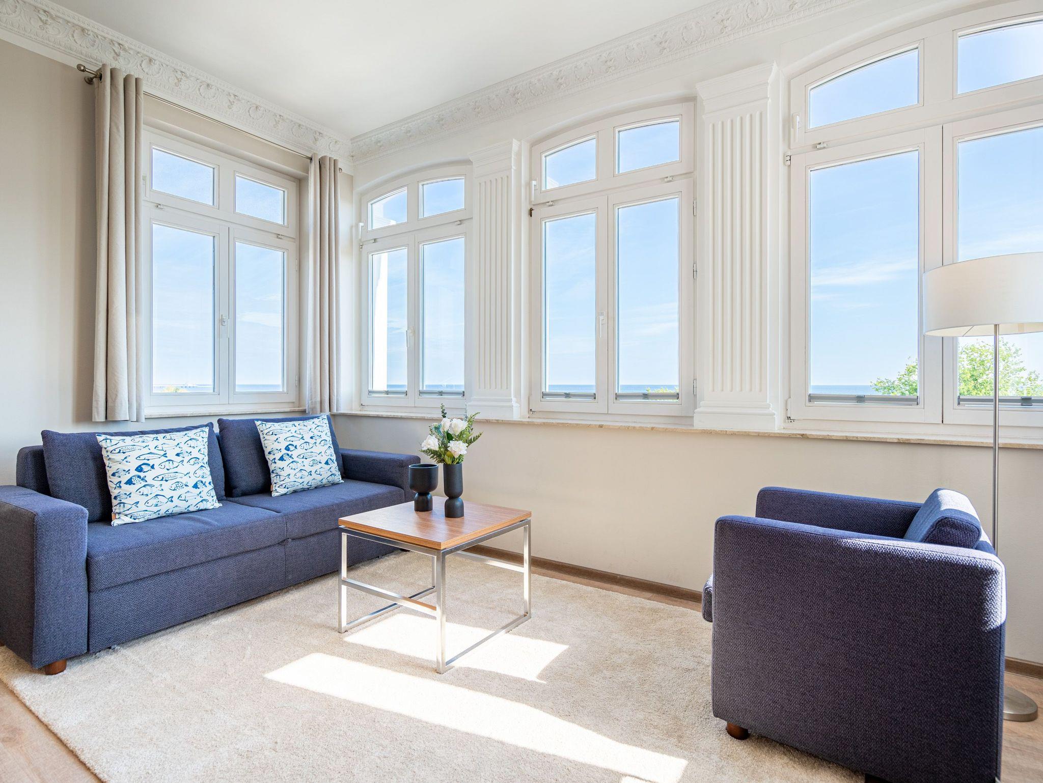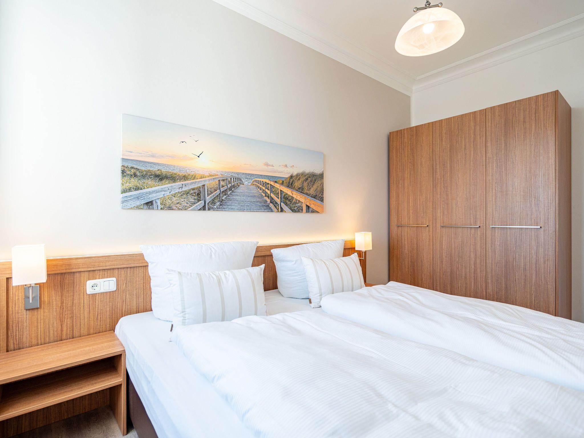 Die 2-Raum-Ferienwohnung Nr. C11 in der Villa Seedüwel bietet auf 41 qm gemütlichen Platz für zwei Personen und liegt im 2. Obergeschoss. Der offene Wohnbereich begeistert mit einem traumhaften Blick auf die Ostsee und ist mit einer Küchenzeile ausgestattet, die ein 2-Platten-Cerankochfeld, eine Mikrowelle und einen Kühlschrank mit Gefrierfach umfasst. Ein Essplatz für zwei Personen, eine Sitzgruppe und ein Flat-TV vervollständigen den Wohnbereich. Das Schlafzimmer verfügt über ein komfortables Doppelbett (1,80 m x 2,00 m) und einen Kleiderschrank. Auch von hier aus genießen Sie den Blick auf die Ostsee. Das innenliegende Bad ist mit einer Dusche und einem Waschbecken ausgestattet, und es gibt ein separates WC. Ein Stellplatz in der Tiefgarage ( Einfahrthöhe 2,03m) des benachbarten Hauses „Strandterrasse“ ist für Sie reserviert. WLAN steht Ihnen kostenfrei zur Verfügung.