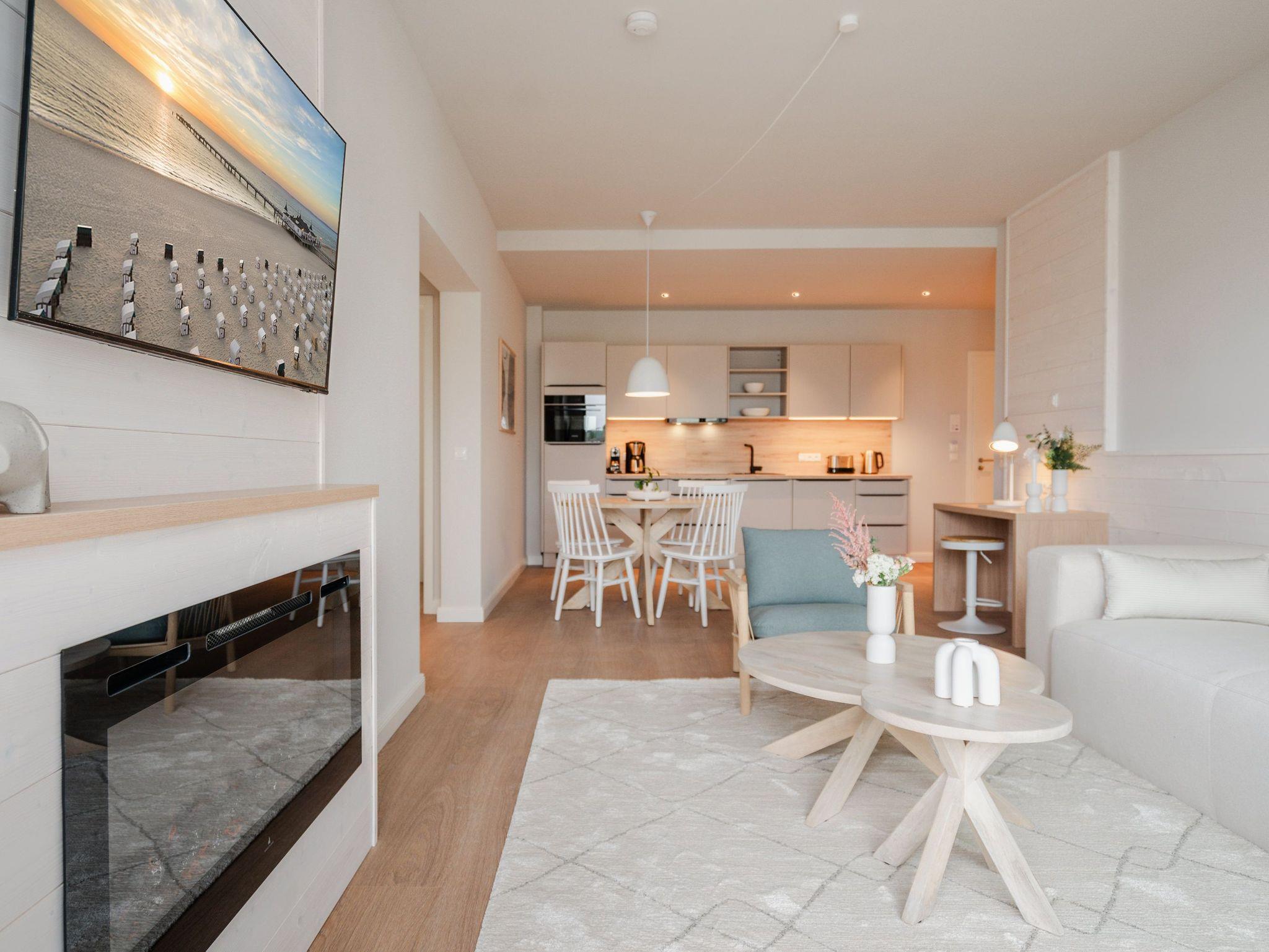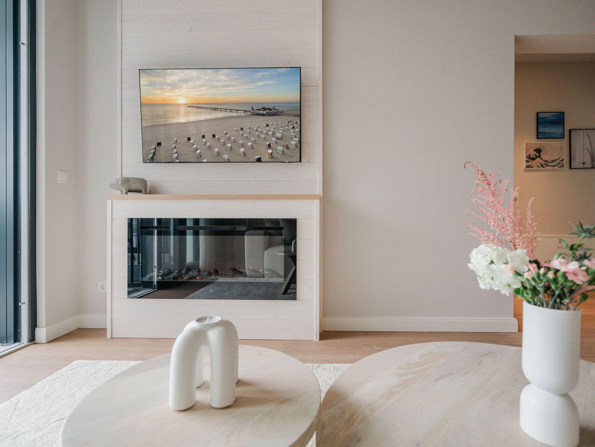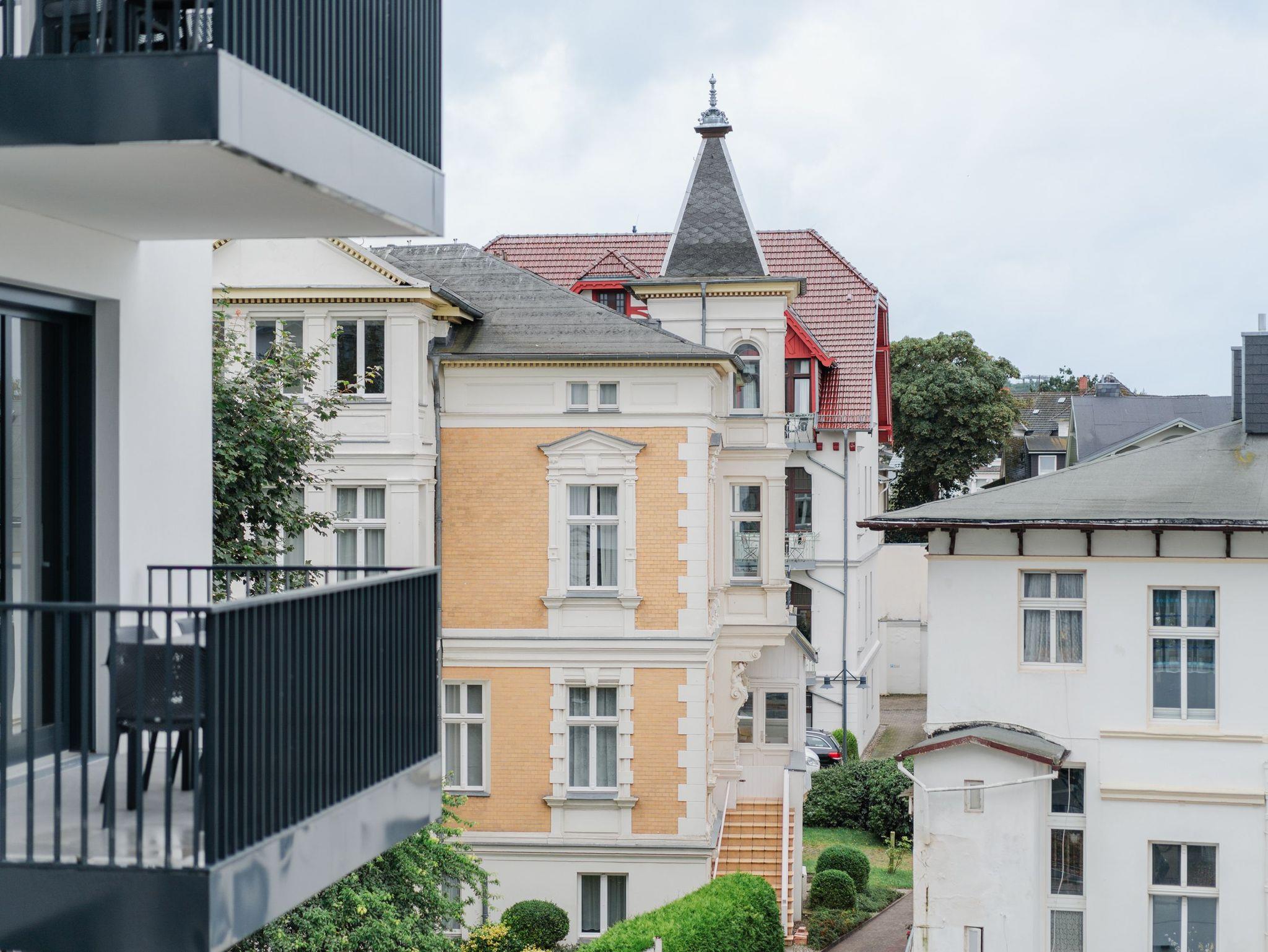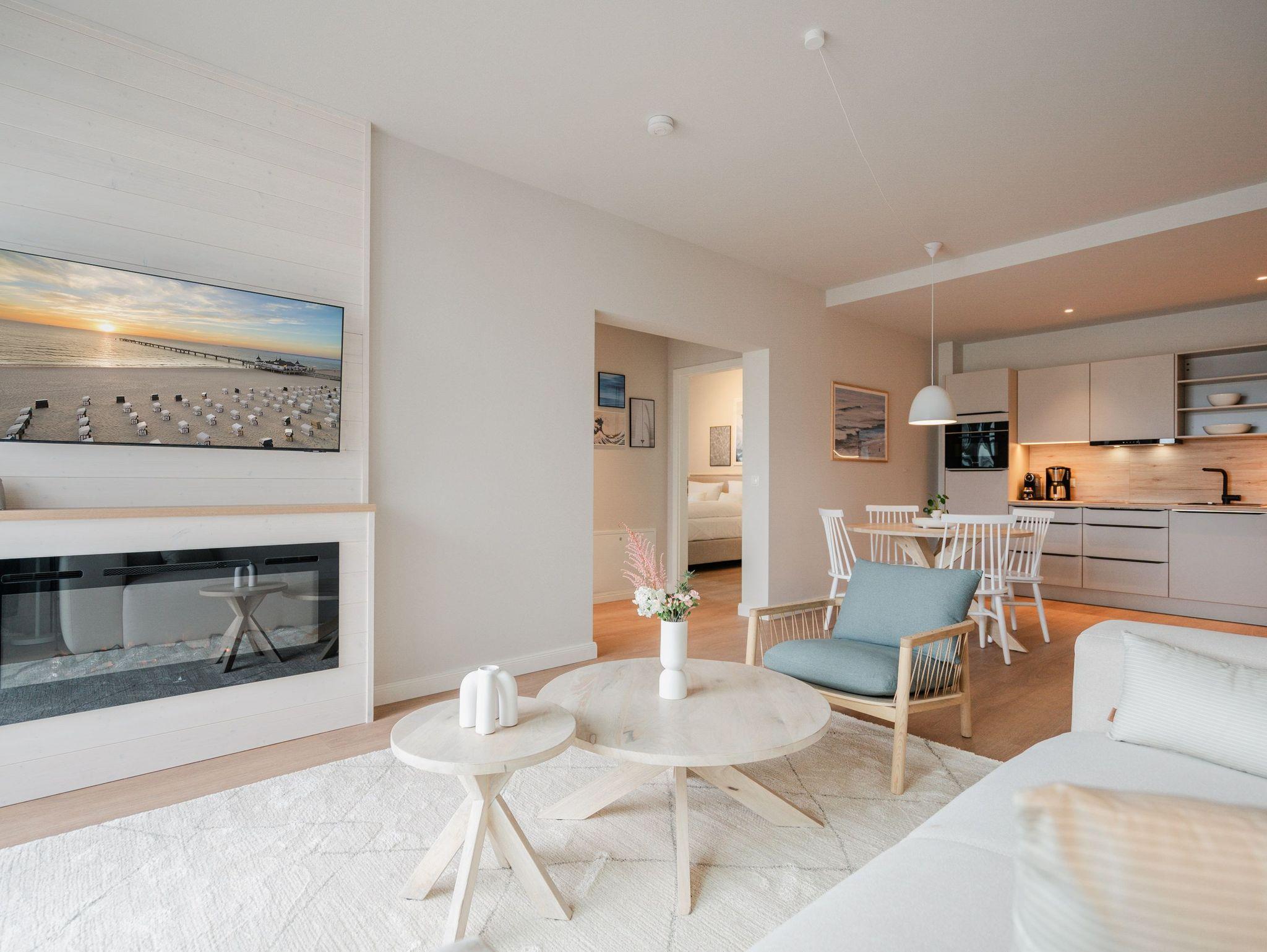 Die 2024 fertig gestellte Strandterrasse liegt direkt an der belebten Strandpromenade und bietet einen einzigartigen Ausblick auf die Grand Dame der historischen Seebrücken sowie die historische Konzertmuschel, einem beliebten Treffpunkt für Kunst und Kultur. Dahinter liegt die Ostsee ? ein Panorama, das zu den schönsten in den Kaiserbädern gehört. Es ist wie das Abtauchen in eine andere Zeit. In eine Zeit, in der man mit Stock, Sonnenschirm und Hut fürs „Sehen und gesehen werden“ über die Promenade schlenderte; aber auch in eine Zeit, in der ? damals wie heute ? Zeit einmal für eine kurze Weile keine Rolle spielt. Weil man angekommen ist im Loslassen, Entspannen und Genießen. Es ist dieser besondere Geruch nach Meeresluft und Freiheit, der in Erinnerung bleibt. Dazu die Bilder, die man mitnimmt. Von langen Strandspaziergängen, vom Lachen in fröhlich schäumenden Ostseewellen, von der Zeit in einem wunderschönen Urlaubsdomizil. Denn genau das ist die Strandterrasse mit ihren 56 modernen und exklusiven Ferienappartements direkt gegenüber der Ahlbecker Seebrücke. Die Ein-, Zwei- oder Dreizimmerwohnungen ? zwischen 40 und 70 Quadratmeter groß ? sind von einer Innenarchitektin gemeinsam mit unserem Erfahrungsschatz an Gästewünschen mit viel Liebe zum Detail und ganz individuell konzipiert worden. Entspannung und Wohlfühlen stehen an erster Stelle. Alles ist aufeinander abgestimmt und sorgt für eine gemütliche Atmosphäre. Wählen Sie zwischen einem Domizil in einem hellen, sandfarbenen Designkonzept oder einem Appartement mit anthrazitfarbenen Farbakzenten. Alle Appartements verfügen gleichermaßen über eine stilvolle und komfortable Einrichtung, die passgenau angefertigt worden ist, sowie über moderne Küchen und Bäder. Jedem Schlafzimmer ist ein eigenes Bad mit Dusche zugeordnet (außer App. B4.5). Die Appartements besitzen fast alle einen Balkon ? viele schauen sogar zur Ostsee hinaus. Die meisten Feriendomizile haben einen Elektrokamin und Infrarotsaunen. Im Erdgeschoss befindet sich ein separater Gemeinschaftsraum für Fahrräder. Außerdem besteht die Möglichkeit, im Gemeinschaftswaschraum 2 Waschmaschinen [&] Trockner zu nutzen. Ergänzt wird das Angebot durch eine Gemeinschaftssauna, die täglich von 11:00 bis 22:00 Uhr nutzbar ist. In der Tiefgarage (Einfahrtshöhe 2,03 Meter) steht für jede Wohnung 1 Pkw-Stellplatz zur Verfügung. Ist alles zur Zufriedenheit untergebracht? Dann kann der Urlaub ja beginnen. Und beim Blick vom Balkon über die Ostsee treffen sich zum Sonnenaufgang das Heute und das Damals. Gelassenheit legt sich beim Gang hinunter an den Strand auf die Seele. Jetzt darf die Zeit stehenbleiben.