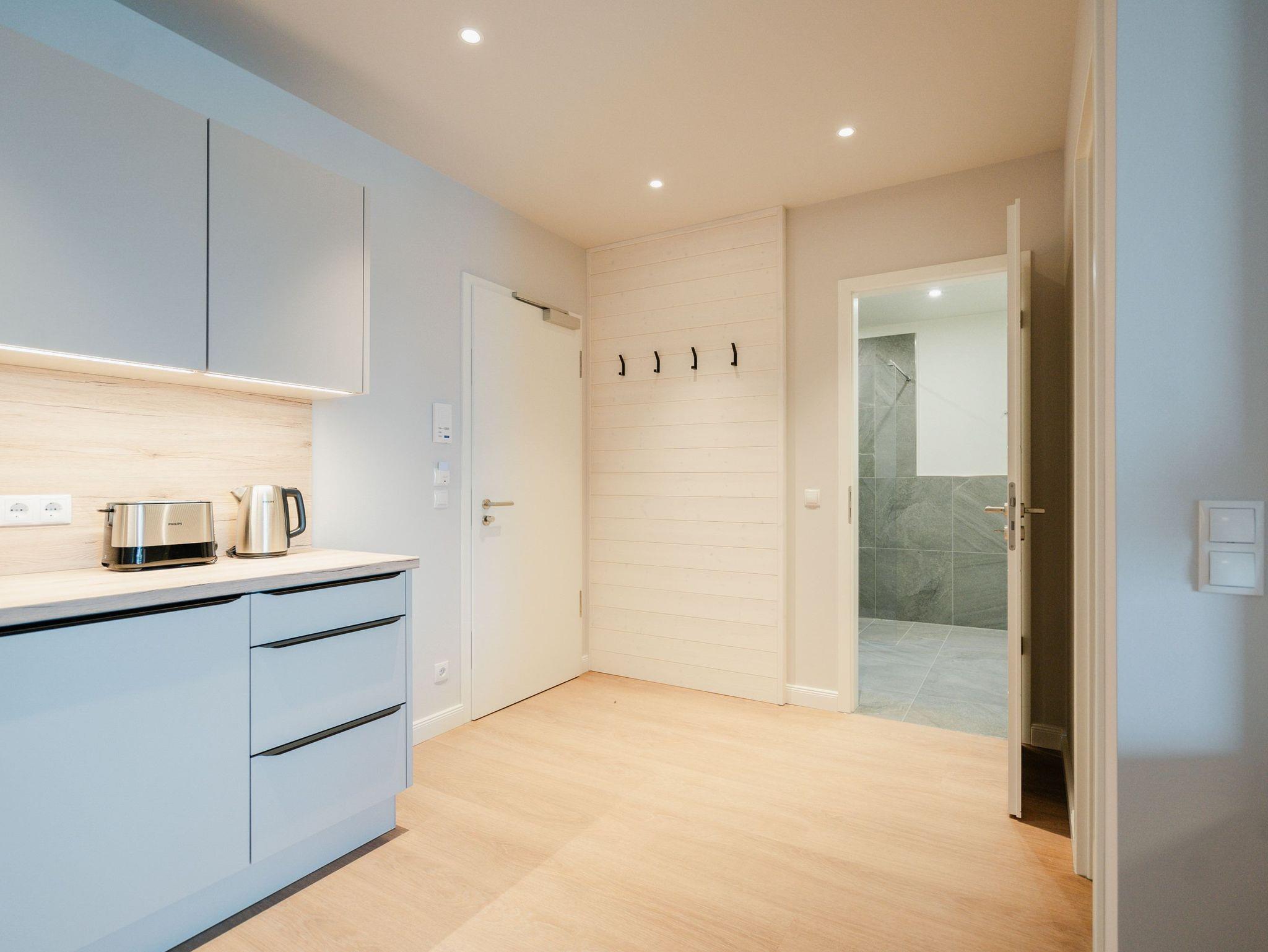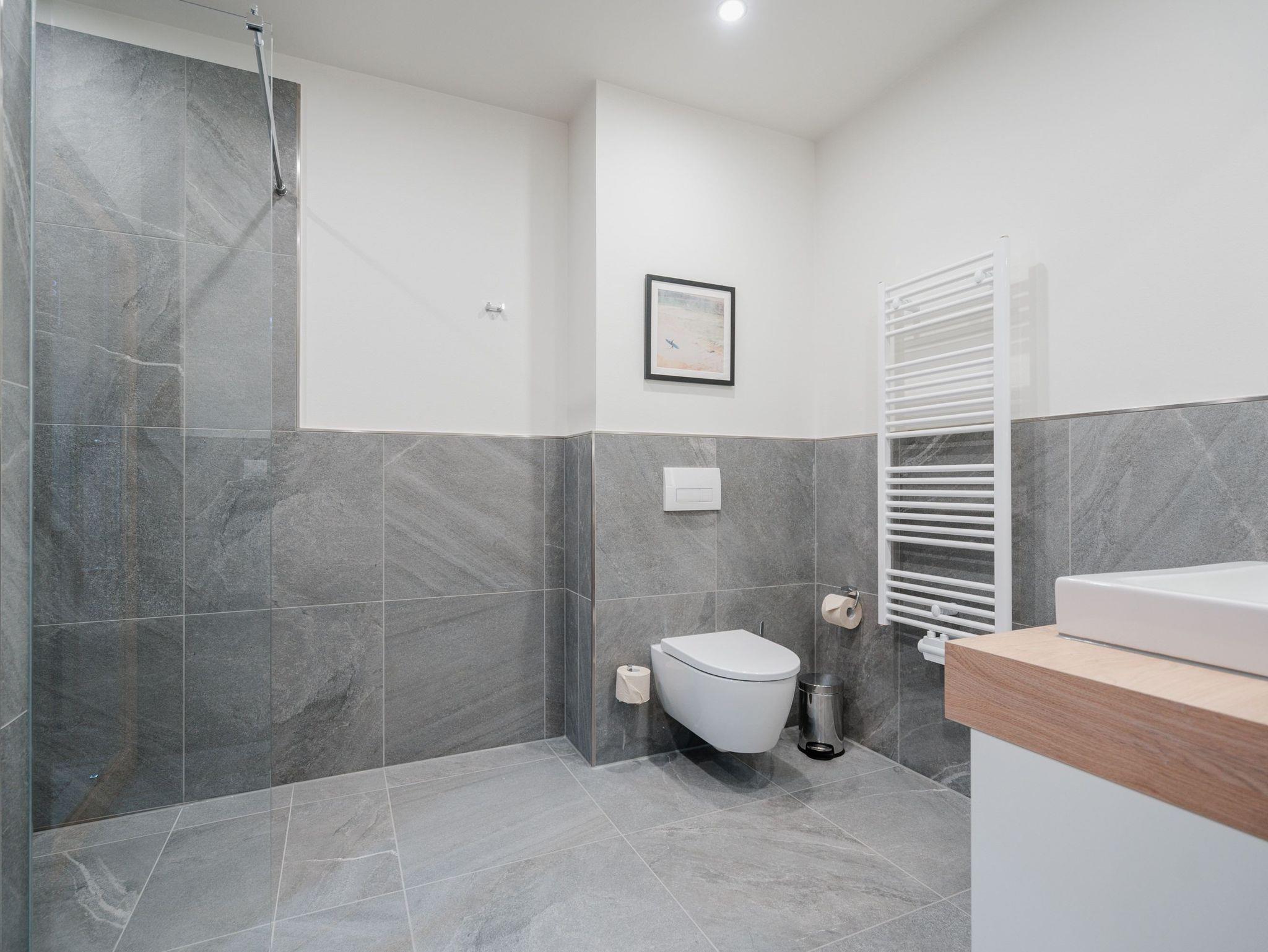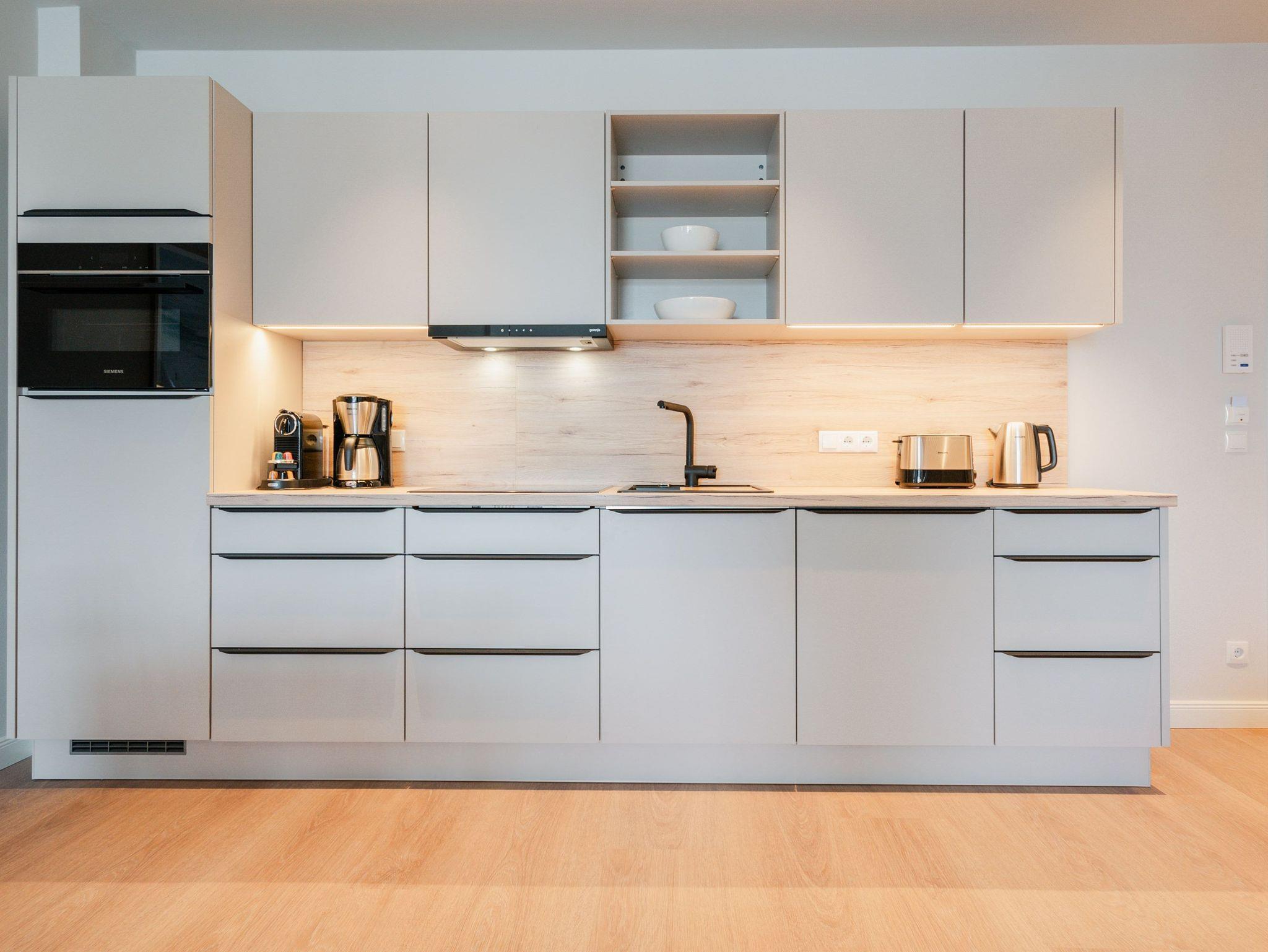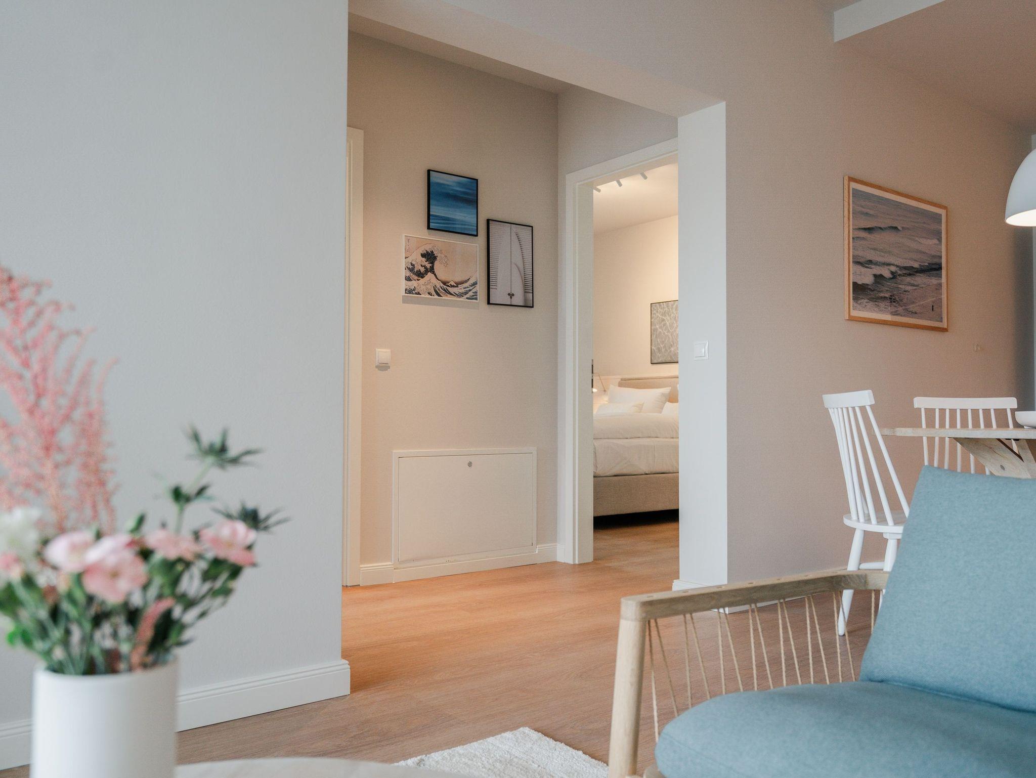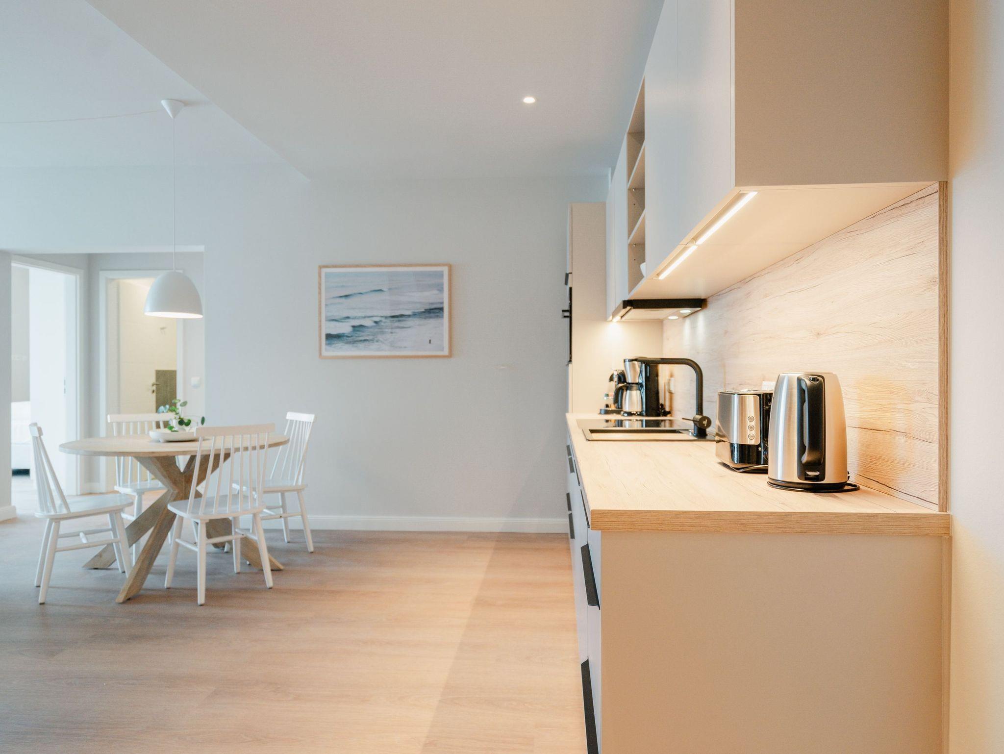 Die 2024 fertig gestellte Strandterrasse liegt direkt an der belebten Strandpromenade und bietet einen einzigartigen Ausblick auf die Grand Dame der historischen Seebrücken sowie die historische Konzertmuschel, einem beliebten Treffpunkt für Kunst und Kultur. Dahinter liegt die Ostsee ? ein Panorama, das zu den schönsten in den Kaiserbädern gehört. Es ist wie das Abtauchen in eine andere Zeit. In eine Zeit, in der man mit Stock, Sonnenschirm und Hut fürs „Sehen und gesehen werden“ über die Promenade schlenderte; aber auch in eine Zeit, in der ? damals wie heute ? Zeit einmal für eine kurze Weile keine Rolle spielt. Weil man angekommen ist im Loslassen, Entspannen und Genießen. Es ist dieser besondere Geruch nach Meeresluft und Freiheit, der in Erinnerung bleibt. Dazu die Bilder, die man mitnimmt. Von langen Strandspaziergängen, vom Lachen in fröhlich schäumenden Ostseewellen, von der Zeit in einem wunderschönen Urlaubsdomizil. Denn genau das ist die Strandterrasse mit ihren 56 modernen und exklusiven Ferienappartements direkt gegenüber der Ahlbecker Seebrücke. Die Ein-, Zwei- oder Dreizimmerwohnungen ? zwischen 40 und 70 Quadratmeter groß ? sind von einer Innenarchitektin gemeinsam mit unserem Erfahrungsschatz an Gästewünschen mit viel Liebe zum Detail und ganz individuell konzipiert worden. Entspannung und Wohlfühlen stehen an erster Stelle. Alles ist aufeinander abgestimmt und sorgt für eine gemütliche Atmosphäre. Wählen Sie zwischen einem Domizil in einem hellen, sandfarbenen Designkonzept oder einem Appartement mit anthrazitfarbenen Farbakzenten. Alle Appartements verfügen gleichermaßen über eine stilvolle und komfortable Einrichtung, die passgenau angefertigt worden ist, sowie über moderne Küchen und Bäder. Jedem Schlafzimmer ist ein eigenes Bad mit Dusche zugeordnet (außer App. B4.5). Die Appartements besitzen fast alle einen Balkon ? viele schauen sogar zur Ostsee hinaus. Die meisten Feriendomizile haben einen Elektrokamin und Infrarotsaunen. Im Erdgeschoss befindet sich ein separater Gemeinschaftsraum für Fahrräder. Außerdem besteht die Möglichkeit, im Gemeinschaftswaschraum 2 Waschmaschinen [&] Trockner zu nutzen. Ergänzt wird das Angebot durch eine Gemeinschaftssauna, die täglich von 11:00 bis 22:00 Uhr nutzbar ist. In der Tiefgarage (Einfahrtshöhe 2,03 Meter) steht für jede Wohnung 1 Pkw-Stellplatz zur Verfügung. Ist alles zur Zufriedenheit untergebracht? Dann kann der Urlaub ja beginnen. Und beim Blick vom Balkon über die Ostsee treffen sich zum Sonnenaufgang das Heute und das Damals. Gelassenheit legt sich beim Gang hinunter an den Strand auf die Seele. Jetzt darf die Zeit stehenbleiben.