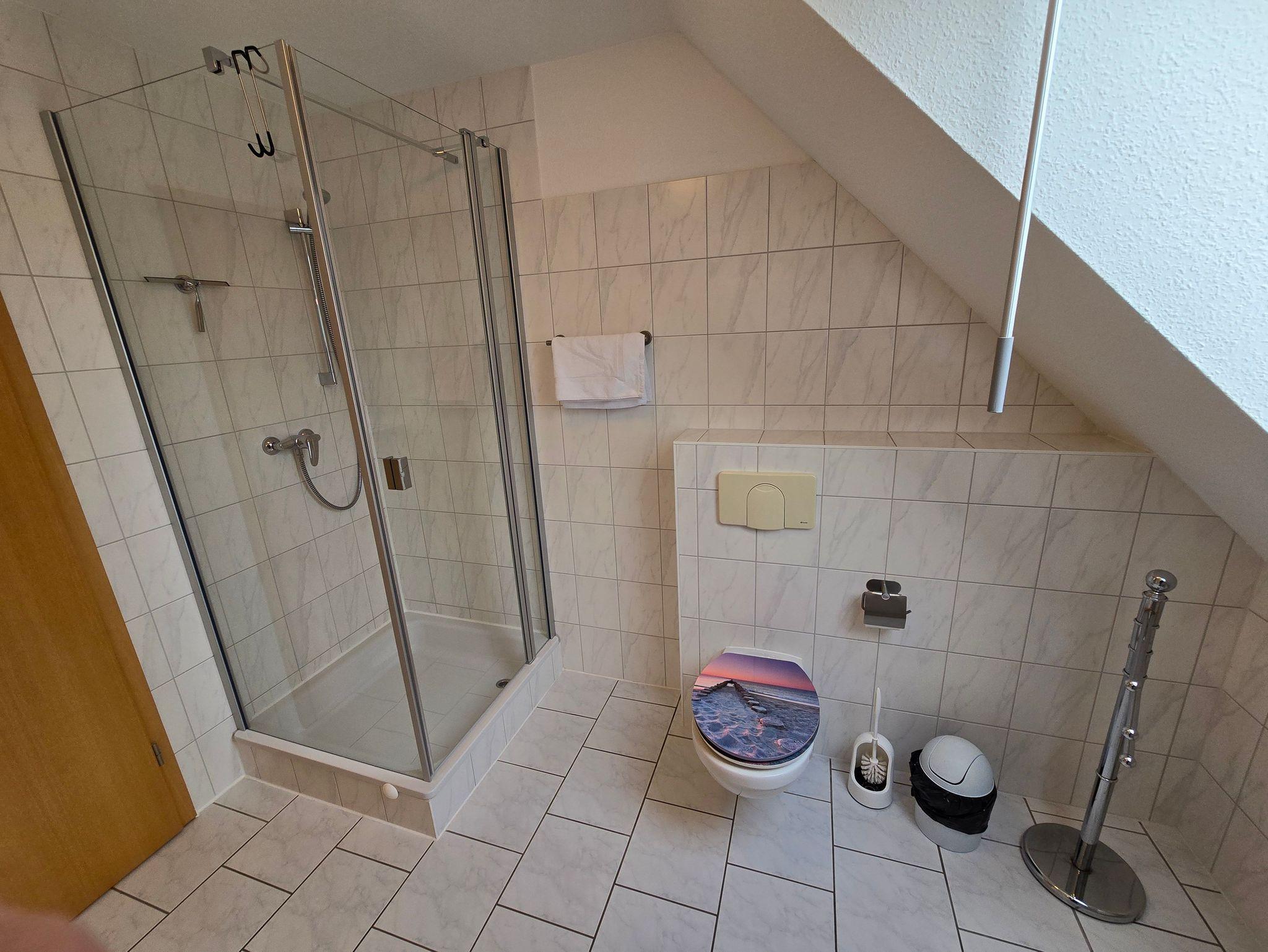 Die ruhig gelegene Nichtraucherferienwohnung im 1. Obergeschoss bietet Platz für bis zu 4 Personen. Sie besteht aus einem Wohnzimmer mit integrierter Küchenzeile mit 4 Plattenherd, Spülmaschine, Backofen, Kühlschrank, Mikrowelle, Toaster und Kaffeemaschine. Eine Couchsitzecke mit Flachbild TV, sowie ein separater Esstisch mit Stühlen runden die Ausstattung ab. Im Schlafzimmer befindet sich ein Doppelbett. Sowohl vom Wohn- als auch vom Schlafzimmer aus gelangen Sie auf den Balkon mit Waldblick. Das Bad ist mit DU und WC ausgestattet. Über eine Raumspartreppe (sehr steil) gelangen Sie in ein offenes, weiteres Schlafzimmer mit 2 Einzelbetten. Ein PKW-Stellplatz auf dem Grundstück ist inklusive. Das Internet via W-LAN, sowie die Erstausstattung Bettwäsche und Handtücher sind bereits im Preis enthalten. Aufgrund der steilen Treppe innerhalb der Wohnung ist die Wohnung mit Kindern erst ab 6 Jahren geeignet.