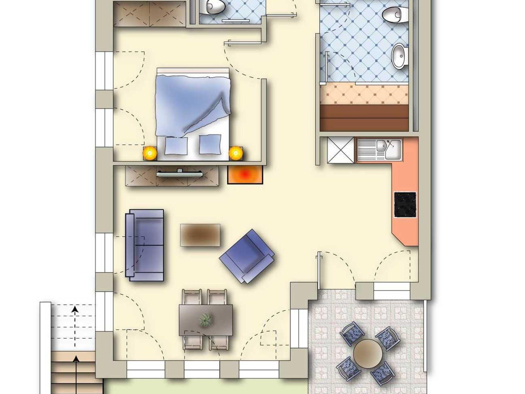 Die Wohnung verfügt über eine große möblierte Terrasse mit Sonnenliegen und Sonnenschirm.