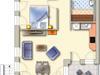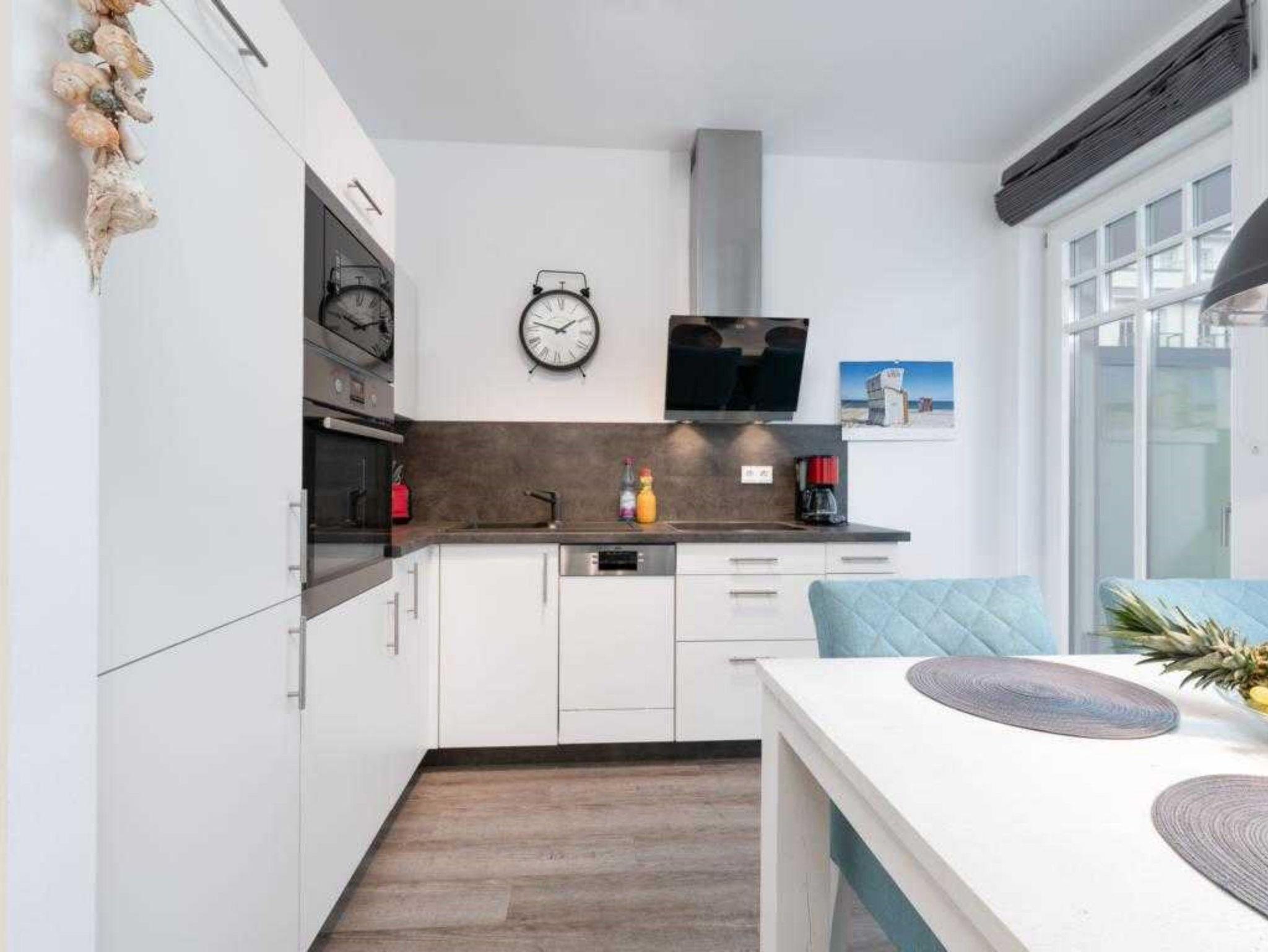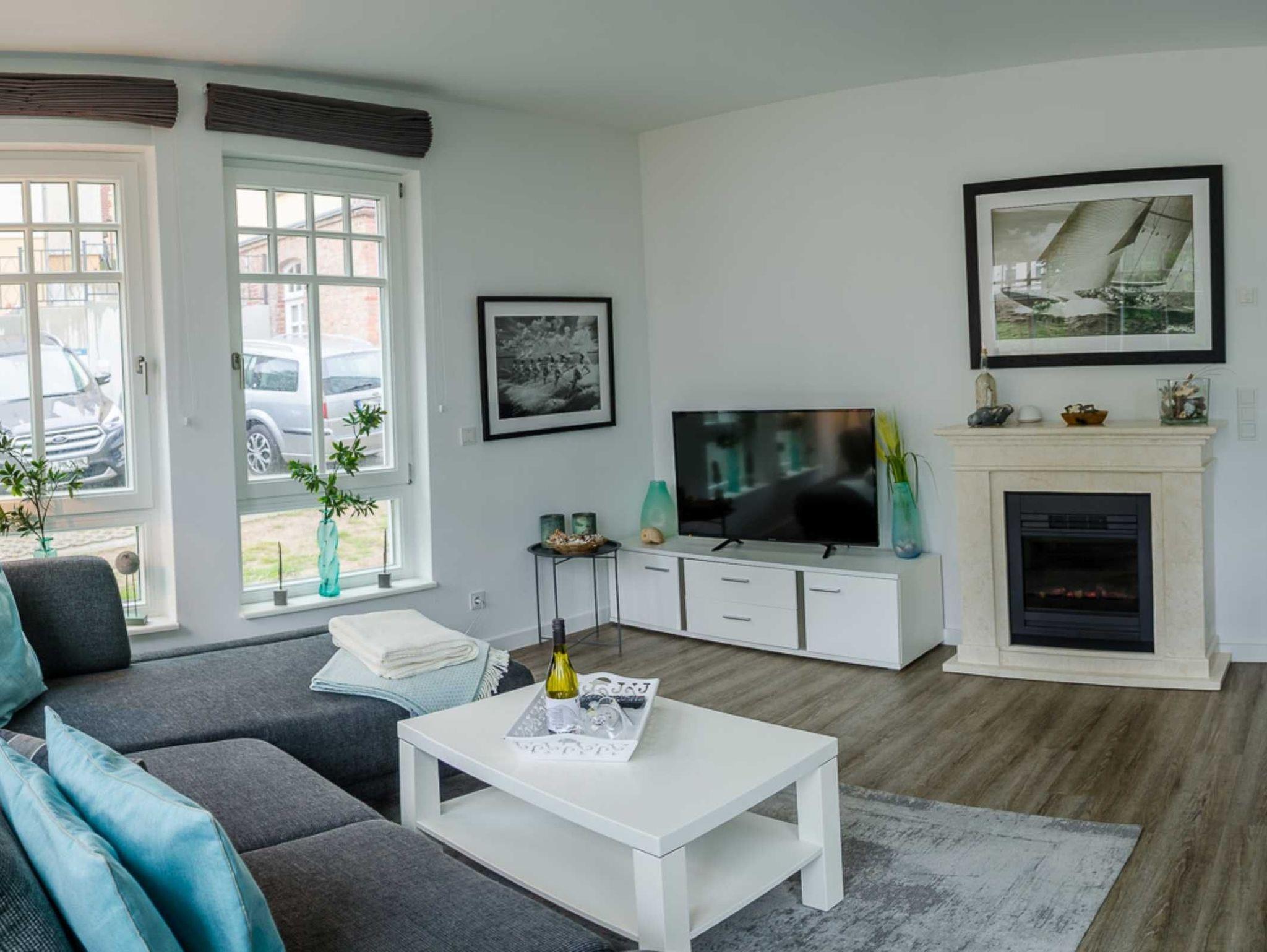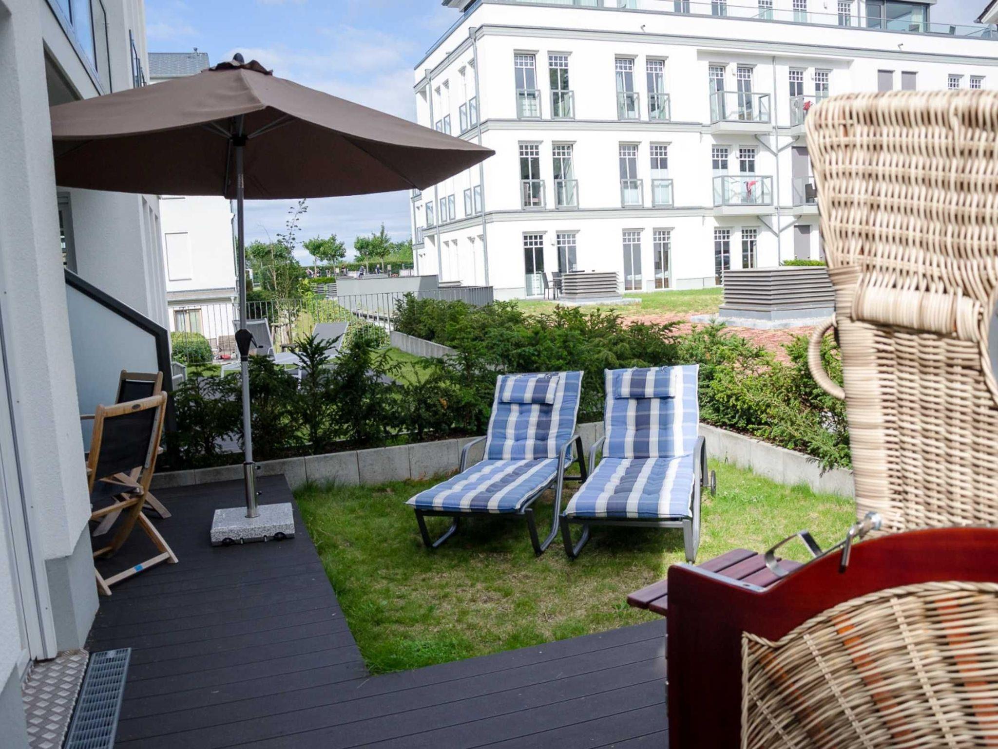 Die moderne 3-Raum-Raumwohnung mit 68 qm bietet Platz für 4 Personen und ist Richtung Garten ausgerichet. Sie verfügt über einen hellen Wohn-Essbereich mit gemütliche große Couch, Flat-TV und Elektrokamin sowie offener, voll ausgestatteter Küche. Die beiden modern eingerichteten Schlafzimmer sind mit Doppelbetten und Flat-TV ausgestattet. Das geräumige Bad verfügt über Dusche und WC sowie eine finnische Sauna. Ein separates Gäste-WC ist ebenfalls vorhanden. Die komplette Wohnung ist mit Fußbodenheizung ausgestattet.