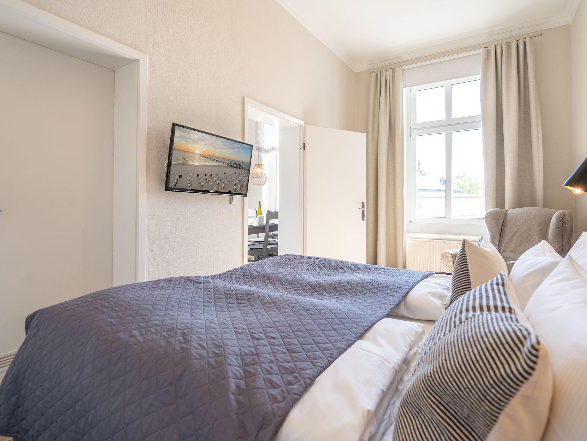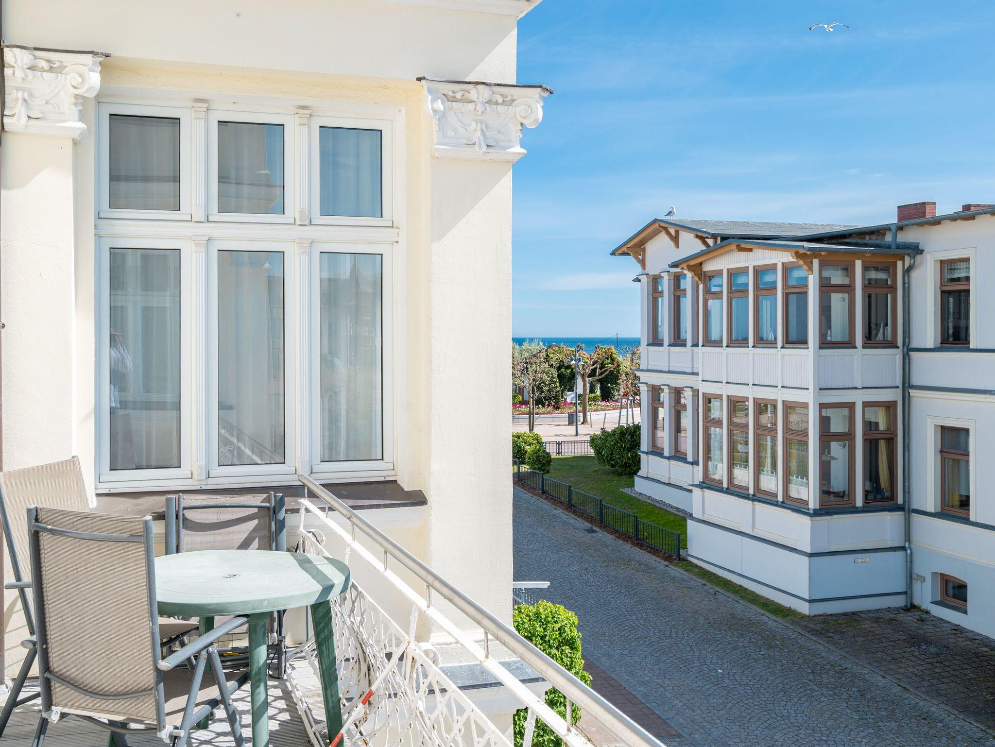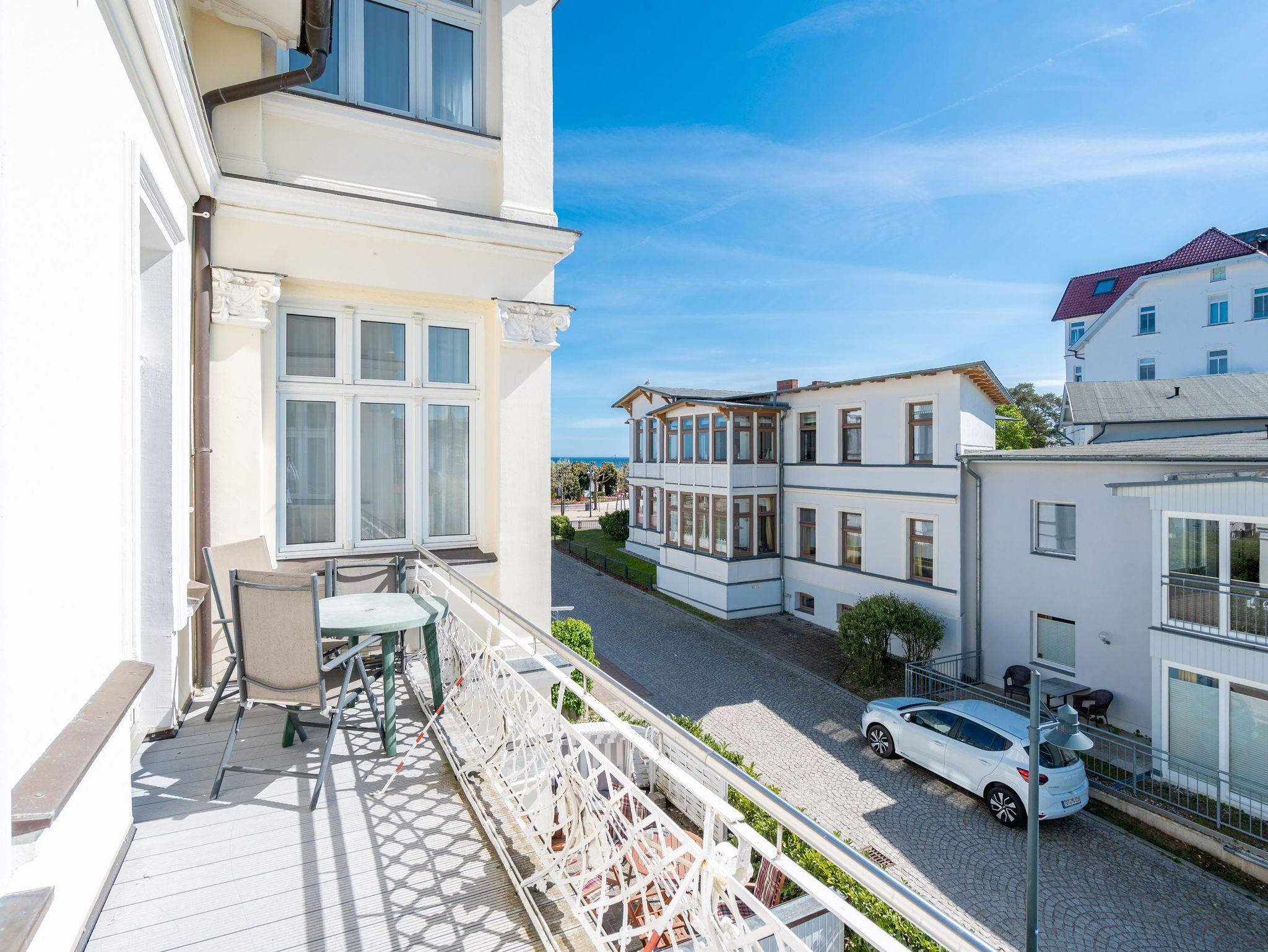 Eintreten und Wohlfühlen! Im 1. Obergeschoss der Villa Albertine befindet sich diese schön gestaltete 2-Raum-Ferienwohnung (35 qm) für 2 Personen und ein Kind ab 5 Jahre. Helle Räume und Farben und die modernen Möbel sorgen gleich für Urlaubslaune. Der gemütliche Wohnbereich mit Sofa (Aufbettung für die 3. Person) und Flat-TV lädt zum Entspannen ein. Durch die moderne Küche mit Essplatz gelangt man in das Schlafzimmer mit Boxspringdoppelbett (1,60m x 2,00m) [&] Flat-TV und das sich daran anschließende Duschbad. Der große Ostbalkon ist mit Sitzmöbeln ausgestattet und bietet teilweise Blick auf die Ostsee. Aufgrund der historischen, niedrigen Brüstungshöhe des Balkons ist das Appartement nicht für Kleinkinder unter 5 Jahren geeignet. Ein Pkw-Stellplatz Nr. 7 befindet sich auf dem Grundstück.