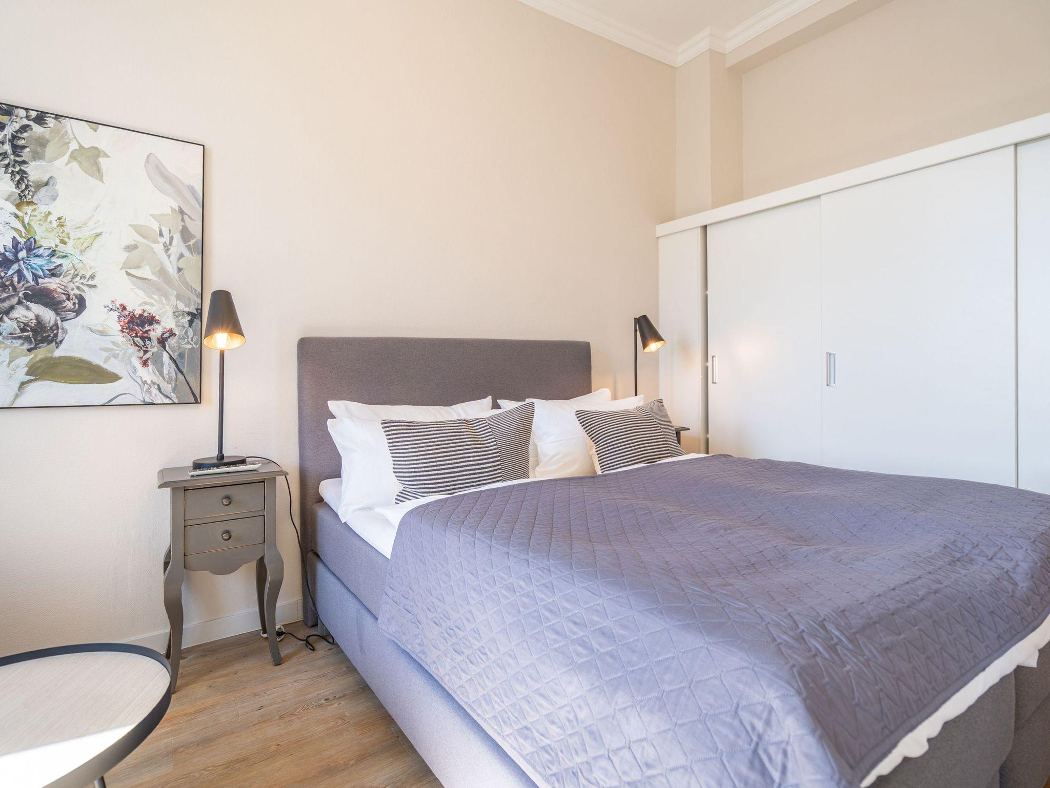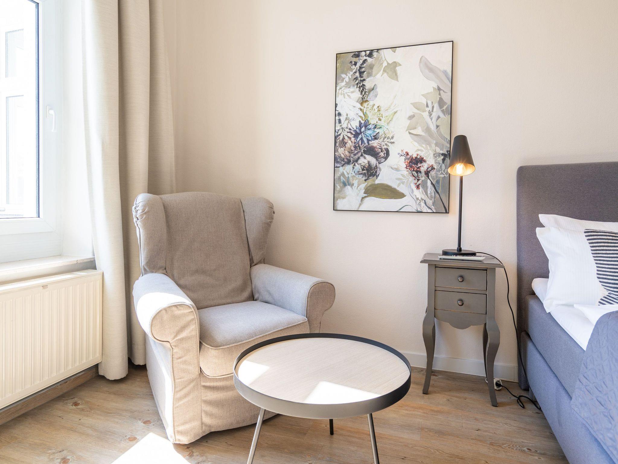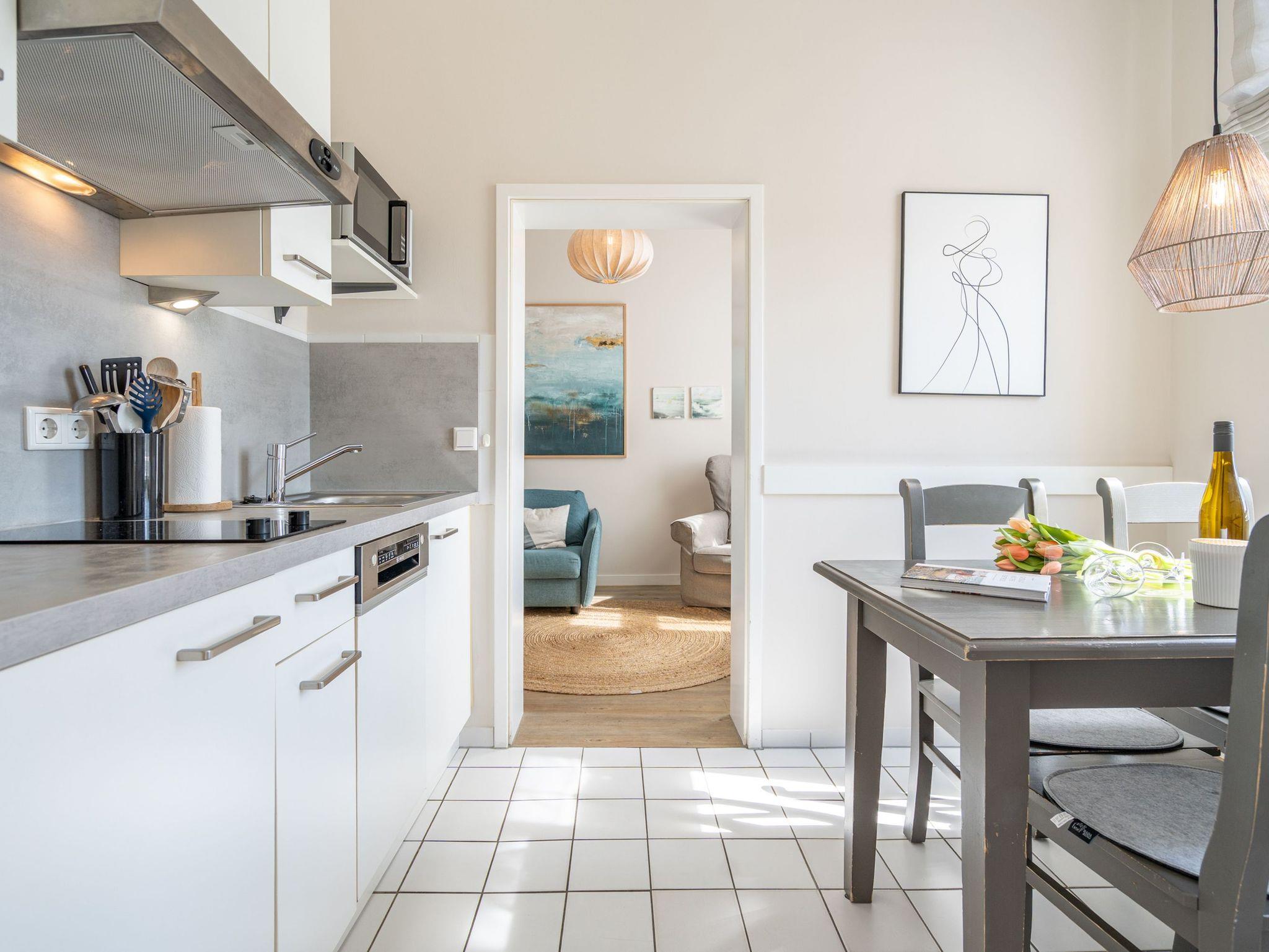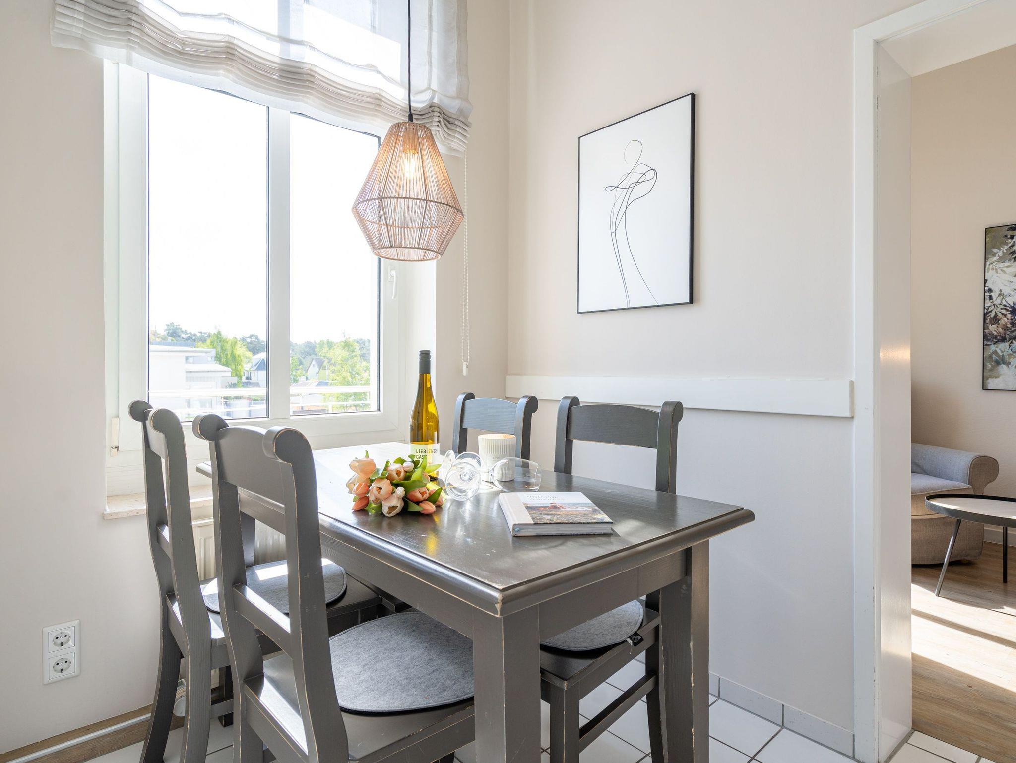 Eintreten und Wohlfühlen! Im 1. Obergeschoss der Villa Albertine befindet sich diese schön gestaltete 2-Raum-Ferienwohnung (35 qm) für 2 Personen und ein Kind ab 5 Jahre. Helle Räume und Farben und die modernen Möbel sorgen gleich für Urlaubslaune. Der gemütliche Wohnbereich mit Sofa (Aufbettung für die 3. Person) und Flat-TV lädt zum Entspannen ein. Durch die moderne Küche mit Essplatz gelangt man in das Schlafzimmer mit Boxspringdoppelbett (1,60m x 2,00m) [&] Flat-TV und das sich daran anschließende Duschbad. Der große Ostbalkon ist mit Sitzmöbeln ausgestattet und bietet teilweise Blick auf die Ostsee. Aufgrund der historischen, niedrigen Brüstungshöhe des Balkons ist das Appartement nicht für Kleinkinder unter 5 Jahren geeignet. Ein Pkw-Stellplatz Nr. 7 befindet sich auf dem Grundstück.