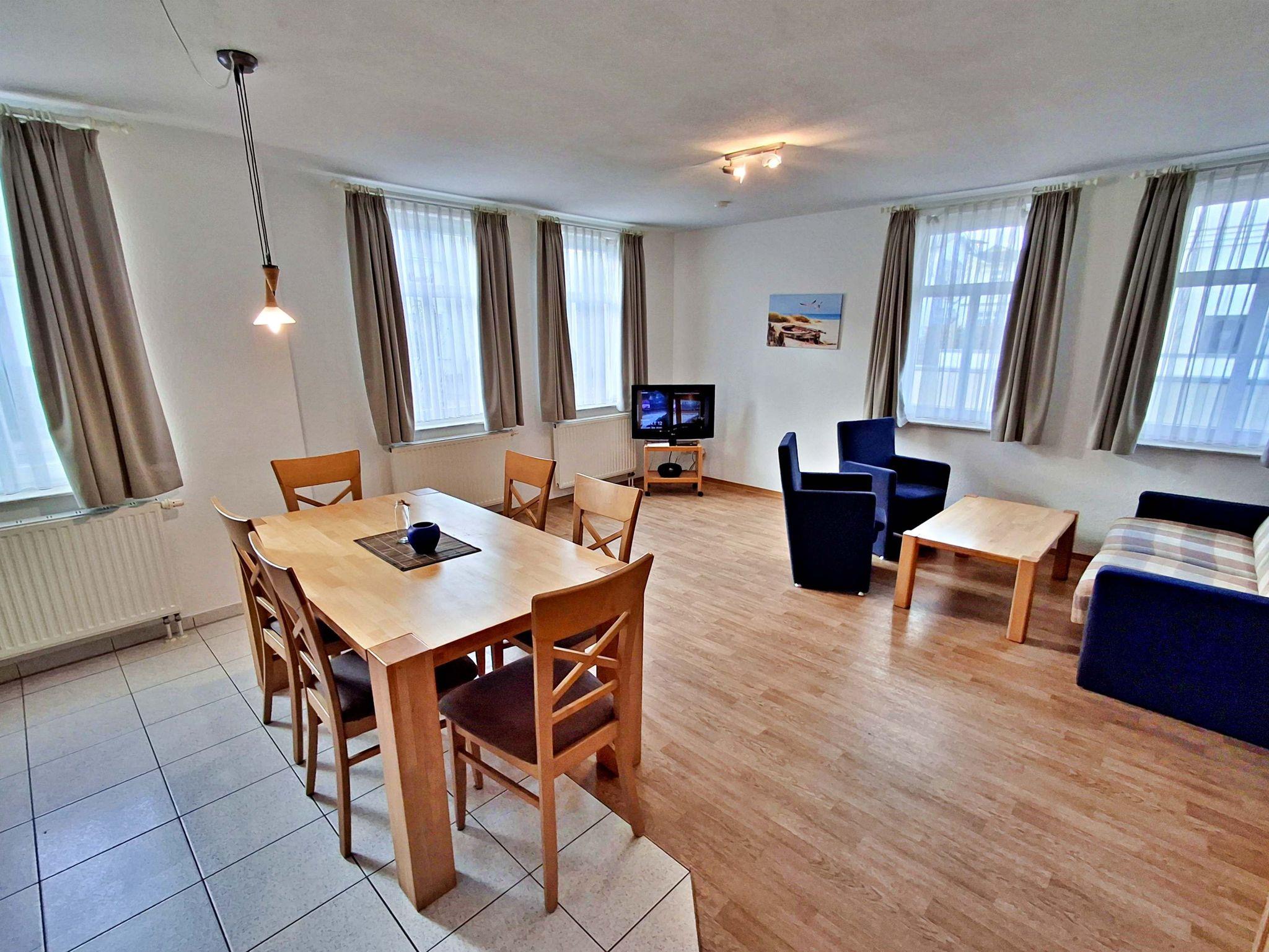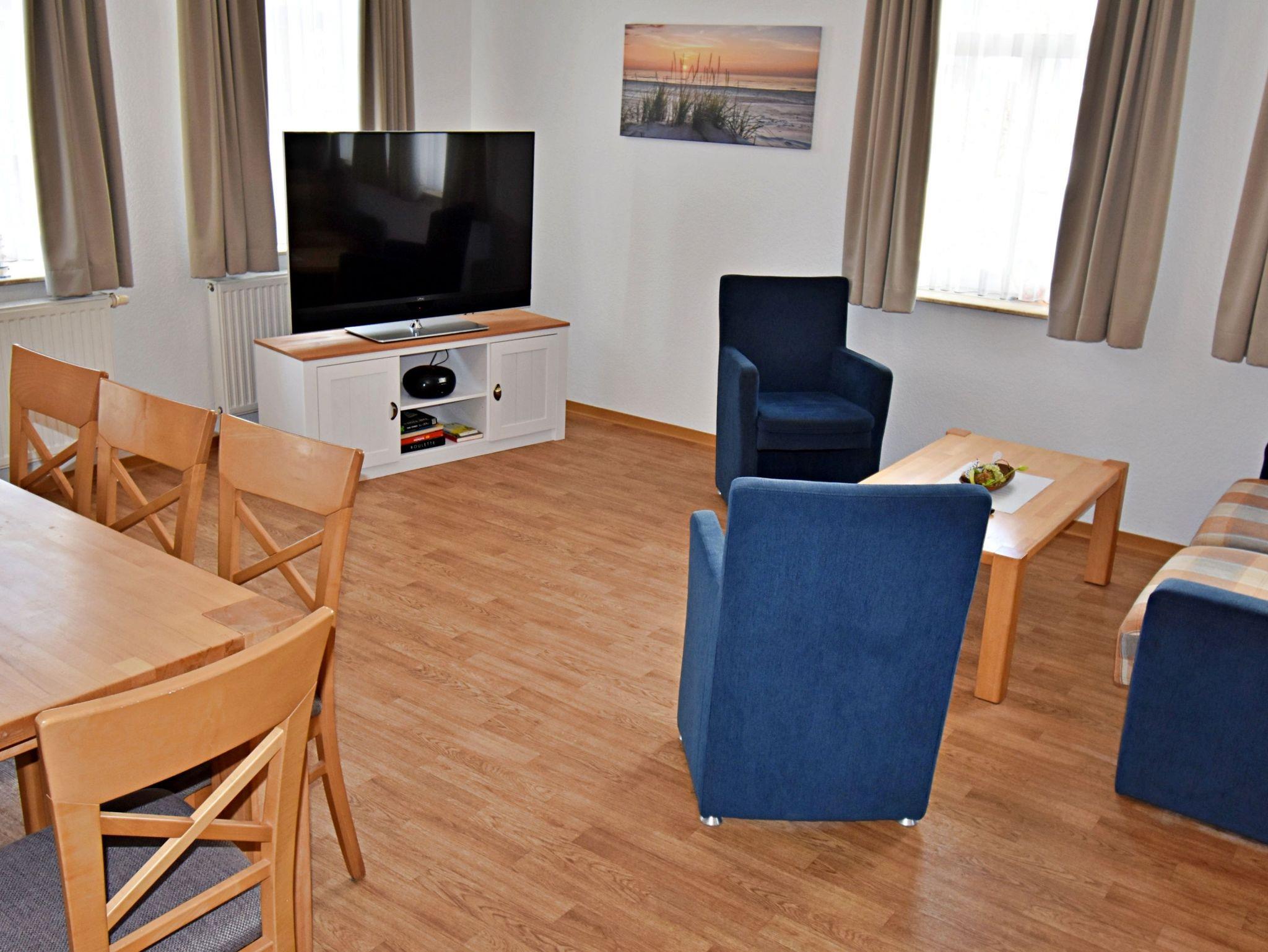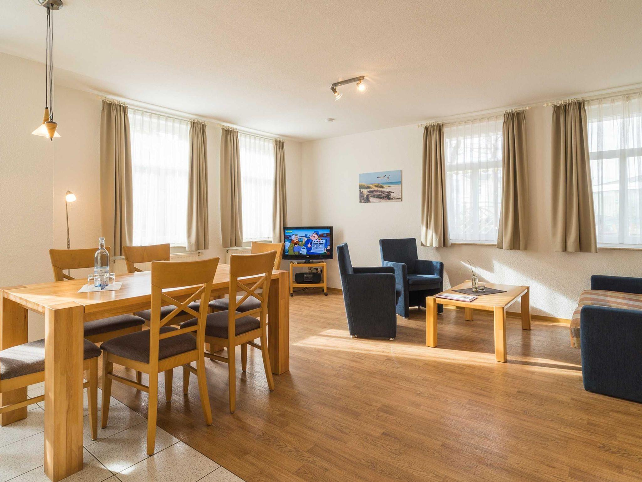 Die freundliche 3-Zimmer-Wohnung Koserow für max. 5 Erwachsene und 1 Kleinkind bis 3 Jahre befindet sich im Erdgeschoss im Haus am Kurpark - nur wenige Schritte von der Promenade und dem Strand entfernt. Im Wohnbereich befinden sich neben der gemütlichen Couch (Aufbettungsmöglichkeit für 2 weitere Personen) auch zwei Sessel sowie ein Esstisch mit 4 Stühlen, der genügend Platz für 6 Personen bietet. Die moderne Küchenzeile mit Ceranherd, Backofen, Geschirrspüler, Mikrowelle, Kaffeemaschine, Wasserkocher und Toaster lässt keine Wünsche offen. Für die Unterhaltung sorgen ein Flachbild-TV, Radio-CD-Player und kostenfreies W-LAN. Das 1. Schlafzimmer verfügt über ein Doppelbett und das zweite Schlafzimmer über 2 Einzelbetten. Das Badezimmer hat Badewanne/WC.