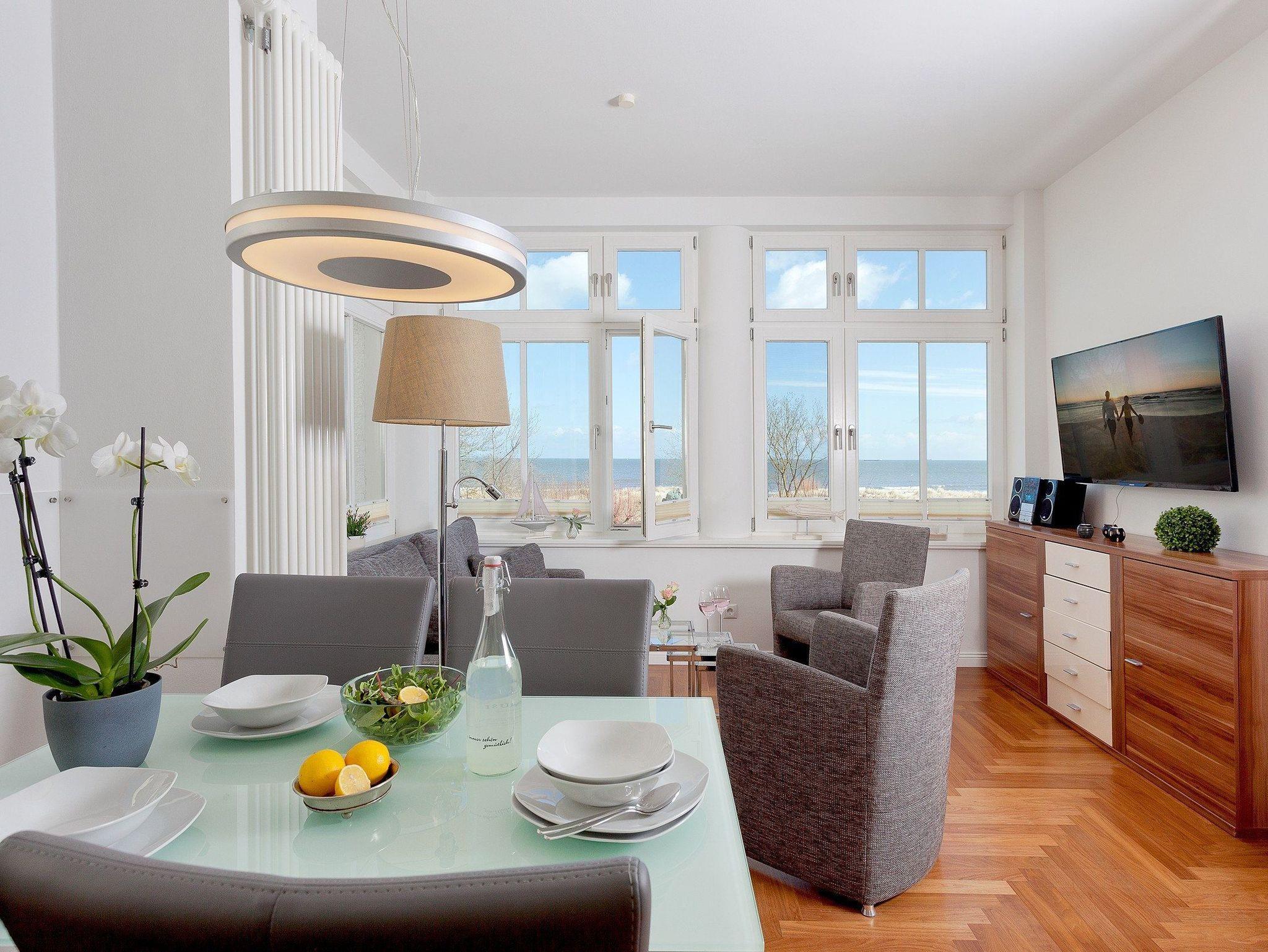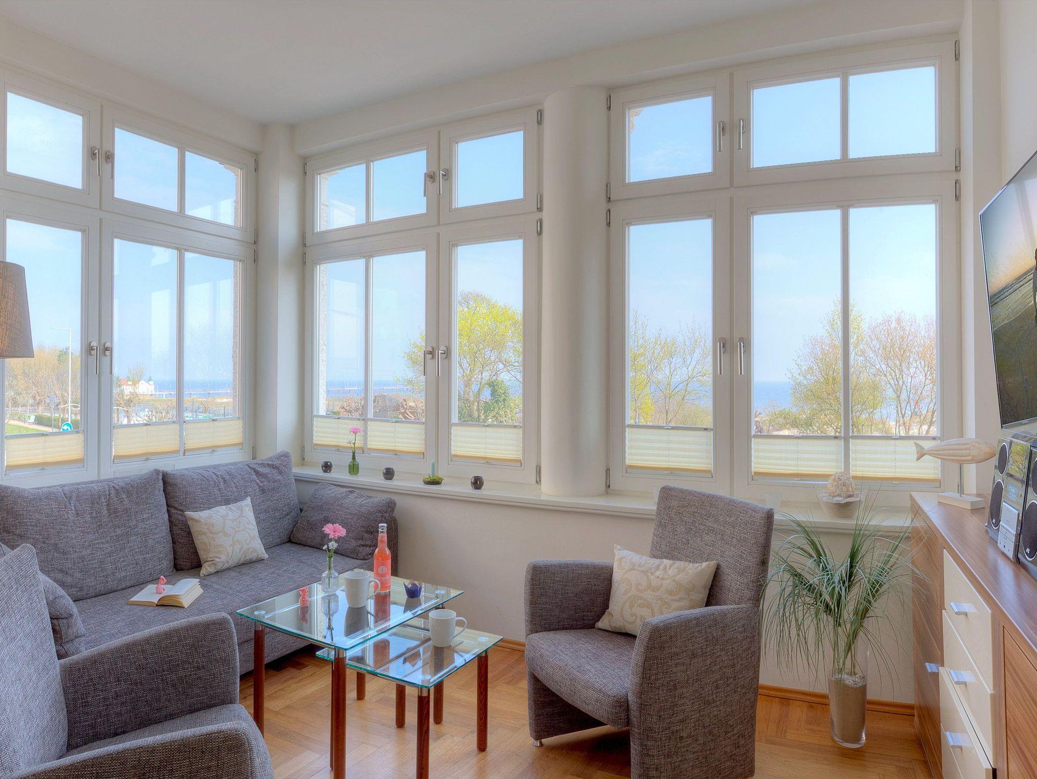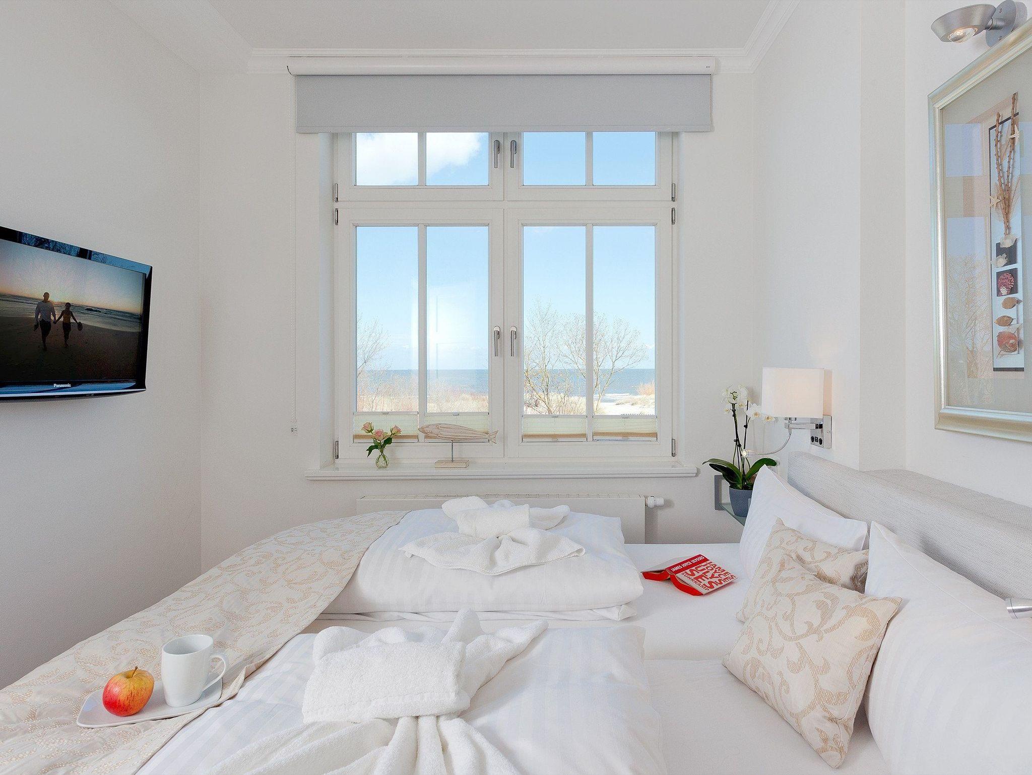 Die Polstersitzecke lädt zum Entspannen ein. Außerdem steht ein Flachbildfernseher mit integriertem Radio für Sie bereit. Und nicht nur das! Vom Sofa aus haben Sie eine fantastische Aussicht auf das Meer, die zum Träumen einlädt. Für die Nachtruhe steht im Schlafzimmer ein bequemes Boxspringbett (180 x 200cm / zwei getrennte Matratzen) mit Flat TV bereit. Auch von hier können Sie den Blick über das glitzernde Meer gleiten lassen. In dem geräumigen Schrank bringen Sie problemlos Ihre Habseligkeiten unter. Ein weiteres Schlafzimmer ist ebenfalls mit einem komfortablen Doppelbett und einem maßangefertigen Kleiderschrank eines usedomer Tischlers ausgestattet. In beiden Schlafräumen sind Plissees angebracht, so dass Sie die Räume bei Bedarf ganz einfach abdunkeln können.