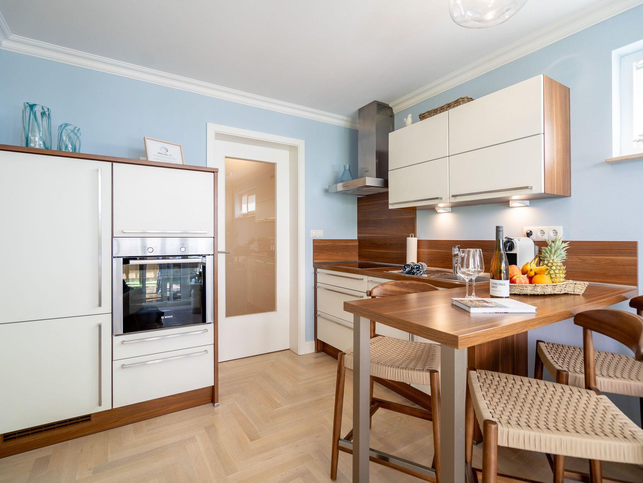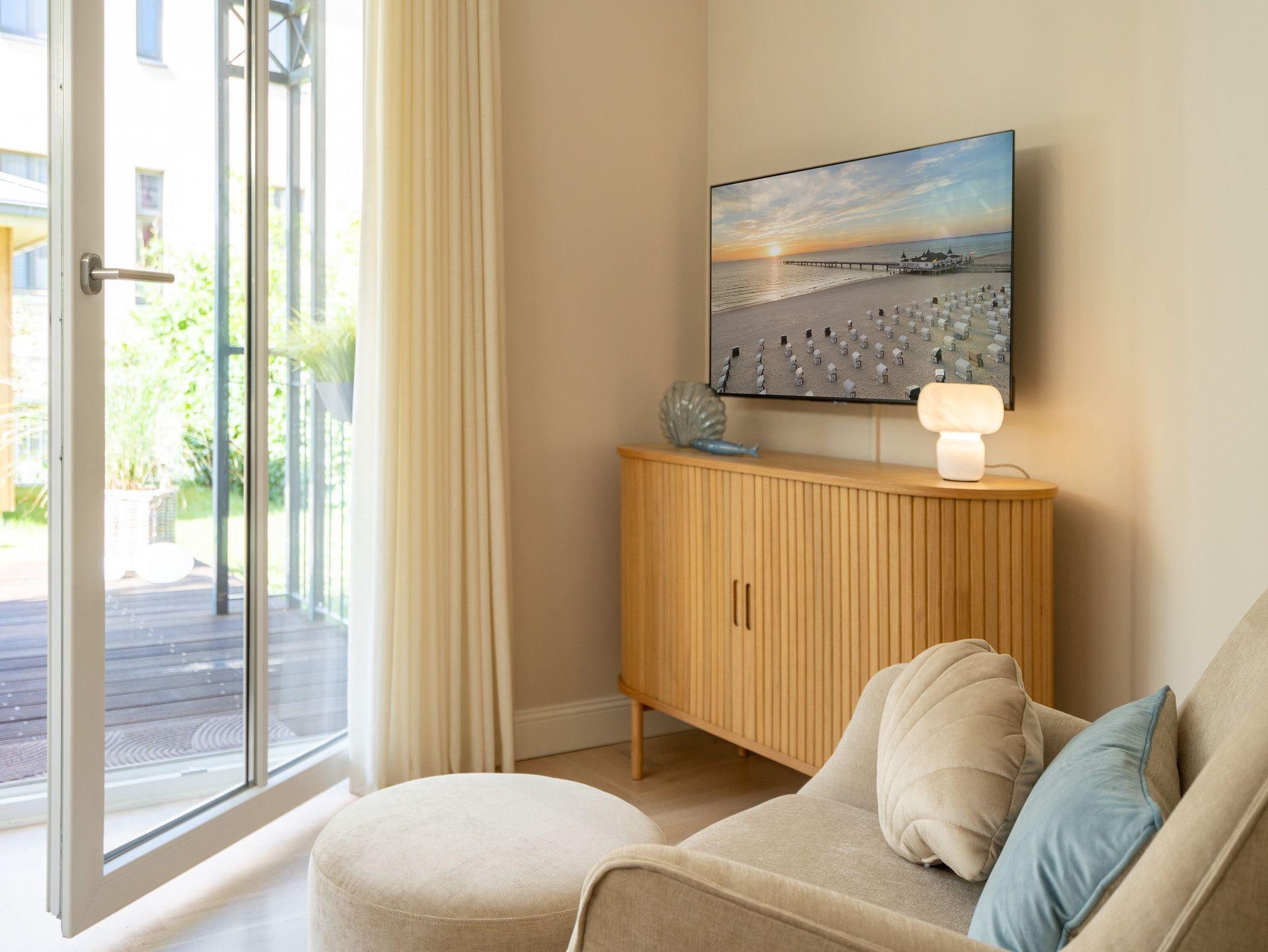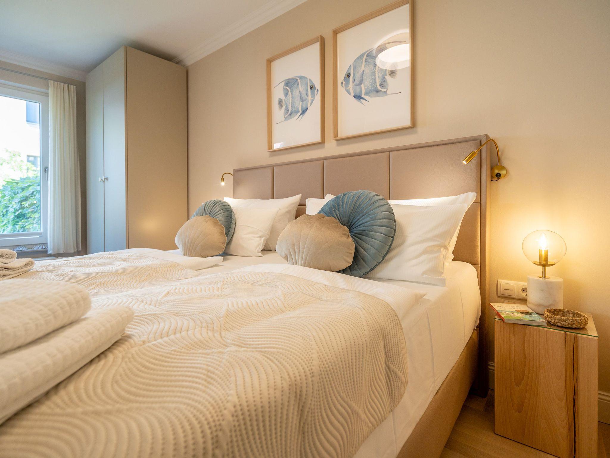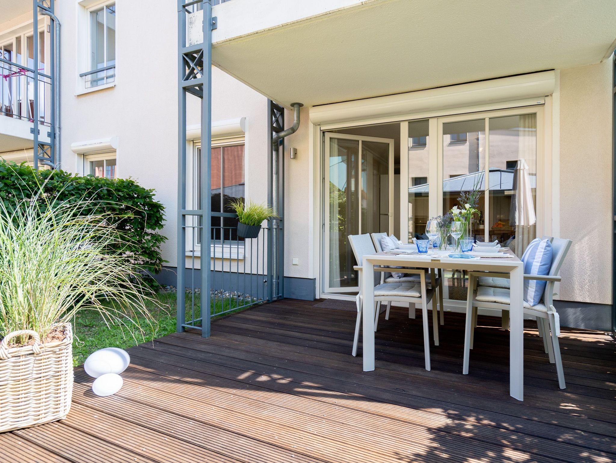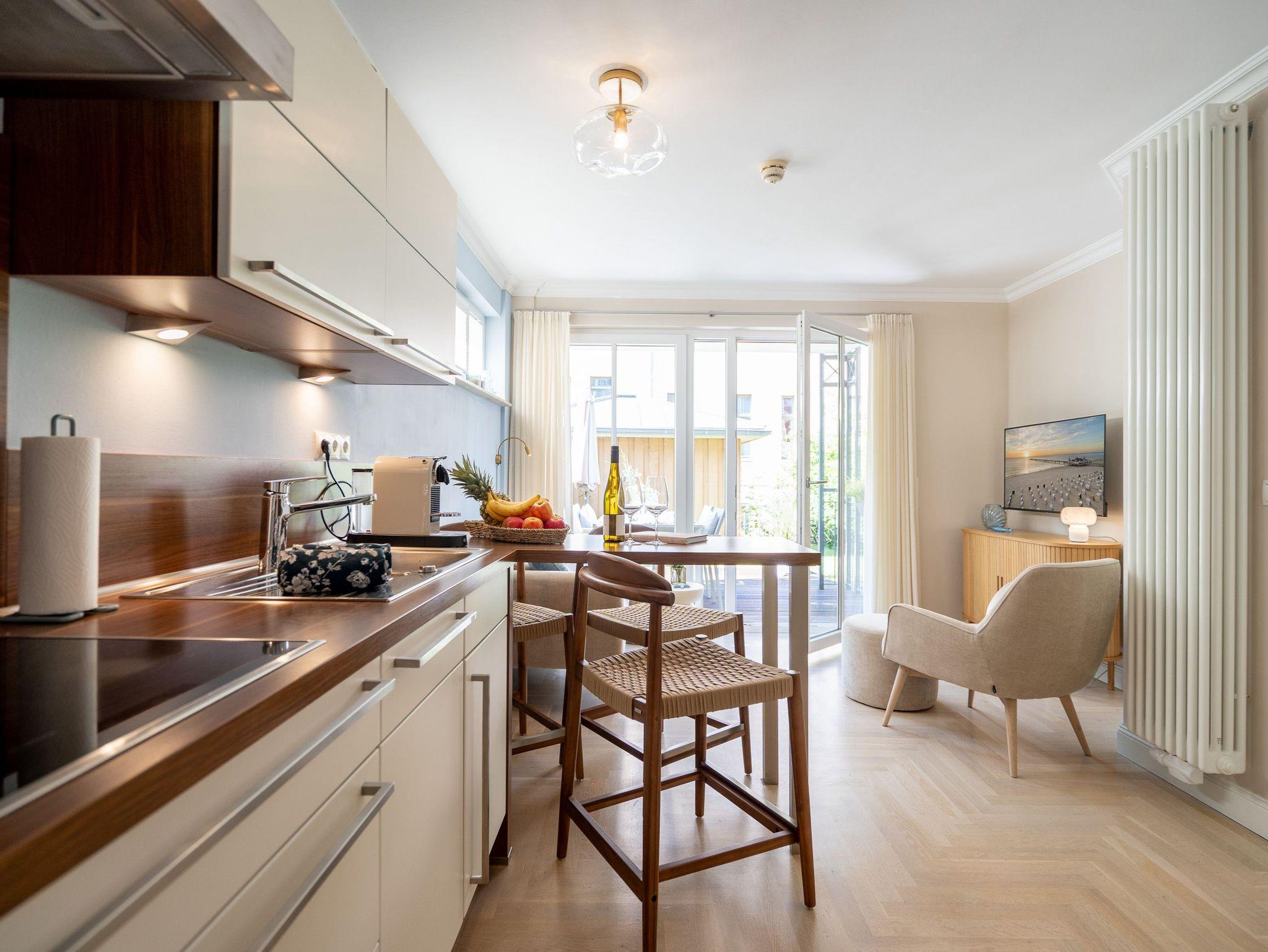 Klein aber fein! Die liebevoll eingerichtete 2-Raum-Ferienwohnung befindet sich im Erdgeschoss und ist 40 qm groß. Detailversessen wurde an alles gedacht, ein Wohnbereich mit Sitzgruppe und Flat-TV lädt zum Verweilen ein. Ergänzt wird es durch eine komplett ausgestattete Küchenzeile mit angrenzendem Essplatz. Ein Schlafzimmer mit Doppelbett (1,80m x 2m) und TV und elektrischen Jalousien sorgt für eine angenehme Nachtruhe. Für Ihren Komfort sind die Betten bei der Anreise bezogen und Handtücher liegen bereit (Erstausstattung). Sonnige Stunden verspricht die nach Süden ausgerichtete Terrasse mit Möblierung. Ein weiteres Highlight ist das exklusive Badezimmer mit integrierter Fußbodenheizung und Echtglas-Dusche. Perfekt für einen Urlaub zu zweit. Für Ihren PKW ist der Stellplatz Nr. 4 in der Tiefgarage reserviert.