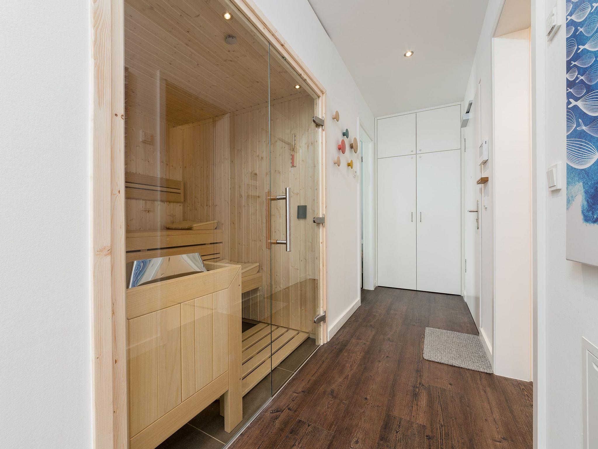 • Eine geräumige Panoramasauna für entspannende Momente, besonders nach einem langen Spaziergang am Strand.
