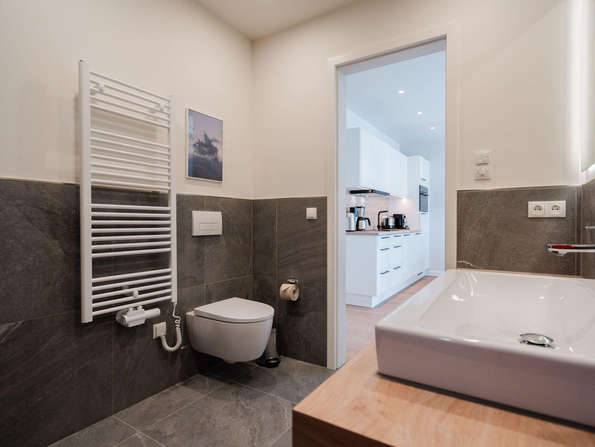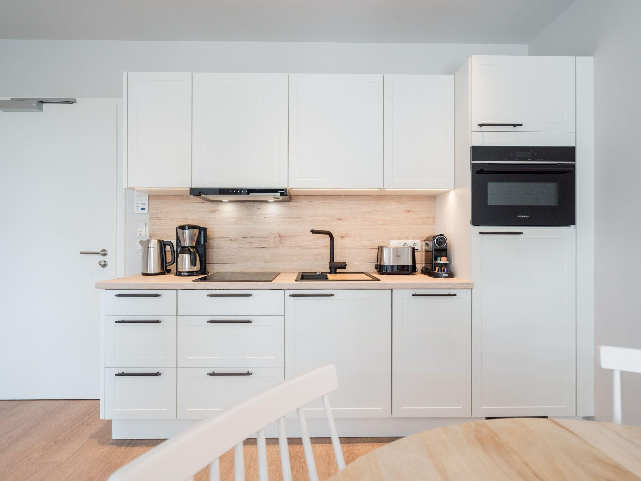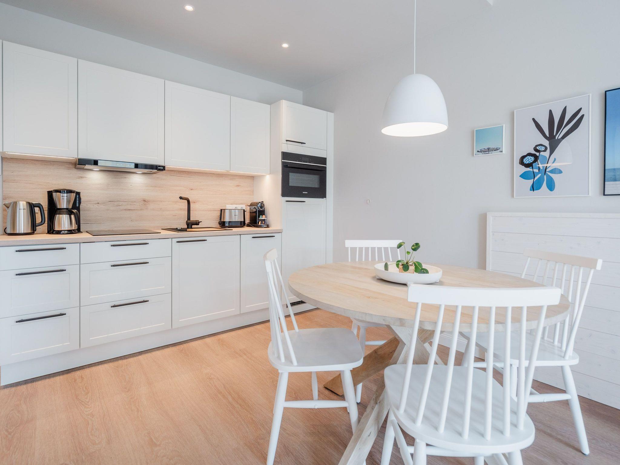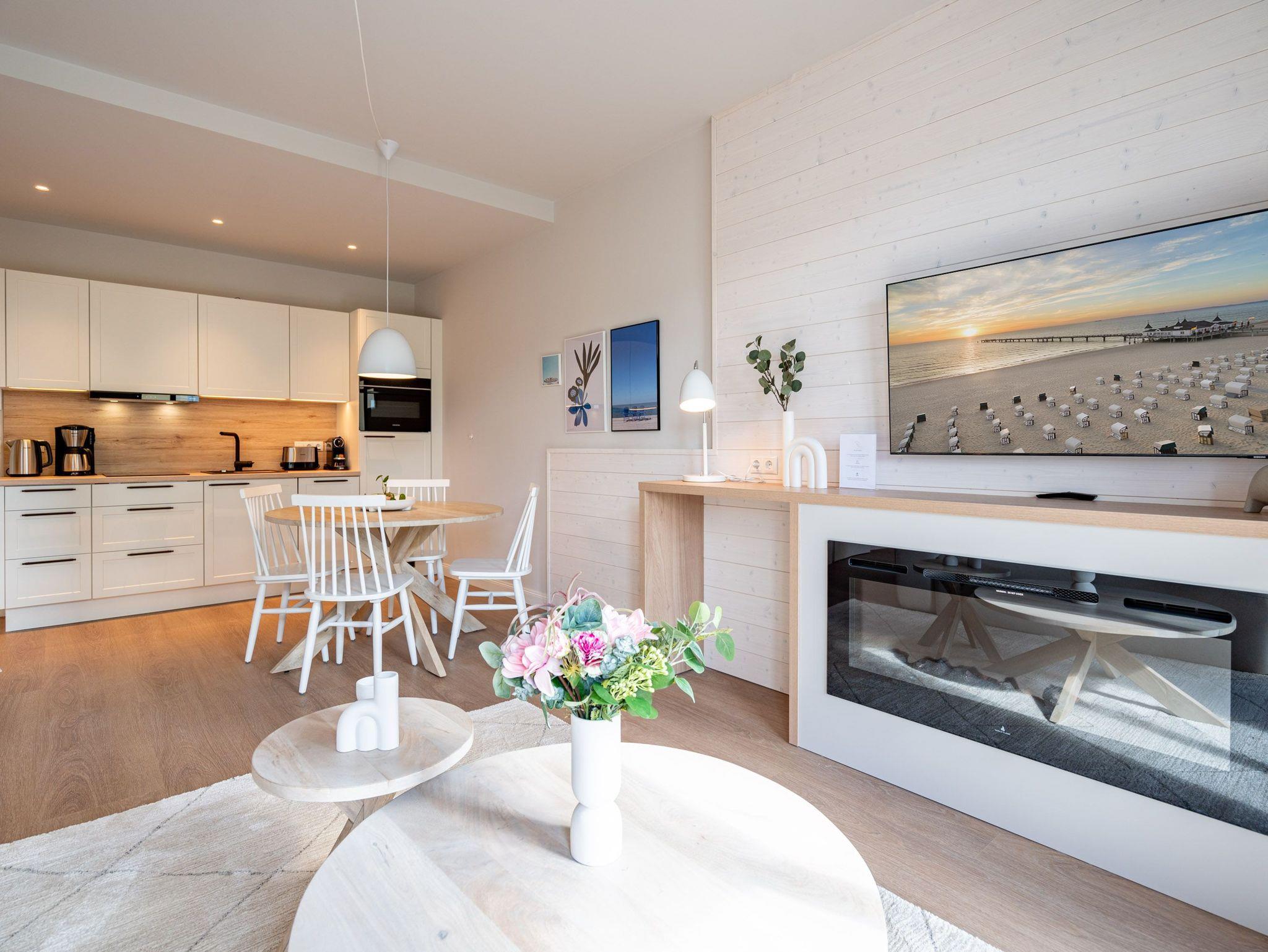 Schon beim Eintreten sagt die Seele: Hier will ich verweilen und zur Ruhe kommen. In diesem modernen und wunderschön eingerichteten 3-Raum-Appartement in der 1. Etage empfängt Sie auf 50 Quadratmetern ein echtes Wohlfühlreich für 2 Personen. Ein geräumiges Wohnzimmer, ein Schlafzimmer zum Träumen und zwei Balkone und alles ist lichtdurchflutet und modern eingerichtet. Die hellen Sandtöne des Interieurs erinnern an den Ostseestrand, der nur knapp 80 Meter von dieser Wohnung entfernt ist und auf den Sie von den beiden Balkonen aus, einen seitlichen Blick werfen können. Der offene Wohn- und Essbereich ist mit einer Küchenzeile mit hochwertigen Siemens-Elektrogeräten voll ausgestattet. Auf dem Sofa kann man es sich vor dem Elektro-Kamin (ohne Wärmeerzeugung) so richtig gemütlich machen. Für Unterhaltung sorgt ein 50-Zoll-Flachbildfernseher. Wer auch im Urlaub produktiv sein möchte oder den lieben Zuhausegebliebenen noch ganz klassisch eine Ansichtskarte schreiben möchte, kann dies an der Working Station tun. Der Essplatz lädt zu gemeinsamen Mahlzeiten ein und der Zugang zum ersten Balkon mit Ausrichtung Süd-Ost ermöglicht es Ihnen, die Sonne zu genießen und die Ostseeluft tief einzuatmen. Das Schlafzimmer verwöhnt Sie mit einem komfortablen Boxspringdoppelbett (1,80m x 2,00m), einem Kleiderschrank, einer Kommode und einem zusätzlichen 43-Zoll-Flachbildfernseher. Von hier aus können Sie morgens gleich nach dem Aufwachen auf den zweiten Balkon (ebenfalls Süd-Ost ausgerichtet) hinaustreten und den Tag mit einem weiten Blick über das Meeresblau beginnen. Begrüßen Sie von hier aus die aufgehende Sonne. Das innenliegende Bad ist mit einer Dusche, einem WC, einem Waschtisch und einer Infrarotsauna ausgestattet. Schalten Sie bei einem kuscheligen Saunagang ihr Kopfkino einfach mal aus und genießen Sie die wohlige Wärme, die durch Sie hindurchströmt. Ihre ganz persönliche, kleine Wellnessoase. In der Tiefgarage steht Ihnen ein PKW-Stellplatz zur Verfügung. Sie brauchen also nur noch ankommen und bei Meeresrauschen relaxen.