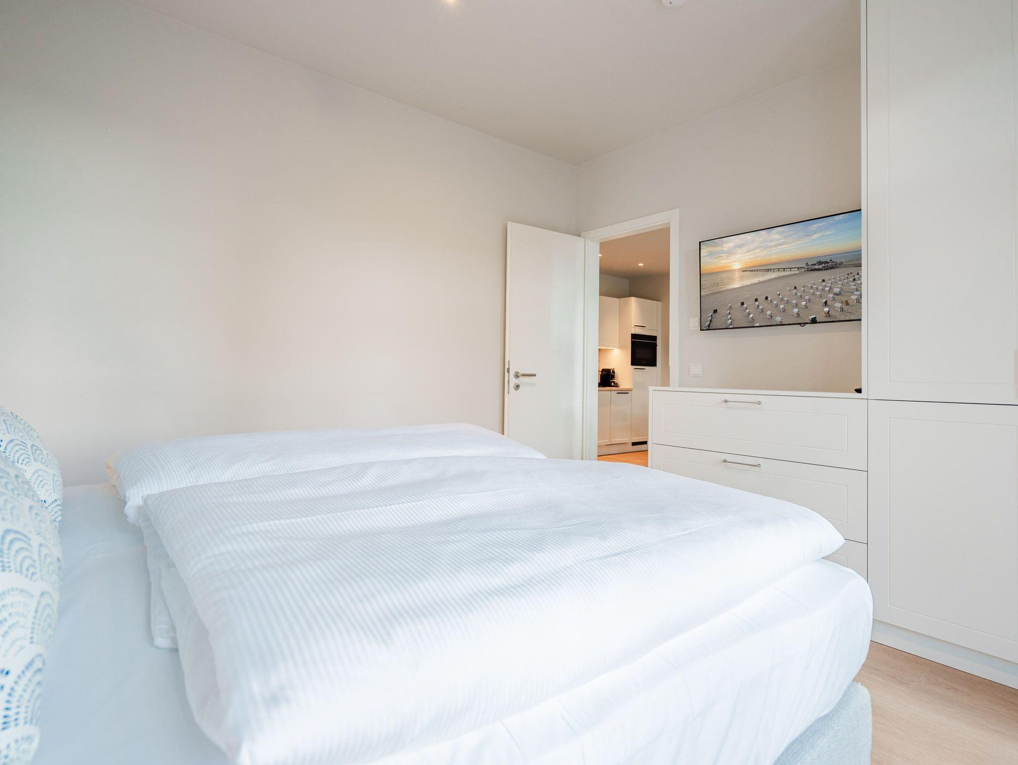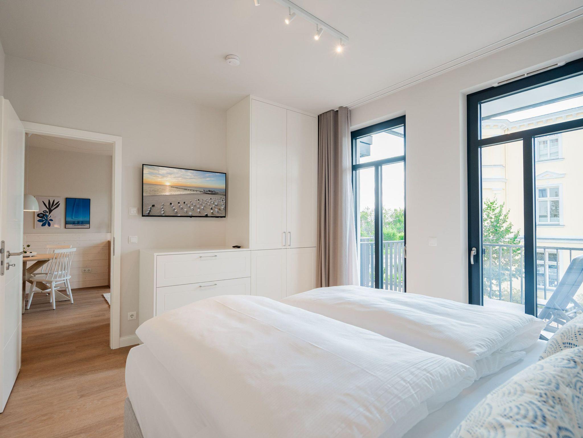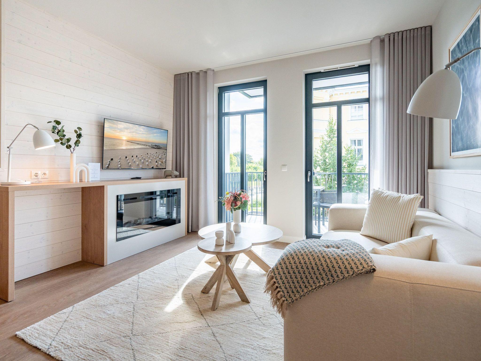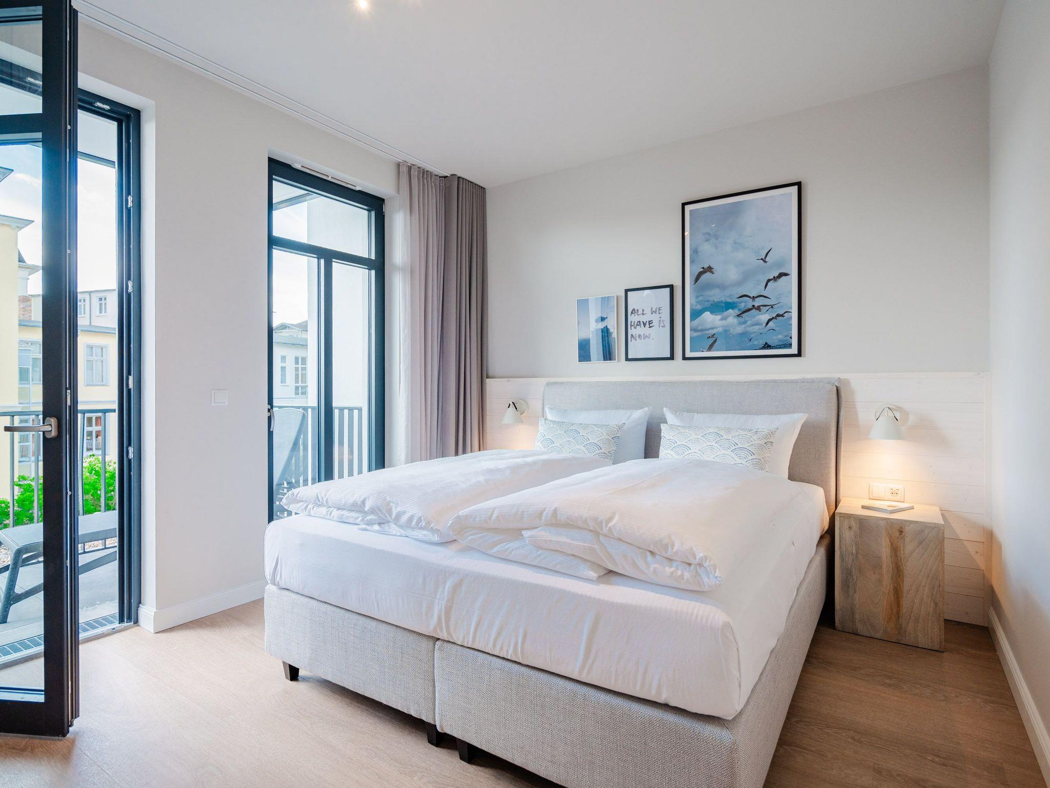 Schon beim Eintreten sagt die Seele: Hier will ich verweilen und zur Ruhe kommen. In diesem modernen und wunderschön eingerichteten 3-Raum-Appartement in der 1. Etage empfängt Sie auf 50 Quadratmetern ein echtes Wohlfühlreich für 2 Personen. Ein geräumiges Wohnzimmer, ein Schlafzimmer zum Träumen und zwei Balkone ? und alles ist lichtdurchflutet und modern eingerichtet. Die hellen Sandtöne des Interieurs erinnern an den Ostseestrand, der nur knapp 80 Meter von dieser Wohnung entfernt ist und auf den Sie von den beiden Balkonen aus, einen seitlichen Blick werfen können. Der offene Wohn- und Essbereich ist mit einer Küchenzeile mit hochwertigen Siemens-Elektrogeräten voll ausgestattet. Auf dem Sofa kann man es sich vor dem Elektro-Kamin (ohne Wärmeerzeugung) so richtig gemütlich machen. Für Unterhaltung sorgt ein 50-Zoll-Flachbildfernseher. Wer auch im Urlaub produktiv sein möchte oder den lieben Zuhausegebliebenen noch ganz klassisch eine Ansichtskarte schreiben möchte, kann dies an der Working Station tun. Der Essplatz lädt zu gemeinsamen Mahlzeiten ein und der Zugang zum ersten Balkon mit Ausrichtung Süd-Ost ermöglicht es Ihnen, die Sonne zu genießen und die Ostseeluft tief einzuatmen. Das Schlafzimmer verwöhnt Sie mit einem komfortablen Boxspringdoppelbett (1,80m x 2,00m), einem Kleiderschrank, einer Kommode und einem zusätzlichen 43-Zoll-Flachbildfernseher. Von hier aus können Sie morgens gleich nach dem Aufwachen auf den zweiten Balkon (ebenfalls Süd-Ost ausgerichtet) hinaustreten und den Tag mit einem weiten Blick über das Meeresblau beginnen. Begrüßen Sie von hier aus die aufgehende Sonne. Das innenliegende Bad ist mit einer Dusche, einem WC, einem Waschtisch und einer Infrarotsauna ausgestattet. Schalten Sie bei einem kuscheligen Saunagang ihr Kopfkino einfach mal aus und genießen Sie die wohlige Wärme, die durch Sie hindurchströmt. Ihre ganz persönliche, kleine Wellnessoase. In der Tiefgarage steht Ihnen ein PKW-Stellplatz zur Verfügung. Sie brauchen also nur noch ankommen und bei Meeresrauschen relaxen.