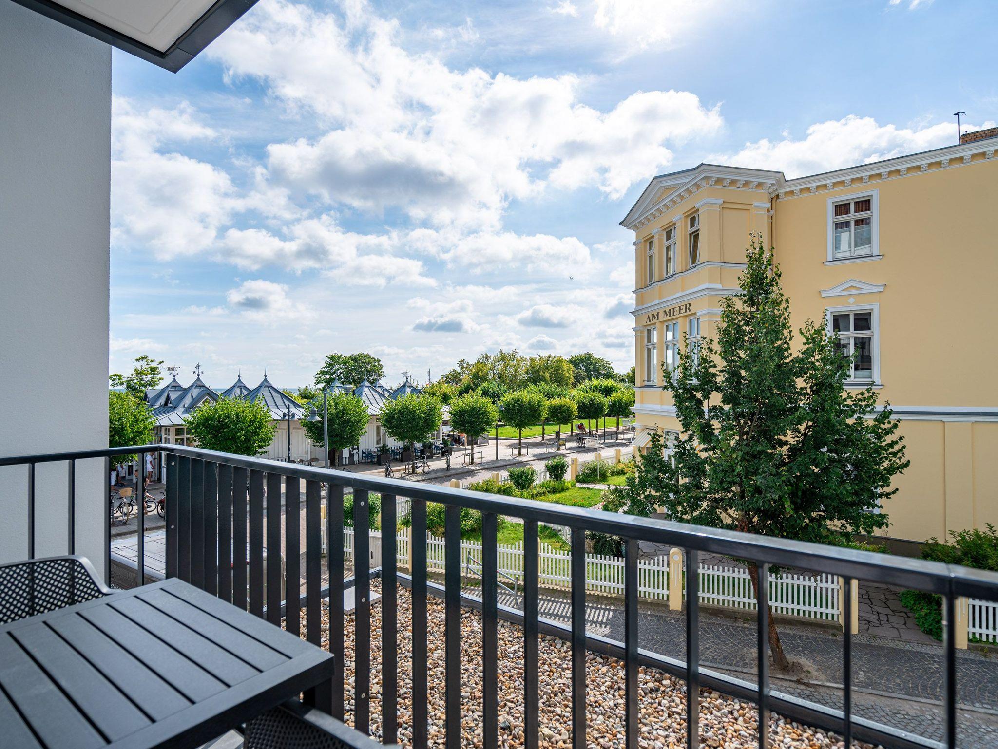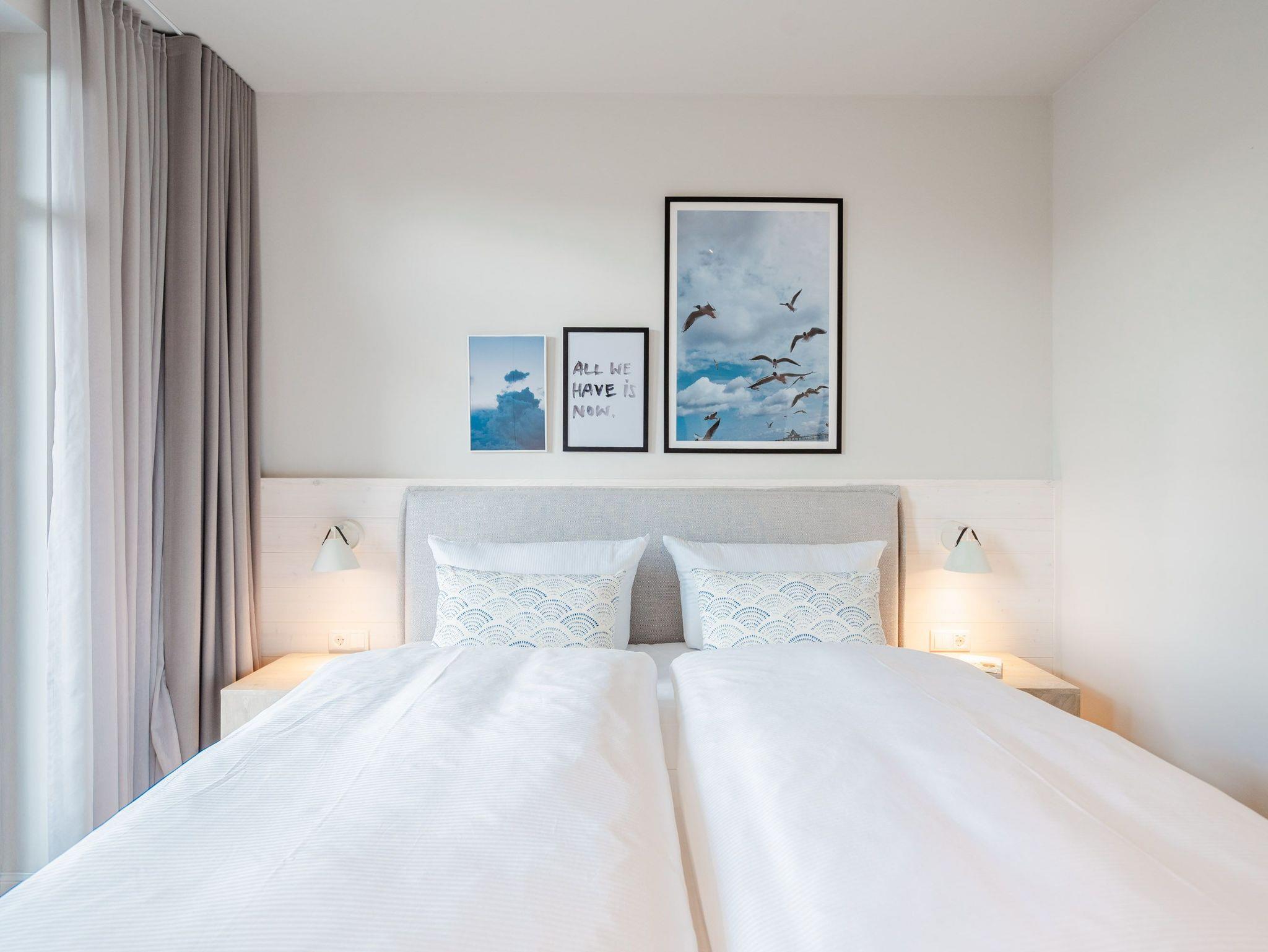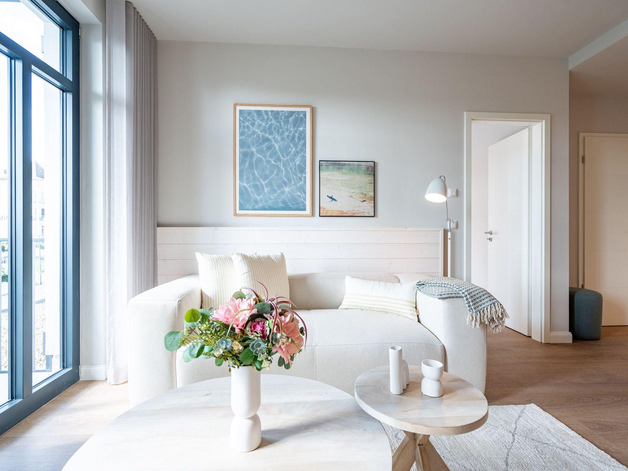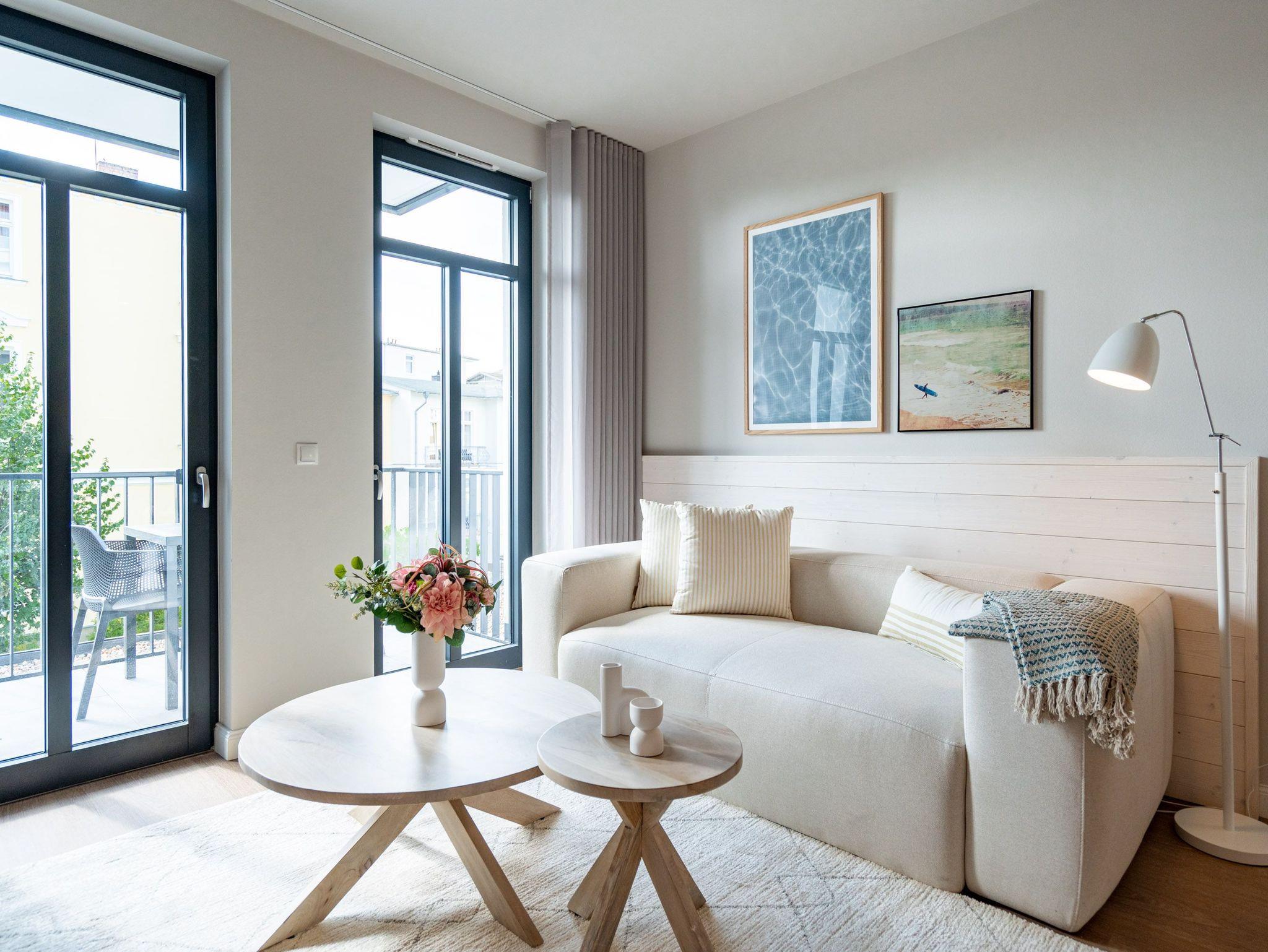 Schon beim Eintreten sagt die Seele: Hier will ich verweilen und zur Ruhe kommen. In diesem modernen und wunderschön eingerichteten 3-Raum-Appartement in der 1. Etage empfängt Sie auf 50 Quadratmetern ein echtes Wohlfühlreich für 2 Personen. Ein geräumiges Wohnzimmer, ein Schlafzimmer zum Träumen und zwei Balkone ? und alles ist lichtdurchflutet und modern eingerichtet. Die hellen Sandtöne des Interieurs erinnern an den Ostseestrand, der nur knapp 80 Meter von dieser Wohnung entfernt ist und auf den Sie von den beiden Balkonen aus, einen seitlichen Blick werfen können. Der offene Wohn- und Essbereich ist mit einer Küchenzeile mit hochwertigen Siemens-Elektrogeräten voll ausgestattet. Auf dem Sofa kann man es sich vor dem Elektro-Kamin (ohne Wärmeerzeugung) so richtig gemütlich machen. Für Unterhaltung sorgt ein 50-Zoll-Flachbildfernseher. Wer auch im Urlaub produktiv sein möchte oder den lieben Zuhausegebliebenen noch ganz klassisch eine Ansichtskarte schreiben möchte, kann dies an der Working Station tun. Der Essplatz lädt zu gemeinsamen Mahlzeiten ein und der Zugang zum ersten Balkon mit Ausrichtung Süd-Ost ermöglicht es Ihnen, die Sonne zu genießen und die Ostseeluft tief einzuatmen. Das Schlafzimmer verwöhnt Sie mit einem komfortablen Boxspringdoppelbett (1,80m x 2,00m), einem Kleiderschrank, einer Kommode und einem zusätzlichen 43-Zoll-Flachbildfernseher. Von hier aus können Sie morgens gleich nach dem Aufwachen auf den zweiten Balkon (ebenfalls Süd-Ost ausgerichtet) hinaustreten und den Tag mit einem weiten Blick über das Meeresblau beginnen. Begrüßen Sie von hier aus die aufgehende Sonne. Das innenliegende Bad ist mit einer Dusche, einem WC, einem Waschtisch und einer Infrarotsauna ausgestattet. Schalten Sie bei einem kuscheligen Saunagang ihr Kopfkino einfach mal aus und genießen Sie die wohlige Wärme, die durch Sie hindurchströmt. Ihre ganz persönliche, kleine Wellnessoase. In der Tiefgarage steht Ihnen ein PKW-Stellplatz zur Verfügung. Sie brauchen also nur noch ankommen und bei Meeresrauschen relaxen.