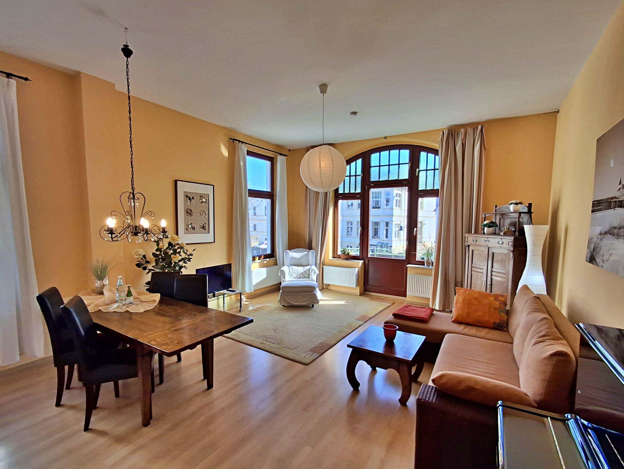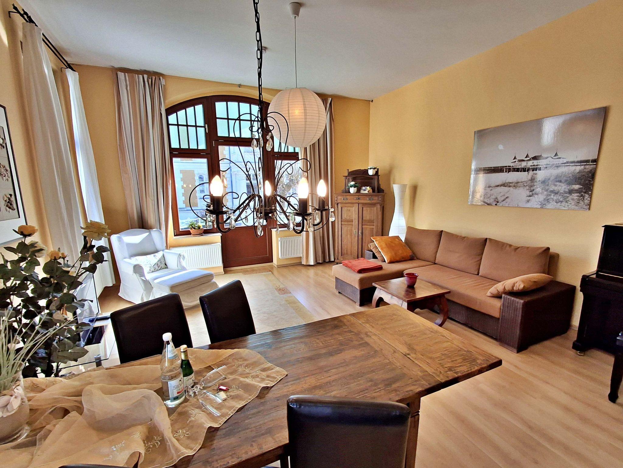 Auf 60 qm erwartet Sie eine stilvolle und charmante Unterkunft, die mit hochwertigen und geschmackvollen Möbelstücken ausgestattet ist und dem Villencharakter perfekt entspricht. Der kombinierte Wohn- und Essbereich lädt zum Entspannen ein und bietet Ihnen eine bequeme Couch, einen Sessel, einen Flachbild-TV sowie einen Esstisch mit vier Stühlen ? ideal für gesellige Abende. Die gut ausgestattete Küchenzeile verfügt über einen Herd, Backofen, Spülmaschine, Kühlschrank, Wasserkocher, Toaster und Kaffeemaschine, sodass Sie sich ganz nach Belieben selbst versorgen können. Im Schlafzimmer erwartet Sie ein gemütliches Doppelbett und ein geräumiger Kleiderschrank für Ihre persönlichen Dinge. Das Badezimmer ist mit einer Dusche/WC und einer Badewanne ausgestattet und rundet die komfortable Ausstattung ab.