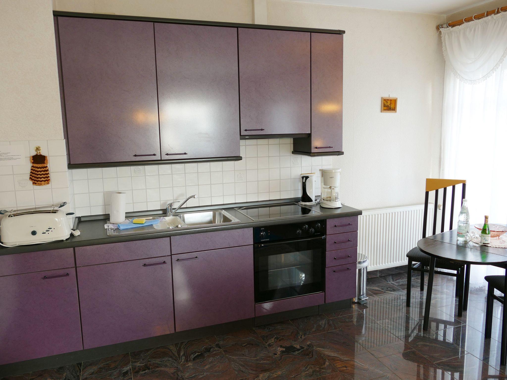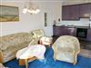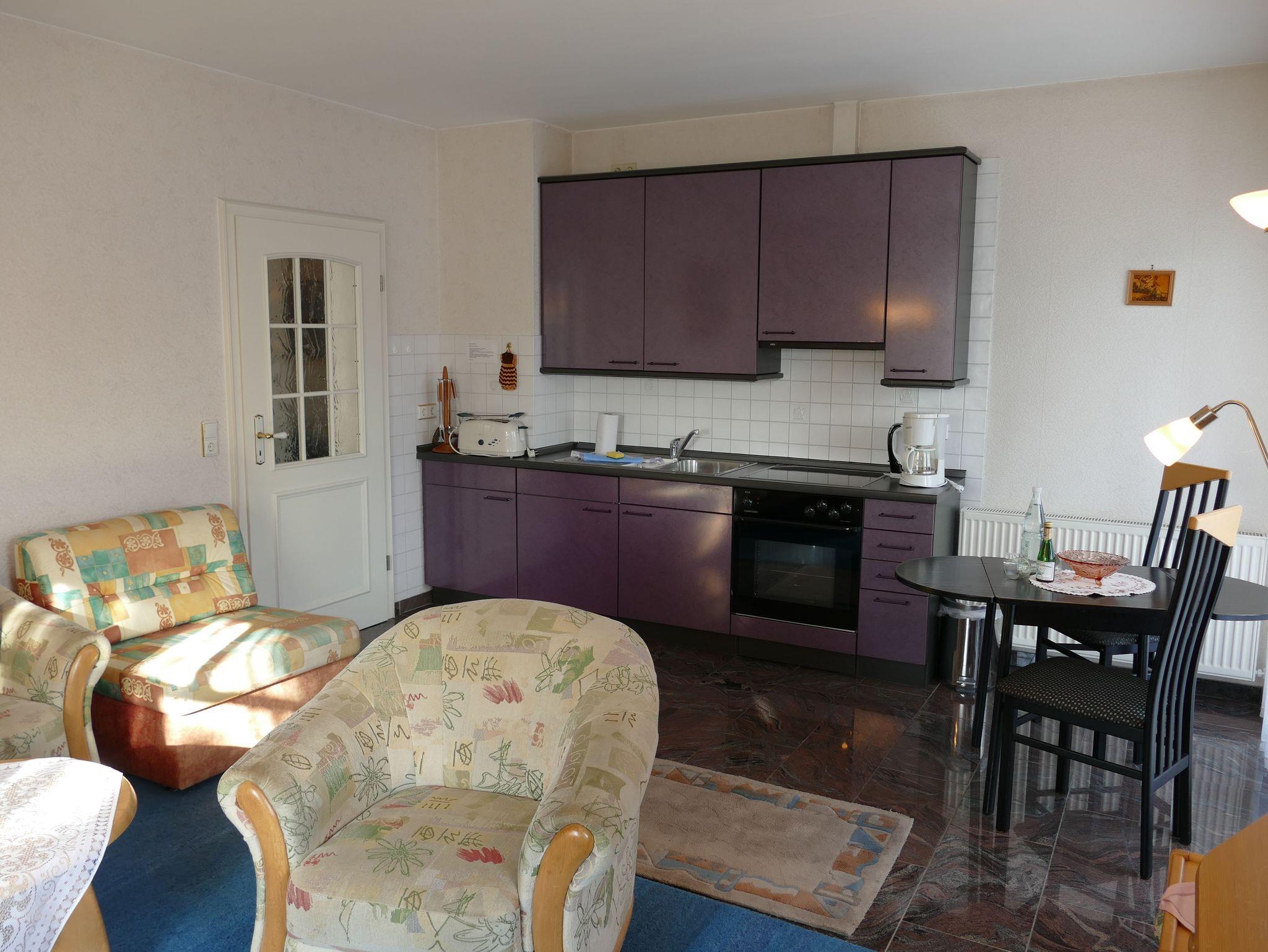 Die helle Ferienwohnung im Obergeschoss verfügt über ein gemütliches Wohnzimmer mit Sofa und einer Küchenzeile mit Backofen, Kühlschrank und Herd und Essplatz. Das Schlafzimmer verfügt über ein Doppelbett,. Bad mit Dusche und WC. Ein Balkon zur Ostseite steht ebenfalls zur Verfügung.