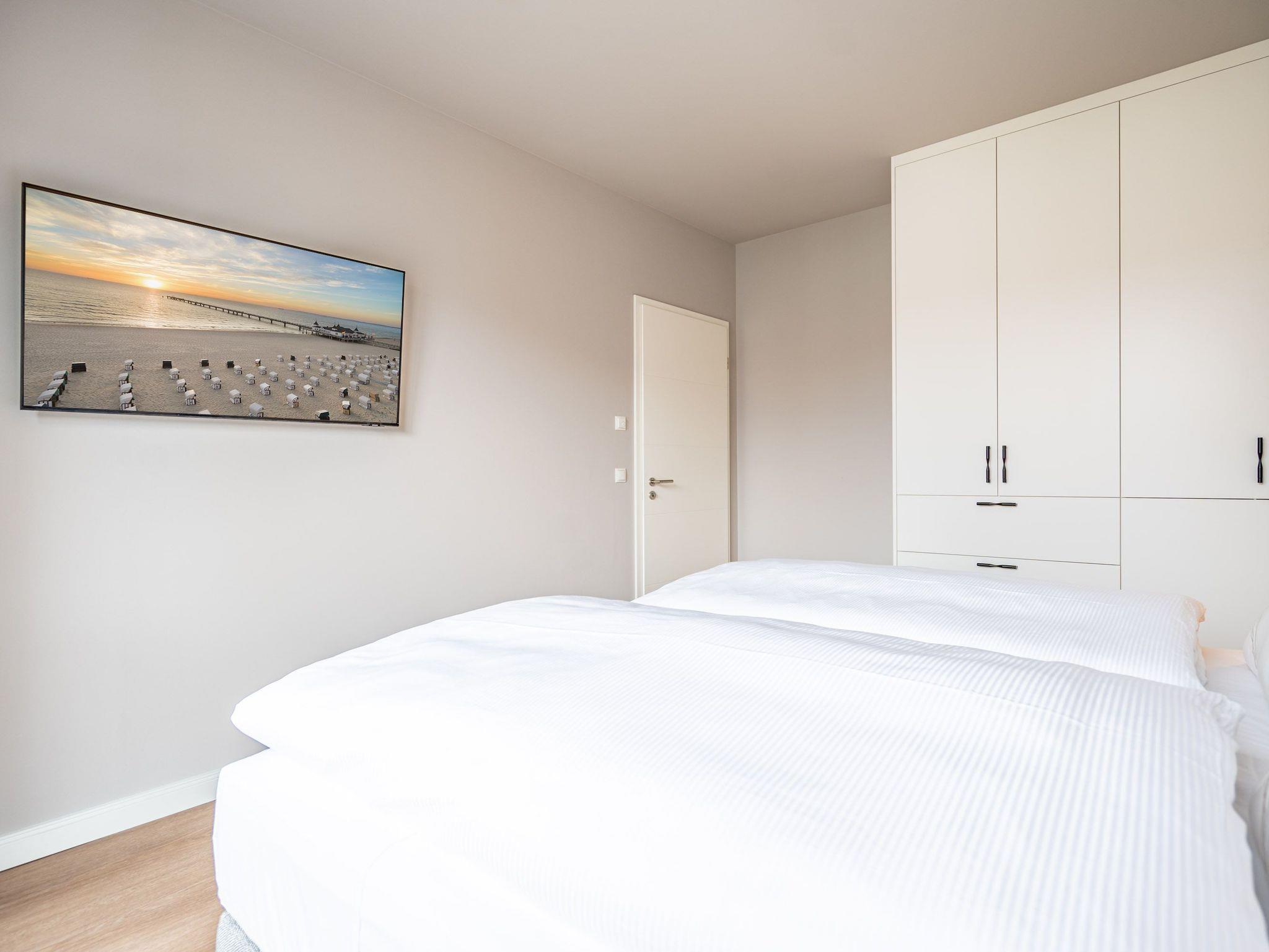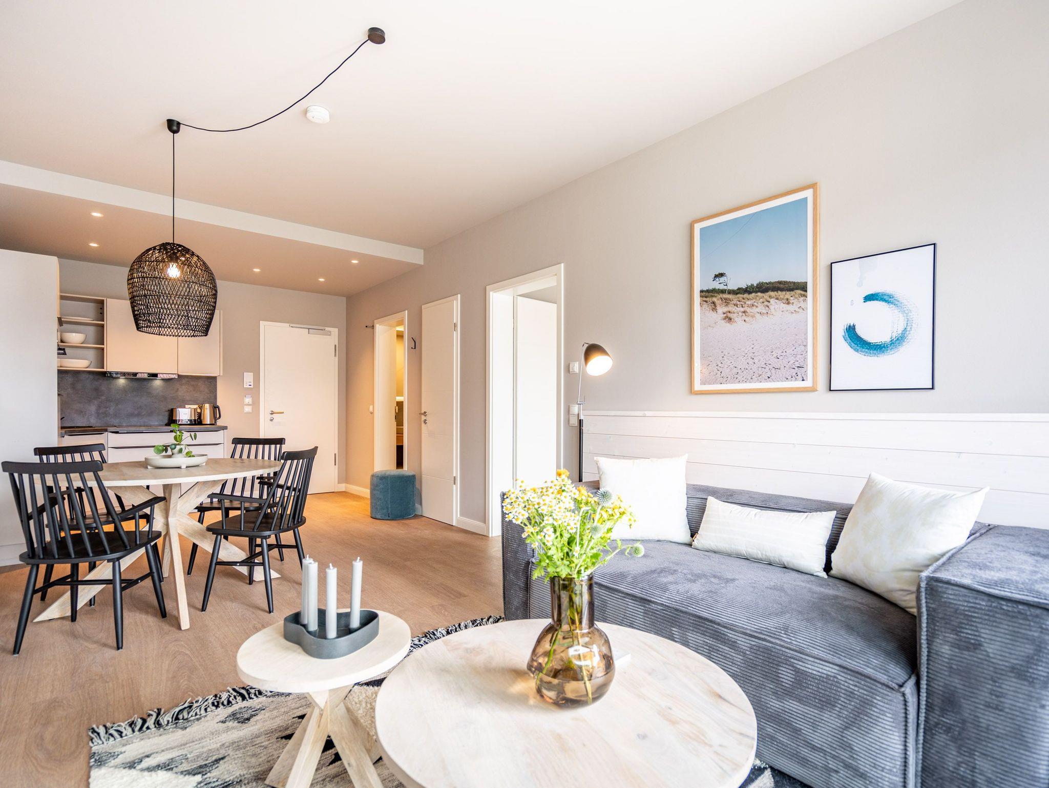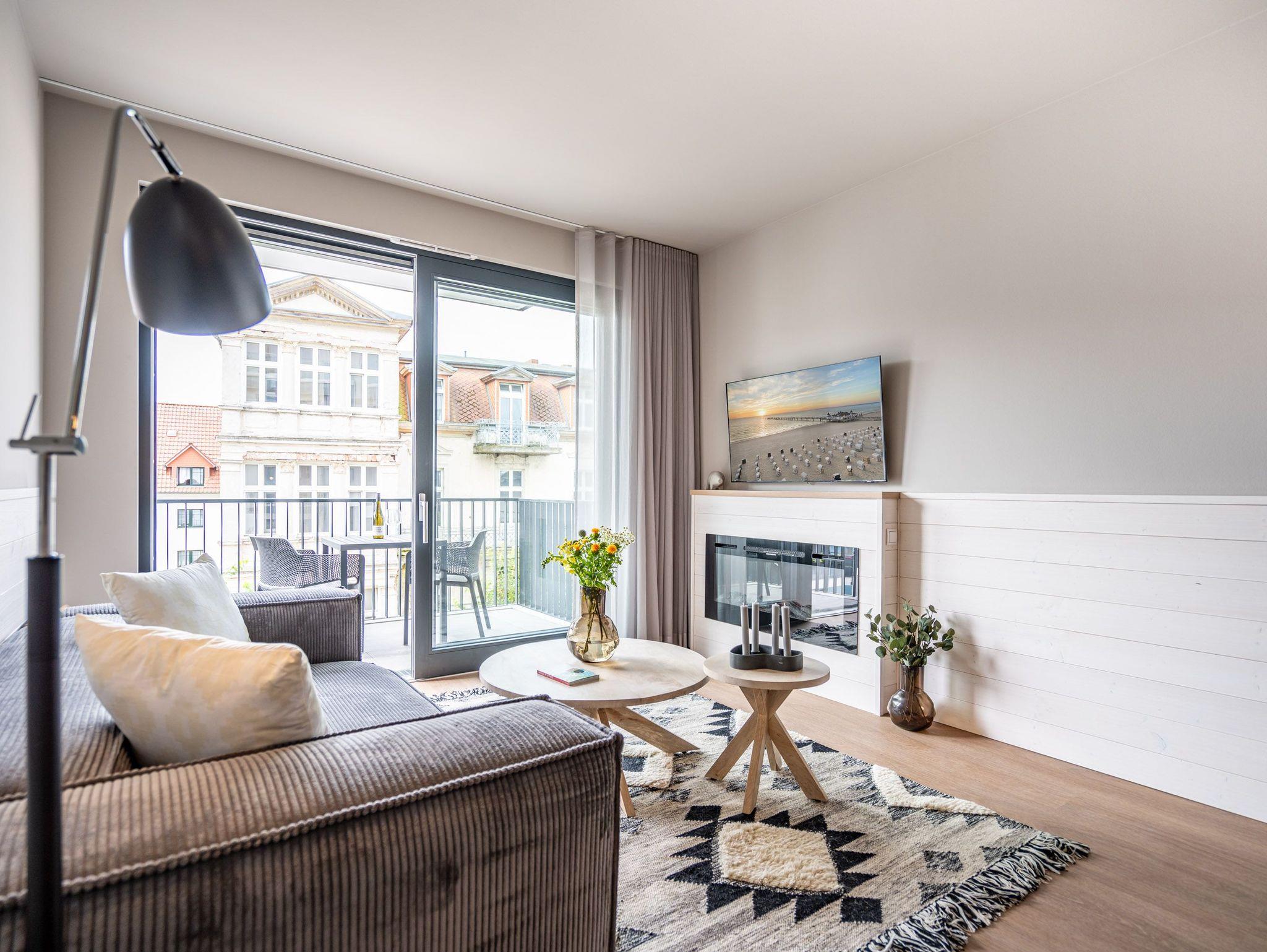 Willkommen im 2-Raum-Appartement B 2.6 (Haus B) in der Strandterrasse. Mittendrin, statt nur dabei können Sie bei diesem wunderschönen und gemütlichen Auszeitdomizil zu Recht sagen. Denn es befindet sich nur 80 Meter von der Ahlbecker Promenade und vom Strand entfernt. Die 53 Quadratmeter sind ein kuscheliges Auszeitzuhause für zwei Personen. Eine luftig leichte Atmosphäre empfängt Sie. Denn durch die großen Fenster fällt viel Licht in die Räume. Die Einrichtung ist in nordischem Design gehalten und birgt das Potential für viel Entspannung und Ruhe. Machen Sie es sich auf dem stylischen Sofa gemütlich. Genießen Sie den Blick auf den Elektrokamin (ohne Wärmeabgabe). Ein großer Flat-TV (50 Zoll) sorgt für echtes Heimkinofeeling. Vom Wohnzimmer aus haben Sie Zugang zum Süd-West-Balkon mit einem Tisch und zwei Stühlen. Auf ihm können Sie sich an der Sonnenseite der Insel erfreuen. Ob Frühstück oder Abendessen ? wenn das Wetter mitspielt, schmeckt es unter freiem Himmel doch gleich nochmal so gut. Zubereiten können Sie die Mahlzeiten in der zum Wohnzimmer hin offenen Küche. Sie ist mit hochwertigen Elektrogeräten und allem zum Kochen Nötigen voll ausgestattet. Ein schöner Esstisch lädt zu gemeinsamen Genuss-und Mußestunden ein. Doch zum Wichtigsten im Urlaub zählt bekanntlich ein erholsamer Schlaf. Das komfortable Boxspringdoppelbett (1,80m x 2,00m) im geräumigen Schlafzimmer bringt sie perfekt in süße Träume. Das Zimmer ist zudem mit einem Kleiderschrank und ebenfalls mit einem Flat-TV (50 Zoll) eingerichtet. Ein modernes Duschbad mit Waschtisch, Infrarotsaunakabine und WC komplettiert das Angebot. Zur Wohnung gehört ein PKW-Stellplatz in der Tiefgarage. Sie müssen also nur noch ankommen. Das Wohlfühlen setzt dann automatisch ein, wenn Sie die stilvolle Ferienwohnung betreten.
